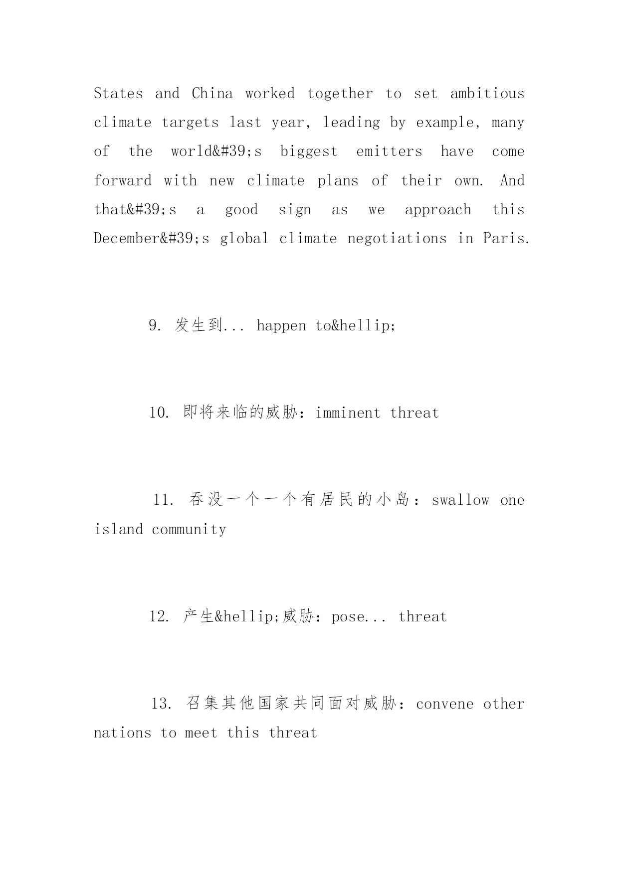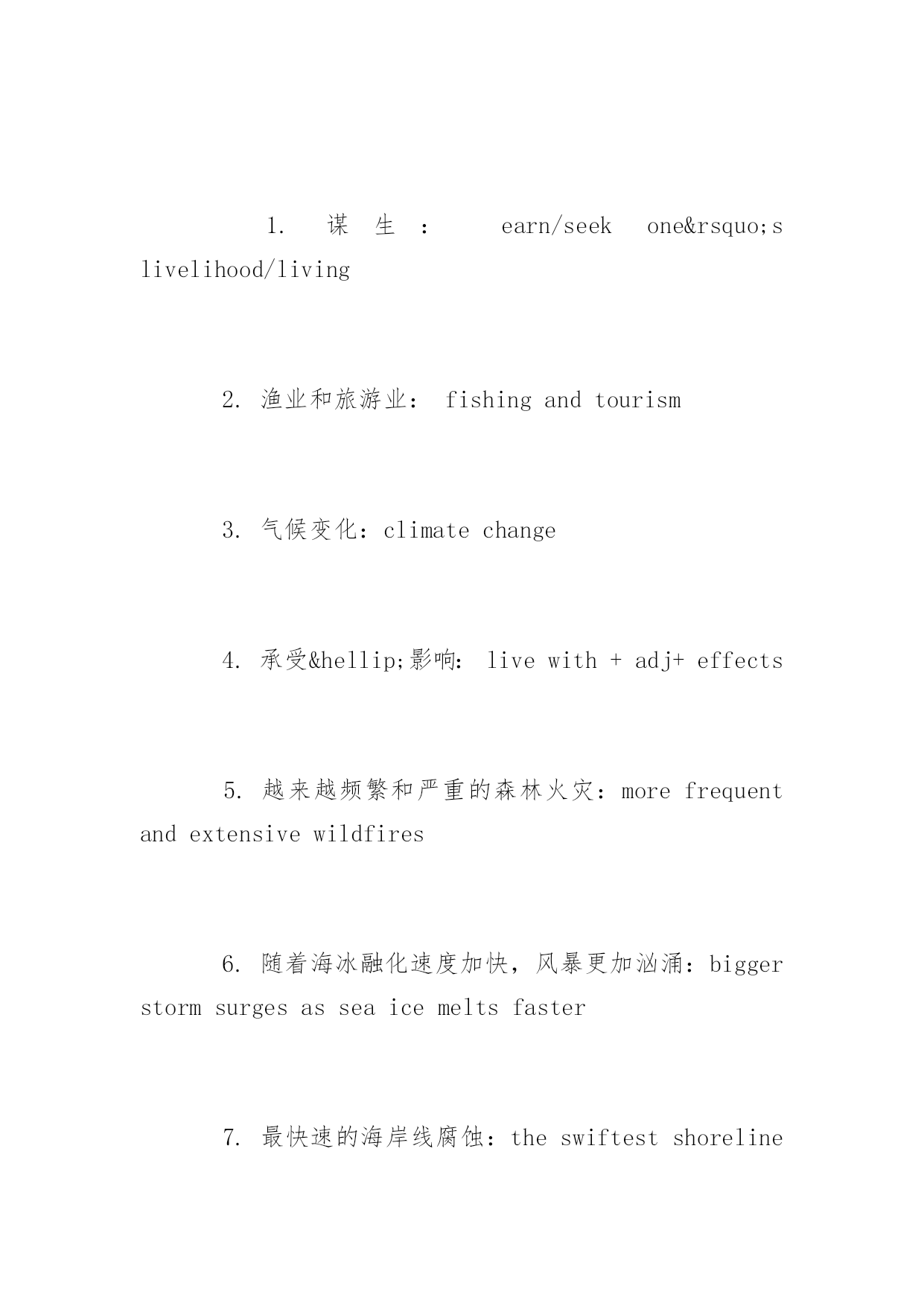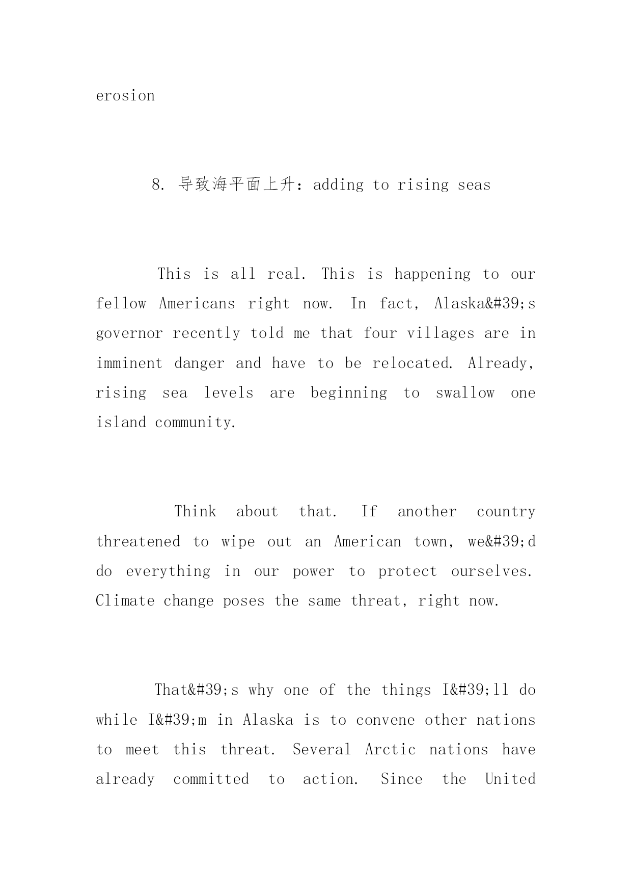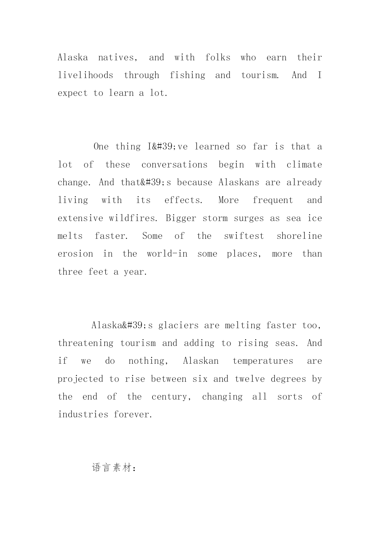 托福写作环境类素材 2016托福写作环境类素材大全 托福作文需要不断的练习与积累,为了帮助考生们更加有效的备考托福,下面yjbys网小编为大家提供托福写作素材总结:环境类,希望考生们能有所收获。 托福写作素材积累之环境类内容如下: Hi,everybody.ThisMonday,I'mheadingtoAlaskaforathree-daytourofthestate. I'vebeenlookingforwardtothisforalongtime.NotonlybecauseAlaskaisoneofthemostbeautifulplacesinacountrythat'sfullofbeautifulplaces-butbecauseI'llhaveseveralopportunitiestomeetwitheverydayAlaskansaboutwhat'sgoingonintheirlives.I'lltravelthroughoutthestate,meetingwithAlaskanswholiveabovetheArcticCircle,withAlaskanatives,andwithfolkswhoearntheirlivelihoodsthroughfishingandtourism.AndIexpecttolearnalot. OnethingI'velearnedsofaristhatalotoftheseconversationsbeginwithclimatechange.Andthat'sbecauseAlaskansarealreadylivingwithitseffects.Morefrequentandextensivewildfires.Biggerstormsurgesasseaicemeltsfaster.Someoftheswiftestshorelineerosionintheworld-insomeplaces,morethanthreefeetayear. Alaska'sglaciersaremeltingfastertoo,threateningtourismandaddingtorisingseas.Andifwedonothing,Alaskantemperaturesareprojectedtorisebetweensixandtwelvedegreesbytheendofthecentury,changingallsortsofindustriesforever. 语言素材: 1.谋生:earn/seekone’slivelihood/living 2.渔业和旅游业:fishingandtourism 3.气候变化:climatechange 4.承受…影响:livewith+adj+effects 5.越来越频繁和严重的森林火灾:morefrequentandextensivewildfires 6.随着海冰融化速度加快,风暴更加汹涌:biggerstormsurgesasseaicemeltsfaster 7.最快速的海岸线腐蚀:theswiftestshorelineerosion 8.导致海平面上升:addingtorisingseas Thisisallreal.ThisishappeningtoourfellowAmericansrightnow.Infact,Alaska'sgovernorrecentlytoldmethatfourvillagesareinimminentdangerandhavetoberelocated.Already,risingsealevelsarebeginningtoswallowoneislandcommunity. Thinkaboutthat.IfanothercountrythreatenedtowipeoutanAmericantown,we'ddoeverythinginourpowertoprotectourselves.Climatechangeposesthesamethreat,rightnow. That'swhyoneofthethingsI'lldowhileI'minAlaskaistoconveneothernationstomeetthisthreat.SeveralArcticnationshavealreadycommittedtoaction.SincetheUnitedStatesandChinaworkedtogethertoseta