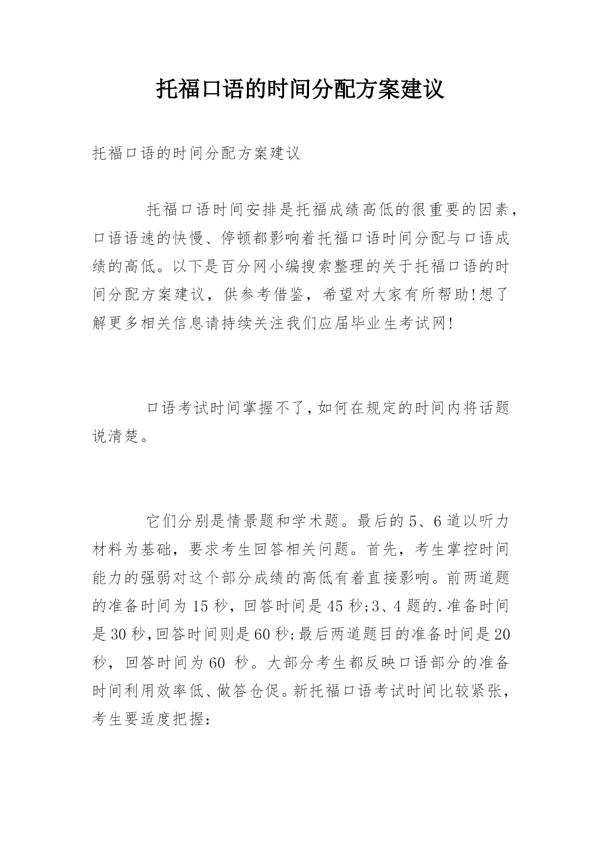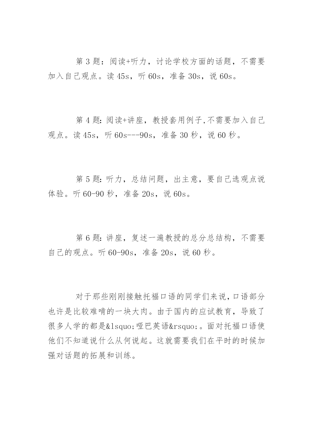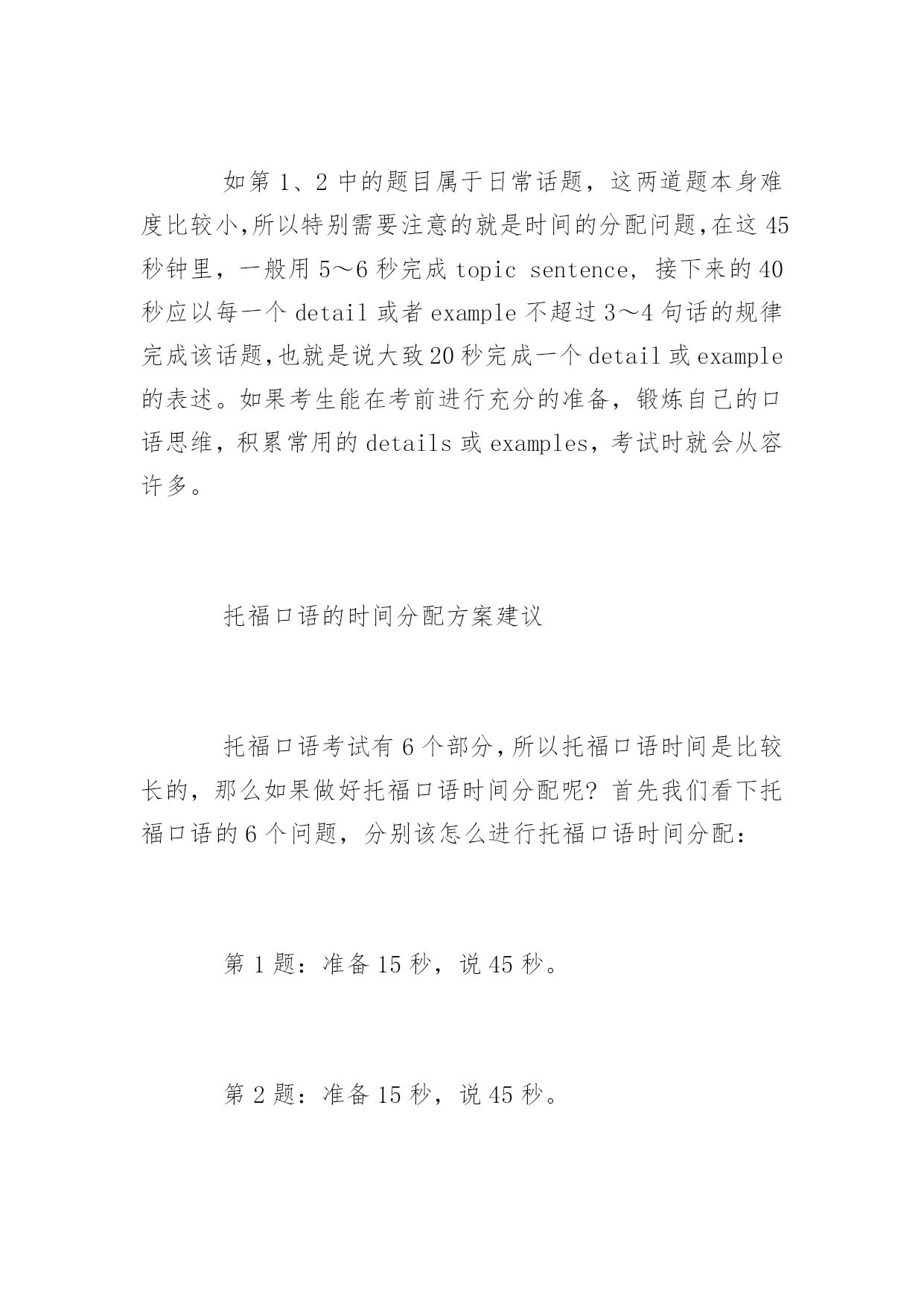 托福口语的时间分配方案建议 托福口语的时间分配方案建议 托福口语时间安排是托福成绩高低的很重要的因素,口语语速的快慢、停顿都影响着托福口语时间分配与口语成绩的高低。以下是百分网小编搜索整理的关于托福口语的时间分配方案建议,供参考借鉴,希望对大家有所帮助!想了解更多相关信息请持续关注我们应届毕业生考试网! 口语考试时间掌握不了,如何在规定的时间内将话题说清楚。 它们分别是情景题和学术题。最后的5、6道以听力材料为基础,要求考生回答相关问题。首先,考生掌控时间能力的强弱对这个部分成绩的高低有着直接影响。前两道题的准备时间为15秒,回答时间是45秒;3、4题的.准备时间是30秒,回答时间则是60秒;最后两道题目的准备时间是20秒,回答时间为60秒。大部分考生都反映口语部分的准备时间利用效率低、做答仓促。新托福口语考试时间比较紧张,考生要适度把握: 如第1、2中的题目属于日常话题,这两道题本身难度比较小,所以特别需要注意的就是时间的分配问题,在这45秒钟里,一般用5~6秒完成topicsentence,接下来的40秒应以每一个detail或者example不超过3~4句话的规律完成该话题,也就是说大致20秒完成一个detail或example的表述。如果考生能在考前进行充分的准备,锻炼自己的口语思维,积累常用的details或examples,考试时就会从容许多。 托福口语的时间分配方案建议 托福口语考试有6个部分,所以托福口语时间是比较长的,那么如果做好托福口语时间分配呢?首先我们看下托福口语的6个问题,分别该怎么进行托福口语时间分配: 第1题:准备15秒,说45秒。 第2题:准备15秒,说45秒。 第3题:阅读+听力,讨论学校方面的话题,不需要加入自己观点。读45s,听60s,准备30s,说60s。 第4题:阅读+讲座,教授套用例子,不需要加入自己观点。读45s,听60s---90s,准备30秒,说60秒。 第5题:听力,总结问题,出主意,要自己选观点说体验。听60-90秒,准备20s,说60s。 第6题:讲座,复述一遍教授的总分总结构,不需要自己的观点。听60-90s,准备20s,说60秒。 对于那些刚刚接触托福口语的同学们来说,口语部分也许是比较难啃的一块大肉。由于国内的应试教育,导致了很多人学的都是‘哑巴英语’。面对托福口语使他们不知道说什么从何说起。这就需要我们在平时的时候加强对话题的拓展和训练。 大家都知道IBT考试的口语部分通常都是取材于北美大学学生日常学术和校园生活的许多方面,要求学生可以熟练地理解别人的思路并表达出自己的看法。读/听/说题目和听/说题目都要求考生充分理解相关的题目材料,对考生的口语能力和临场应变能力较高。每道题目回答时间不超过一分钟,这要求考生的语言运用要高度归纳并精练准确。 TOEFL口语考试是电脑录音,评判者是通过听录音来做分数评估的,所以,说得快未必是件好事,说得清楚才是重点。考虑到评卷者可能会产生的听觉疲劳,所以考生们表述时不要一味求快,而要注意断句、重音和语调。