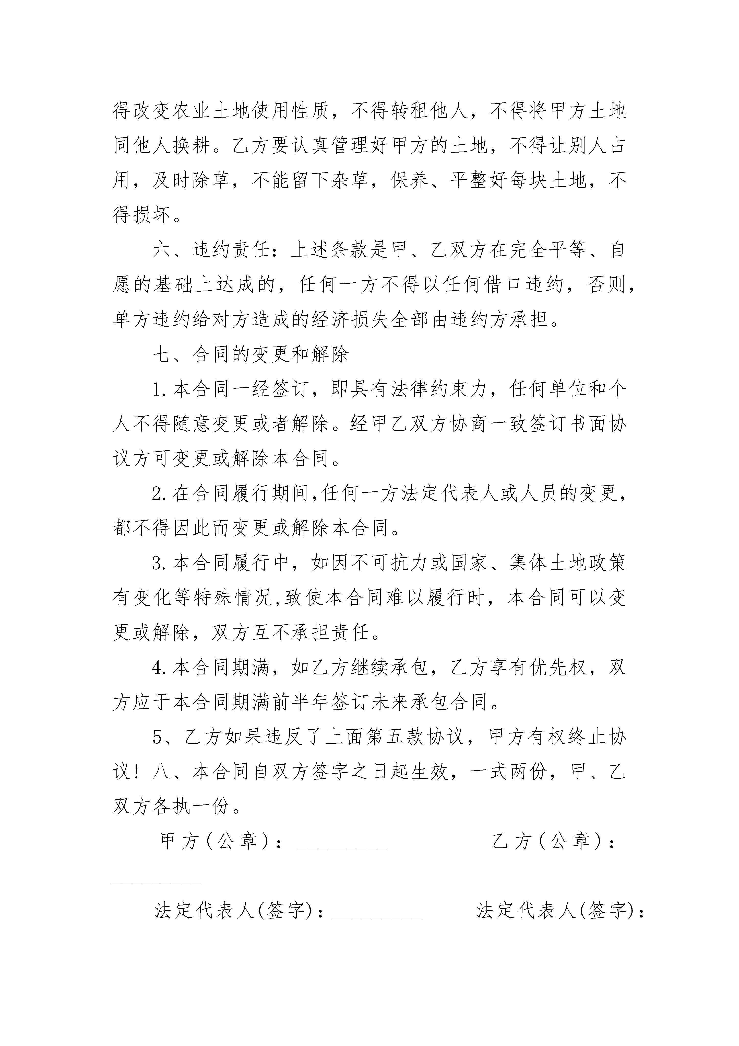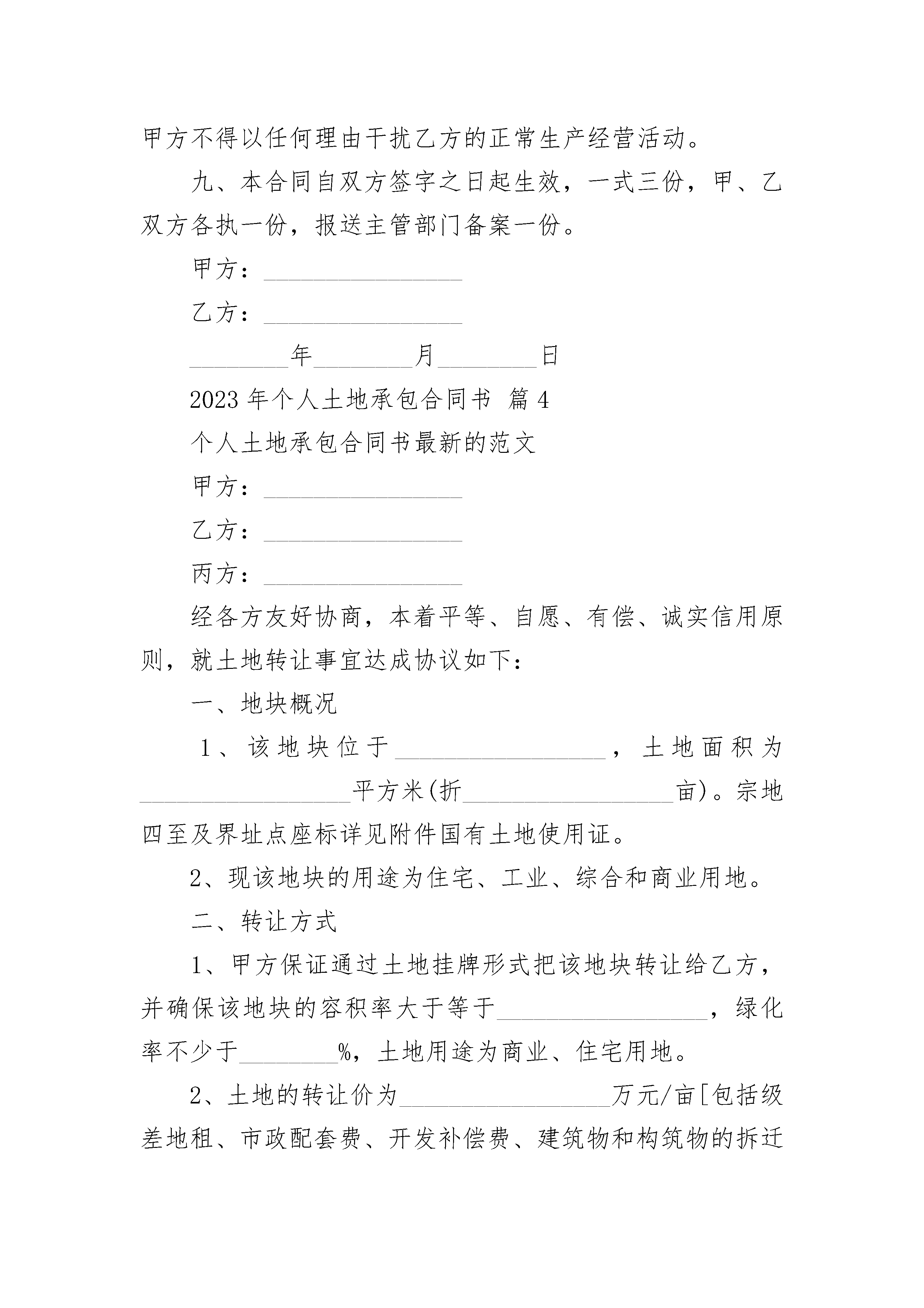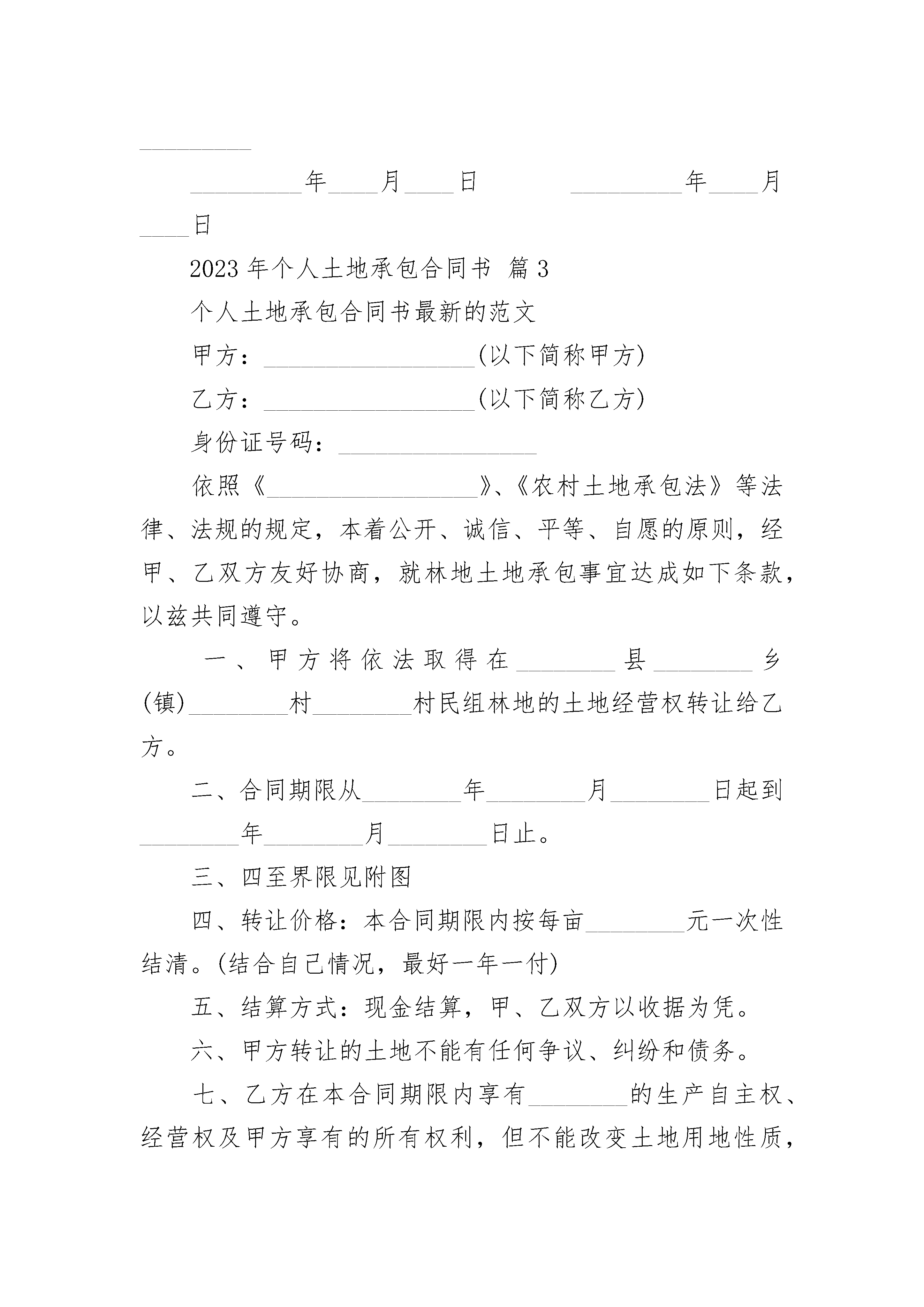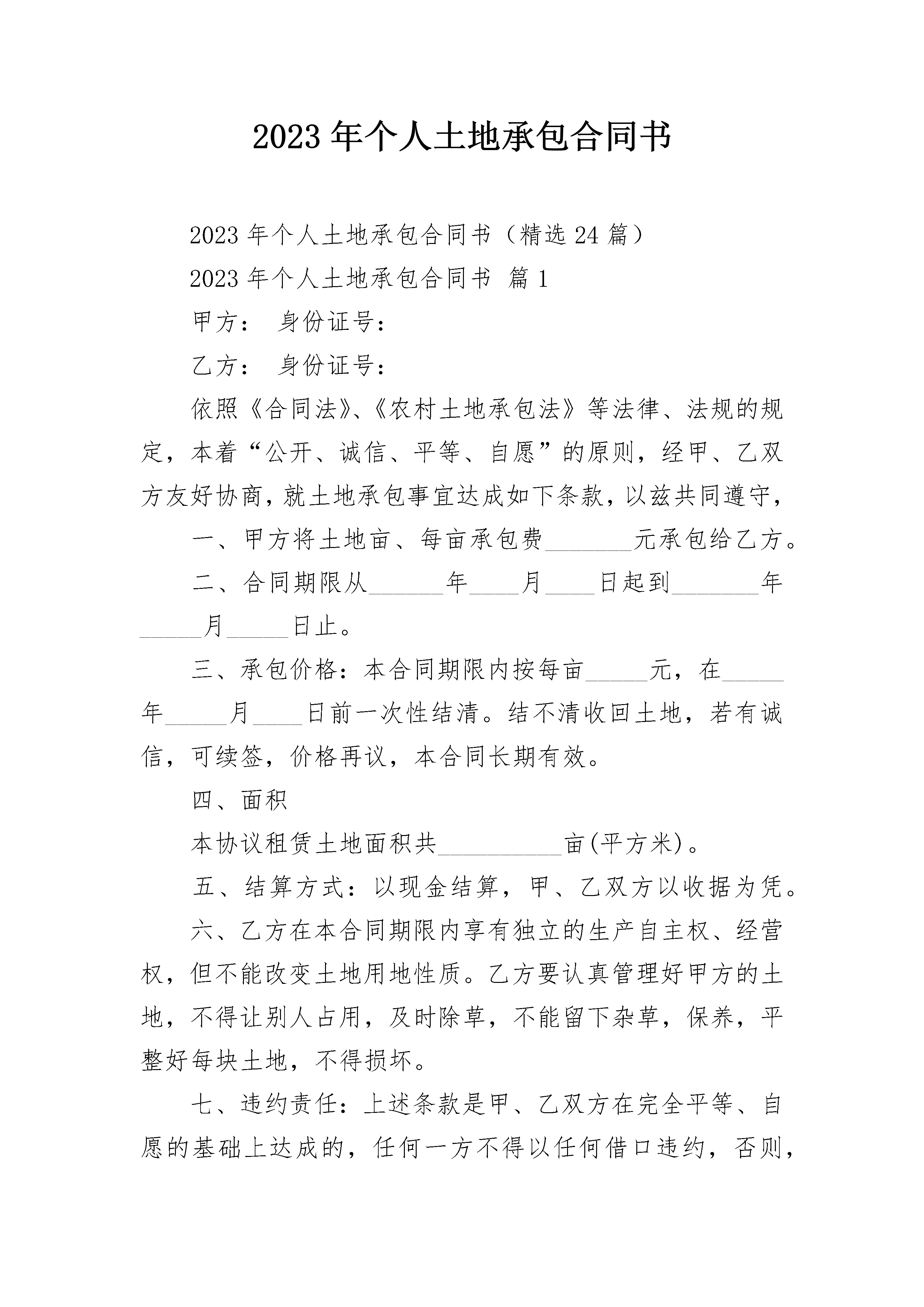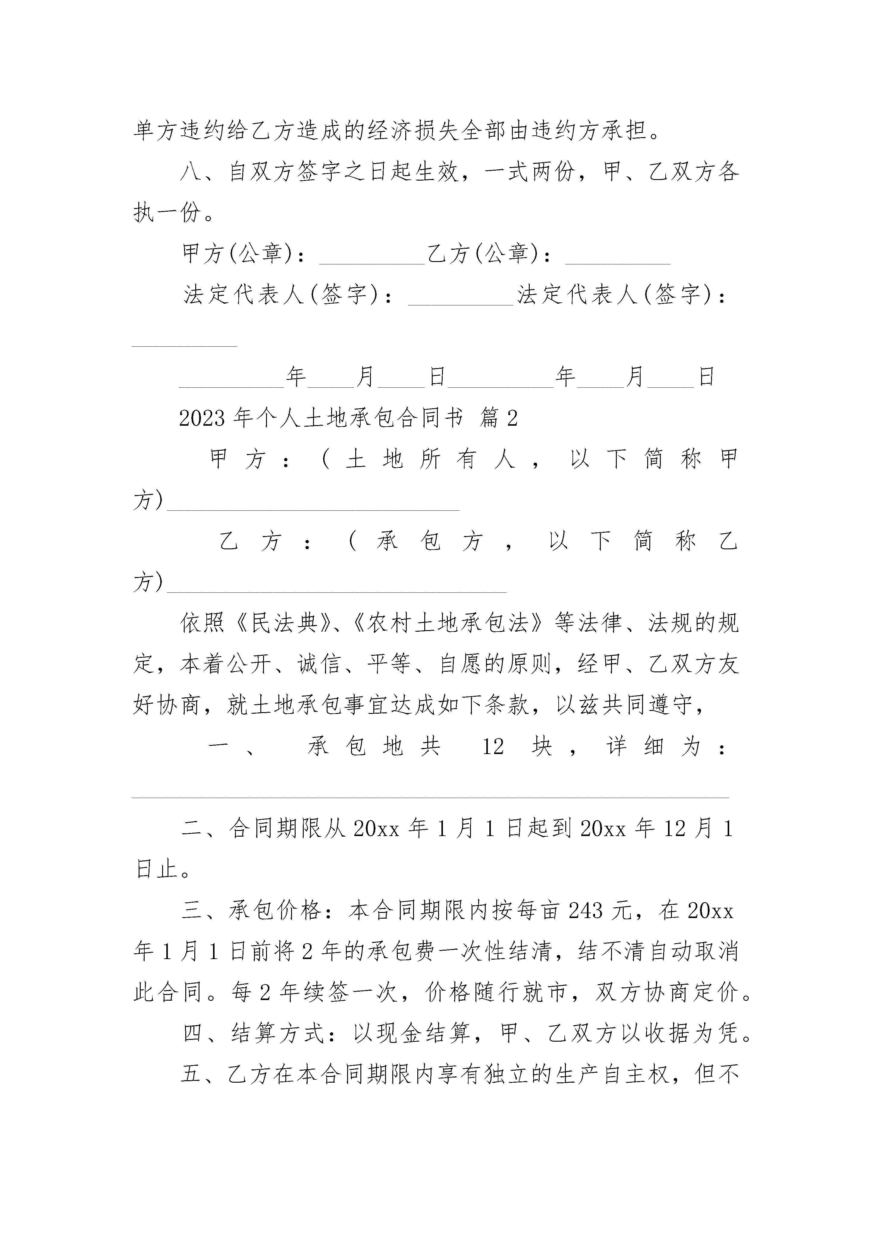 2023年个人土地承包合同书2023年个人土地承包合同书(精选24篇)2023年个人土地承包合同书篇1甲方:身份证号:乙方:身份证号:依照《合同法》、《农村土地承包法》等法律、法规的规定,本着“公开、诚信、平等、自愿”的原则,经甲、乙双方友好协商,就土地承包事宜达成如下条款,以兹共同遵守,一、甲方将土地亩、每亩承包费_______元承包给乙方。二、合同期限从______年____月____日起到_______年_____月_____日止。三、承包价格:本合同期限内按每亩_____元,在_____年_____月____日前一次性结清。结不清收回土地,若有诚信,可续签,价格再议,本合同长期有效。四、面积本协议租赁土地面积共__________亩(平方米)。五、结算方式:以现金结算,甲、乙双方以收据为凭。六、乙方在本合同期限内享有独立的生产自主权、经营权,但不能改变土地用地性质。乙方要认真管理好甲方的土地,不得让别人占用,及时除草,不能留下杂草,保养,平整好每块土地,不得损坏。七、违约责任:上述条款是甲、乙双方在完全平等、自愿的基础上达成的,任何一方不得以任何借口违约,否则,单方违约给乙方造成的经济损失全部由违约方承担。八、自双方签字之日起生效,一式两份,甲、乙双方各执一份。甲方(公章):_________乙方(公章):_________法定代表人(签字):_________法定代表人(签字):__________________年____月____日_________年____月____日2023年个人土地承包合同书篇2甲方:(土地所有人,以下简称甲方)_________________________乙方:(承包方,以下简称乙方)_____________________________依照《民法典》、《农村土地承包法》等法律、法规的规定,本着公开、诚信、平等、自愿的原则,经甲、乙双方友好协商,就土地承包事宜达成如下条款,以兹共同遵守,一、承包地共12块,详细为:___________________________________________________二、合同期限从20xx年1月1日起到20xx年12月1日止。三、承包价格:本合同期限内按每亩243元,在20xx年1月1日前将2年的承包费一次性结清,结不清自动取消此合同。每2年续签一次,价格随行就市,双方协商定价。四、结算方式:以现金结算,甲、乙双方以收据为凭。五、乙方在本合同期限内享有独立的生产自主权,但不得改变农业土地使用性质,不得转租他人,不得将甲方土地同他人换耕。乙方要认真管理好甲方的土地,不得让别人占用,及时除草,不能留下杂草,保养、平整好每块土地,不得损坏。六、违约责任:上述条款是甲、乙双方在完全平等、自愿的基础上达成的,任何一方不得以任何借口违约,否则,单方违约给对方造成的经济损失全部由违约方承担。七、合同的变更和解除1.本合同一经签订,即具有法律约束力,任何单位和个人不得随意变更或者解除。经甲乙双方协商一致签订书面协议方可变更或解除本合同。2.在合同履行期间,任何一方法定代表人或人员的变更,都不得因此而变更或解除本合同。3.本合同履行中,如因不可抗力或国家、集体土地政策有变化等特殊情况,致使本合同难以履行时,本合同可以变更或解除,双方互不承担责任。4.本合同期满,如乙方继续承包,乙方享有优先权,双方应于本合同期满前半年签订未来承包合同。5、乙方如果违反了上面第五款协议,甲方有权终止协议!八、本合同自双方签字之日起生效,一式两份,甲、乙双方各执一份。甲方(公章):_________乙方(公章):_________法定代表人(签字):_________法定代表人(签字):__________________年____月____日_________年____月____日2023年个人土地承包合同书篇3个人土地承包合同书最新的范文甲方:_________________(以下简称甲方)乙方:_________________(以下简称乙方)身份证号码:________________依照《_________________》、《农村土地承包法》等法律、法规的规定,本着公开、诚信、平等、自愿的原则,经甲、乙双方友好协商,就林地土地承包事宜达成如下条款,以兹共同遵守。一、甲方将依法取得在________县________乡(镇)________村________村民组林地的土地经营权转让给乙方。二、合同期限从________年________月________日起到________年________月________日止。三、四至界限见附图四、转让价格:本合同期限内按每亩________元一次性结清。(结合自己情况,最好一年一付)五、结算方式:现金结算,甲、乙