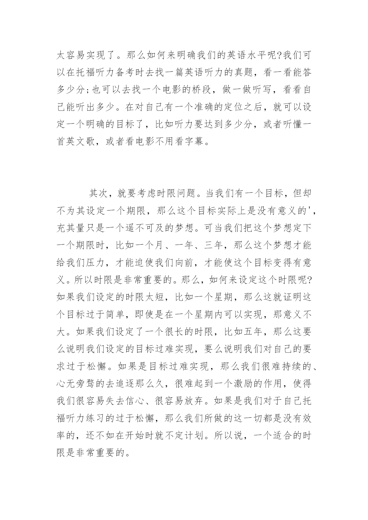 托福听力正确的备考步骤 2016托福听力正确的备考步骤 新托福听力考试包括两个部分,每个部分由一段对话和两个讲座,每个部分需要听的录音大约是20分钟,答题时间是10分钟。如果有听力加试,则再增加一个对话和两个讲座。以下是yjbys网小编整理的关于托福听力正确的备考步骤,供大家备考。 首先,我们要明确目标。大家一定要认识到托福听力的重要性。听向来就是学习语言的第一步,只有听过关了,我们在说、读、写方面才能有坚实的基础和长久的进步。为什么这么说呢?我们就收到外界的信息是最重要的,只有我们成功的接收到了外界的信息,我们的大脑才能思考、才能就这些信息进行处理,进而我们才能反应、判断、理解、推理。如果我们可以流畅的接收英语信息,以英语来认识世界的话,那么我们所有英语语言能力的提升就都将不是问题。那么,要设定一个合适的目标,我们需要先明确自己的英语水平,不然,可能目标就会被设定得要么太好高骛远、要么太容易实现了。那么如何来明确我们的英语水平呢?我们可以在托福听力备考时去找一篇英语听力的真题,看一看能答多少分;也可以去找一个电影的桥段,做一做听写,看看自己能听出多少。在对自己有一个准确的定位之后,就可以设定一个明确的目标了,比如听力要达到多少分,或者听懂一首英文歌,或者看电影不用看字幕。 其次,就要考虑时限问题。当我们有一个目标,但却不为其设定一个期限,那么这个目标实际上是没有意义的',充其量只是一个遥不可及的梦想。可当我们把这个梦想定下一个期限时,比如一个月、一年、三年,那么这个梦想才能给我们压力,才能迫使我们向前,才能使这个目标变得有意义。所以时限是非常重要的。那么,如何来设定这个时限呢?如果我们设定的时限太短,比如一个星期,那么这就证明这个目标过于简单,即使是在一个星期内可以实现,那意义不大。如果我们设定了一个很长的时限,比如五年,那么这要么说明我们设定的目标过难实现,要么说明我们对自己的要求过于松懈。如果是目标过难实现,那么我们很难持续的、心无旁骛的去追逐那么久,很难起到一个激励的作用,使得我们很容易失去信心、很容易放弃。如果是我们对于自己托福听力练习的过于松懈,那么我们所做的这一切都是没有效率的,还不如在开始时就不定计划。所以说,一个适合的时限是非常重要的。 最后,就是选定方法了。听写对于听力的提高已经是一个公开的秘密了,很多学校很多老师也都建议大家如此做。但我要提醒大家一点,选方法切不可迷信,一定要选择适合自己的方法,达到事半功倍。