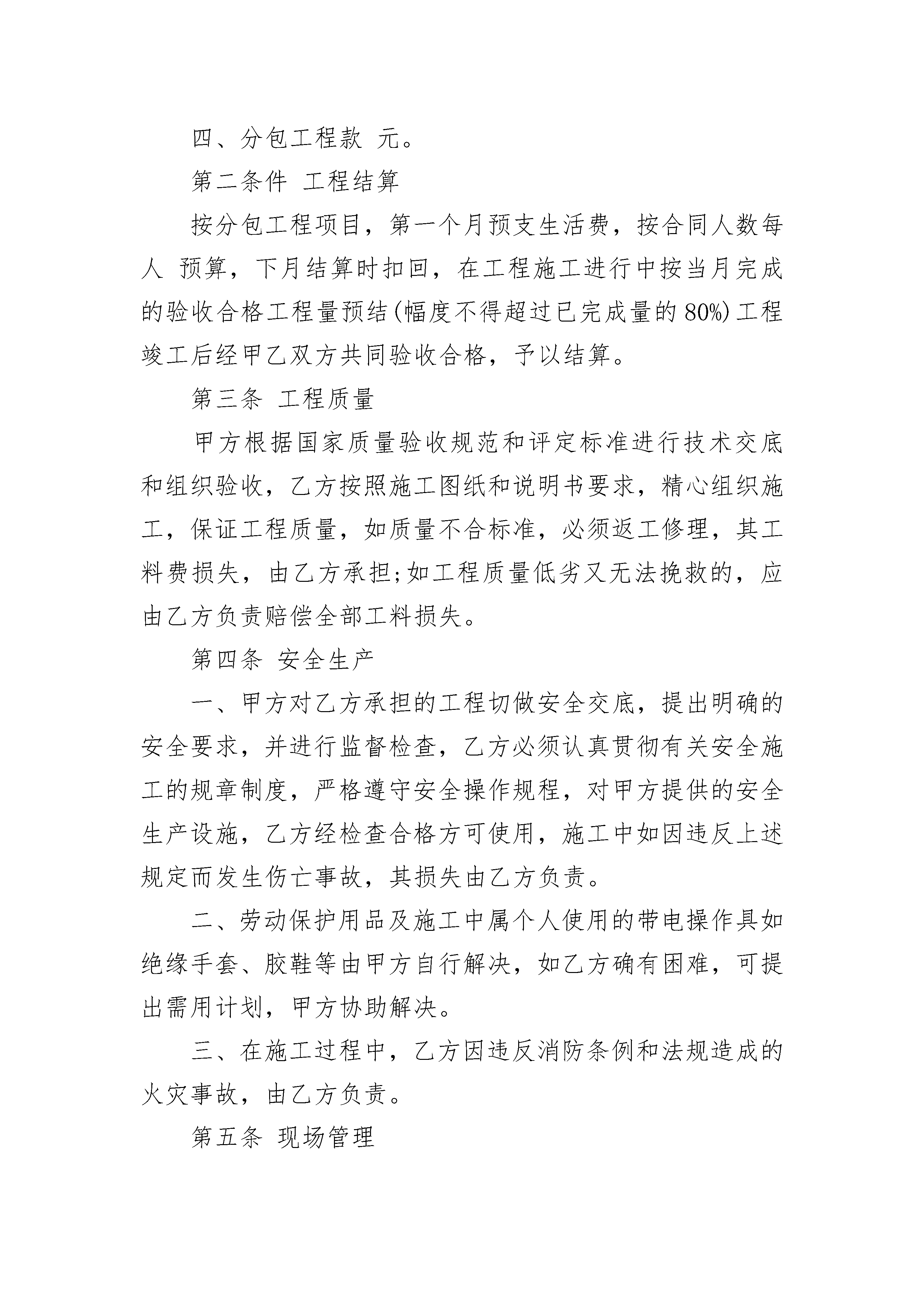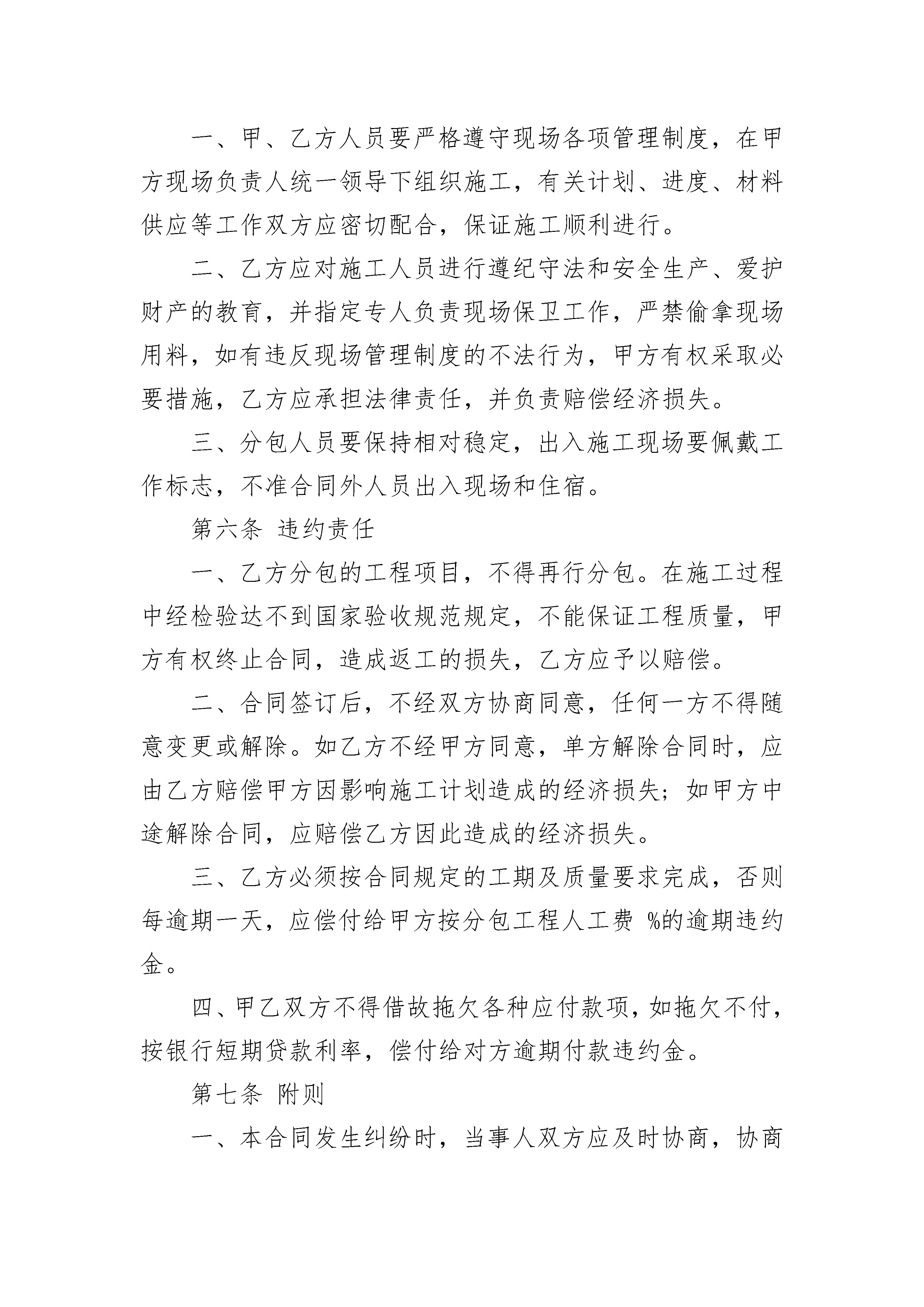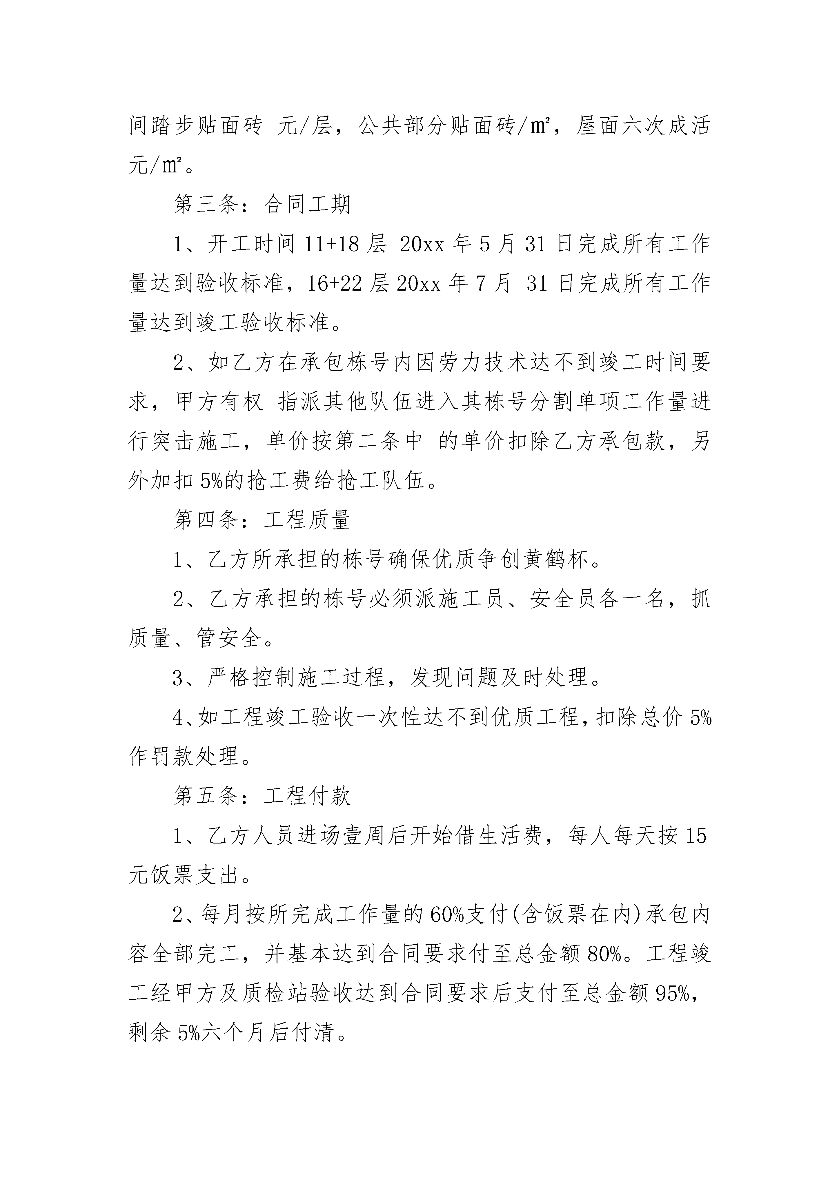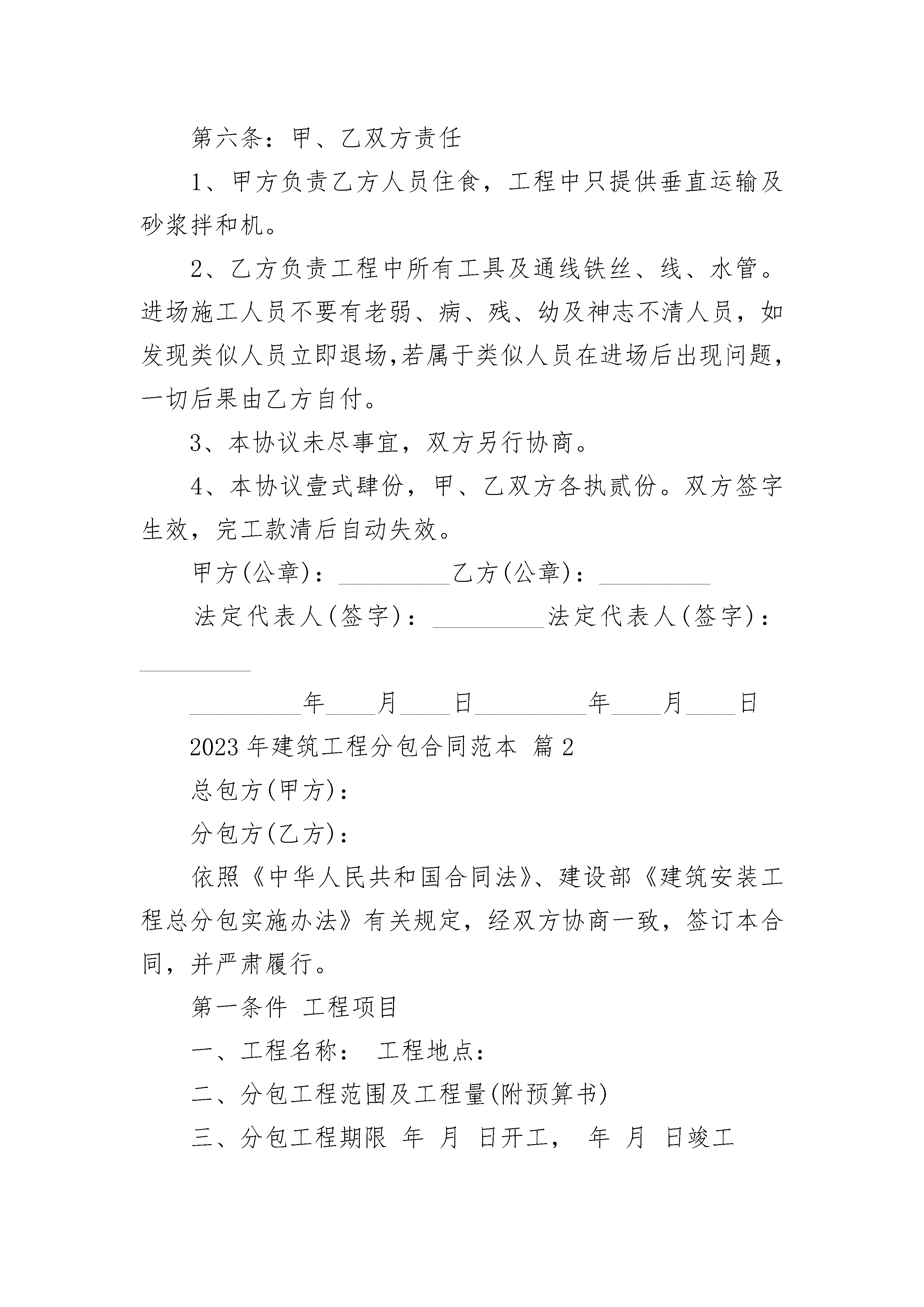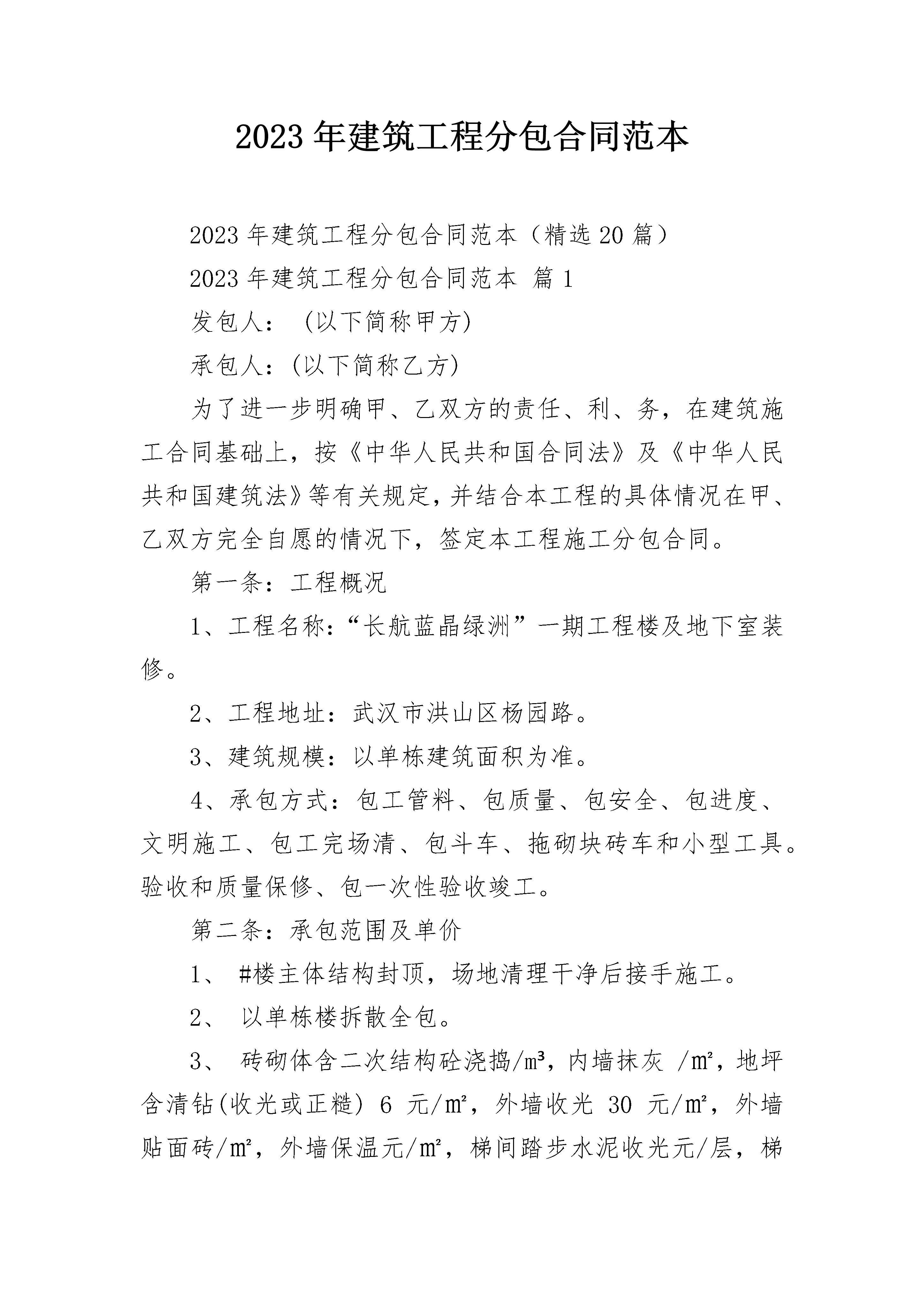 2023年建筑工程分包合同范本2023年建筑工程分包合同范本(精选20篇)2023年建筑工程分包合同范本篇1发包人:(以下简称甲方)承包人:(以下简称乙方)为了进一步明确甲、乙双方的责任、利、务,在建筑施工合同基础上,按《中华人民共和国合同法》及《中华人民共和国建筑法》等有关规定,并结合本工程的具体情况在甲、乙双方完全自愿的情况下,签定本工程施工分包合同。第一条:工程概况1、工程名称:“长航蓝晶绿洲”一期工程楼及地下室装修。2、工程地址:武汉市洪山区杨园路。3、建筑规模:以单栋建筑面积为准。4、承包方式:包工管料、包质量、包安全、包进度、文明施工、包工完场清、包斗车、拖砌块砖车和小型工具。验收和质量保修、包一次性验收竣工。第二条:承包范围及单价1、#楼主体结构封顶,场地清理干净后接手施工。2、以单栋楼拆散全包。3、砖砌体含二次结构砼浇捣/m³,内墙抹灰/㎡,地坪含清钻(收光或正糙)6元/㎡,外墙收光30元/㎡,外墙贴面砖/㎡,外墙保温元/㎡,梯间踏步水泥收光元/层,梯间踏步贴面砖元/层,公共部分贴面砖/㎡,屋面六次成活元/㎡。第三条:合同工期1、开工时间11+18层20xx年5月31日完成所有工作量达到验收标准,16+22层20xx年7月31日完成所有工作量达到竣工验收标准。2、如乙方在承包栋号内因劳力技术达不到竣工时间要求,甲方有权指派其他队伍进入其栋号分割单项工作量进行突击施工,单价按第二条中的单价扣除乙方承包款,另外加扣5%的抢工费给抢工队伍。第四条:工程质量1、乙方所承担的栋号确保优质争创黄鹤杯。2、乙方承担的栋号必须派施工员、安全员各一名,抓质量、管安全。3、严格控制施工过程,发现问题及时处理。4、如工程竣工验收一次性达不到优质工程,扣除总价5%作罚款处理。第五条:工程付款1、乙方人员进场壹周后开始借生活费,每人每天按15元饭票支出。2、每月按所完成工作量的60%支付(含饭票在内)承包内容全部完工,并基本达到合同要求付至总金额80%。工程竣工经甲方及质检站验收达到合同要求后支付至总金额95%,剩余5%六个月后付清。第六条:甲、乙双方责任1、甲方负责乙方人员住食,工程中只提供垂直运输及砂浆拌和机。2、乙方负责工程中所有工具及通线铁丝、线、水管。进场施工人员不要有老弱、病、残、幼及神志不清人员,如发现类似人员立即退场,若属于类似人员在进场后出现问题,一切后果由乙方自付。3、本协议未尽事宜,双方另行协商。4、本协议壹式肆份,甲、乙双方各执贰份。双方签字生效,完工款清后自动失效。甲方(公章):_________乙方(公章):_________法定代表人(签字):_________法定代表人(签字):__________________年____月____日_________年____月____日2023年建筑工程分包合同范本篇2总包方(甲方):分包方(乙方):依照《中华人民共和国合同法》、建设部《建筑安装工程总分包实施办法》有关规定,经双方协商一致,签订本合同,并严肃履行。第一条件工程项目一、工程名称:工程地点:二、分包工程范围及工程量(附预算书)三、分包工程期限年月日开工,年月日竣工四、分包工程款元。第二条件工程结算按分包工程项目,第一个月预支生活费,按合同人数每人预算,下月结算时扣回,在工程施工进行中按当月完成的验收合格工程量预结(幅度不得超过已完成量的80%)工程竣工后经甲乙双方共同验收合格,予以结算。第三条工程质量甲方根据国家质量验收规范和评定标准进行技术交底和组织验收,乙方按照施工图纸和说明书要求,精心组织施工,保证工程质量,如质量不合标准,必须返工修理,其工料费损失,由乙方承担;如工程质量低劣又无法挽救的,应由乙方负责赔偿全部工料损失。第四条安全生产一、甲方对乙方承担的工程切做安全交底,提出明确的安全要求,并进行监督检查,乙方必须认真贯彻有关安全施工的规章制度,严格遵守安全操作规程,对甲方提供的安全生产设施,乙方经检查合格方可使用,施工中如因违反上述规定而发生伤亡事故,其损失由乙方负责。二、劳动保护用品及施工中属个人使用的带电操作具如绝缘手套、胶鞋等由甲方自行解决,如乙方确有困难,可提出需用计划,甲方协助解决。三、在施工过程中,乙方因违反消防条例和法规造成的火灾事故,由乙方负责。第五条现场管理一、甲、乙方人员要严格遵守现场各项管理制度,在甲方现场负责人统一领导下组织施工,有关计划、进度、材料供应等工作双方应密切配合,保证施工顺利进行。二、乙方应对施工人员进行遵纪守法和安全生产、爱护财产的教育,并指定专人负责现场保卫工作,严禁偷拿现场用料,如有违反现场管理制度的不法行为,甲方有权采取必要措施,乙方应承担法律责任,并负责赔偿经济损失。三、分包人员要保持相对稳定,出入施工现场要佩戴工作标志,不准合同外人员出入现场和