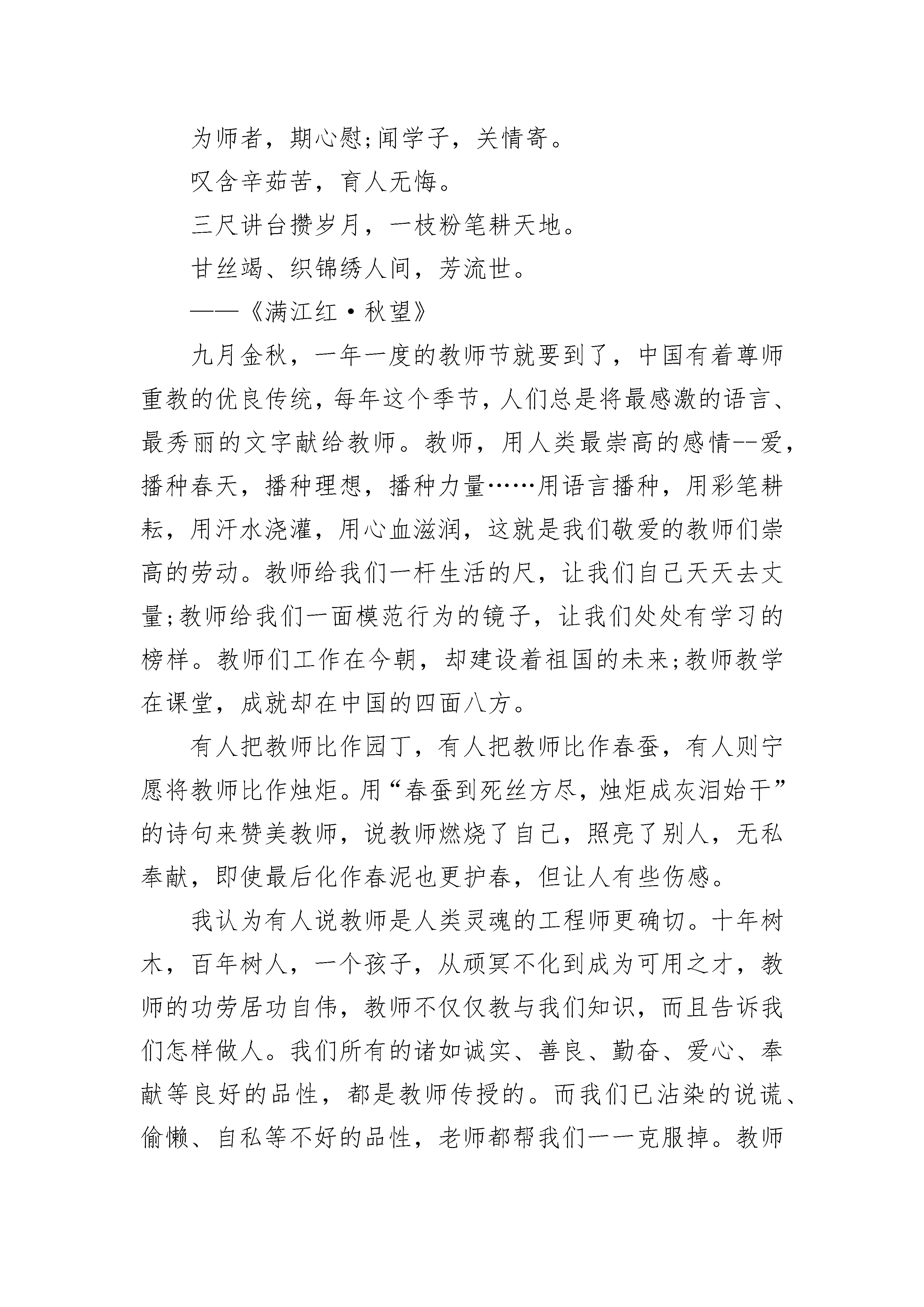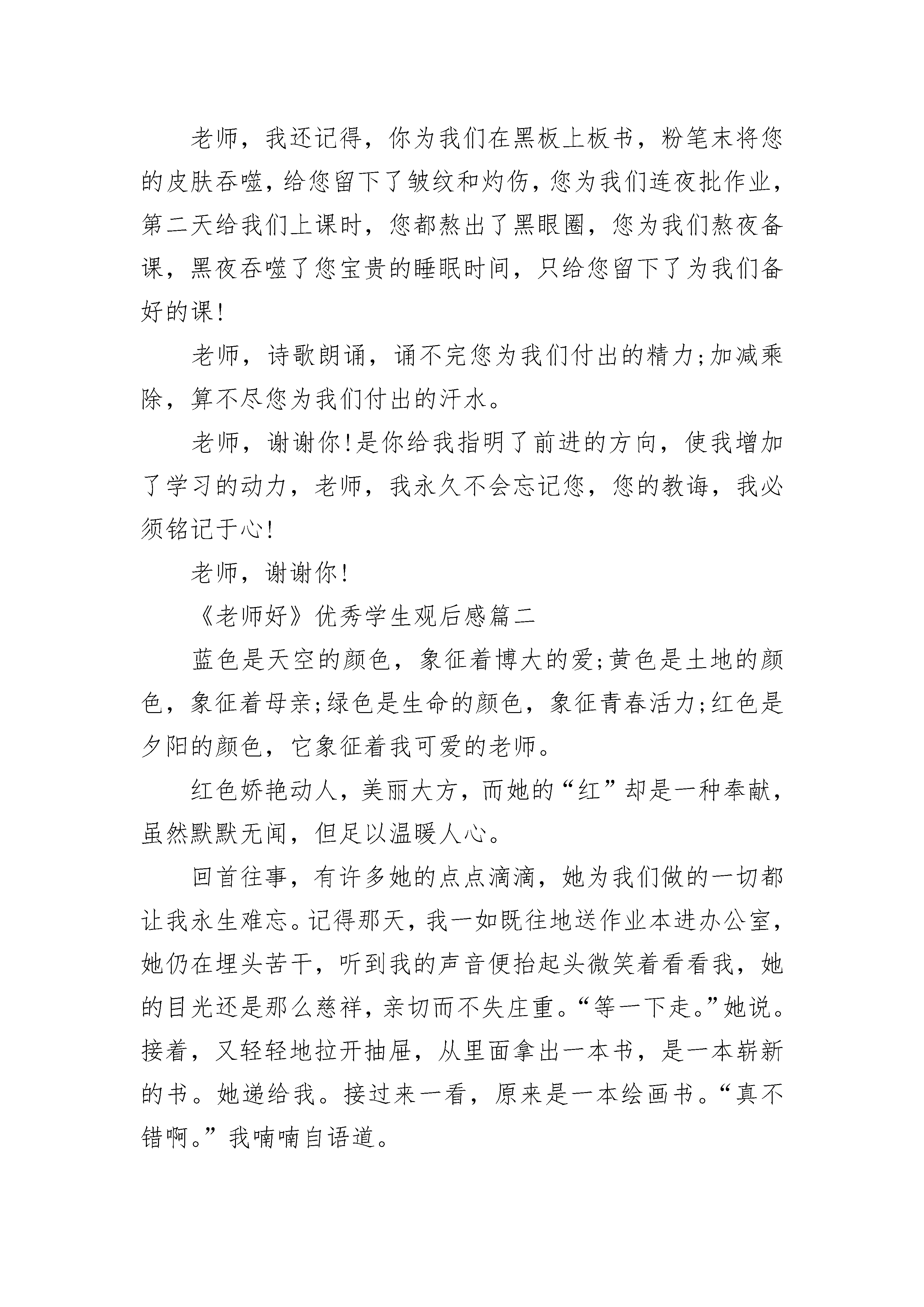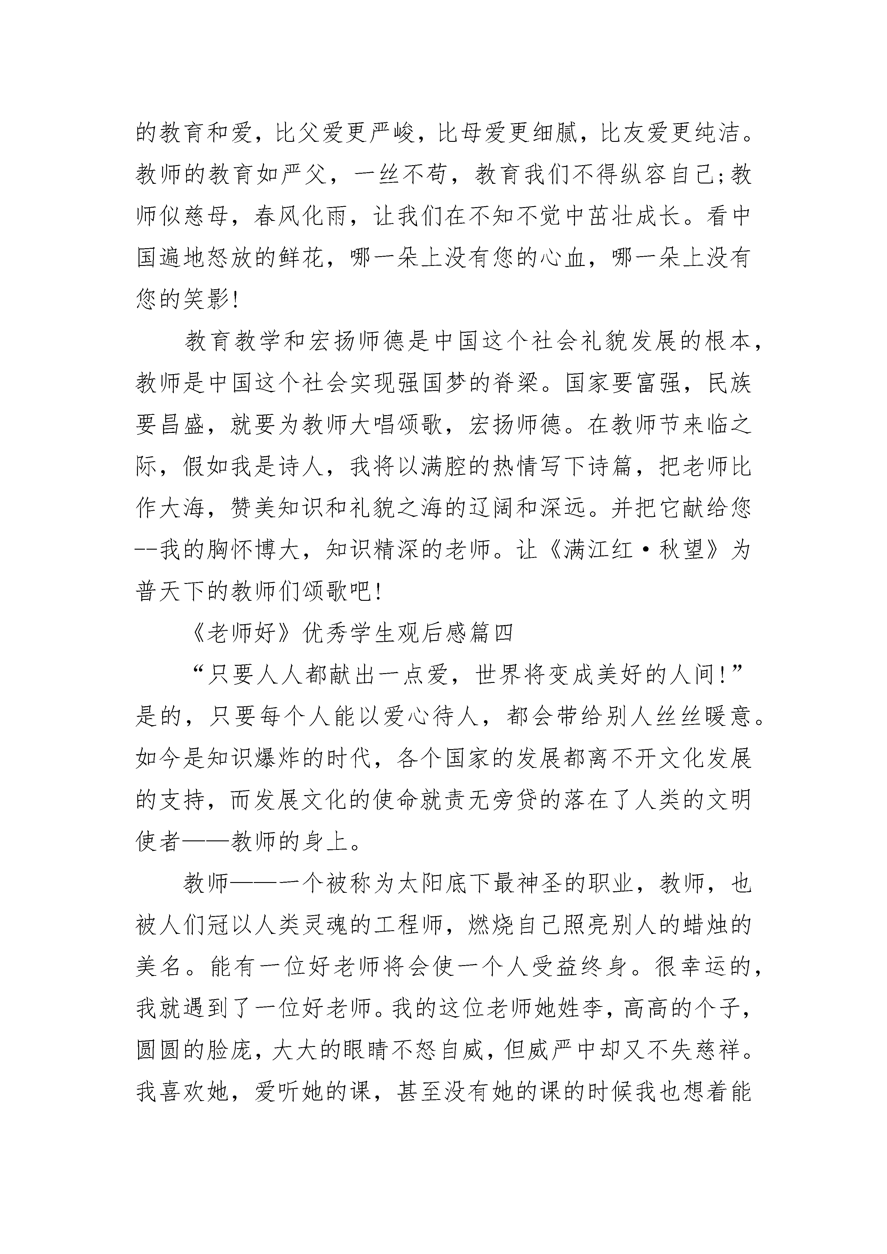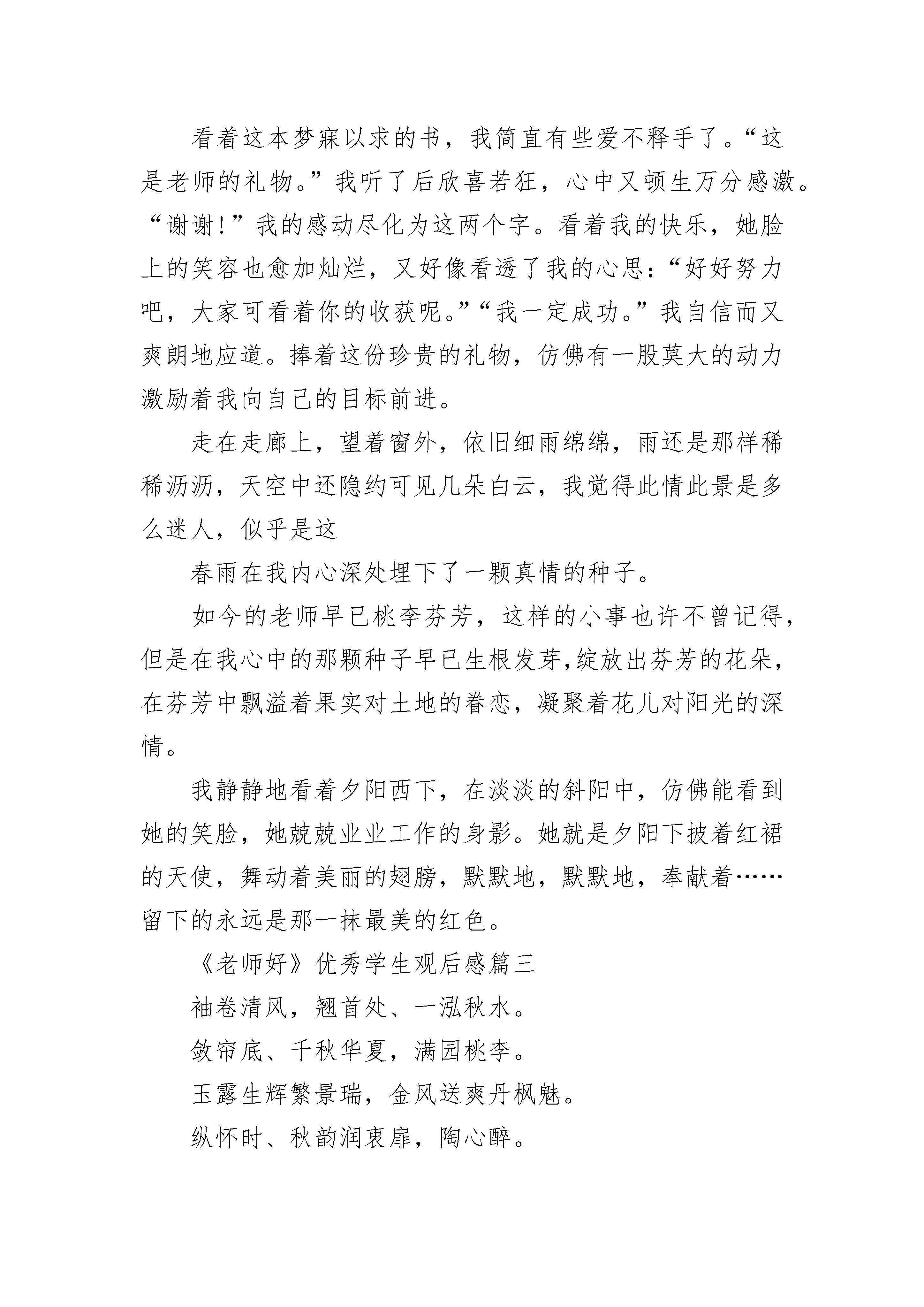 中国教育电视台大型主题直播节目《老师好》优秀学生观后感精选五篇老师,是学生的知识保险,学生的智力是打开这个保险柜的唯一钥匙。老师为了把知识教给学生,不惜放弃应有的休息时间,来为我们备课,放弃吃饭的时间,来为我们改作业。有人说,老师是辛苦的园丁,有人说,老师是人类灵魂的工程师,有人说,老师春蚕到死丝方尽,蜡烛成灰泪始干,在我看来,老师是一支蜡烛,点亮自己,照耀别人,老师,我仍然记得,那一次,我因为考试没有考好,感到十分羞愧和自责,眼泪止不住的流下来,您看到了,把我叫到了办公室,对我说:“一次考试的小失利算不了什么,重要的是,你要有一个永不放弃的心,一次考试并不能代表你的成绩,好成绩是要在实践中磨炼出来的,俗话说‘宝剑锋从磨砺出,梅花香自苦寒来’,你是一个学习比较好的学生,不能够因为小失误而气馁,而是更要好好的努力,争取下次的好成绩!,还有,你是一个男子汉,怎样能够像个女孩子一样哭呢,擦干眼泪,振作起来。”,老师,您的这番话令我彻底醒悟,我擦干了眼泪,重新振作了起来,在下次的考试中取得了好成绩,您又教育我,叫我不要骄傲,‘胜不骄,败不馁’才是强者的性格,一次考试的好成绩,只是说明了我的基础已经打好了,还就应继续努力,预习好,在期末中取得好成绩。老师,我还记得,你为我们在黑板上板书,粉笔末将您的皮肤吞噬,给您留下了皱纹和灼伤,您为我们连夜批作业,第二天给我们上课时,您都熬出了黑眼圈,您为我们熬夜备课,黑夜吞噬了您宝贵的睡眠时间,只给您留下了为我们备好的课!老师,诗歌朗诵,诵不完您为我们付出的精力;加减乘除,算不尽您为我们付出的汗水。老师,谢谢你!是你给我指明了前进的方向,使我增加了学习的动力,老师,我永久不会忘记您,您的教诲,我必须铭记于心!老师,谢谢你!《老师好》优秀学生观后感篇二蓝色是天空的颜色,象征着博大的爱;黄色是土地的颜色,象征着母亲;绿色是生命的颜色,象征青春活力;红色是夕阳的颜色,它象征着我可爱的老师。红色娇艳动人,美丽大方,而她的“红”却是一种奉献,虽然默默无闻,但足以温暖人心。回首往事,有许多她的点点滴滴,她为我们做的一切都让我永生难忘。记得那天,我一如既往地送作业本进办公室,她仍在埋头苦干,听到我的声音便抬起头微笑着看看我,她的目光还是那么慈祥,亲切而不失庄重。“等一下走。”她说。接着,又轻轻地拉开抽屉,从里面拿出一本书,是一本崭新的书。她递给我。接过来一看,原来是一本绘画书。“真不错啊。”我喃喃自语道。看着这本梦寐以求的书,我简直有些爱不释手了。“这是老师的礼物。”我听了后欣喜若狂,心中又顿生万分感激。“谢谢!”我的感动尽化为这两个字。看着我的快乐,她脸上的笑容也愈加灿烂,又好像看透了我的心思:“好好努力吧,大家可看着你的收获呢。”“我一定成功。”我自信而又爽朗地应道。捧着这份珍贵的礼物,仿佛有一股莫大的动力激励着我向自己的目标前进。走在走廊上,望着窗外,依旧细雨绵绵,雨还是那样稀稀沥沥,天空中还隐约可见几朵白云,我觉得此情此景是多么迷人,似乎是这春雨在我内心深处埋下了一颗真情的种子。如今的老师早已桃李芬芳,这样的小事也许不曾记得,但是在我心中的那颗种子早已生根发芽,绽放出芬芳的花朵,在芬芳中飘溢着果实对土地的眷恋,凝聚着花儿对阳光的深情。我静静地看着夕阳西下,在淡淡的斜阳中,仿佛能看到她的笑脸,她兢兢业业工作的身影。她就是夕阳下披着红裙的天使,舞动着美丽的翅膀,默默地,默默地,奉献着……留下的永远是那一抹最美的红色。《老师好》优秀学生观后感篇三袖卷清风,翘首处、一泓秋水。敛帘底、千秋华夏,满园桃李。玉露生辉繁景瑞,金风送爽丹枫魅。纵怀时、秋韵润衷扉,陶心醉。为师者,期心慰;闻学子,关情寄。叹含辛茹苦,育人无悔。三尺讲台攒岁月,一枝粉笔耕天地。甘丝竭、织锦绣人间,芳流世。——《满江红·秋望》九月金秋,一年一度的教师节就要到了,中国有着尊师重教的优良传统,每年这个季节,人们总是将最感激的语言、最秀丽的文字献给教师。教师,用人类最崇高的感情--爱,播种春天,播种理想,播种力量……用语言播种,用彩笔耕耘,用汗水浇灌,用心血滋润,这就是我们敬爱的教师们崇高的劳动。教师给我们一杆生活的尺,让我们自己天天去丈量;教师给我们一面模范行为的镜子,让我们处处有学习的榜样。教师们工作在今朝,却建设着祖国的未来;教师教学在课堂,成就却在中国的四面八方。有人把教师比作园丁,有人把教师比作春蚕,有人则宁愿将教师比作烛炬。用“春蚕到死丝方尽,烛炬成灰泪始干”的诗句来赞美教师,说教师燃烧了自己,照亮了别人,无私奉献,即使最后化作春泥也更护春,但让人有些伤感。我认为有人说教师是人类灵魂的工程师更确切。十年树木,百年树人,一个孩子,从顽冥不化到成为可用之才,教师的功劳居功自伟,教师不仅仅教与我们知识,而且告诉我们怎样做人。我们所有的诸如诚实