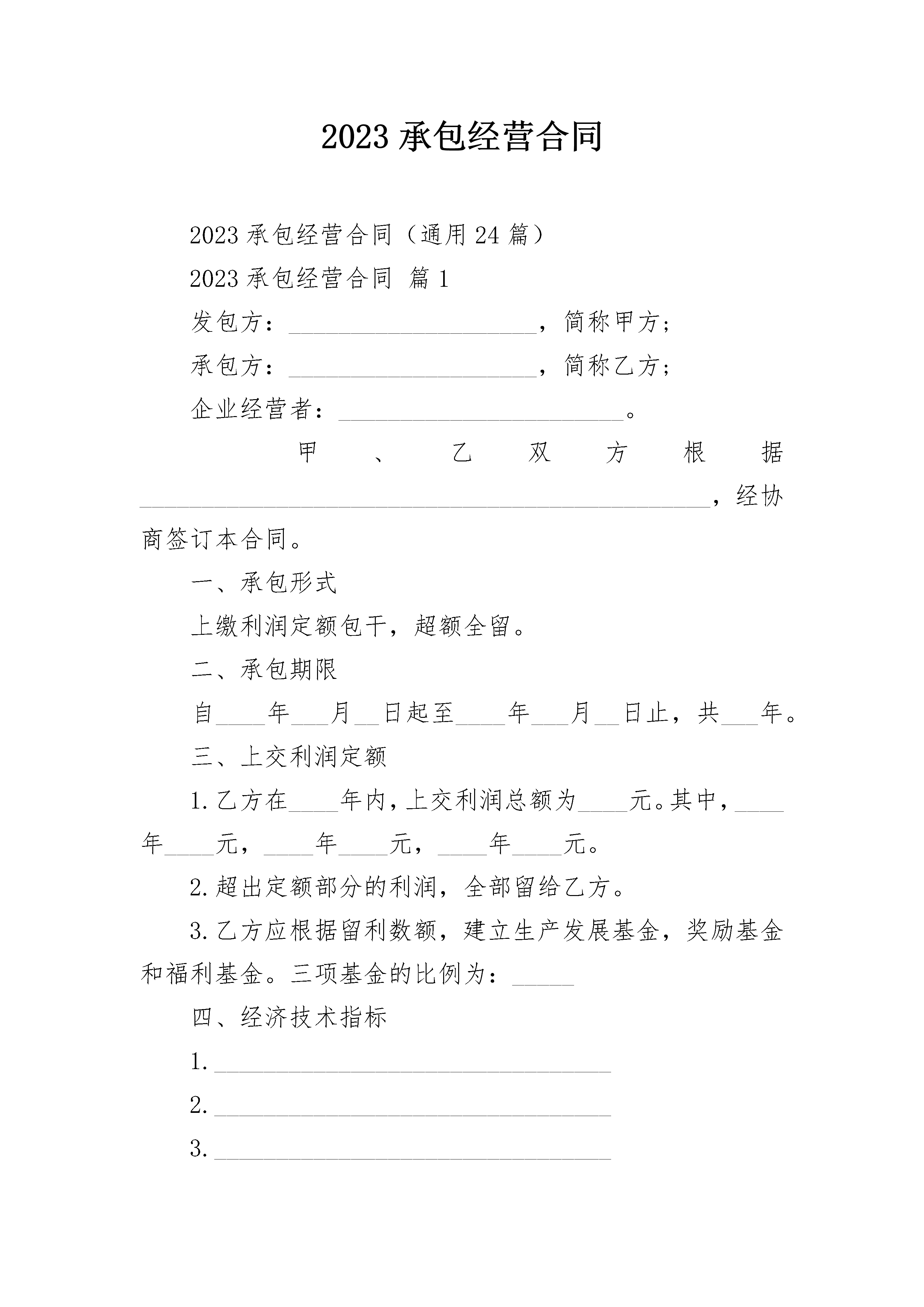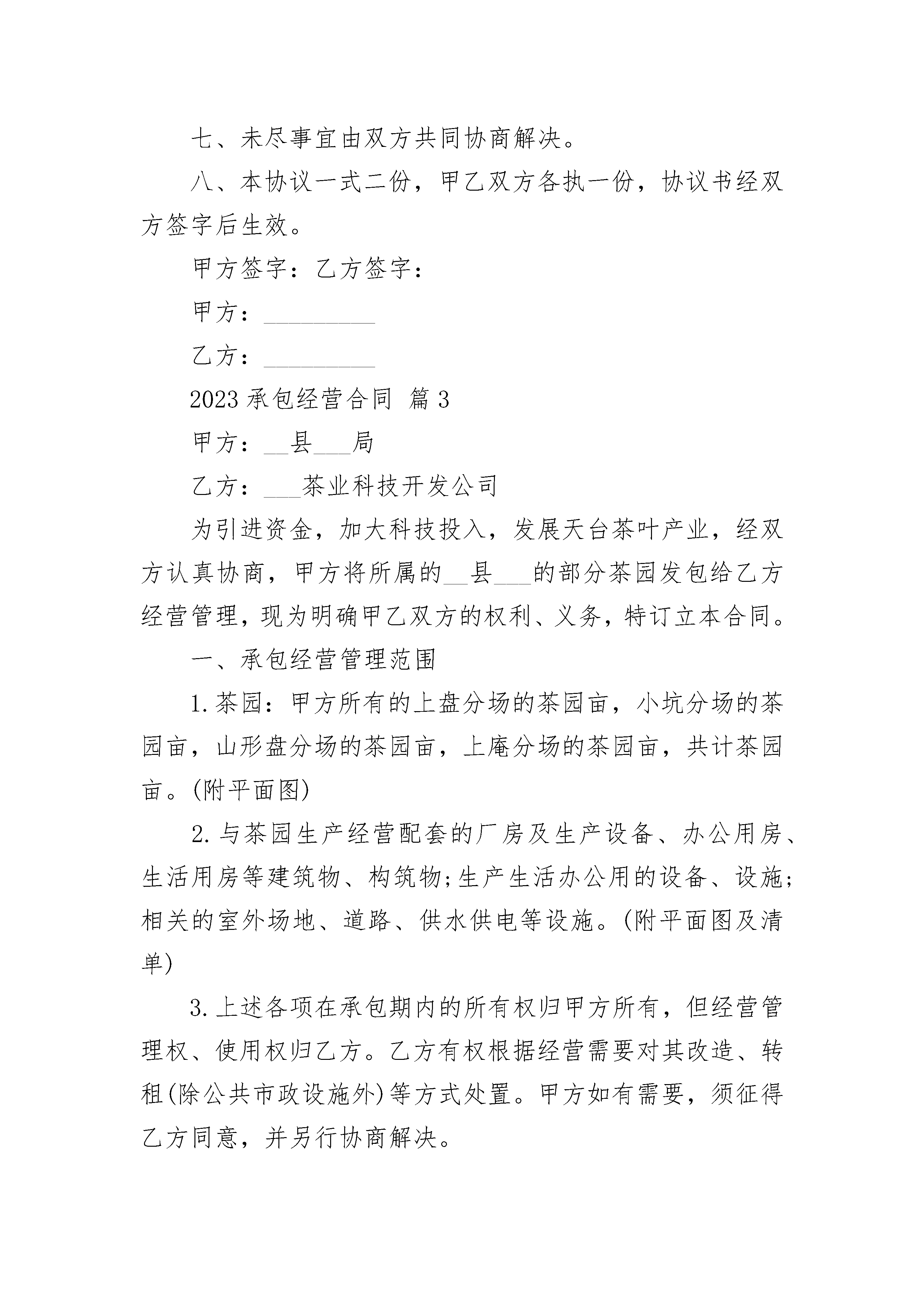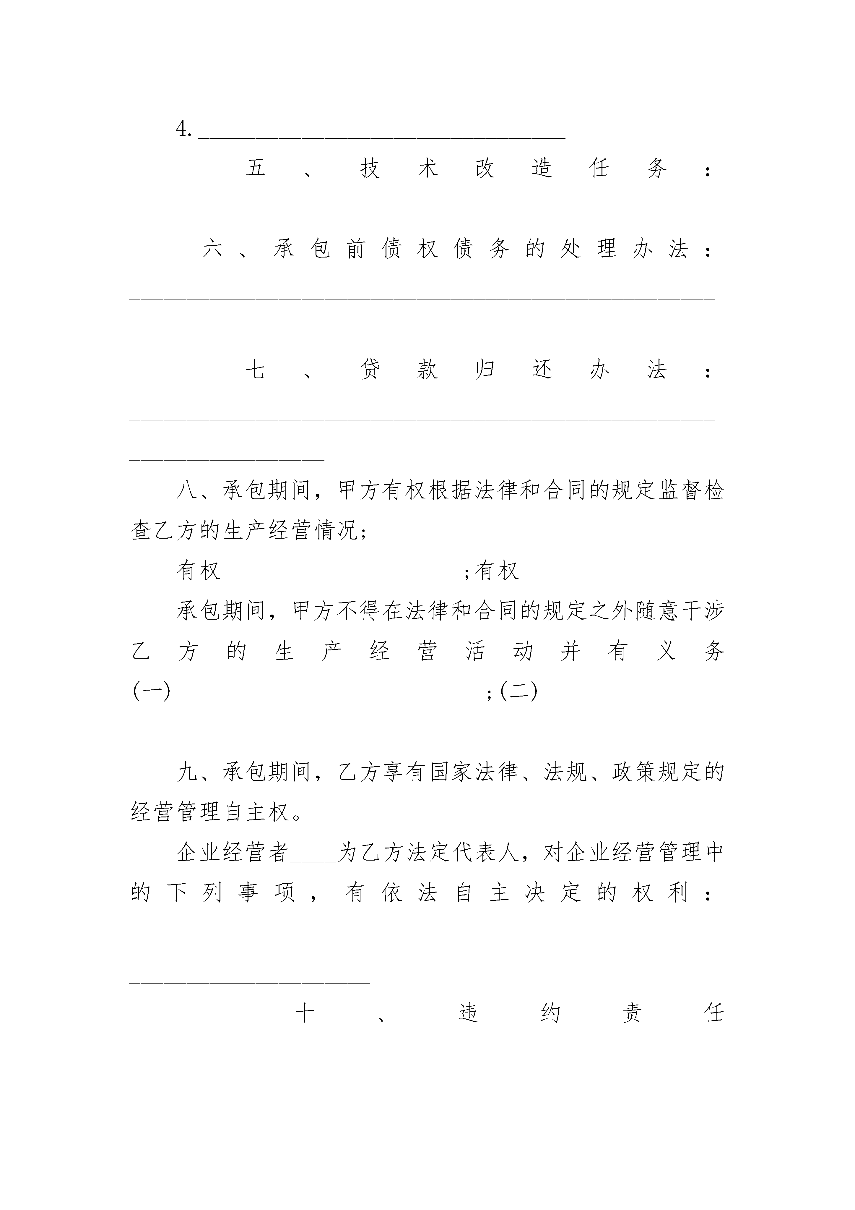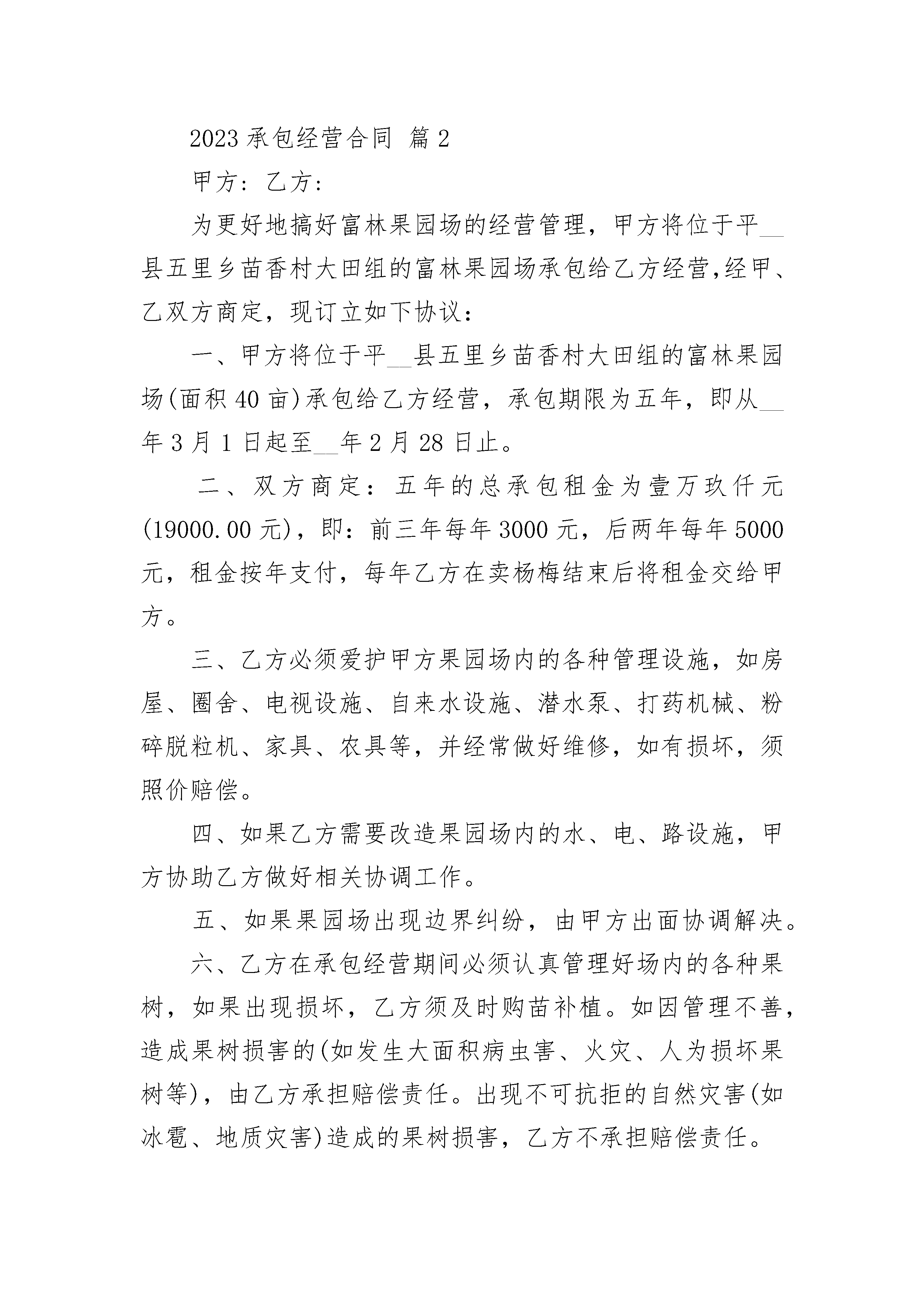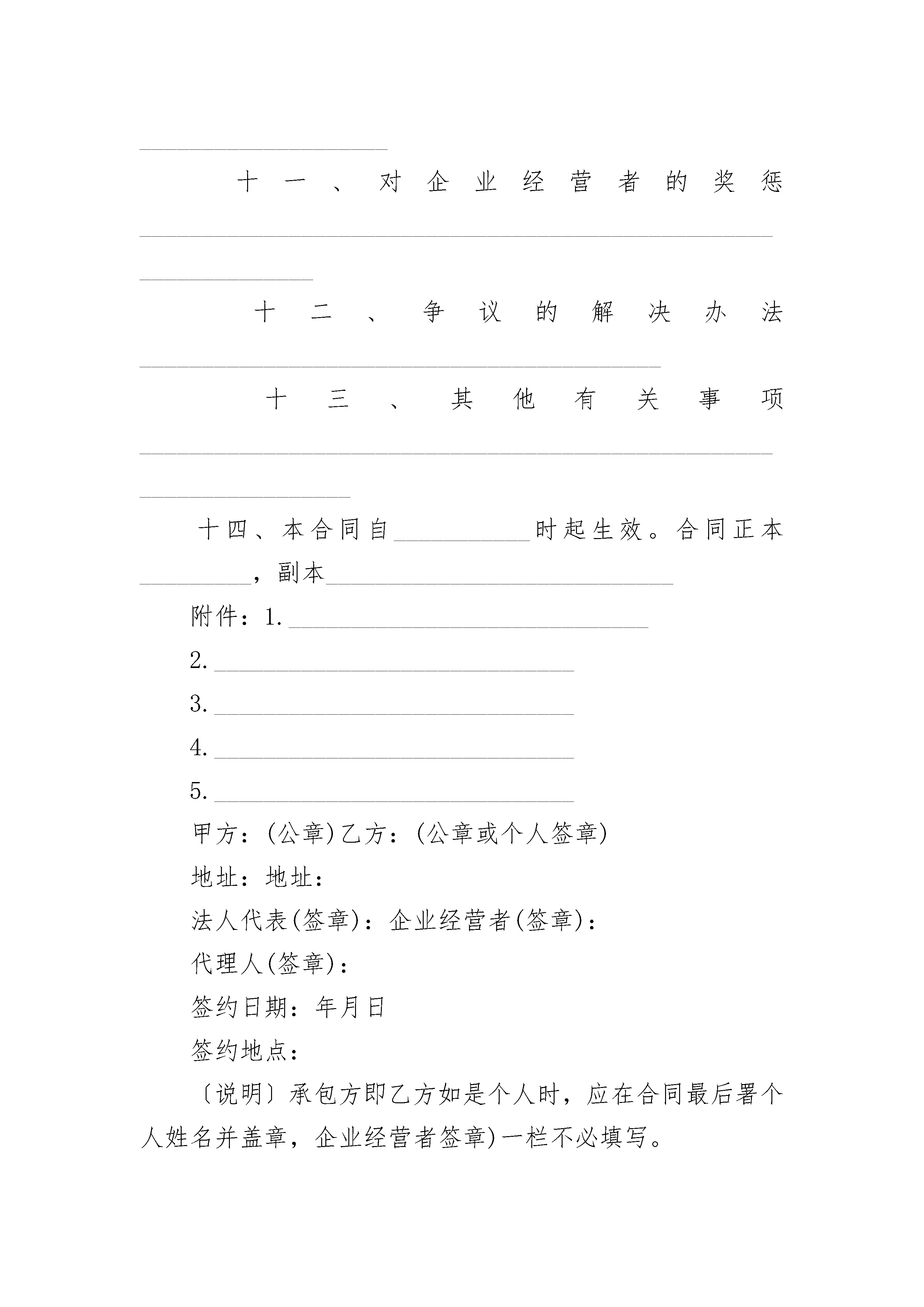 2023承包经营合同2023承包经营合同(通用24篇)2023承包经营合同篇1发包方:____________________,简称甲方;承包方:____________________,简称乙方;企业经营者:_______________________。甲、乙双方根据______________________________________________,经协商签订本合同。一、承包形式上缴利润定额包干,超额全留。二、承包期限自____年___月__日起至____年___月__日止,共___年。三、上交利润定额1.乙方在____年内,上交利润总额为____元。其中,____年____元,____年____元,____年____元。2.超出定额部分的利润,全部留给乙方。3.乙方应根据留利数额,建立生产发展基金,奖励基金和福利基金。三项基金的比例为:_____四、经济技术指标1.________________________________2.________________________________3.________________________________4.________________________________五、技术改造任务:____________________________________________六、承包前债权债务的处理办法:______________________________________________________________七、贷款归还办法:____________________________________________________________________八、承包期间,甲方有权根据法律和合同的规定监督检查乙方的生产经营情况;有权_____________________;有权________________承包期间,甲方不得在法律和合同的规定之外随意干涉乙方的生产经营活动并有义务(一)___________________________;(二)____________________________________________九、承包期间,乙方享有国家法律、法规、政策规定的经营管理自主权。企业经营者____为乙方法定代表人,对企业经营管理中的下列事项,有依法自主决定的权利:________________________________________________________________________十、违约责任_______________________________________________________________________十一、对企业经营者的奖惩_________________________________________________________________十二、争议的解决办法__________________________________________十三、其他有关事项____________________________________________________________________十四、本合同自___________时起生效。合同正本_________,副本____________________________附件:1._____________________________2._____________________________3._____________________________4._____________________________5._____________________________甲方:(公章)乙方:(公章或个人签章)地址:地址:法人代表(签章):企业经营者(签章):代理人(签章):签约日期:年月日签约地点:〔说明〕承包方即乙方如是个人时,应在合同最后署个人姓名并盖章,企业经营者签章)一栏不必填写。2023承包经营合同篇2甲方:乙方:为更好地搞好富林果园场的经营管理,甲方将位于平__县五里乡苗香村大田组的富林果园场承包给乙方经营,经甲、乙双方商定,现订立如下协议:一、甲方将位于平__县五里乡苗香村大田组的富林果园场(面积40亩)承包给乙方经营,承包期限为五年,即从__年3月1日起至__年2月28日止。二、双方商定:五年的总承包租金为壹万玖仟元(19000.00元),即:前三年每年3000元,后两年每年5000元,租金按年支付,每年乙方在卖杨梅结束后将租金交给甲方。三、乙方必须爱护甲方果园场内的各种管理设施,如房屋、圈舍、电视设施、自来水设施、潜水泵、打药机械、粉碎脱粒机、家具、农具等,并经常做