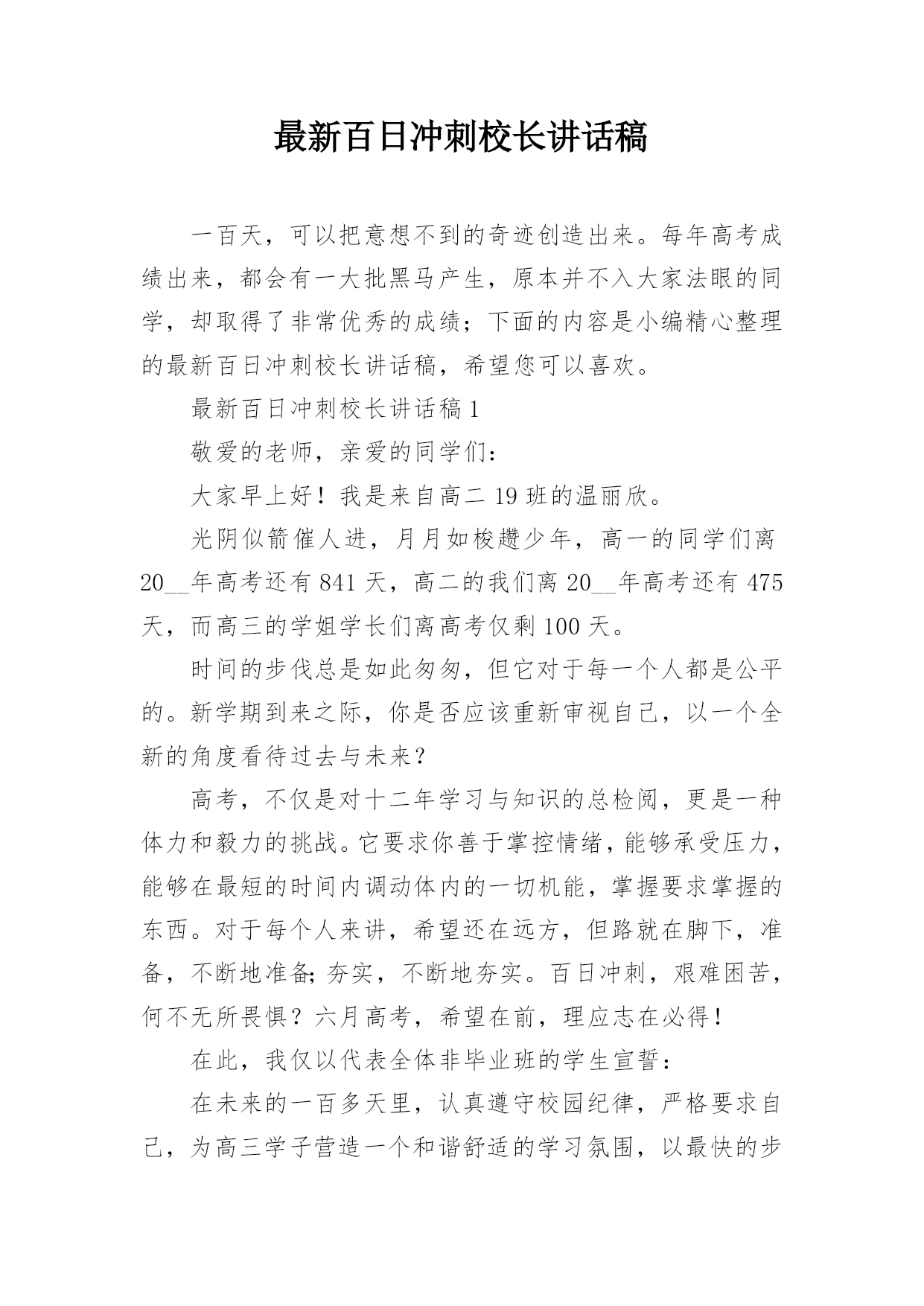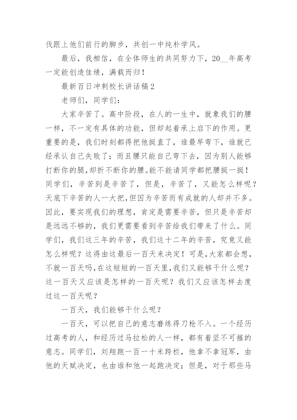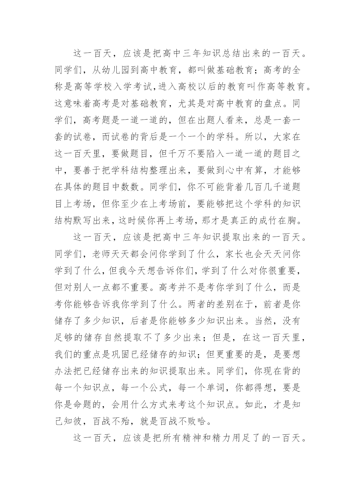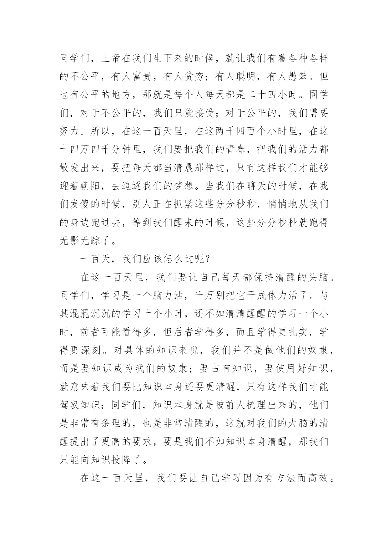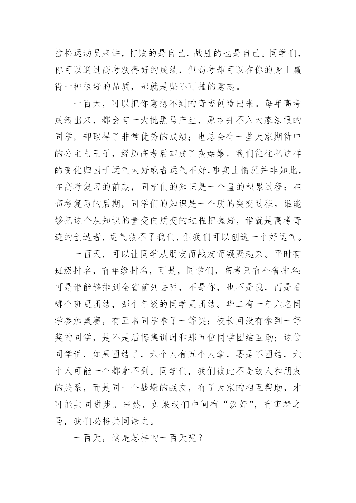 最新百日冲刺校长讲话稿 一百天,可以把意想不到的奇迹创造出来。每年高考成绩出来,都会有一大批黑马产生,原本并不入大家法眼的同学,却取得了非常优秀的成绩;下面的内容是小编精心整理的最新百日冲刺校长讲话稿,希望您可以喜欢。最新百日冲刺校长讲话稿1敬爱的老师,亲爱的同学们:大家早上好!我是来自高二19班的温丽欣。光阴似箭催人进,月月如梭趱少年,高一的同学们离20__年高考还有841天,高二的我们离20__年高考还有475天,而高三的学姐学长们离高考仅剩100天。时间的步伐总是如此匆匆,但它对于每一个人都是公平的。新学期到来之际,你是否应该重新审视自己,以一个全新的角度看待过去与未来?高考,不仅是对十二年学习与知识的总检阅,更是一种体力和毅力的挑战。它要求你善于掌控情绪,能够承受压力,能够在最短的时间内调动体内的一切机能,掌握要求掌握的东西。对于每个人来讲,希望还在远方,但路就在脚下,准备,不断地准备;夯实,不断地夯实。百日冲刺,艰难困苦,何不无所畏惧?六月高考,希望在前,理应志在必得!在此,我仅以代表全体非毕业班的学生宣誓:在未来的一百多天里,认真遵守校园纪律,严格要求自己,为高三学子营造一个和谐舒适的学习氛围,以最快的步伐跟上他们前行的脚步,共创一中纯朴学风。最后,我相信,在全体师生的共同努力下,20__年高考一定能创造佳绩,满载而归!最新百日冲刺校长讲话稿2老师们,同学们:大家辛苦了。高中阶段,在人的一生中,就象我们的腰一样,不一定有具体的功能,但却起着承上启下的作用。更重要的是,我们时刻都得把他挺直了,谁最早弯下,谁就已经承认自己失败了;而且腰只能自己弯下去,因为别人能够打断你的腿,却折不断你的腰。能不能请同学都把腰挺一挺!同学们,辛苦到是辛苦了,但是,辛苦了,又能怎么样呢?天底下辛苦的人一大把,但因为辛苦而有成就的人却并不多。因此,要实现我们的理想,肯定是需要辛苦,但只是辛苦却是远远不够的,我们更需要看到辛苦给我们带来了什么。同学们,我们这三年的辛苦,我们这十二年的辛苦,究竟又能怎么样呢?这得由这最后一百天来决定!可是,大家都会想,不就一百天吗,在这短短的一百天里,我们又能够干什么呢?这一百天又应该是怎样的一百天呢?我们又应该怎样去度过这一百天呢?一百天,我们能够干什么呢?一百天,可以把自己的意志磨练得刀枪不入。一个经历过高考的人,和经历过马拉松的人一样,都有着坚不可摧的意志。同学们,刘翔跑一百一十米跨栏,他拿不拿冠军,由他的天赋决定,也由谁和他一起跑决定;但是,对于那些马拉松运动员来讲,打败的是自己,战胜的也是自己。同学们,你可以通过高考获得好的成绩,但高考却可以在你的身上赢得一种很好的品质,那就是坚不可摧的意志。一百天,可以把你意想不到的奇迹创造出来。每年高考成绩出来,都会有一大批黑马产生,原本并不入大家法眼的同学,却取得了非常优秀的成绩;也总会有一些大家期待中的公主与王子,经历高考后却成了灰姑娘。我们往往把这样的变化归因于运气太好或者运气不好,事实上情况并非如此,在高考复习的前期,同学们的知识是一个量的积累过程;在高考复习的后期,同学们的知识是一个质的突变过程。谁能够把这个从知识的量变向质变的过程把握好,谁就是高考奇迹的创造者,运气救不了我们,但我们可以创造一个好运气。一百天,可以让同学从朋友而战友而凝聚起来。平时有班级排名,有年级排名,可是,同学们,高考只有全省排名;可是谁能够排到全省前列去呢,不是你,也不是我,而是看哪个班更团结,哪个年级的同学更团结。华二有一年六名同学参加奥赛,有五名同学拿了一等奖;校长问没有拿到一等奖的同学,是不是后悔集训时和那五位同学团结互助;这位同学说,如果团结了,六个人有五个人拿,要是不团结,六个人可能一个都拿不到。同学们,我们彼此不是敌人和朋友的关系,而是同一个战壕的战友,有了大家的相互帮助,才可能共同进步。当然,如果我们中间有“汉奸”,有害群之马,我们必将共同诛之。一百天,这是怎样的一百天呢?这一百天,应该是把高中三年知识总结出来的一百天。同学们,从幼儿园到高中教育,都叫做基础教育;高考的全称是高等学校入学考试,进入高校以后的教育叫作高等教育。这意味着高考是对基础教育,尤其是对高中教育的盘点。同学们,高考题是一道一道的,但在出题人看来,总是一套一套的试卷,而试卷的背后是一个一个的学科。所以,大家在这一百天里,要做题目,但千万不要陷入一道一道的题目之中,要善于把学科结构整理出来,要做到心中有算,才能够在具体的题目中数数。同学们,你不可能背着几百几千道题目上考场,但你至少在上考场前,要能够把这个学科的知识结构默写出来,这时候你再上考场,那才是真正的成竹在胸。这一百天,应该是把高中三年知识提取出来的一百天。同学们,老师天天都会问你学到了什么,家长也会天天问你学到了什么,但我今天想告诉你们,