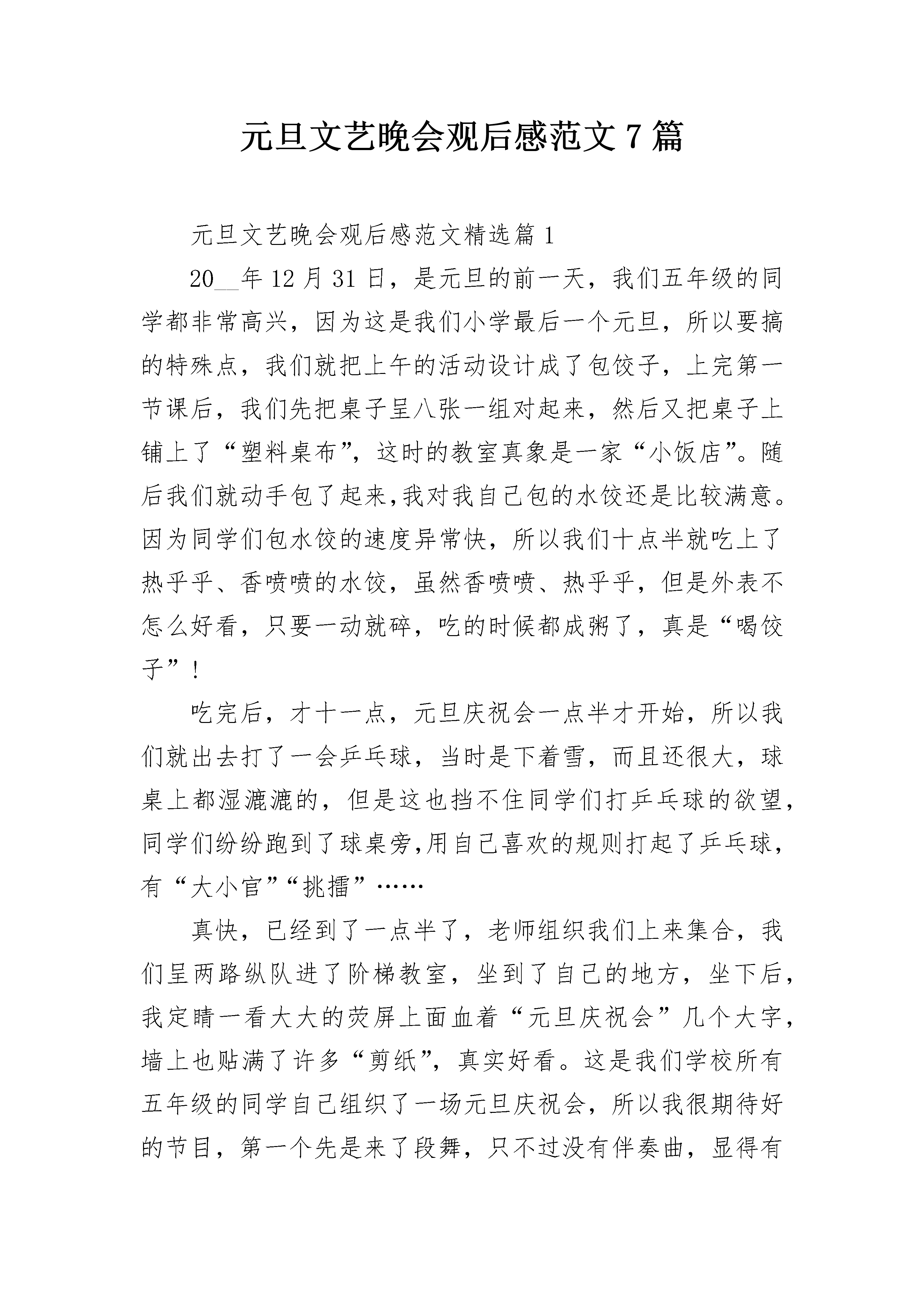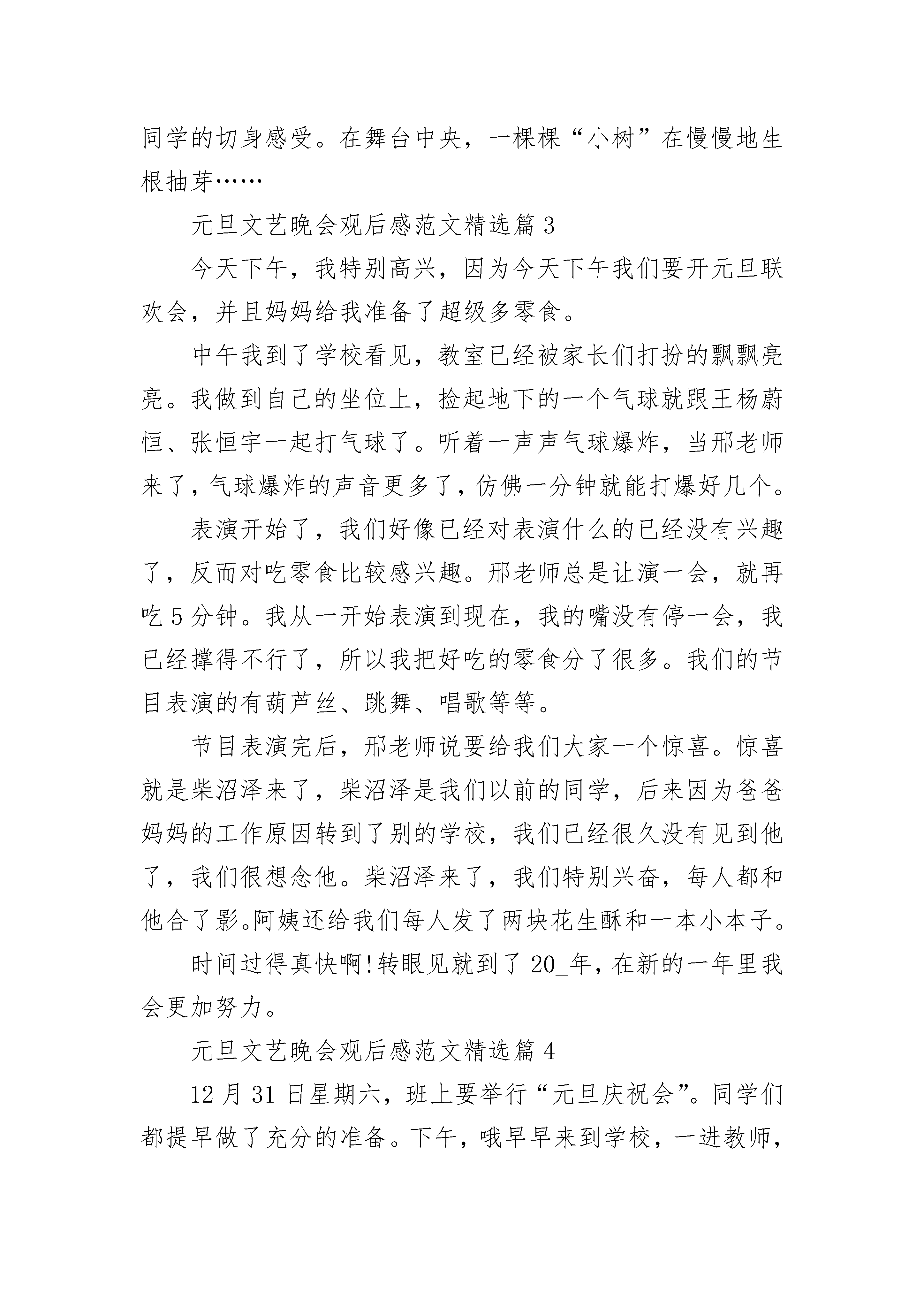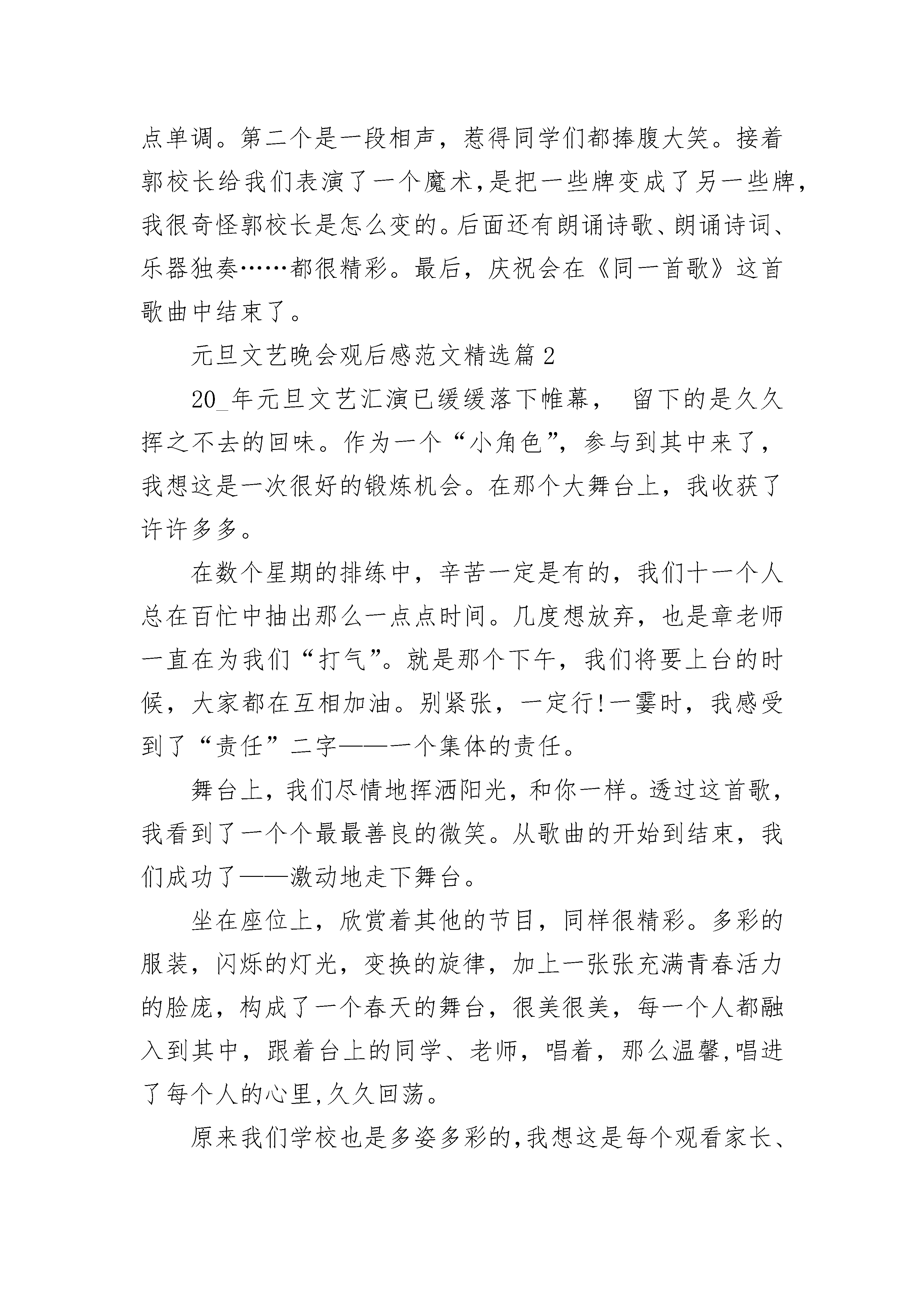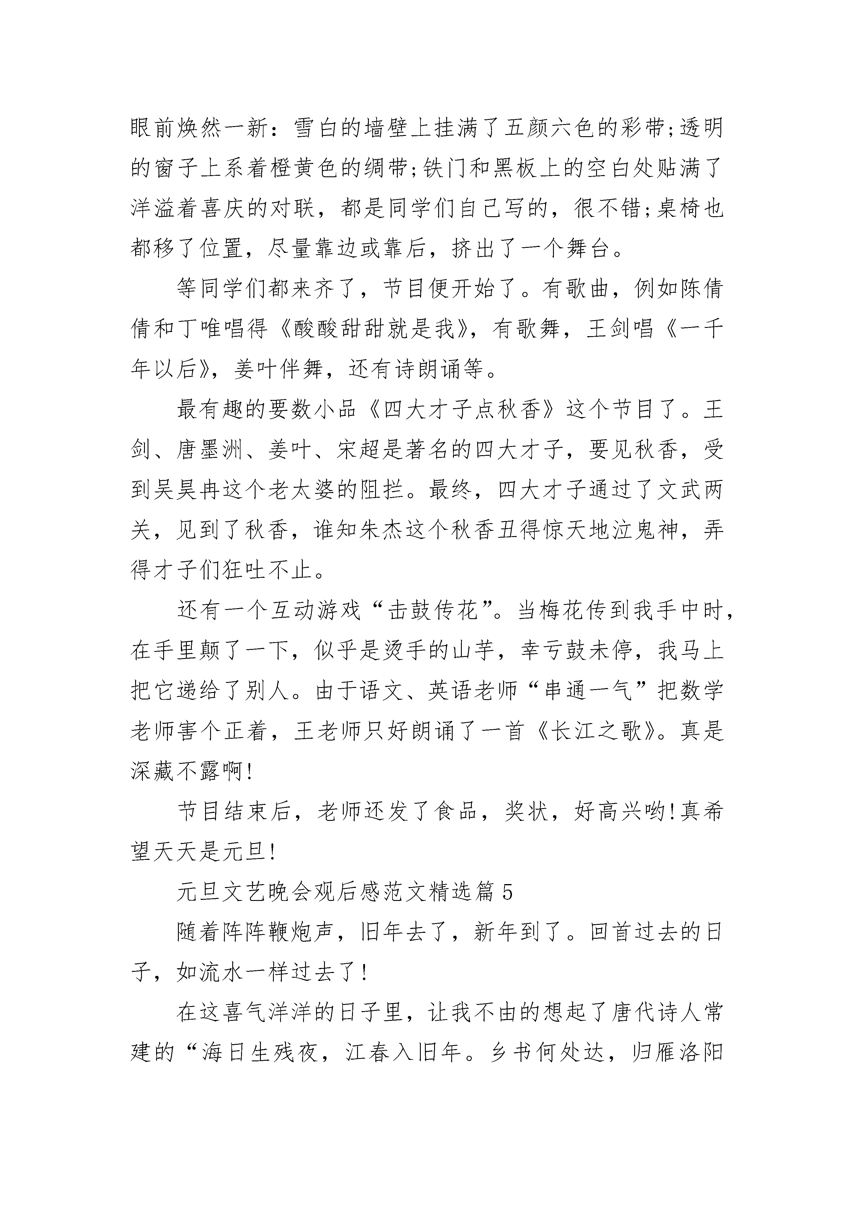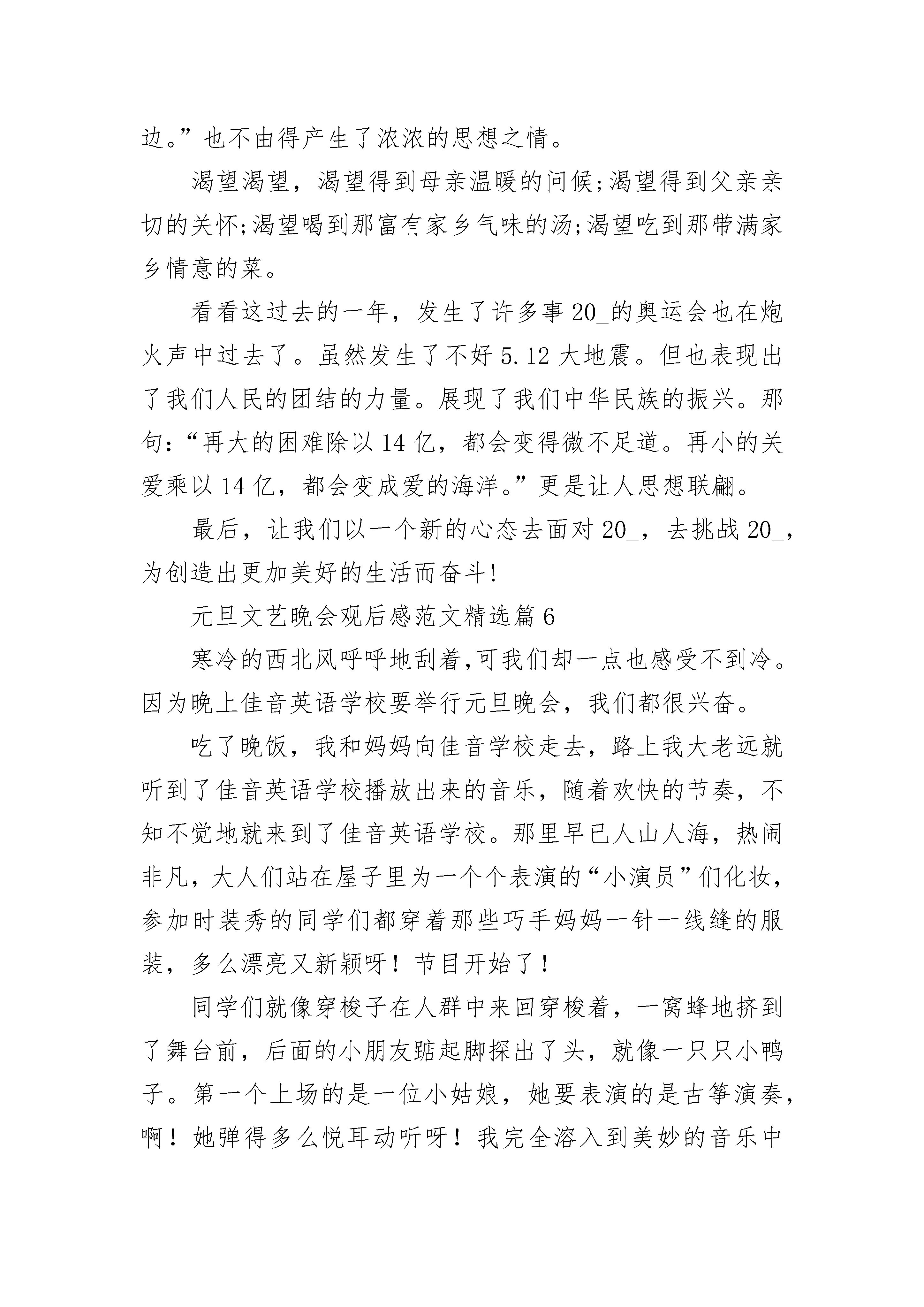 元旦文艺晚会观后感范文7篇元旦文艺晚会观后感范文精选篇120__年12月31日,是元旦的前一天,我们五年级的同学都非常高兴,因为这是我们小学最后一个元旦,所以要搞的特殊点,我们就把上午的活动设计成了包饺子,上完第一节课后,我们先把桌子呈八张一组对起来,然后又把桌子上铺上了“塑料桌布”,这时的教室真象是一家“小饭店”。随后我们就动手包了起来,我对我自己包的水饺还是比较满意。因为同学们包水饺的速度异常快,所以我们十点半就吃上了热乎乎、香喷喷的水饺,虽然香喷喷、热乎乎,但是外表不怎么好看,只要一动就碎,吃的时候都成粥了,真是“喝饺子”!吃完后,才十一点,元旦庆祝会一点半才开始,所以我们就出去打了一会乒乓球,当时是下着雪,而且还很大,球桌上都湿漉漉的,但是这也挡不住同学们打乒乓球的欲望,同学们纷纷跑到了球桌旁,用自己喜欢的规则打起了乒乓球,有“大小官”“挑擂”……真快,已经到了一点半了,老师组织我们上来集合,我们呈两路纵队进了阶梯教室,坐到了自己的地方,坐下后,我定睛一看大大的荧屏上面血着“元旦庆祝会”几个大字,墙上也贴满了许多“剪纸”,真实好看。这是我们学校所有五年级的同学自己组织了一场元旦庆祝会,所以我很期待好的节目,第一个先是来了段舞,只不过没有伴奏曲,显得有点单调。第二个是一段相声,惹得同学们都捧腹大笑。接着郭校长给我们表演了一个魔术,是把一些牌变成了另一些牌,我很奇怪郭校长是怎么变的。后面还有朗诵诗歌、朗诵诗词、乐器独奏……都很精彩。最后,庆祝会在《同一首歌》这首歌曲中结束了。元旦文艺晚会观后感范文精选篇220_年元旦文艺汇演已缓缓落下帷幕,留下的是久久挥之不去的回味。作为一个“小角色”,参与到其中来了,我想这是一次很好的锻炼机会。在那个大舞台上,我收获了许许多多。在数个星期的排练中,辛苦一定是有的,我们十一个人总在百忙中抽出那么一点点时间。几度想放弃,也是章老师一直在为我们“打气”。就是那个下午,我们将要上台的时候,大家都在互相加油。别紧张,一定行!一霎时,我感受到了“责任”二字——一个集体的责任。舞台上,我们尽情地挥洒阳光,和你一样。透过这首歌,我看到了一个个最最善良的微笑。从歌曲的开始到结束,我们成功了——激动地走下舞台。坐在座位上,欣赏着其他的节目,同样很精彩。多彩的服装,闪烁的灯光,变换的旋律,加上一张张充满青春活力的脸庞,构成了一个春天的舞台,很美很美,每一个人都融入到其中,跟着台上的同学、老师,唱着,那么温馨,唱进了每个人的心里,久久回荡。原来我们学校也是多姿多彩的,我想这是每个观看家长、同学的切身感受。在舞台中央,一棵棵“小树”在慢慢地生根抽芽……元旦文艺晚会观后感范文精选篇3今天下午,我特别高兴,因为今天下午我们要开元旦联欢会,并且妈妈给我准备了超级多零食。中午我到了学校看见,教室已经被家长们打扮的飘飘亮亮。我做到自己的坐位上,捡起地下的一个气球就跟王杨蔚恒、张恒宇一起打气球了。听着一声声气球爆炸,当邢老师来了,气球爆炸的声音更多了,仿佛一分钟就能打爆好几个。表演开始了,我们好像已经对表演什么的已经没有兴趣了,反而对吃零食比较感兴趣。邢老师总是让演一会,就再吃5分钟。我从一开始表演到现在,我的嘴没有停一会,我已经撑得不行了,所以我把好吃的零食分了很多。我们的节目表演的有葫芦丝、跳舞、唱歌等等。节目表演完后,邢老师说要给我们大家一个惊喜。惊喜就是柴沼泽来了,柴沼泽是我们以前的同学,后来因为爸爸妈妈的工作原因转到了别的学校,我们已经很久没有见到他了,我们很想念他。柴沼泽来了,我们特别兴奋,每人都和他合了影。阿姨还给我们每人发了两块花生酥和一本小本子。时间过得真快啊!转眼见就到了20_年,在新的一年里我会更加努力。元旦文艺晚会观后感范文精选篇412月31日星期六,班上要举行“元旦庆祝会”。同学们都提早做了充分的准备。下午,哦早早来到学校,一进教师,眼前焕然一新:雪白的墙壁上挂满了五颜六色的彩带;透明的窗子上系着橙黄色的绸带;铁门和黑板上的空白处贴满了洋溢着喜庆的对联,都是同学们自己写的,很不错;桌椅也都移了位置,尽量靠边或靠后,挤出了一个舞台。等同学们都来齐了,节目便开始了。有歌曲,例如陈倩倩和丁唯唱得《酸酸甜甜就是我》,有歌舞,王剑唱《一千年以后》,姜叶伴舞,还有诗朗诵等。最有趣的要数小品《四大才子点秋香》这个节目了。王剑、唐墨洲、姜叶、宋超是著名的四大才子,要见秋香,受到吴昊冉这个老太婆的阻拦。最终,四大才子通过了文武两关,见到了秋香,谁知朱杰这个秋香丑得惊天地泣鬼神,弄得才子们狂吐不止。还有一个互动游戏“击鼓传花”。当梅花传到我手中时,在手里颠了一下,似乎是烫手的山芋,幸亏鼓未停,我马上把它递给了别人。由于语文、英语老师“串通一气”把数学老师害个正着,王老师只好朗诵了一首《长江之歌》。真是深藏不露啊!节