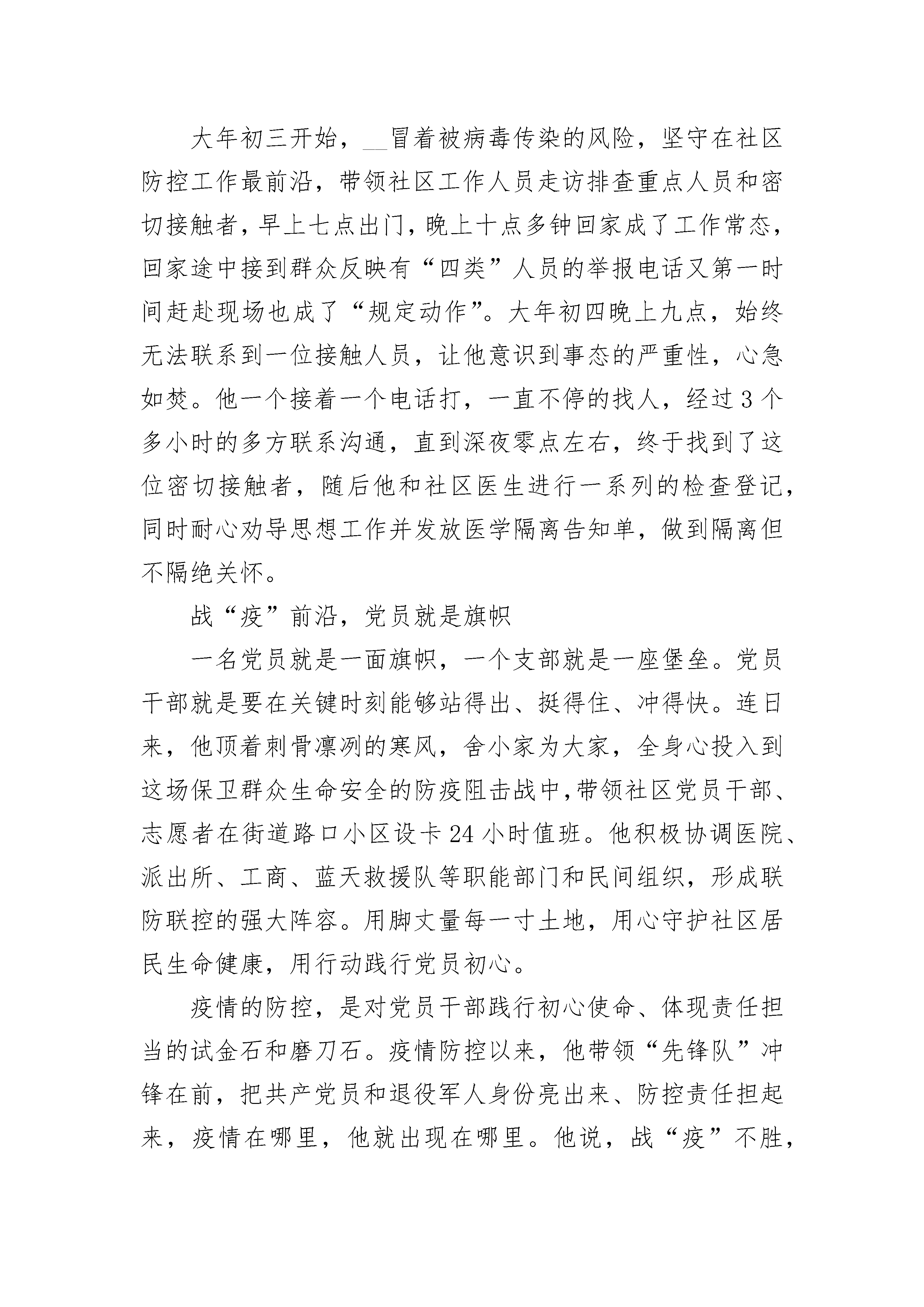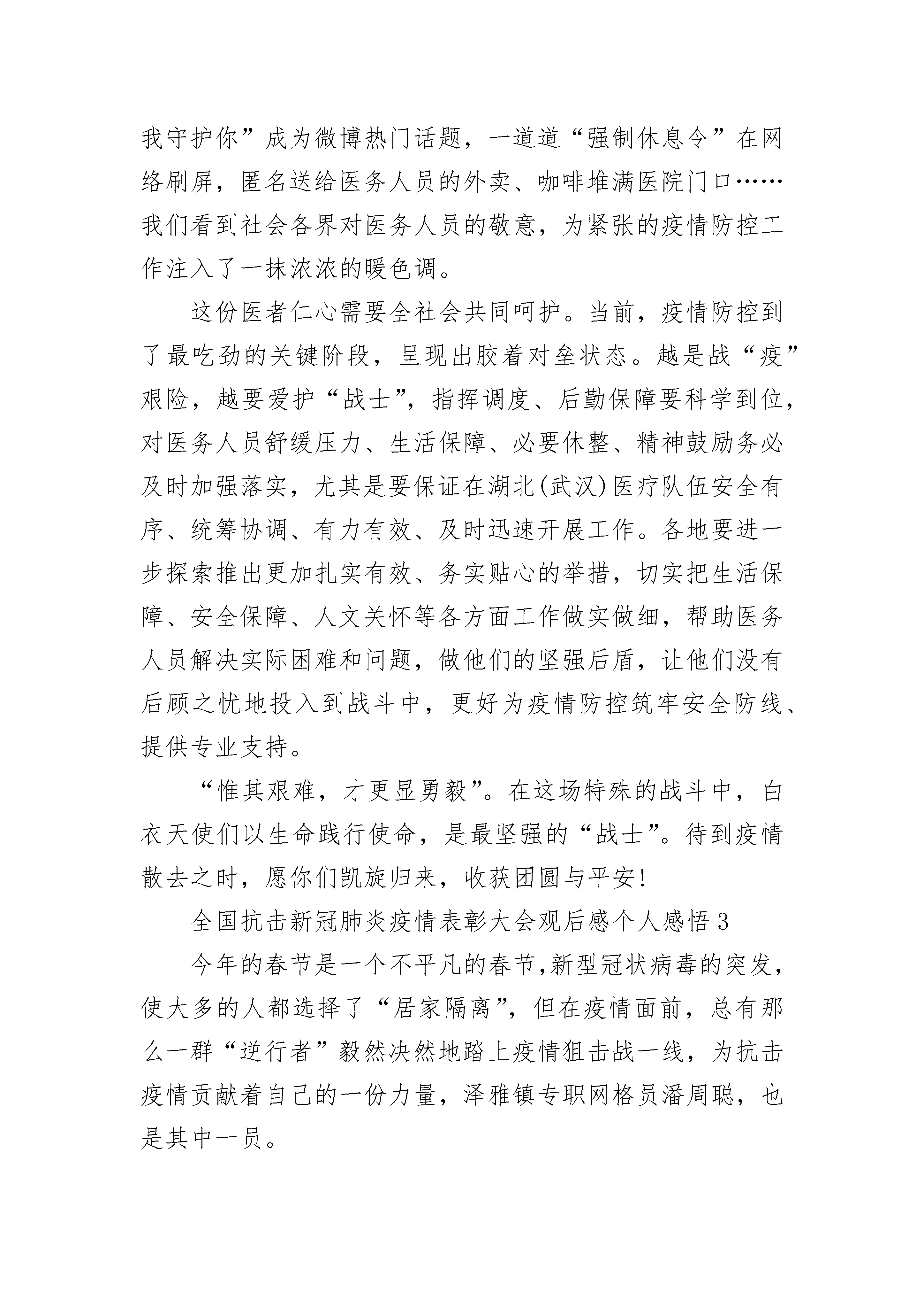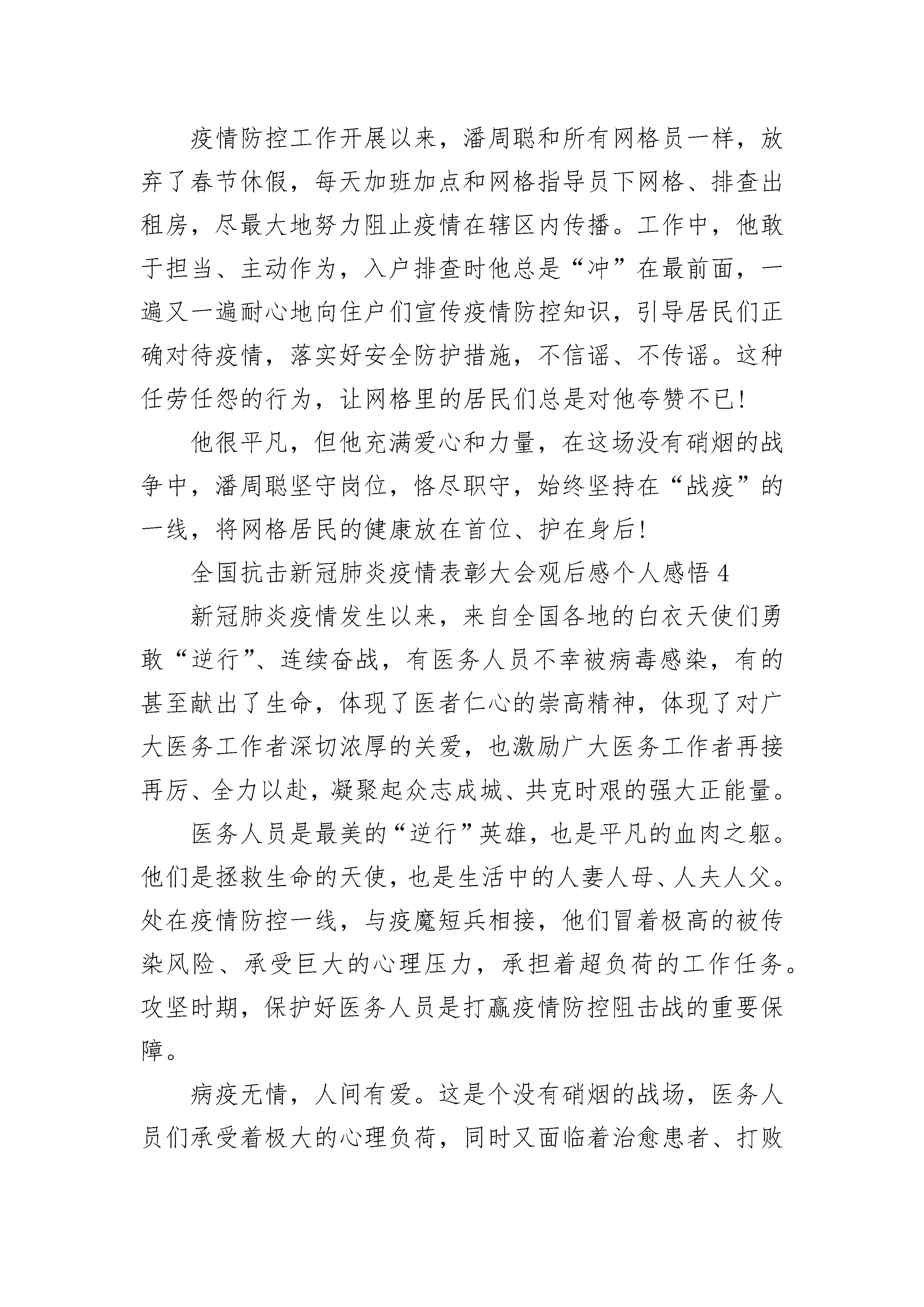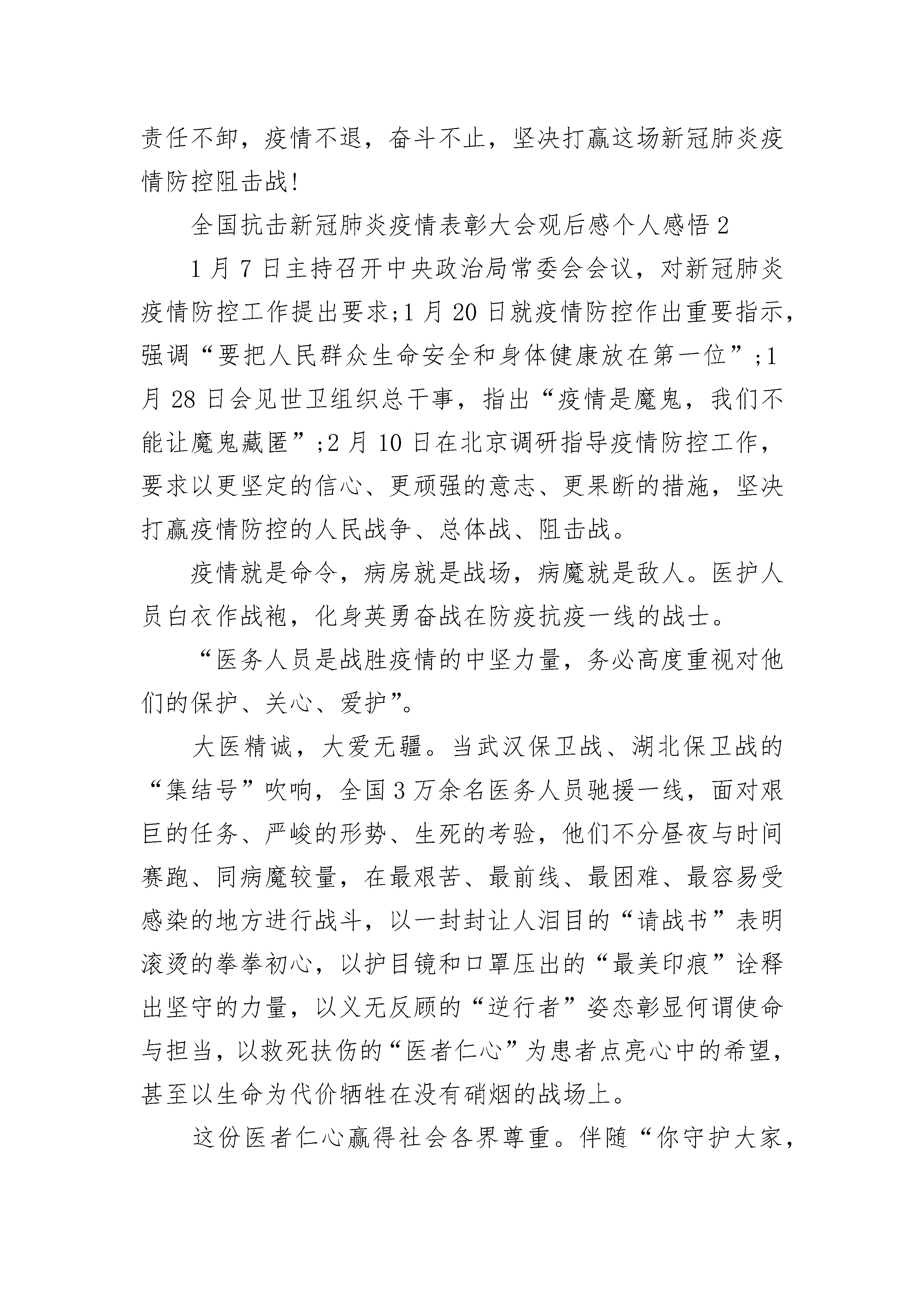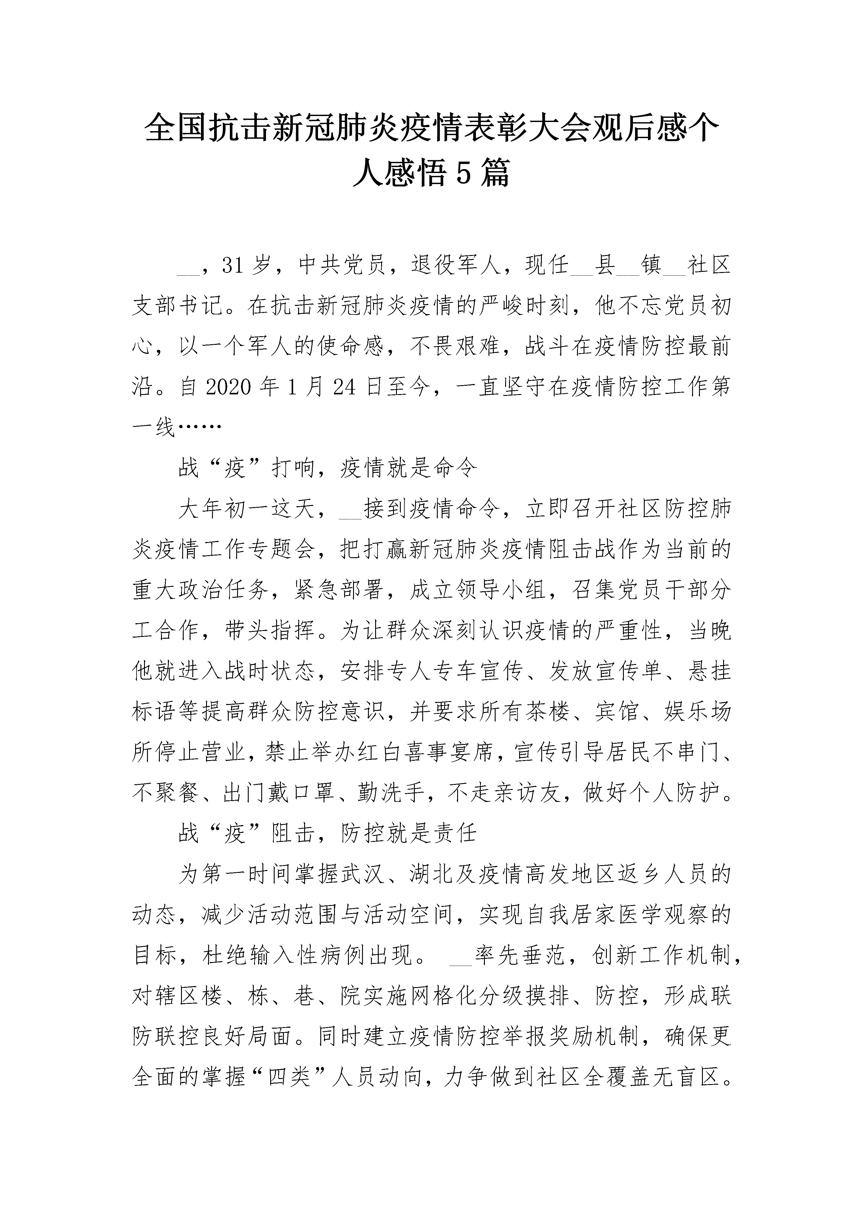 全国抗击新冠肺炎疫情表彰大会观后感个人感悟5篇__,31岁,中共党员,退役军人,现任__县__镇__社区支部书记。在抗击新冠肺炎疫情的严峻时刻,他不忘党员初心,以一个军人的使命感,不畏艰难,战斗在疫情防控最前沿。自2020年1月24日至今,一直坚守在疫情防控工作第一线……战“疫”打响,疫情就是命令大年初一这天,__接到疫情命令,立即召开社区防控肺炎疫情工作专题会,把打赢新冠肺炎疫情阻击战作为当前的重大政治任务,紧急部署,成立领导小组,召集党员干部分工合作,带头指挥。为让群众深刻认识疫情的严重性,当晚他就进入战时状态,安排专人专车宣传、发放宣传单、悬挂标语等提高群众防控意识,并要求所有茶楼、宾馆、娱乐场所停止营业,禁止举办红白喜事宴席,宣传引导居民不串门、不聚餐、出门戴口罩、勤洗手,不走亲访友,做好个人防护。战“疫”阻击,防控就是责任为第一时间掌握武汉、湖北及疫情高发地区返乡人员的动态,减少活动范围与活动空间,实现自我居家医学观察的目标,杜绝输入性病例出现。__率先垂范,创新工作机制,对辖区楼、栋、巷、院实施网格化分级摸排、防控,形成联防联控良好局面。同时建立疫情防控举报奖励机制,确保更全面的掌握“四类”人员动向,力争做到社区全覆盖无盲区。大年初三开始,__冒着被病毒传染的风险,坚守在社区防控工作最前沿,带领社区工作人员走访排查重点人员和密切接触者,早上七点出门,晚上十点多钟回家成了工作常态,回家途中接到群众反映有“四类”人员的举报电话又第一时间赶赴现场也成了“规定动作”。大年初四晚上九点,始终无法联系到一位接触人员,让他意识到事态的严重性,心急如焚。他一个接着一个电话打,一直不停的找人,经过3个多小时的多方联系沟通,直到深夜零点左右,终于找到了这位密切接触者,随后他和社区医生进行一系列的检查登记,同时耐心劝导思想工作并发放医学隔离告知单,做到隔离但不隔绝关怀。战“疫”前沿,党员就是旗帜一名党员就是一面旗帜,一个支部就是一座堡垒。党员干部就是要在关键时刻能够站得出、挺得住、冲得快。连日来,他顶着刺骨凛冽的寒风,舍小家为大家,全身心投入到这场保卫群众生命安全的防疫阻击战中,带领社区党员干部、志愿者在街道路口小区设卡24小时值班。他积极协调医院、派出所、工商、蓝天救援队等职能部门和民间组织,形成联防联控的强大阵容。用脚丈量每一寸土地,用心守护社区居民生命健康,用行动践行党员初心。疫情的防控,是对党员干部践行初心使命、体现责任担当的试金石和磨刀石。疫情防控以来,他带领“先锋队”冲锋在前,把共产党员和退役军人身份亮出来、防控责任担起来,疫情在哪里,他就出现在哪里。他说,战“疫”不胜,责任不卸,疫情不退,奋斗不止,坚决打赢这场新冠肺炎疫情防控阻击战!全国抗击新冠肺炎疫情表彰大会观后感个人感悟21月7日主持召开中央政治局常委会会议,对新冠肺炎疫情防控工作提出要求;1月20日就疫情防控作出重要指示,强调“要把人民群众生命安全和身体健康放在第一位”;1月28日会见世卫组织总干事,指出“疫情是魔鬼,我们不能让魔鬼藏匿”;2月10日在北京调研指导疫情防控工作,要求以更坚定的信心、更顽强的意志、更果断的措施,坚决打赢疫情防控的人民战争、总体战、阻击战。疫情就是命令,病房就是战场,病魔就是敌人。医护人员白衣作战袍,化身英勇奋战在防疫抗疫一线的战士。“医务人员是战胜疫情的中坚力量,务必高度重视对他们的保护、关心、爱护”。大医精诚,大爱无疆。当武汉保卫战、湖北保卫战的“集结号”吹响,全国3万余名医务人员驰援一线,面对艰巨的任务、严峻的形势、生死的考验,他们不分昼夜与时间赛跑、同病魔较量,在最艰苦、最前线、最困难、最容易受感染的地方进行战斗,以一封封让人泪目的“请战书”表明滚烫的拳拳初心,以护目镜和口罩压出的“最美印痕”诠释出坚守的力量,以义无反顾的“逆行者”姿态彰显何谓使命与担当,以救死扶伤的“医者仁心”为患者点亮心中的希望,甚至以生命为代价牺牲在没有硝烟的战场上。这份医者仁心赢得社会各界尊重。伴随“你守护大家,我守护你”成为微博热门话题,一道道“强制休息令”在网络刷屏,匿名送给医务人员的外卖、咖啡堆满医院门口……我们看到社会各界对医务人员的敬意,为紧张的疫情防控工作注入了一抹浓浓的暖色调。这份医者仁心需要全社会共同呵护。当前,疫情防控到了最吃劲的关键阶段,呈现出胶着对垒状态。越是战“疫”艰险,越要爱护“战士”,指挥调度、后勤保障要科学到位,对医务人员舒缓压力、生活保障、必要休整、精神鼓励务必及时加强落实,尤其是要保证在湖北(武汉)医疗队伍安全有序、统筹协调、有力有效、及时迅速开展工作。各地要进一步探索推出更加扎实有效、务实贴心的举措,切实把生活保障、安全保障、人文关怀等各方面工作做实做细,帮助医务人员解决实际困难和问题,做他们的坚强后盾,让他们没有后