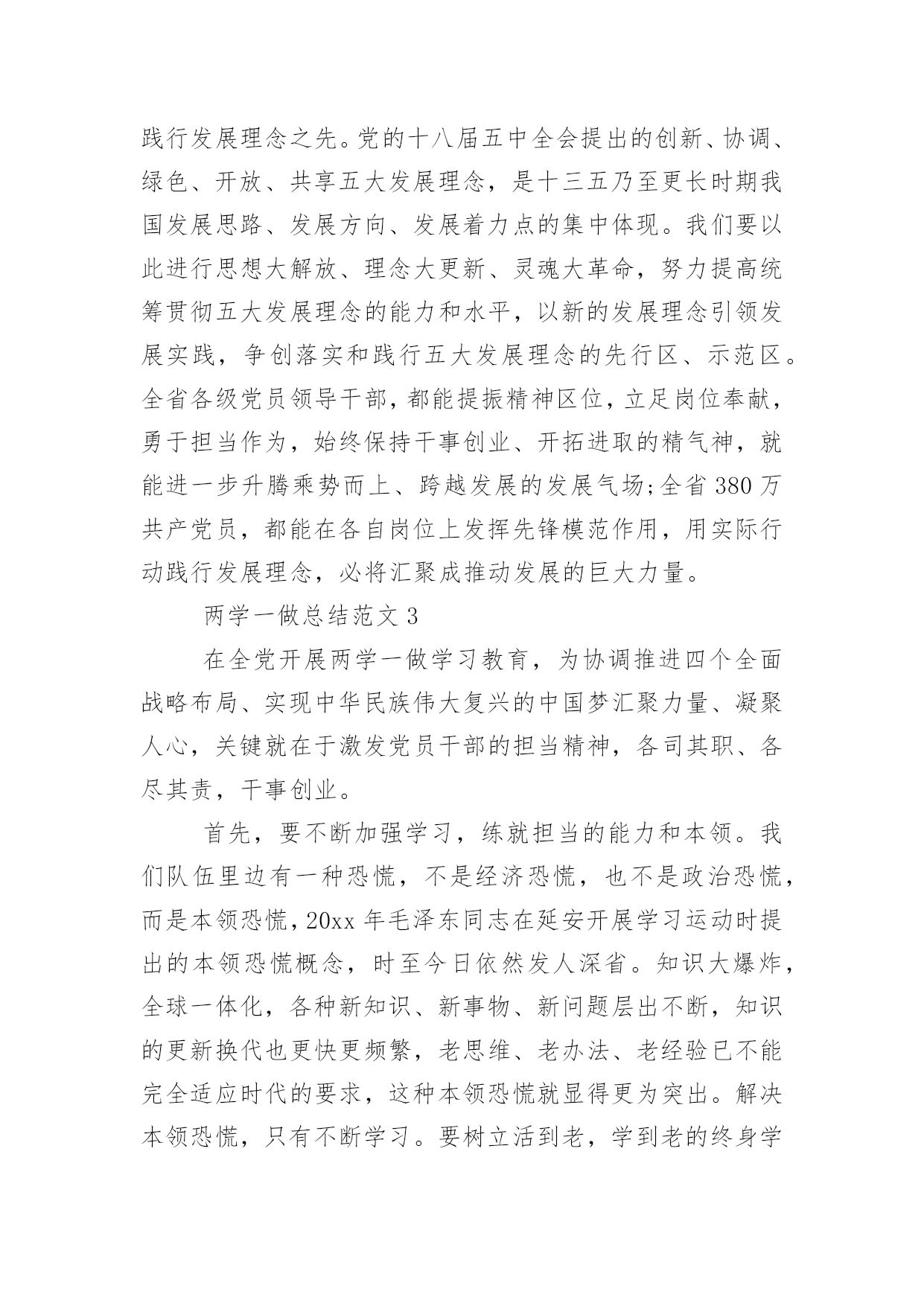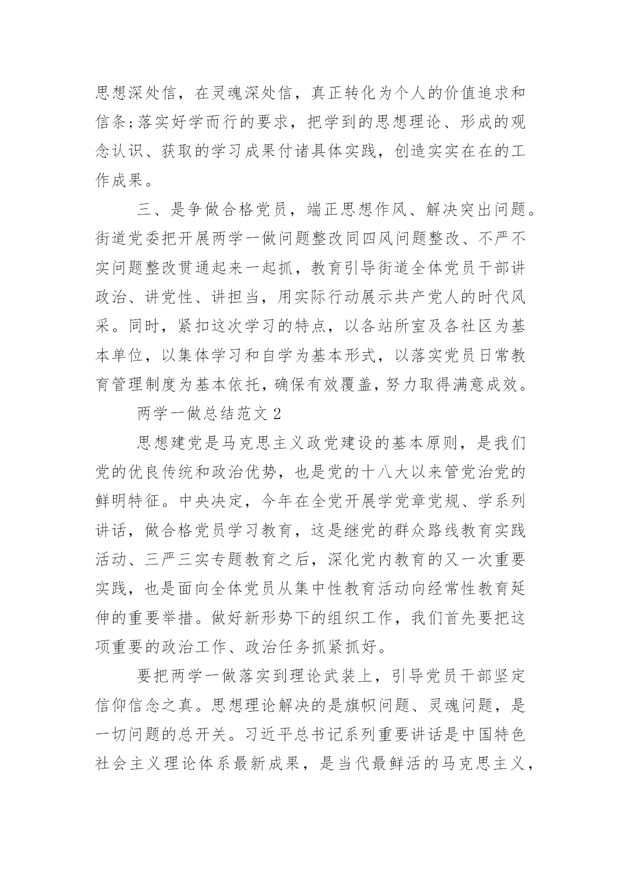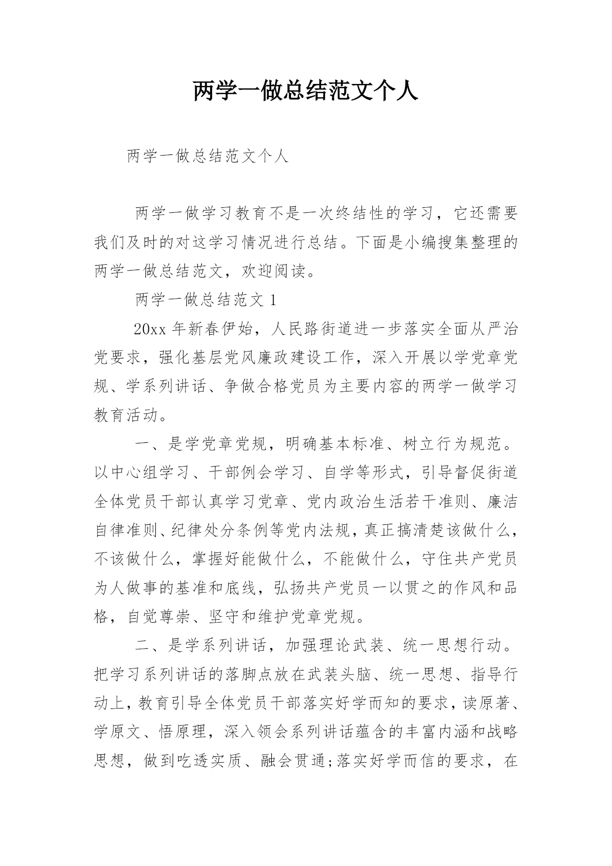 两学一做总结范文个人 两学一做总结范文个人两学一做学习教育不是一次终结性的学习,它还需要我们及时的对这学习情况进行总结。下面是小编搜集整理的两学一做总结范文,欢迎阅读。两学一做总结范文120xx年新春伊始,人民路街道进一步落实全面从严治党要求,强化基层党风廉政建设工作,深入开展以学党章党规、学系列讲话、争做合格党员为主要内容的两学一做学习教育活动。一、是学党章党规,明确基本标准、树立行为规范。以中心组学习、干部例会学习、自学等形式,引导督促街道全体党员干部认真学习党章、党内政治生活若干准则、廉洁自律准则、纪律处分条例等党内法规,真正搞清楚该做什么,不该做什么,掌握好能做什么,不能做什么,守住共产党员为人做事的基准和底线,弘扬共产党员一以贯之的作风和品格,自觉尊崇、坚守和维护党章党规。二、是学系列讲话,加强理论武装、统一思想行动。把学习系列讲话的落脚点放在武装头脑、统一思想、指导行动上,教育引导全体党员干部落实好学而知的要求,读原著、学原文、悟原理,深入领会系列讲话蕴含的丰富内涵和战略思想,做到吃透实质、融会贯通;落实好学而信的要求,在思想深处信,在灵魂深处信,真正转化为个人的价值追求和信条;落实好学而行的要求,把学到的思想理论、形成的观念认识、获取的学习成果付诸具体实践,创造实实在在的工作成果。三、是争做合格党员,端正思想作风、解决突出问题。街道党委把开展两学一做问题整改同四风问题整改、不严不实问题整改贯通起来一起抓,教育引导街道全体党员干部讲政治、讲党性、讲担当,用实际行动展示共产党人的时代风采。同时,紧扣这次学习的特点,以各站所室及各社区为基本单位,以集体学习和自学为基本形式,以落实党员日常教育管理制度为基本依托,确保有效覆盖,努力取得满意成效。两学一做总结范文2思想建党是马克思主义政党建设的基本原则,是我们党的优良传统和政治优势,也是党的十八大以来管党治党的鲜明特征。中央决定,今年在全党开展学党章党规、学系列讲话,做合格党员学习教育,这是继党的群众路线教育实践活动、三严三实专题教育之后,深化党内教育的又一次重要实践,也是面向全体党员从集中性教育活动向经常性教育延伸的重要举措。做好新形势下的组织工作,我们首先要把这项重要的政治工作、政治任务抓紧抓好。要把两学一做落实到理论武装上,引导党员干部坚定信仰信念之真。思想理论解决的是旗帜问题、灵魂问题,是一切问题的总开关。习近平总书记系列重要讲话是中国特色社会主义理论体系最新成果,是当代最鲜活的马克思主义,是广大党员干部改造主观世界和客观世界的有力思想武器。开展两学一做学习教育,要把学习系列讲话作为理论武装的重中之重,引导党员干部读原著、学原文、悟原理,正本清源、固本培元,坚定三个自信,补足精神之钙,加强信仰之修,熔铸信念之魂,培养造就一支具有铁一般信仰、铁一般信念、铁一般纪律、铁一般担当的党员干部队伍。要把两学一做落实到党性教育上,引导党员干部永葆党性党风之纯。党性是党员干部立身、立业、立言、立德的基石。加强党性教育,是党员干部教育的核心内容,也是两学一做学习教育的题中应有之义。我们宣誓入党,就是身心归党,以身许党,要时刻牢记党员身份、牢记义务责任。各级党组织要把党章党规和系列讲话作为党性教育的必修课、常修课,引导广大党员学深悟透,融会贯通,做到学而信、学而用、学而行。要把两学一做落实到严明纪律上,引导党员干部固守纪律规矩之严。深入学习党章党规,是两学一做学习教育的重点内容之一。党章是管党治党的总章程,是党内的根本大法,党规党纪是对党章的延伸和细化。新修订的《中国共产党廉洁自律准则》和《中国共产党纪律处分条例》,为全面从严治党立德立规,树起道德高标准,划清纪律底线,做合格共产党员,就要把政治纪律和政治规矩摆在首位,要时刻、自觉、坚决向党中央看齐,把看齐意识扎根于思想上、落实在行动上,确保党的集中统一、团结一致。要把两学一做落实到推动发展上,引导党员干部走在践行发展理念之先。党的十八届五中全会提出的创新、协调、绿色、开放、共享五大发展理念,是十三五乃至更长时期我国发展思路、发展方向、发展着力点的集中体现。我们要以此进行思想大解放、理念大更新、灵魂大革命,努力提高统筹贯彻五大发展理念的能力和水平,以新的发展理念引领发展实践,争创落实和践行五大发展理念的先行区、示范区。全省各级党员领导干部,都能提振精神区位,立足岗位奉献,勇于担当作为,始终保持干事创业、开拓进取的精气神,就能进一步升腾乘势而上、跨越发展的发展气场;全省380万共产党员,都能在各自岗位上发挥先锋模范作用,用实际行动践行发展理念,必将汇聚成推动发展的巨大力量。两学一做总结范文3在全党开展两学一做学习教育,为协调推进四个全面战略布局、实现中华民族伟大复兴的中国梦汇聚力量、凝聚人心,关键就在于激发党员干部的担当精神,各司其职