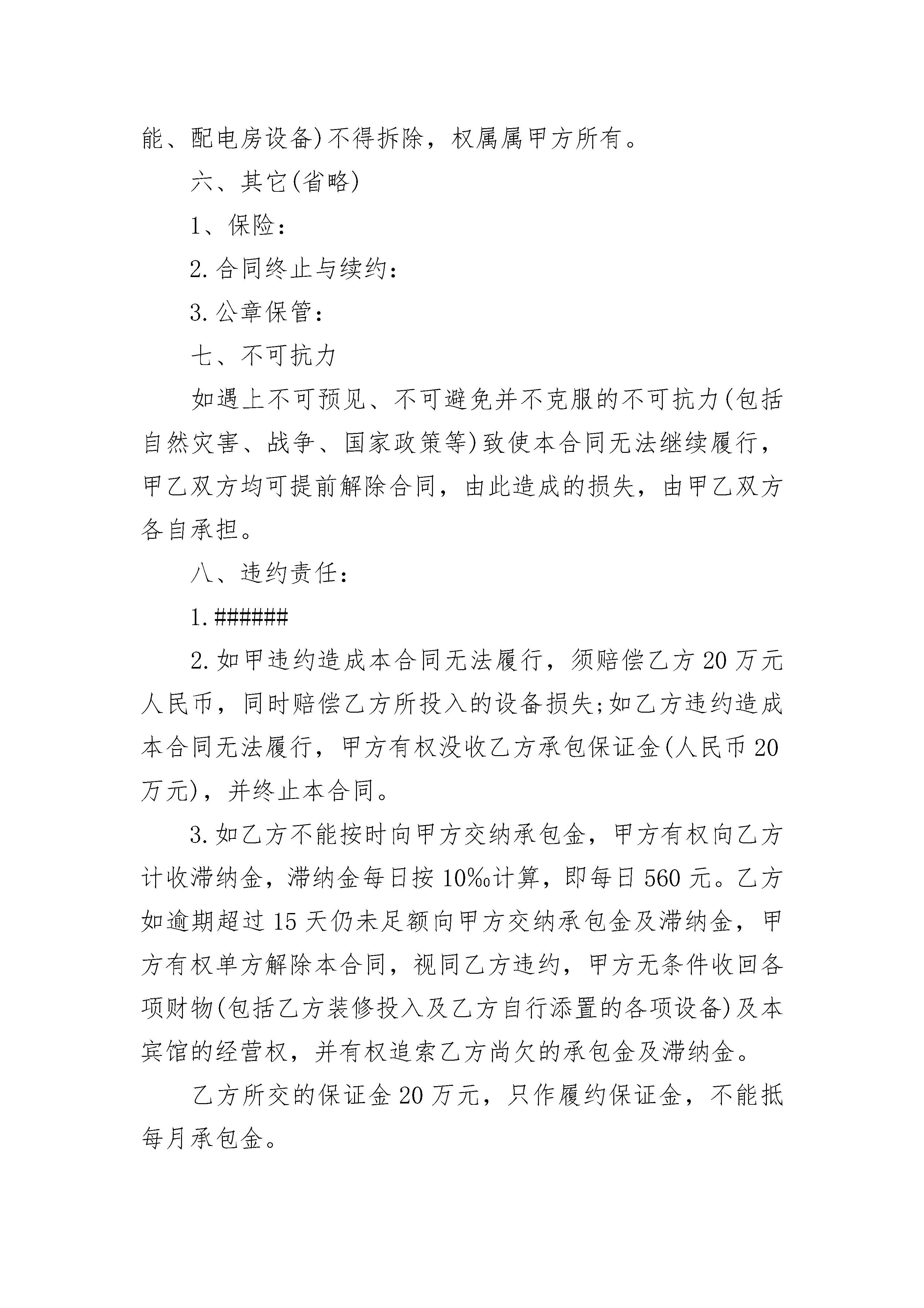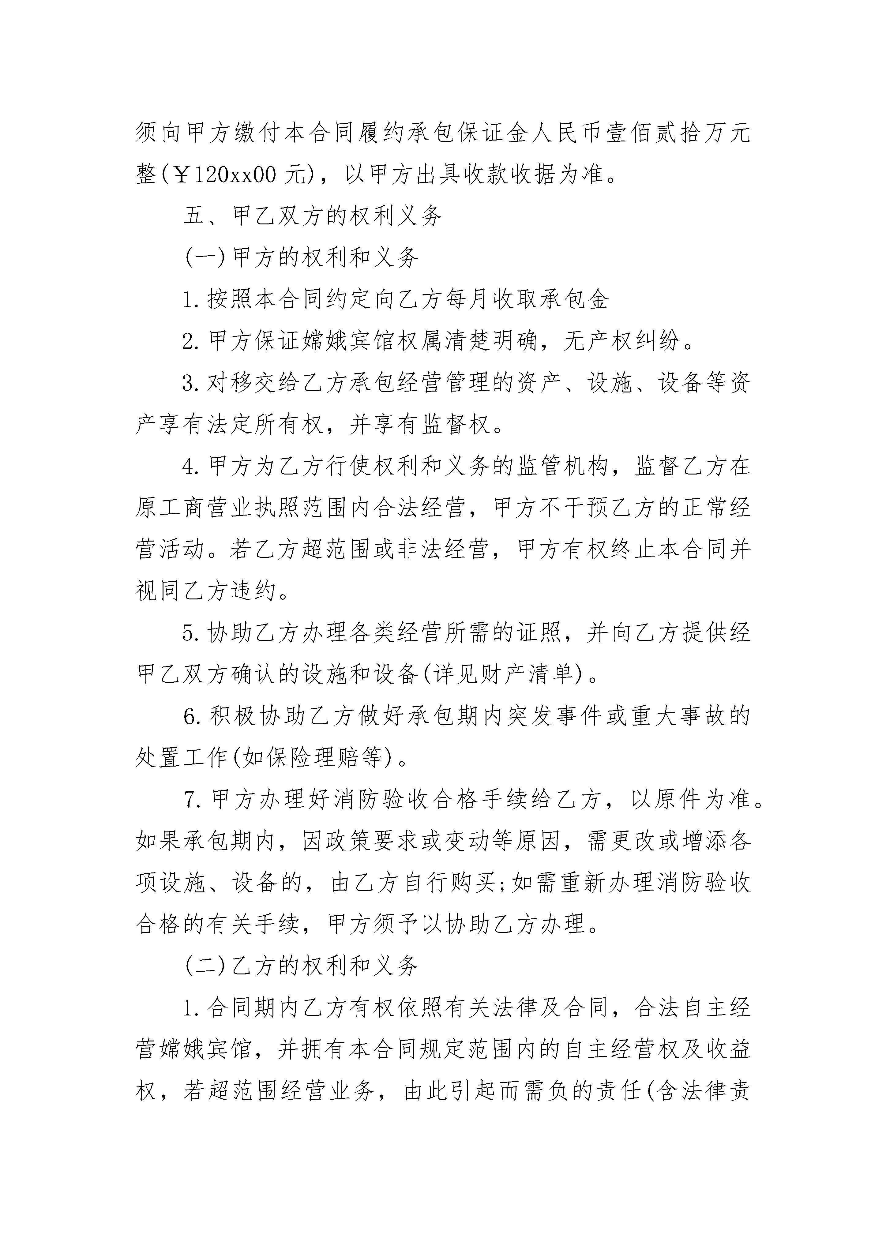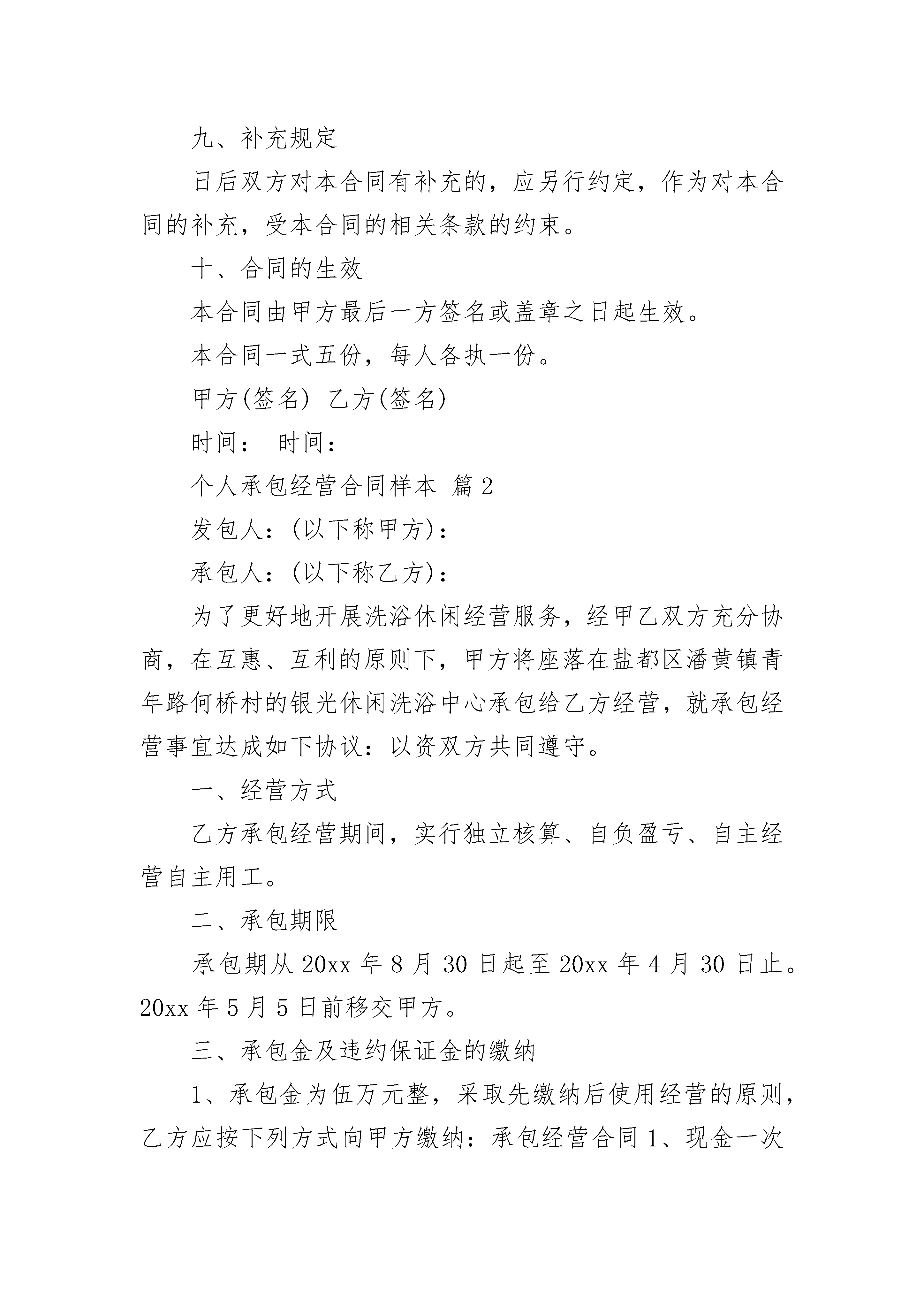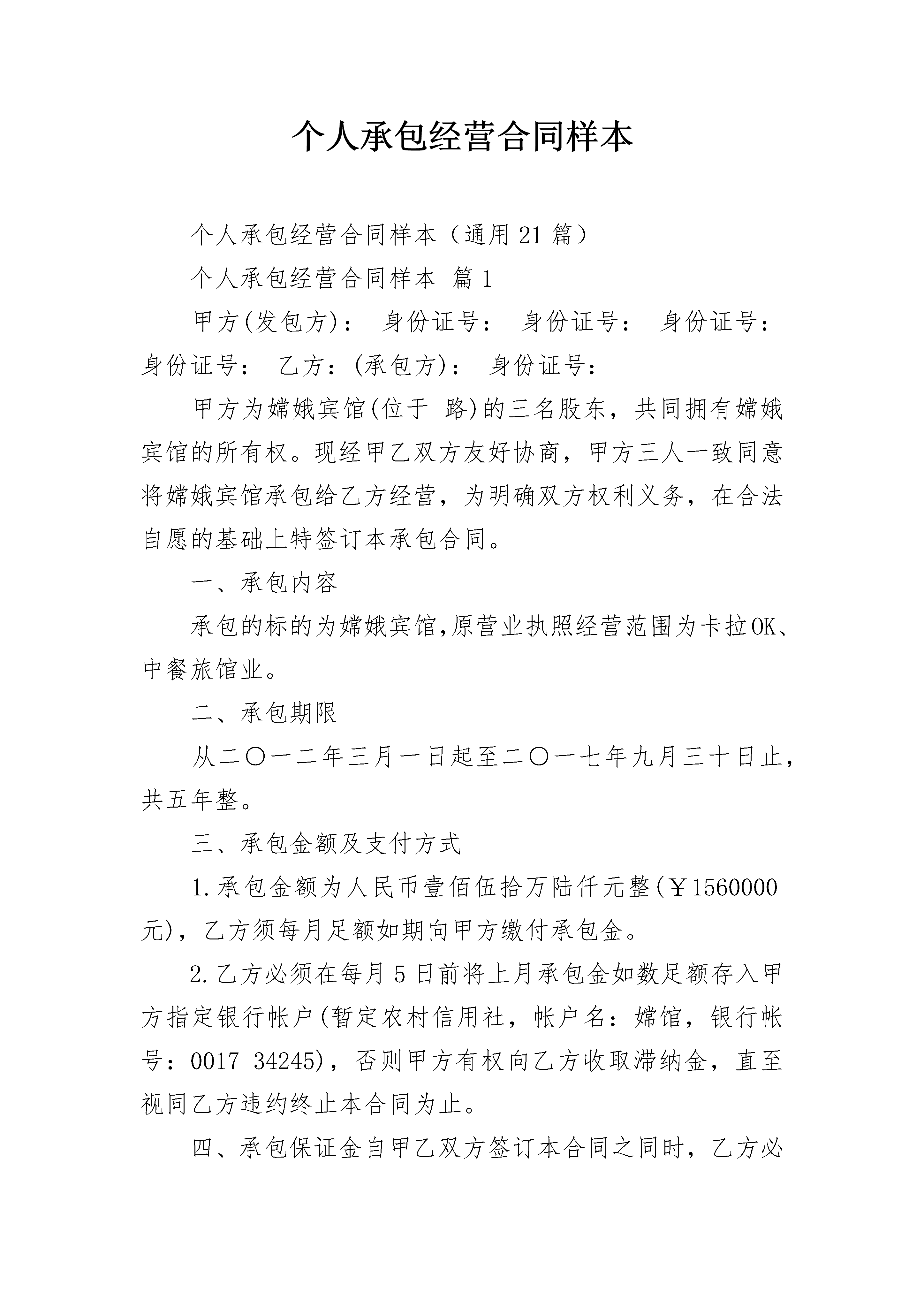 个人承包经营合同样本个人承包经营合同样本(通用21篇)个人承包经营合同样本篇1甲方(发包方):身份证号:身份证号:身份证号:身份证号:乙方:(承包方):身份证号:甲方为嫦娥宾馆(位于路)的三名股东,共同拥有嫦娥宾馆的所有权。现经甲乙双方友好协商,甲方三人一致同意将嫦娥宾馆承包给乙方经营,为明确双方权利义务,在合法自愿的基础上特签订本承包合同。一、承包内容承包的标的为嫦娥宾馆,原营业执照经营范围为卡拉OK、中餐旅馆业。二、承包期限从二○一二年三月一日起至二○一七年九月三十日止,共五年整。三、承包金额及支付方式1.承包金额为人民币壹佰伍拾万陆仟元整(¥1560000元),乙方须每月足额如期向甲方缴付承包金。2.乙方必须在每月5日前将上月承包金如数足额存入甲方指定银行帐户(暂定农村信用社,帐户名:嫦馆,银行帐号:001734245),否则甲方有权向乙方收取滞纳金,直至视同乙方违约终止本合同为止。四、承包保证金自甲乙双方签订本合同之同时,乙方必须向甲方缴付本合同履约承包保证金人民币壹佰贰拾万元整(¥120xx00元),以甲方出具收款收据为准。五、甲乙双方的权利义务(一)甲方的权利和义务1.按照本合同约定向乙方每月收取承包金2.甲方保证嫦娥宾馆权属清楚明确,无产权纠纷。3.对移交给乙方承包经营管理的资产、设施、设备等资产享有法定所有权,并享有监督权。4.甲方为乙方行使权利和义务的监管机构,监督乙方在原工商营业执照范围内合法经营,甲方不干预乙方的正常经营活动。若乙方超范围或非法经营,甲方有权终止本合同并视同乙方违约。5.协助乙方办理各类经营所需的证照,并向乙方提供经甲乙双方确认的设施和设备(详见财产清单)。6.积极协助乙方做好承包期内突发事件或重大事故的处置工作(如保险理赔等)。7.甲方办理好消防验收合格手续给乙方,以原件为准。如果承包期内,因政策要求或变动等原因,需更改或增添各项设施、设备的,由乙方自行购买;如需重新办理消防验收合格的有关手续,甲方须予以协助乙方办理。(二)乙方的权利和义务1.合同期内乙方有权依照有关法律及合同,合法自主经营嫦娥宾馆,并拥有本合同规定范围内的自主经营权及收益权,若超范围经营业务,由此引起而需负的责任(含法律责任和经济责任)乙方需无条件承担。2.乙方应按照本合同甲乙双方约定,如期足额向甲方缴付承包金。3.自二○一○年十月一日起(包括本日),乙方经营嫦娥宾馆期间的发生债权债务,均由乙方负责解决,与甲方无关。在二○一○年九月三十日(包括本日)前嫦娥宾馆发生债权债务,由甲方自行解决,与乙方无关。4.合同期内,乙方对甲方提供的各项设施、设备等资产享有合法使用权并必须保证各项设施、设备的各项性能完好、完整,负责承包期内对甲方提供的各项设施、设备的日常维修及保养,防止资产流失,确保承包期满后将各项设施、设备完好完整移交回甲方,如有散失或损失,应折价赔偿或按同牌子同型号补偿。5.合同承包期内乙方保证依法经营,不得以本宾馆的有形或无形资产从事抵押借贷活动,如有违法、违规行为乙方需承担全部责任。6.合同承包期内,未经甲方书面同意,乙方不得擅自将本宾馆出租、转包给第三方经营。若确因正常经营需要,需对本宾馆进行改造更新(不涉及房屋主体结构变动),必须事先提出更新改造方案,报经甲方审核同意后(书面批复为准),方可施工,否则由此引起的一切责任,均由乙方承担。7.合同期满后,乙方自行添置的设备(如空调、电视等)合同期满后,乙方有权自行设置。但装修设施(如门窗)、消防设备(如自动喷淋、烟感器)、水电相关配套设施(如太阳能、配电房设备)不得拆除,权属属甲方所有。六、其它(省略)1、保险:2.合同终止与续约:3.公章保管:七、不可抗力如遇上不可预见、不可避免并不克服的不可抗力(包括自然灾害、战争、国家政策等)致使本合同无法继续履行,甲乙双方均可提前解除合同,由此造成的损失,由甲乙双方各自承担。八、违约责任:1.######2.如甲违约造成本合同无法履行,须赔偿乙方20万元人民币,同时赔偿乙方所投入的设备损失;如乙方违约造成本合同无法履行,甲方有权没收乙方承包保证金(人民币20万元),并终止本合同。3.如乙方不能按时向甲方交纳承包金,甲方有权向乙方计收滞纳金,滞纳金每日按10‰计算,即每日560元。乙方如逾期超过15天仍未足额向甲方交纳承包金及滞纳金,甲方有权单方解除本合同,视同乙方违约,甲方无条件收回各项财物(包括乙方装修投入及乙方自行添置的各项设备)及本宾馆的经营权,并有权追索乙方尚欠的承包金及滞纳金。乙方所交的保证金20万元,只作履约保证金,不能抵每月承包金。九、补充规定日后双方对本合同有补充的,应另行约定,作为对本合同的补充,受本合同的相关条款的约束。十、合同的生效本合同由甲方最后一方签名或盖章之日起生效。本合同一式五份,每人各执