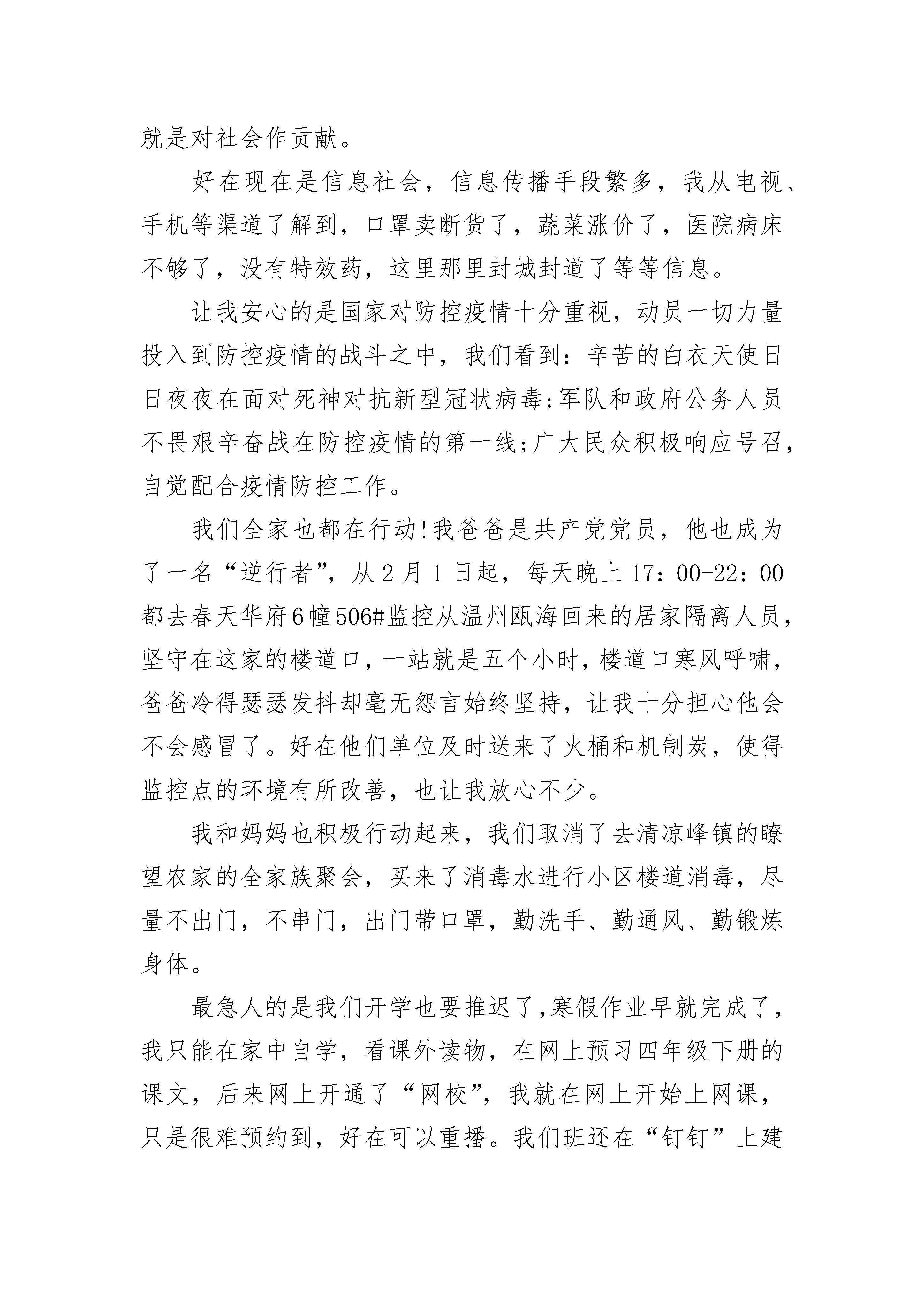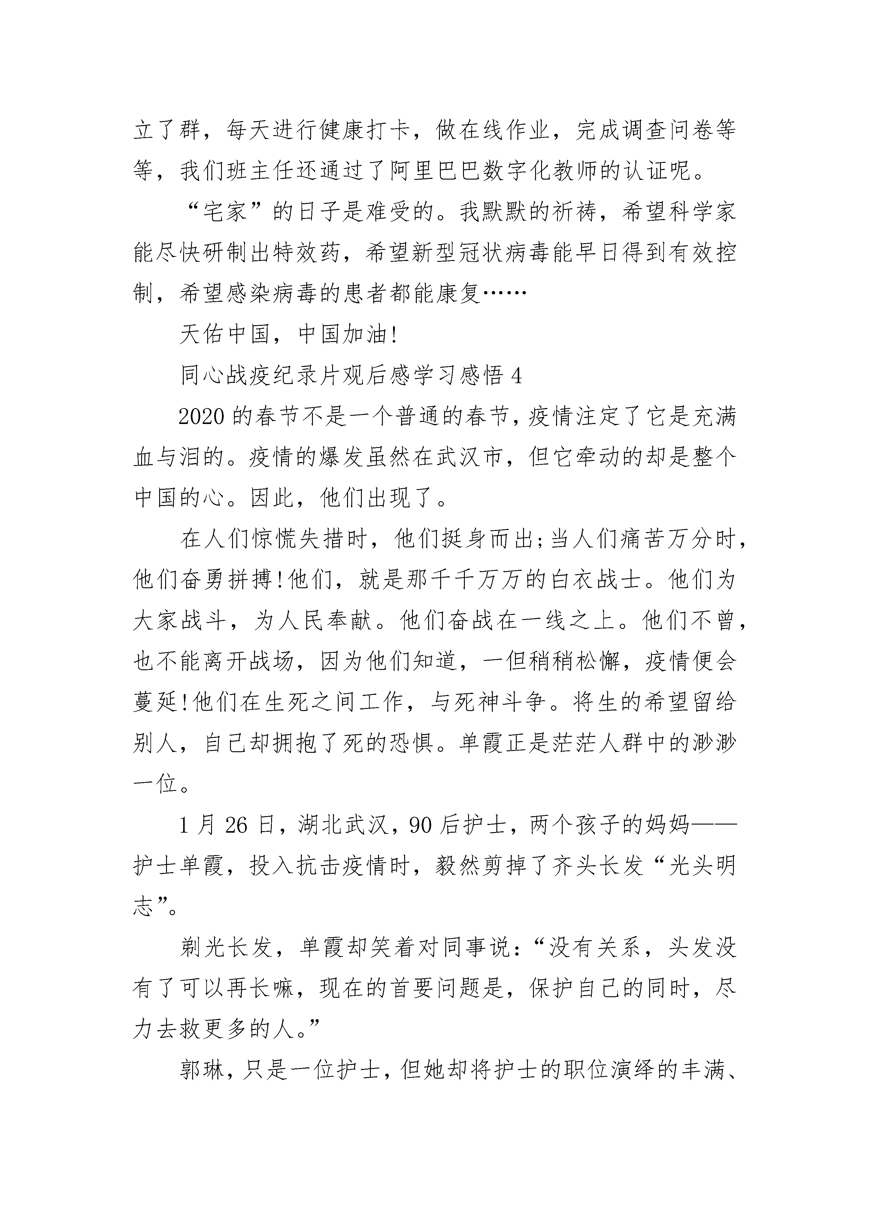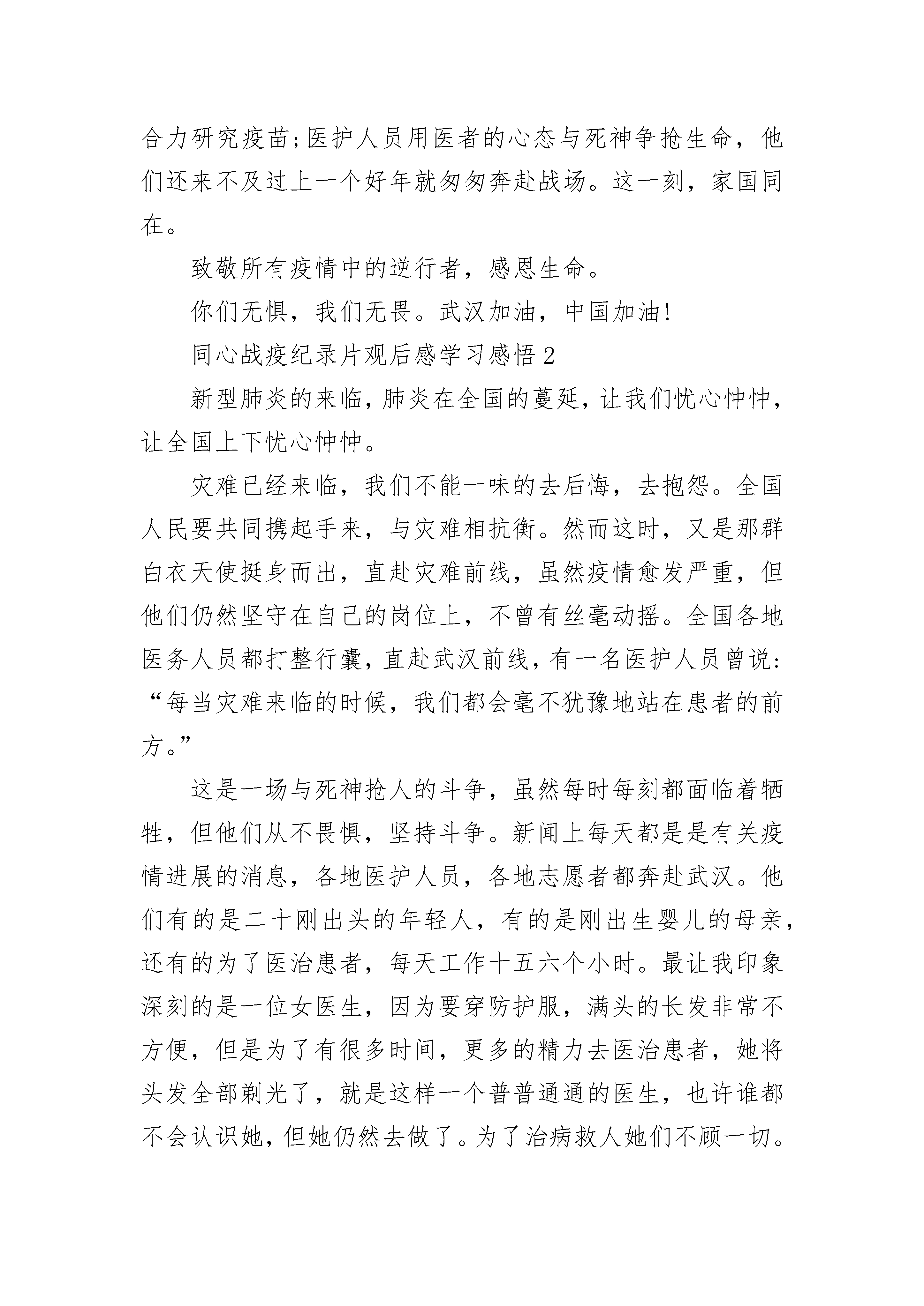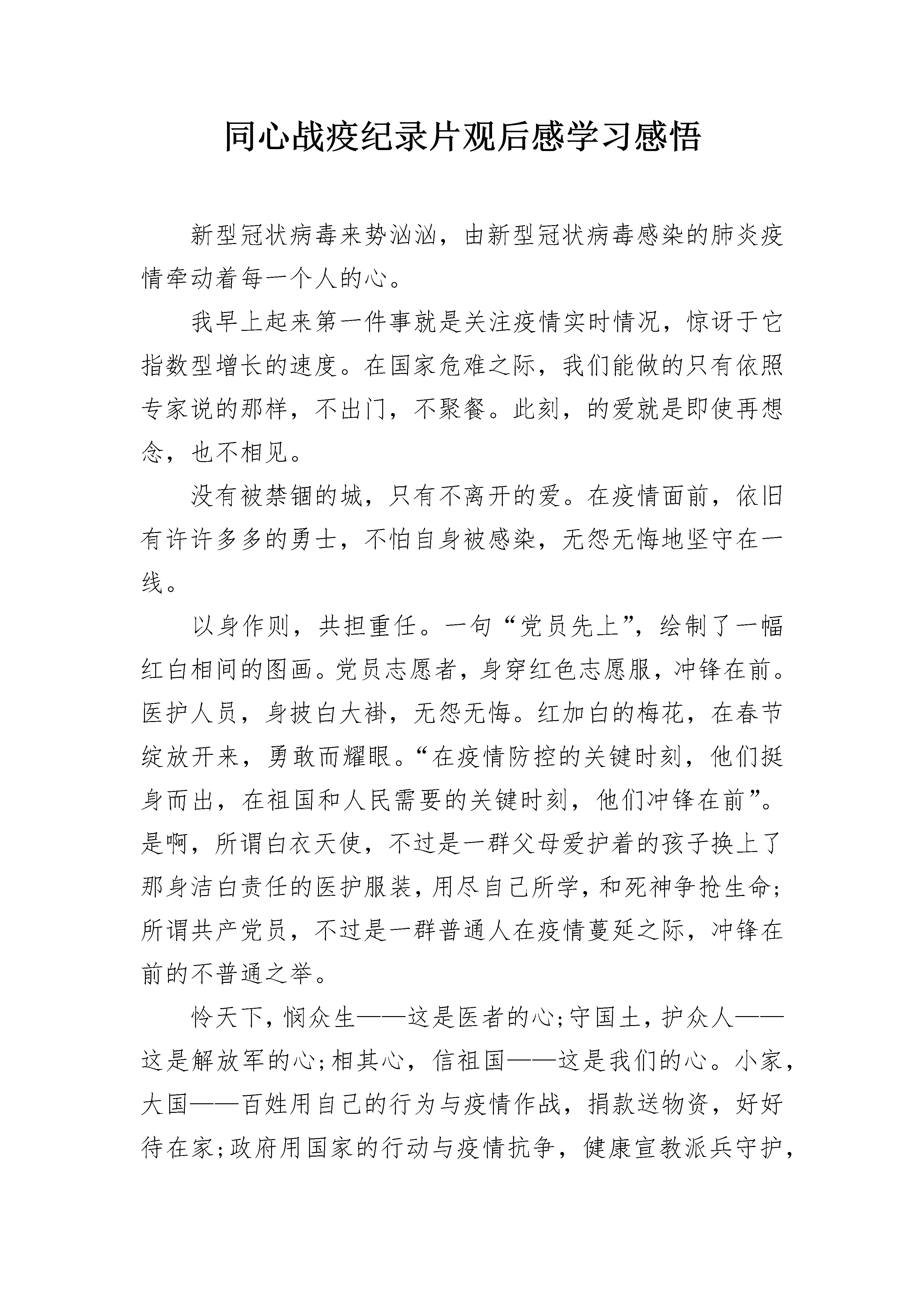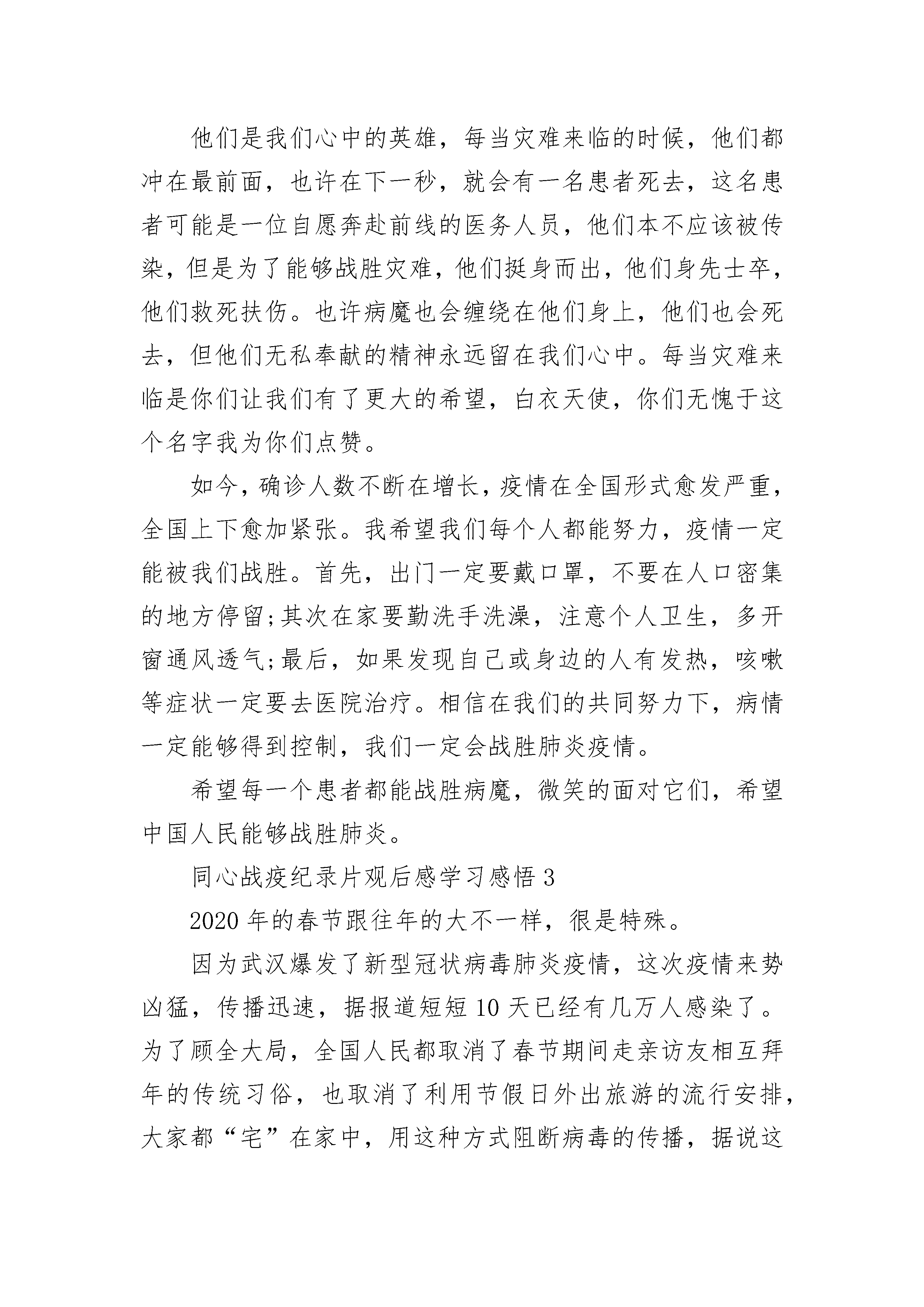同心战疫纪录片观后感学习感悟新型冠状病毒来势汹汹,由新型冠状病毒感染的肺炎疫情牵动着每一个人的心。我早上起来第一件事就是关注疫情实时情况,惊讶于它指数型增长的速度。在国家危难之际,我们能做的只有依照专家说的那样,不出门,不聚餐。此刻,的爱就是即使再想念,也不相见。没有被禁锢的城,只有不离开的爱。在疫情面前,依旧有许许多多的勇士,不怕自身被感染,无怨无悔地坚守在一线。以身作则,共担重任。一句“党员先上”,绘制了一幅红白相间的图画。党员志愿者,身穿红色志愿服,冲锋在前。医护人员,身披白大褂,无怨无悔。红加白的梅花,在春节绽放开来,勇敢而耀眼。“在疫情防控的关键时刻,他们挺身而出,在祖国和人民需要的关键时刻,他们冲锋在前”。是啊,所谓白衣天使,不过是一群父母爱护着的孩子换上了那身洁白责任的医护服装,用尽自己所学,和死神争抢生命;所谓共产党员,不过是一群普通人在疫情蔓延之际,冲锋在前的不普通之举。怜天下,悯众生——这是医者的心;守国土,护众人——这是解放军的心;相其心,信祖国——这是我们的心。小家,大国——百姓用自己的行为与疫情作战,捐款送物资,好好待在家;政府用国家的行动与疫情抗争,健康宣教派兵守护,合力研究疫苗;医护人员用医者的心态与死神争抢生命,他们还来不及过上一个好年就匆匆奔赴战场。这一刻,家国同在。致敬所有疫情中的逆行者,感恩生命。你们无惧,我们无畏。武汉加油,中国加油!同心战疫纪录片观后感学习感悟2新型肺炎的来临,肺炎在全国的蔓延,让我们忧心忡忡,让全国上下忧心忡忡。灾难已经来临,我们不能一味的去后悔,去抱怨。全国人民要共同携起手来,与灾难相抗衡。然而这时,又是那群白衣天使挺身而出,直赴灾难前线,虽然疫情愈发严重,但他们仍然坚守在自己的岗位上,不曾有丝毫动摇。全国各地医务人员都打整行囊,直赴武汉前线,有一名医护人员曾说:“每当灾难来临的时候,我们都会毫不犹豫地站在患者的前方。”这是一场与死神抢人的斗争,虽然每时每刻都面临着牺牲,但他们从不畏惧,坚持斗争。新闻上每天都是是有关疫情进展的消息,各地医护人员,各地志愿者都奔赴武汉。他们有的是二十刚出头的年轻人,有的是刚出生婴儿的母亲,还有的为了医治患者,每天工作十五六个小时。最让我印象深刻的是一位女医生,因为要穿防护服,满头的长发非常不方便,但是为了有很多时间,更多的精力去医治患者,她将头发全部剃光了,就是这样一个普普通通的医生,也许谁都不会认识她,但她仍然去做了。为了治病救人她们不顾一切。他们是我们心中的英雄,每当灾难来临的时候,他们都冲在最前面,也许在下一秒,就会有一名患者死去,这名患者可能是一位自愿奔赴前线的医务人员,他们本不应该被传染,但是为了能够战胜灾难,他们挺身而出,他们身先士卒,他们救死扶伤。也许病魔也会缠绕在他们身上,他们也会死去,但他们无私奉献的精神永远留在我们心中。每当灾难来临是你们让我们有了更大的希望,白衣天使,你们无愧于这个名字我为你们点赞。如今,确诊人数不断在增长,疫情在全国形式愈发严重,全国上下愈加紧张。我希望我们每个人都能努力,疫情一定能被我们战胜。首先,出门一定要戴口罩,不要在人口密集的地方停留;其次在家要勤洗手洗澡,注意个人卫生,多开窗通风透气;最后,如果发现自己或身边的人有发热,咳嗽等症状一定要去医院治疗。相信在我们的共同努力下,病情一定能够得到控制,我们一定会战胜肺炎疫情。希望每一个患者都能战胜病魔,微笑的面对它们,希望中国人民能够战胜肺炎。同心战疫纪录片观后感学习感悟32020年的春节跟往年的大不一样,很是特殊。因为武汉爆发了新型冠状病毒肺炎疫情,这次疫情来势凶猛,传播迅速,据报道短短10天已经有几万人感染了。为了顾全大局,全国人民都取消了春节期间走亲访友相互拜年的传统习俗,也取消了利用节假日外出旅游的流行安排,大家都“宅”在家中,用这种方式阻断病毒的传播,据说这就是对社会作贡献。好在现在是信息社会,信息传播手段繁多,我从电视、手机等渠道了解到,口罩卖断货了,蔬菜涨价了,医院病床不够了,没有特效药,这里那里封城封道了等等信息。让我安心的是国家对防控疫情十分重视,动员一切力量投入到防控疫情的战斗之中,我们看到:辛苦的白衣天使日日夜夜在面对死神对抗新型冠状病毒;军队和政府公务人员不畏艰辛奋战在防控疫情的第一线;广大民众积极响应号召,自觉配合疫情防控工作。我们全家也都在行动!我爸爸是共产党党员,他也成为了一名“逆行者”,从2月1日起,每天晚上17:00-22:00都去春天华府6幢506#监控从温州瓯海回来的居家隔离人员,坚守在这家的楼道口,一站就是五个小时,楼道口寒风呼啸,爸爸冷得瑟瑟发抖却毫无怨言始终坚持,让我十分担心他会不会感冒了。好在他们单位及时送来了火桶和机制炭,使得监控点的环境有所改善,也让我放心不少。我和妈妈也积极行动起来,我们取