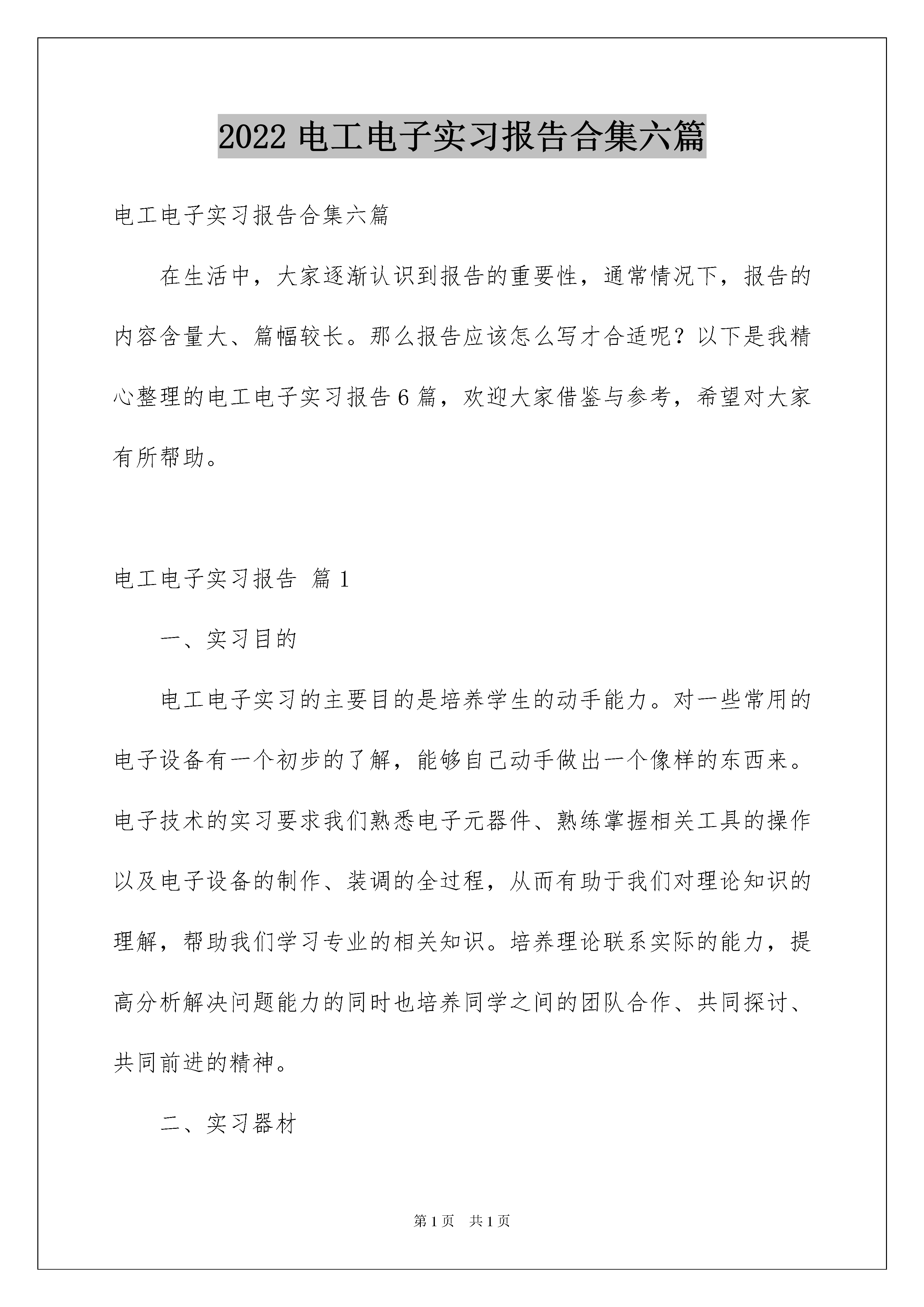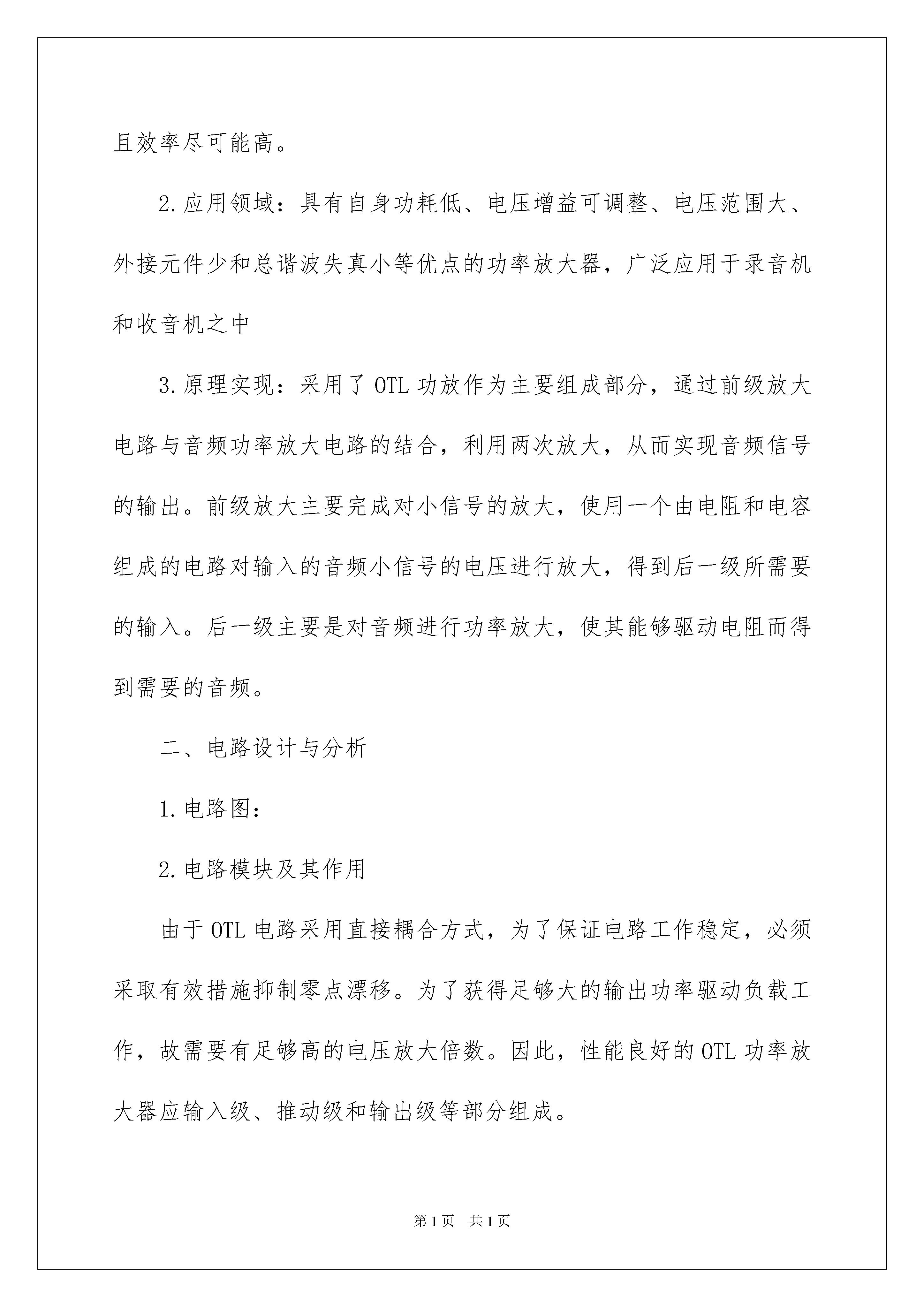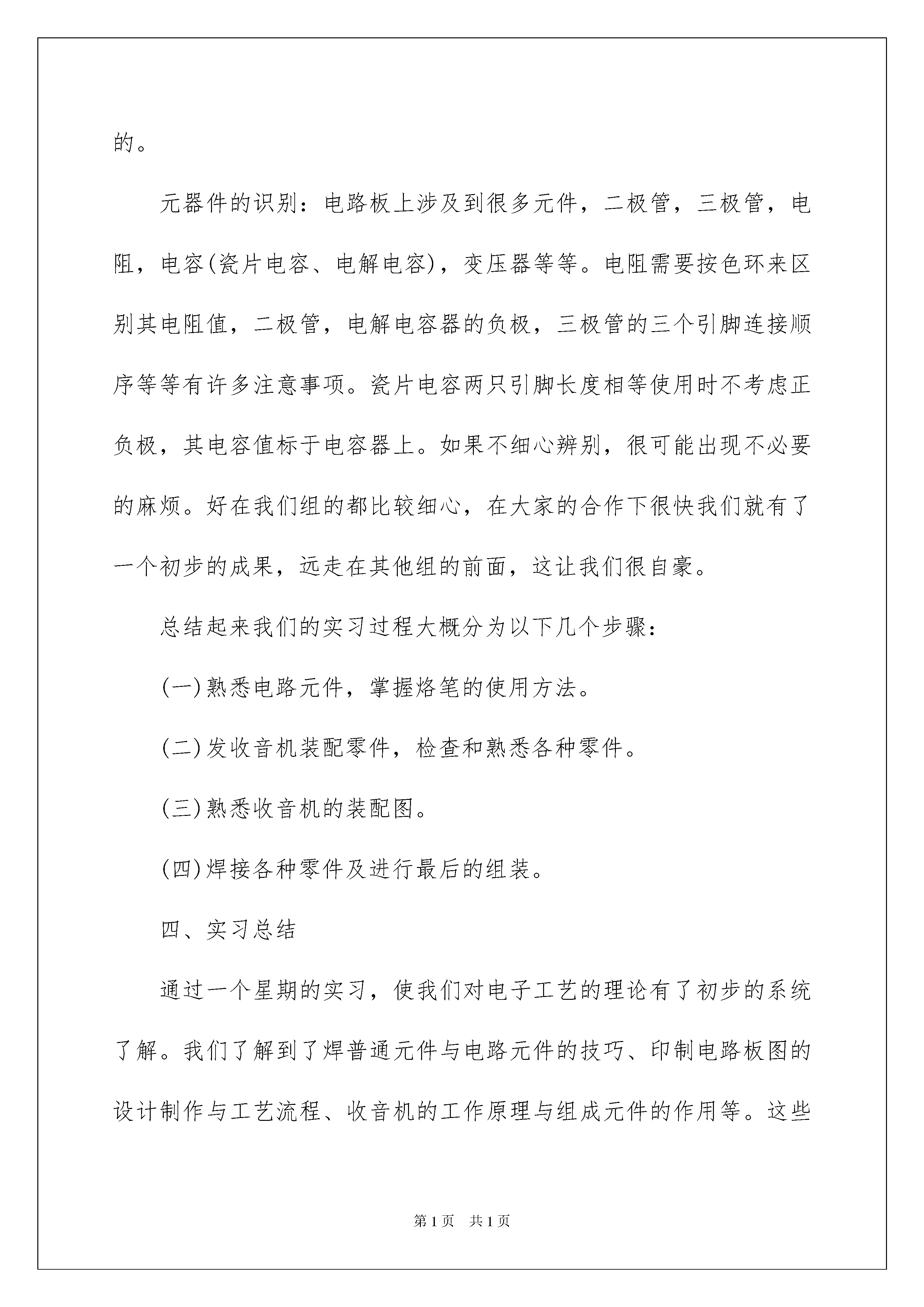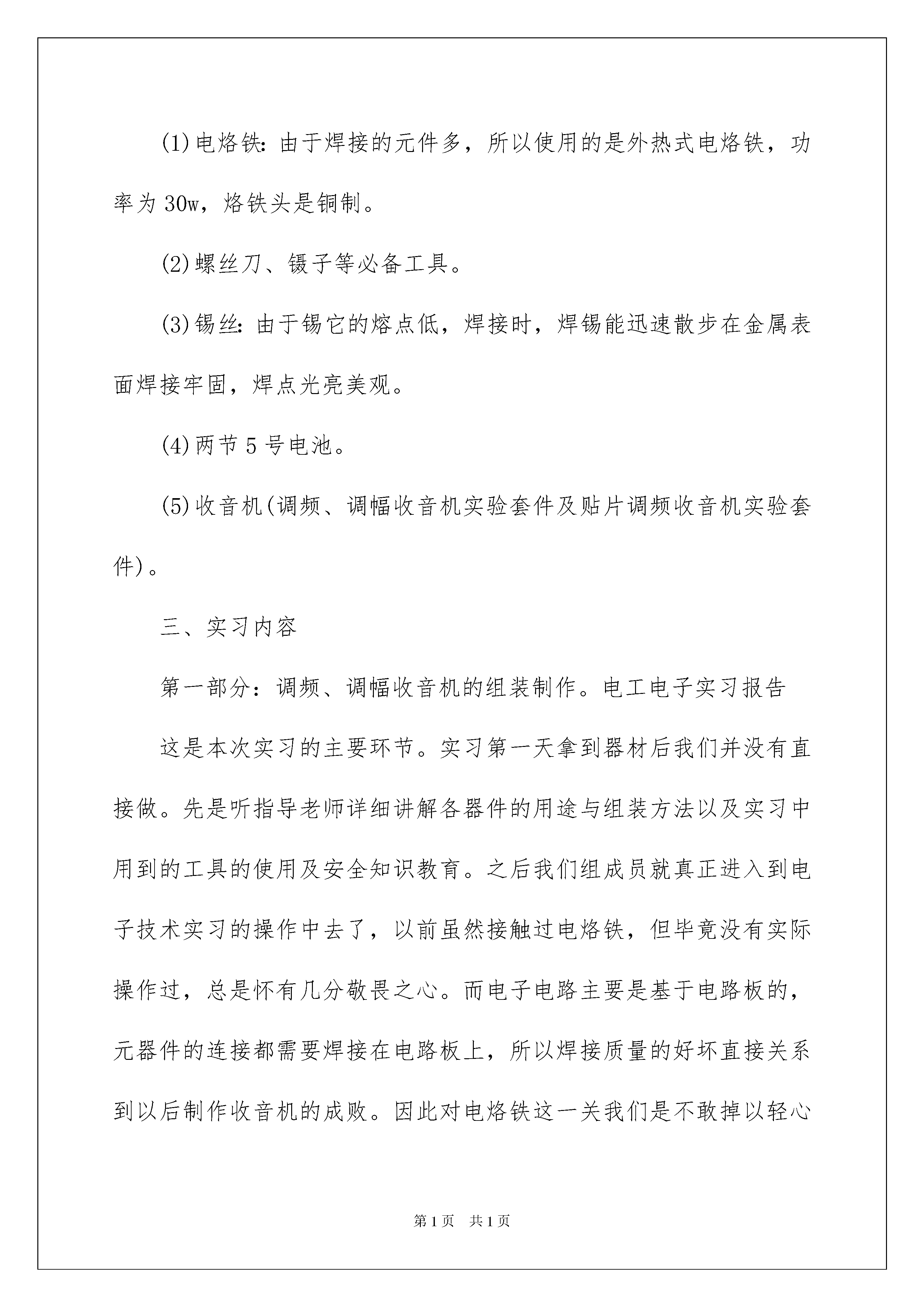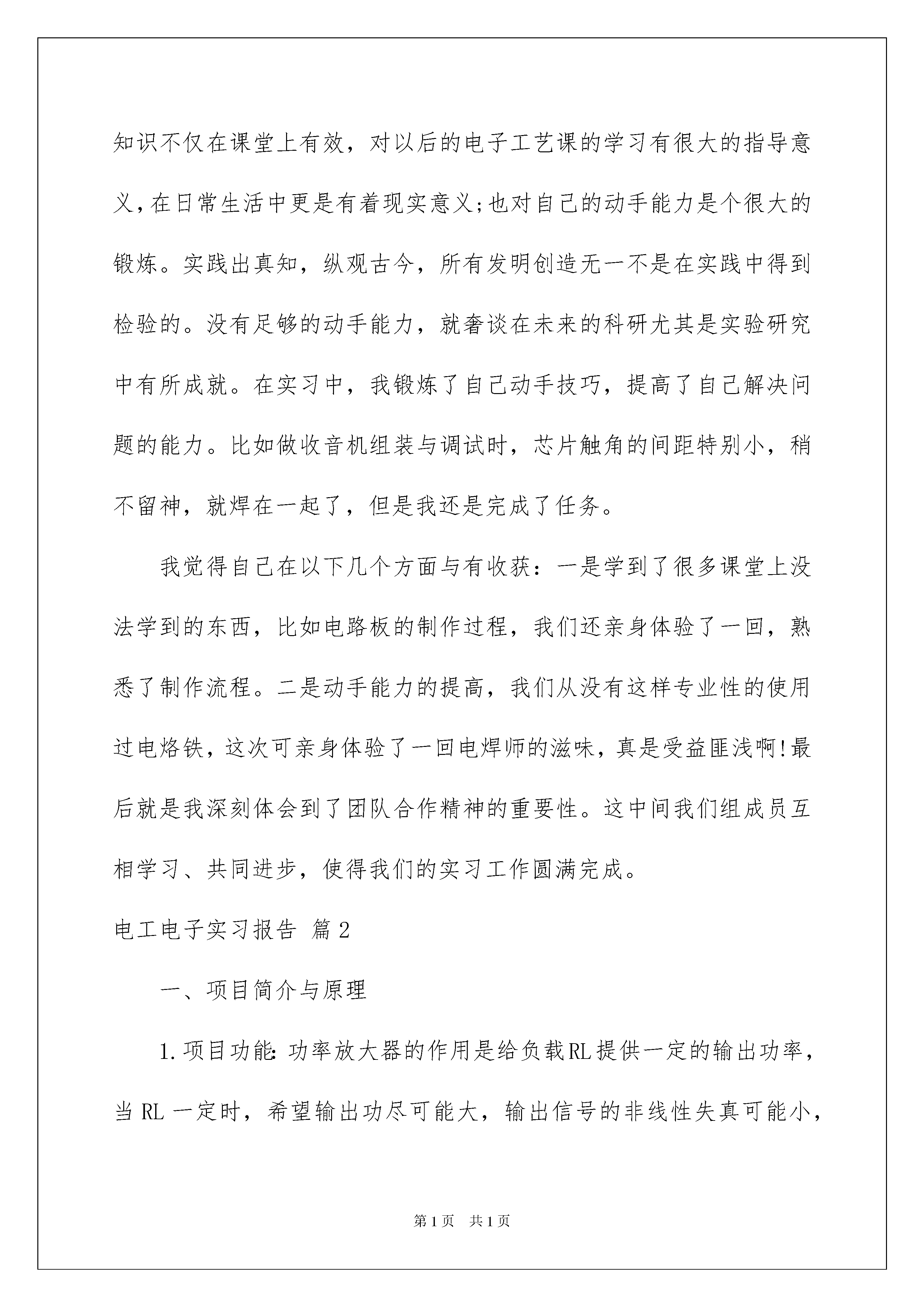 2022电工电子实习报告合集六篇电工电子实习报告合集六篇在生活中,大家逐渐认识到报告的重要性,通常情况下,报告的内容含量大、篇幅较长。那么报告应该怎么写才合适呢?以下是我精心整理的电工电子实习报告6篇,欢迎大家借鉴与参考,希望对大家有所帮助。电工电子实习报告篇1一、实习目的电工电子实习的主要目的是培养学生的动手能力。对一些常用的电子设备有一个初步的了解,能够自己动手做出一个像样的东西来。电子技术的实习要求我们熟悉电子元器件、熟练掌握相关工具的操作以及电子设备的制作、装调的全过程,从而有助于我们对理论知识的理解,帮助我们学习专业的相关知识。培养理论联系实际的能力,提高分析解决问题能力的同时也培养同学之间的团队合作、共同探讨、共同前进的精神。二、实习器材(1)电烙铁:由于焊接的元件多,所以使用的是外热式电烙铁,功率为30w,烙铁头是铜制。(2)螺丝刀、镊子等必备工具。(3)锡丝:由于锡它的熔点低,焊接时,焊锡能迅速散步在金属表面焊接牢固,焊点光亮美观。(4)两节5号电池。(5)收音机(调频、调幅收音机实验套件及贴片调频收音机实验套件)。三、实习内容第一部分:调频、调幅收音机的组装制作。电工电子实习报告这是本次实习的主要环节。实习第一天拿到器材后我们并没有直接做。先是听指导老师详细讲解各器件的用途与组装方法以及实习中用到的工具的使用及安全知识教育。之后我们组成员就真正进入到电子技术实习的操作中去了,以前虽然接触过电烙铁,但毕竟没有实际操作过,总是怀有几分敬畏之心。而电子电路主要是基于电路板的,元器件的连接都需要焊接在电路板上,所以焊接质量的好坏直接关系到以后制作收音机的成败。因此对电烙铁这一关我们是不敢掉以轻心的。元器件的识别:电路板上涉及到很多元件,二极管,三极管,电阻,电容(瓷片电容、电解电容),变压器等等。电阻需要按色环来区别其电阻值,二极管,电解电容器的负极,三极管的三个引脚连接顺序等等有许多注意事项。瓷片电容两只引脚长度相等使用时不考虑正负极,其电容值标于电容器上。如果不细心辨别,很可能出现不必要的麻烦。好在我们组的都比较细心,在大家的合作下很快我们就有了一个初步的成果,远走在其他组的前面,这让我们很自豪。总结起来我们的实习过程大概分为以下几个步骤:(一)熟悉电路元件,掌握烙笔的使用方法。(二)发收音机装配零件,检查和熟悉各种零件。(三)熟悉收音机的装配图。(四)焊接各种零件及进行最后的组装。四、实习总结通过一个星期的实习,使我们对电子工艺的理论有了初步的系统了解。我们了解到了焊普通元件与电路元件的技巧、印制电路板图的设计制作与工艺流程、收音机的工作原理与组成元件的作用等。这些知识不仅在课堂上有效,对以后的电子工艺课的学习有很大的指导意义,在日常生活中更是有着现实意义;也对自己的动手能力是个很大的锻炼。实践出真知,纵观古今,所有发明创造无一不是在实践中得到检验的。没有足够的动手能力,就奢谈在未来的科研尤其是实验研究中有所成就。在实习中,我锻炼了自己动手技巧,提高了自己解决问题的能力。比如做收音机组装与调试时,芯片触角的间距特别小,稍不留神,就焊在一起了,但是我还是完成了任务。我觉得自己在以下几个方面与有收获:一是学到了很多课堂上没法学到的东西,比如电路板的制作过程,我们还亲身体验了一回,熟悉了制作流程。二是动手能力的提高,我们从没有这样专业性的使用过电烙铁,这次可亲身体验了一回电焊师的滋味,真是受益匪浅啊!最后就是我深刻体会到了团队合作精神的重要性。这中间我们组成员互相学习、共同进步,使得我们的实习工作圆满完成。电工电子实习报告篇2一、项目简介与原理1.项目功能:功率放大器的作用是给负载RL提供一定的输出功率,当RL一定时,希望输出功尽可能大,输出信号的非线性失真可能小,且效率尽可能高。2.应用领域:具有自身功耗低、电压增益可调整、电压范围大、外接元件少和总谐波失真小等优点的功率放大器,广泛应用于录音机和收音机之中3.原理实现:采用了OTL功放作为主要组成部分,通过前级放大电路与音频功率放大电路的结合,利用两次放大,从而实现音频信号的输出。前级放大主要完成对小信号的放大,使用一个由电阻和电容组成的电路对输入的音频小信号的电压进行放大,得到后一级所需要的输入。后一级主要是对音频进行功率放大,使其能够驱动电阻而得到需要的音频。二、电路设计与分析1.电路图:2.电路模块及其作用由于OTL电路采用直接耦合方式,为了保证电路工作稳定,必须采取有效措施抑制零点漂移。为了获得足够大的输出功率驱动负载工作,故需要有足够高的电压放大倍数。因此,性能良好的OTL功率放大器应输入级、推动级