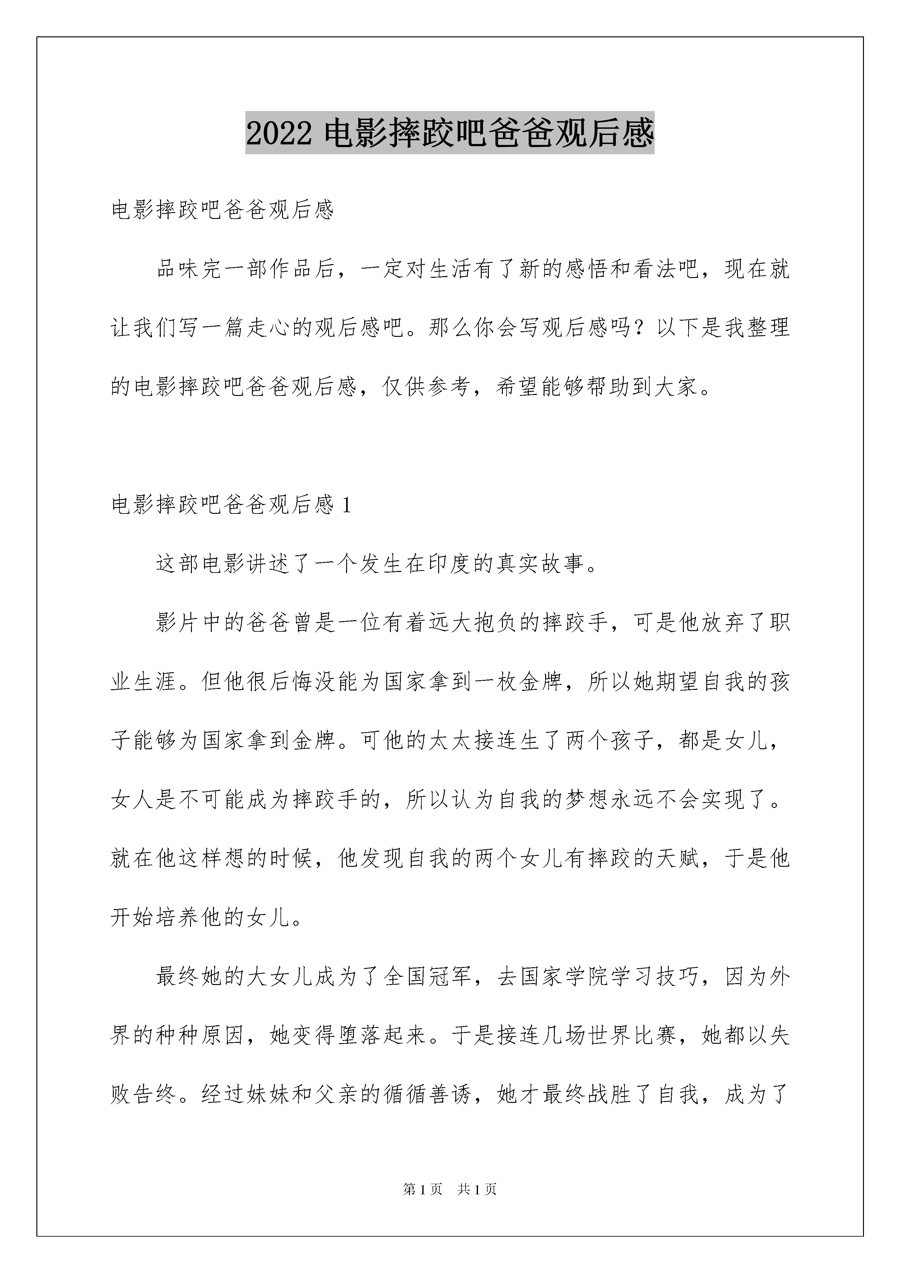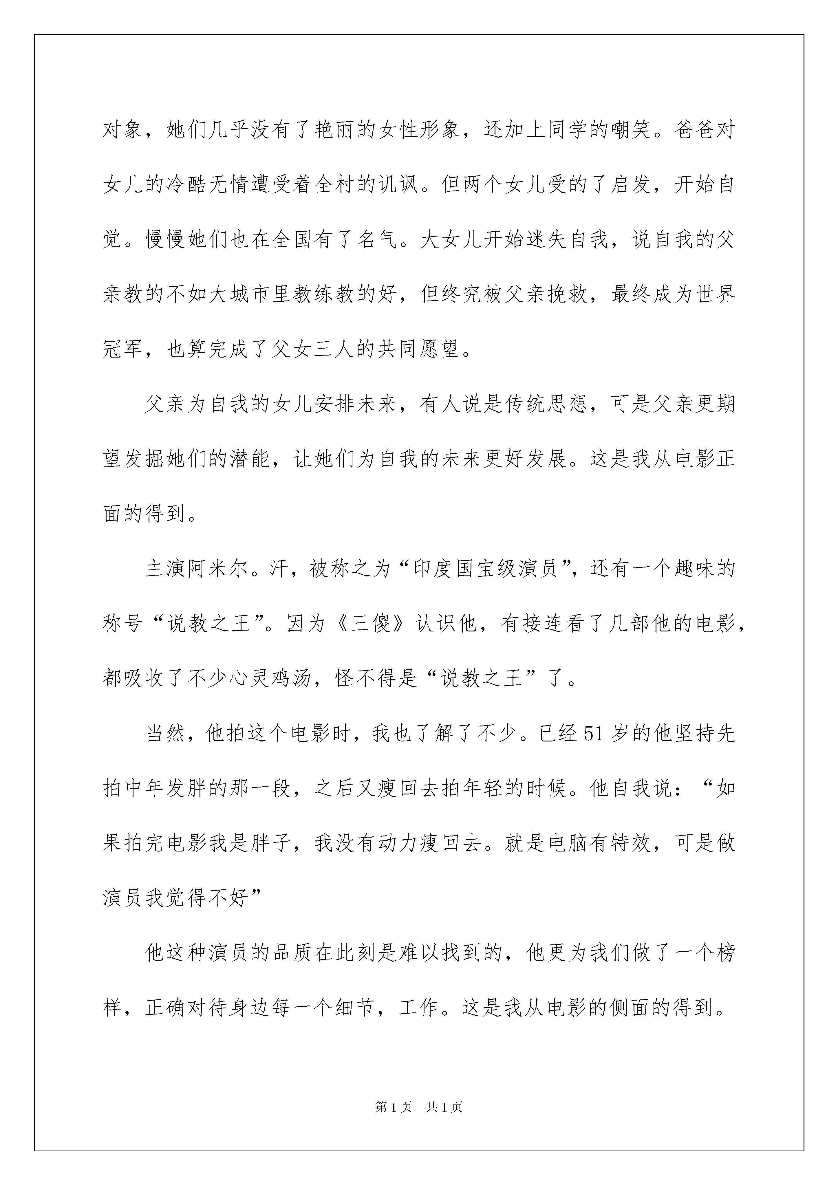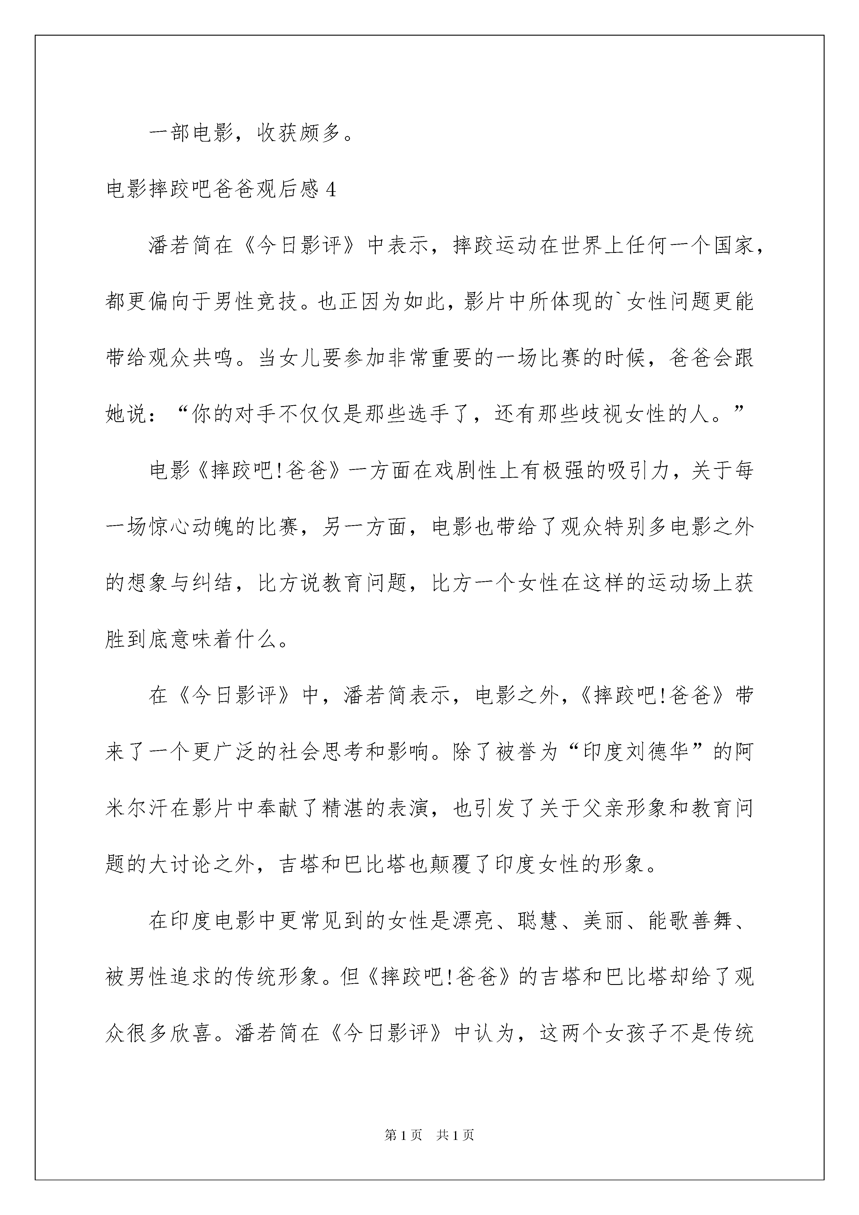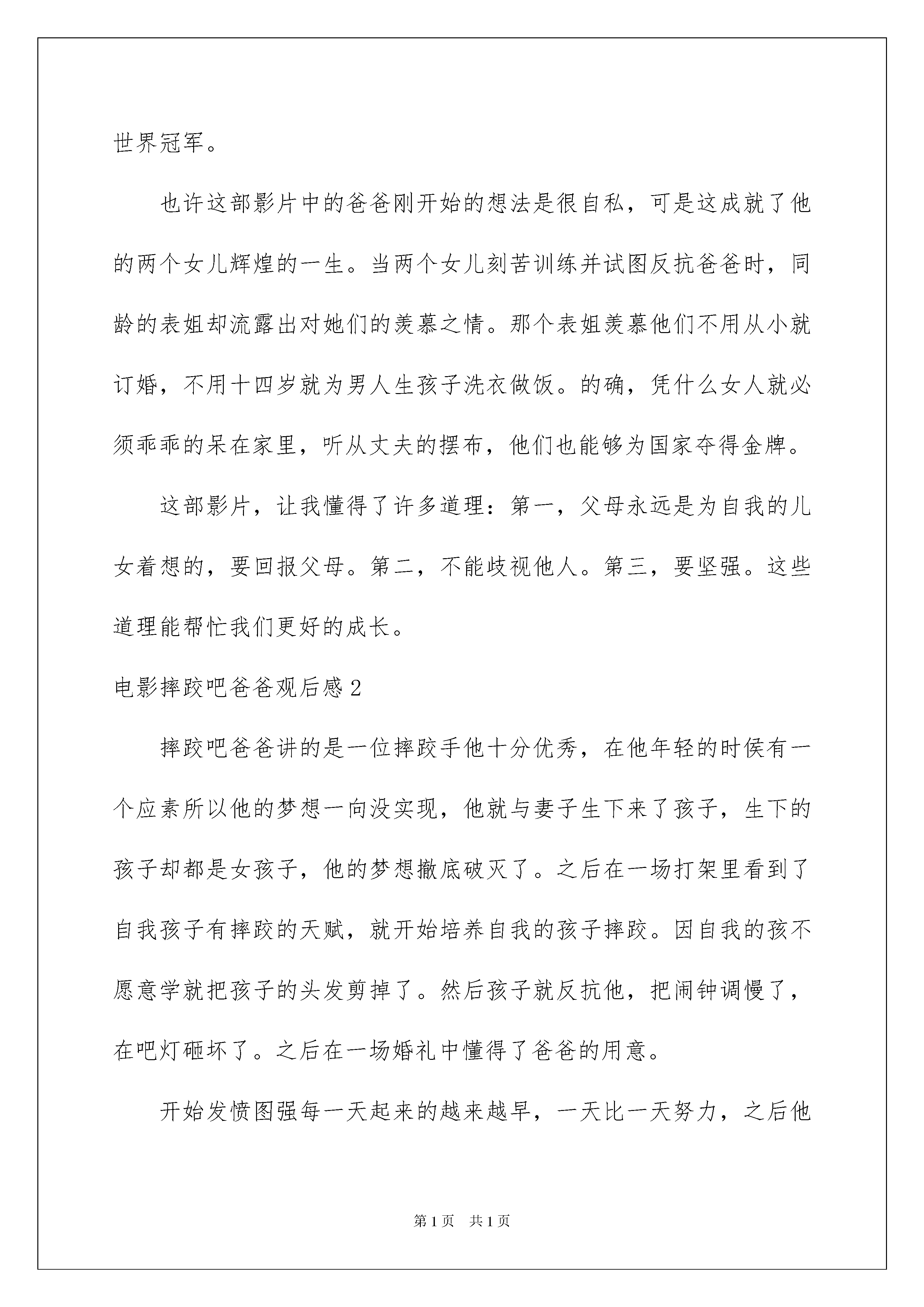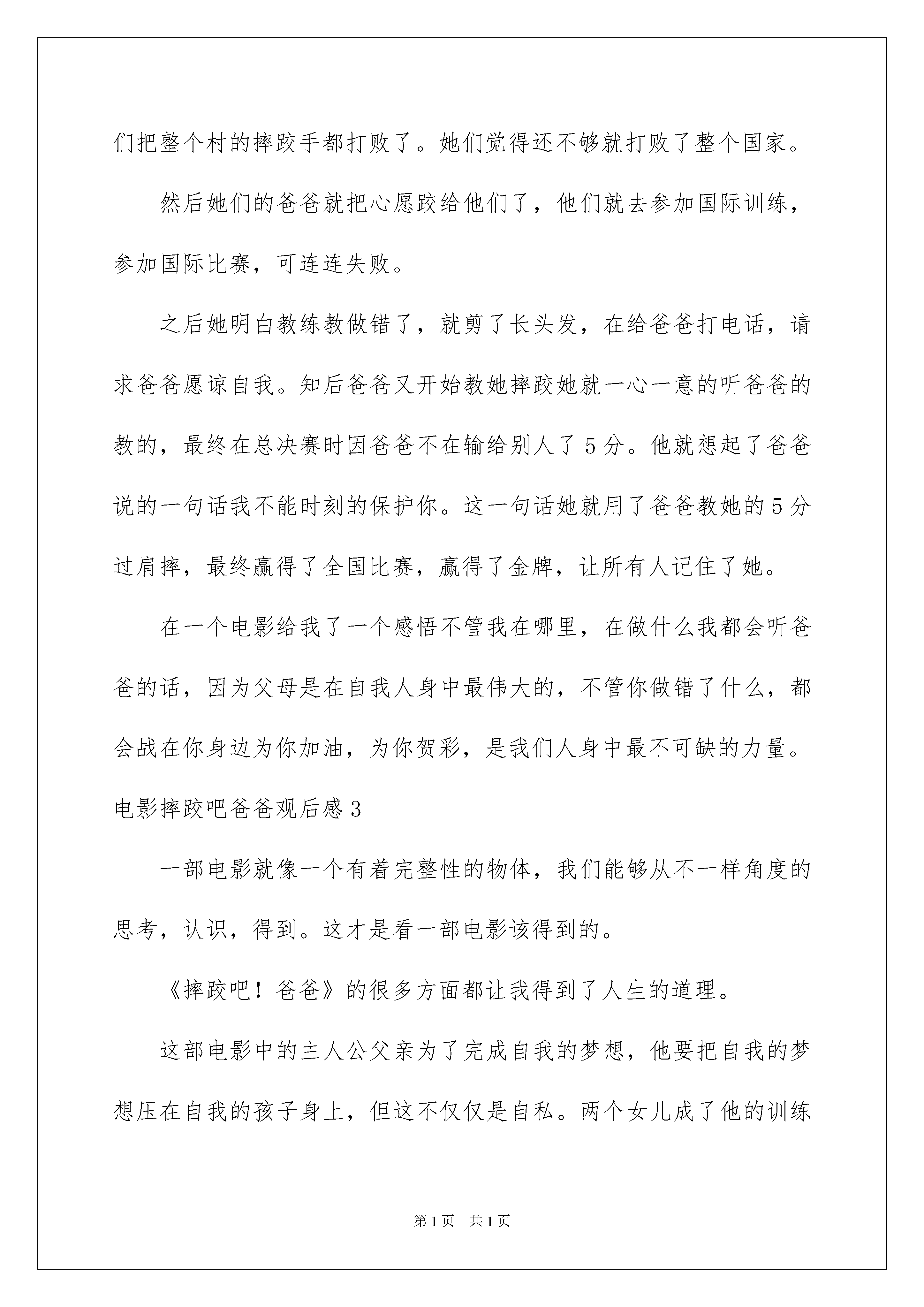 2022电影摔跤吧爸爸观后感电影摔跤吧爸爸观后感品味完一部作品后,一定对生活有了新的感悟和看法吧,现在就让我们写一篇走心的观后感吧。那么你会写观后感吗?以下是我整理的电影摔跤吧爸爸观后感,仅供参考,希望能够帮助到大家。电影摔跤吧爸爸观后感1这部电影讲述了一个发生在印度的真实故事。影片中的爸爸曾是一位有着远大抱负的摔跤手,可是他放弃了职业生涯。但他很后悔没能为国家拿到一枚金牌,所以她期望自我的孩子能够为国家拿到金牌。可他的太太接连生了两个孩子,都是女儿,女人是不可能成为摔跤手的,所以认为自我的梦想永远不会实现了。就在他这样想的时候,他发现自我的两个女儿有摔跤的天赋,于是他开始培养他的女儿。最终她的大女儿成为了全国冠军,去国家学院学习技巧,因为外界的种种原因,她变得堕落起来。于是接连几场世界比赛,她都以失败告终。经过妹妹和父亲的循循善诱,她才最终战胜了自我,成为了世界冠军。也许这部影片中的爸爸刚开始的想法是很自私,可是这成就了他的两个女儿辉煌的一生。当两个女儿刻苦训练并试图反抗爸爸时,同龄的表姐却流露出对她们的羡慕之情。那个表姐羡慕他们不用从小就订婚,不用十四岁就为男人生孩子洗衣做饭。的确,凭什么女人就必须乖乖的呆在家里,听从丈夫的摆布,他们也能够为国家夺得金牌。这部影片,让我懂得了许多道理:第一,父母永远是为自我的儿女着想的,要回报父母。第二,不能歧视他人。第三,要坚强。这些道理能帮忙我们更好的成长。电影摔跤吧爸爸观后感2摔跤吧爸爸讲的是一位摔跤手他十分优秀,在他年轻的时侯有一个应素所以他的梦想一向没实现,他就与妻子生下来了孩子,生下的孩子却都是女孩子,他的梦想撤底破灭了。之后在一场打架里看到了自我孩子有摔跤的天赋,就开始培养自我的孩子摔跤。因自我的孩不愿意学就把孩子的头发剪掉了。然后孩子就反抗他,把闹钟调慢了,在吧灯砸坏了。之后在一场婚礼中懂得了爸爸的用意。开始发愤图强每一天起来的越来越早,一天比一天努力,之后他们把整个村的摔跤手都打败了。她们觉得还不够就打败了整个国家。然后她们的爸爸就把心愿跤给他们了,他们就去参加国际训练,参加国际比赛,可连连失败。之后她明白教练教做错了,就剪了长头发,在给爸爸打电话,请求爸爸愿谅自我。知后爸爸又开始教她摔跤她就一心一意的听爸爸的教的,最终在总决赛时因爸爸不在输给别人了5分。他就想起了爸爸说的一句话我不能时刻的保护你。这一句话她就用了爸爸教她的5分过肩摔,最终赢得了全国比赛,赢得了金牌,让所有人记住了她。在一个电影给我了一个感悟不管我在哪里,在做什么我都会听爸爸的话,因为父母是在自我人身中最伟大的,不管你做错了什么,都会战在你身边为你加油,为你贺彩,是我们人身中最不可缺的力量。电影摔跤吧爸爸观后感3一部电影就像一个有着完整性的物体,我们能够从不一样角度的思考,认识,得到。这才是看一部电影该得到的。《摔跤吧!爸爸》的很多方面都让我得到了人生的道理。这部电影中的主人公父亲为了完成自我的梦想,他要把自我的梦想压在自我的孩子身上,但这不仅仅是自私。两个女儿成了他的训练对象,她们几乎没有了艳丽的女性形象,还加上同学的嘲笑。爸爸对女儿的冷酷无情遭受着全村的讥讽。但两个女儿受的了启发,开始自觉。慢慢她们也在全国有了名气。大女儿开始迷失自我,说自我的父亲教的不如大城市里教练教的好,但终究被父亲挽救,最终成为世界冠军,也算完成了父女三人的共同愿望。父亲为自我的女儿安排未来,有人说是传统思想,可是父亲更期望发掘她们的潜能,让她们为自我的未来更好发展。这是我从电影正面的得到。主演阿米尔。汗,被称之为“印度国宝级演员”,还有一个趣味的称号“说教之王”。因为《三傻》认识他,有接连看了几部他的电影,都吸收了不少心灵鸡汤,怪不得是“说教之王”了。当然,他拍这个电影时,我也了解了不少。已经51岁的他坚持先拍中年发胖的那一段,之后又瘦回去拍年轻的时候。他自我说:“如果拍完电影我是胖子,我没有动力瘦回去。就是电脑有特效,可是做演员我觉得不好”他这种演员的品质在此刻是难以找到的,他更为我们做了一个榜样,正确对待身边每一个细节,工作。这是我从电影的侧面的得到。一部电影,收获颇多。电影摔跤吧爸爸观后感4潘若简在《今日影评》中表示,摔跤运动在世界上任何一个国家,都更偏向于男性竞技。也正因为如此,影片中所体现的`女性问题更能带给观众共鸣。当女儿要参加非常重要的一场比赛的时候,爸爸会跟她说:“你的对手不仅仅是那些选手了,还有那些歧视女性的人。”电影《摔跤吧!爸爸》一方面在戏剧性上有极强的吸引力,关于每一场惊心动魄的比赛,另一方面,电影也带给了观众特别多电影之外的想象与纠结,比方说教育