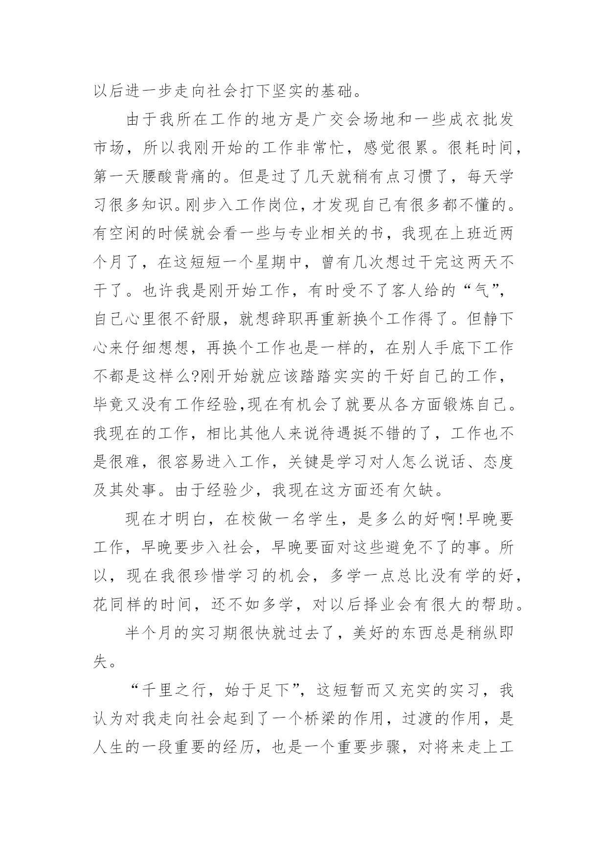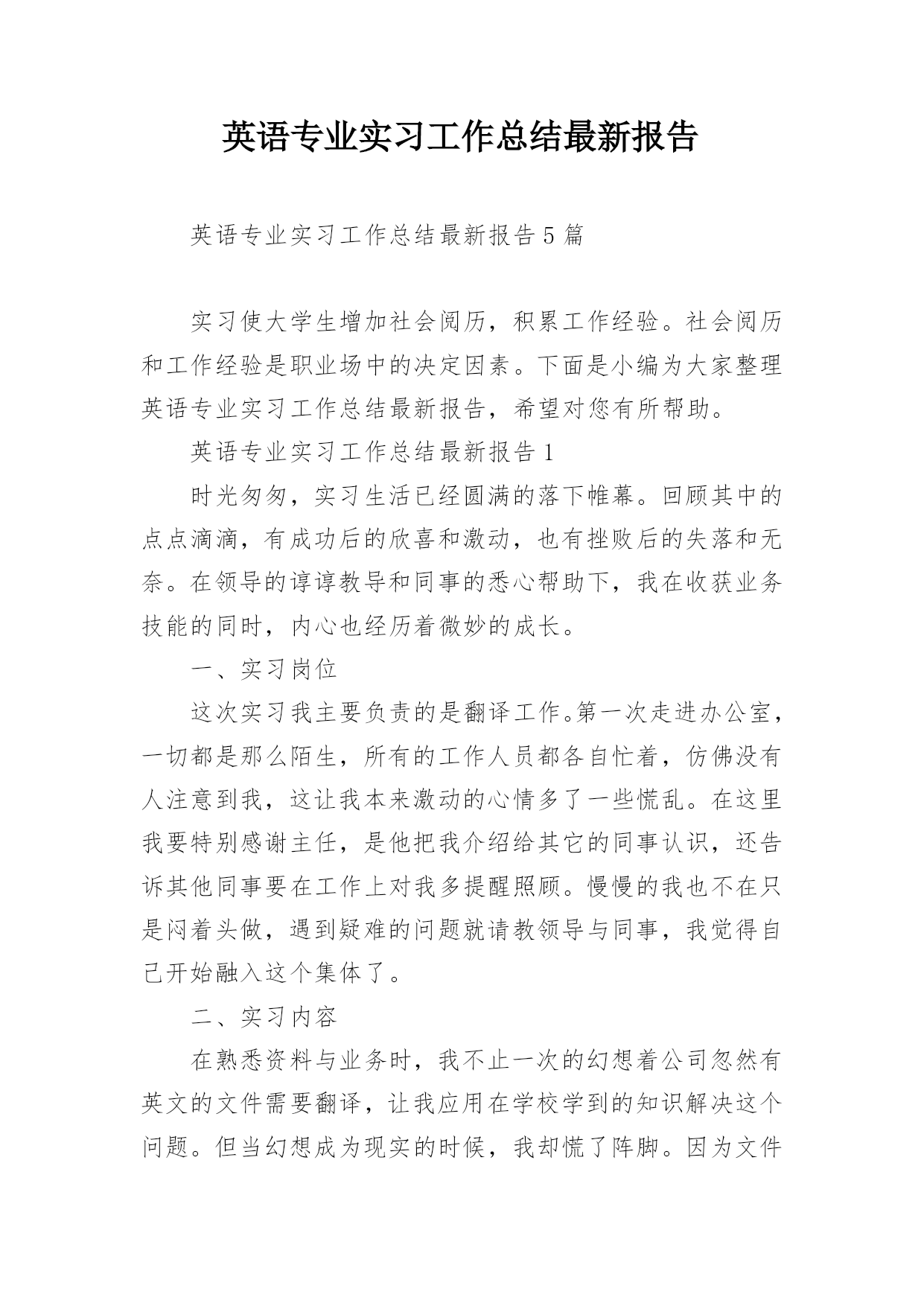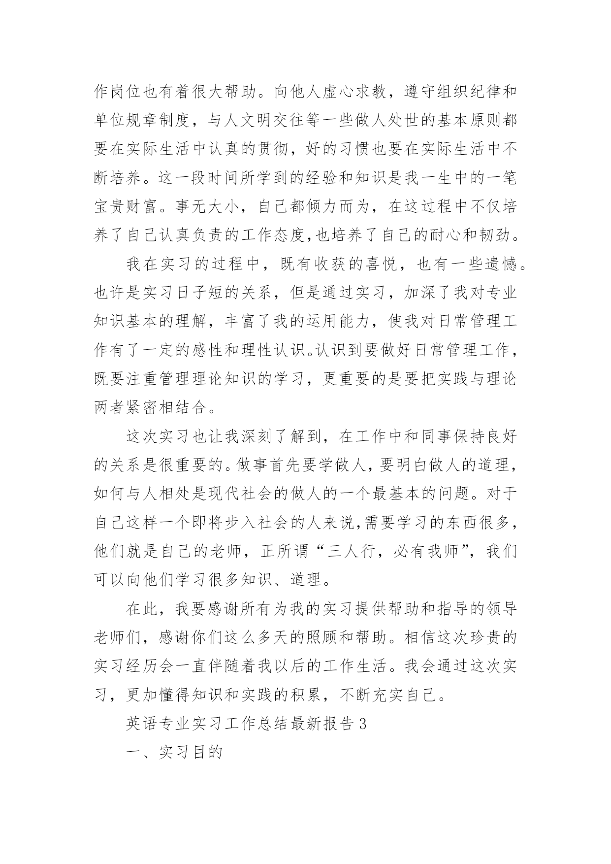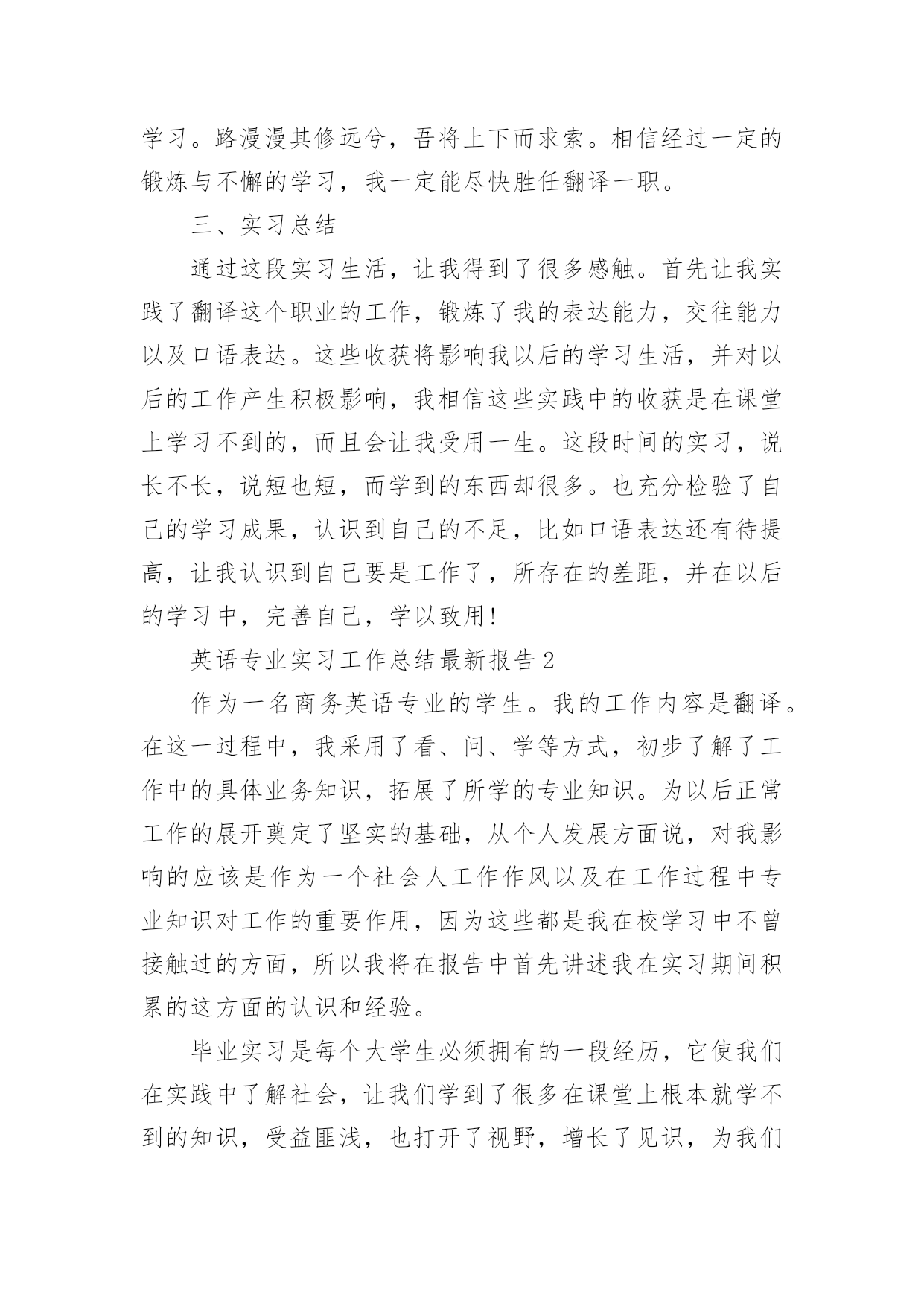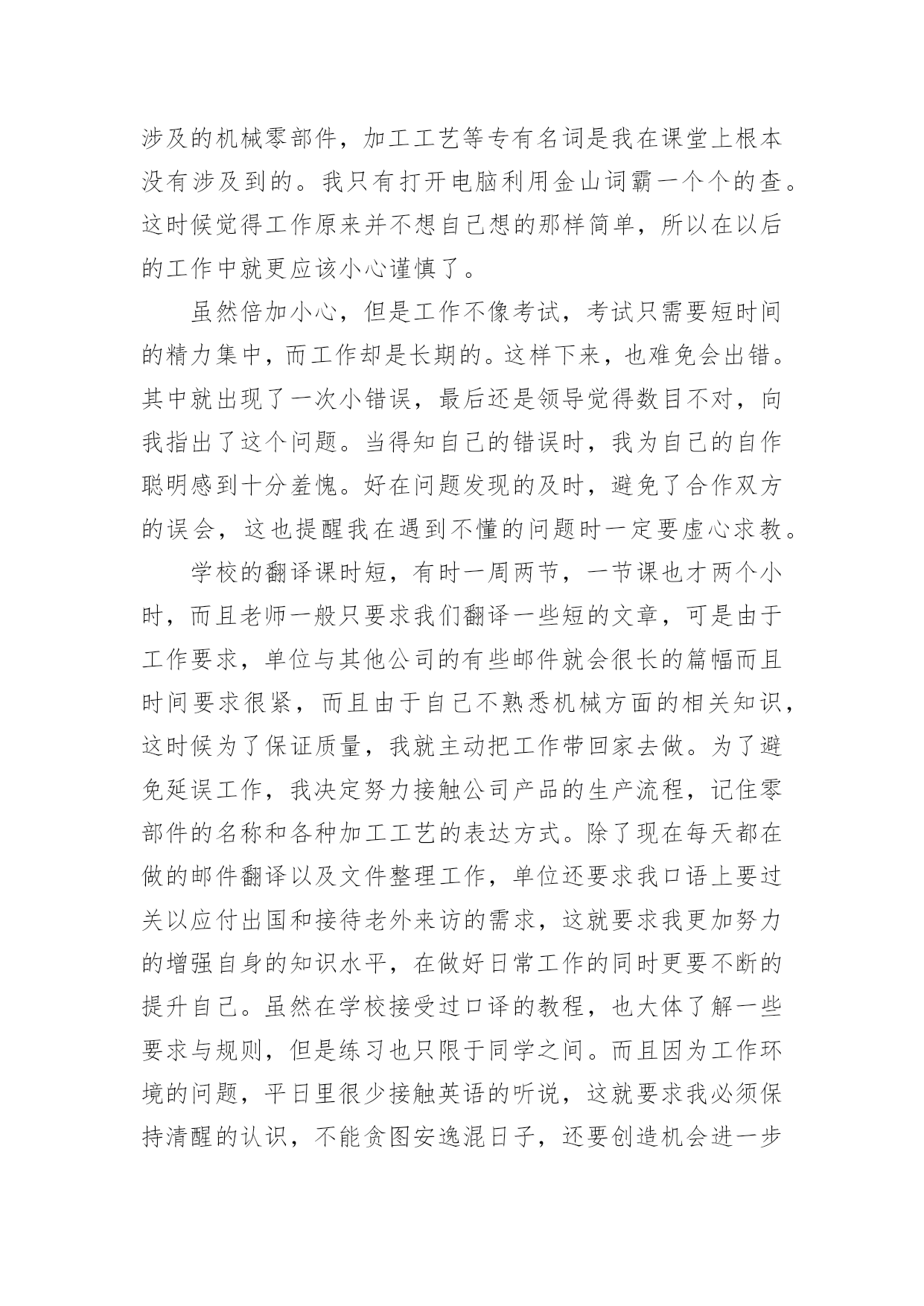 英语专业实习工作总结最新报告 英语专业实习工作总结最新报告5篇实习使大学生增加社会阅历,积累工作经验。社会阅历和工作经验是职业场中的决定因素。下面是小编为大家整理英语专业实习工作总结最新报告,希望对您有所帮助。英语专业实习工作总结最新报告1时光匆匆,实习生活已经圆满的落下帷幕。回顾其中的点点滴滴,有成功后的欣喜和激动,也有挫败后的失落和无奈。在领导的谆谆教导和同事的悉心帮助下,我在收获业务技能的同时,内心也经历着微妙的成长。一、实习岗位这次实习我主要负责的是翻译工作。第一次走进办公室,一切都是那么陌生,所有的工作人员都各自忙着,仿佛没有人注意到我,这让我本来激动的心情多了一些慌乱。在这里我要特别感谢主任,是他把我介绍给其它的同事认识,还告诉其他同事要在工作上对我多提醒照顾。慢慢的我也不在只是闷着头做,遇到疑难的问题就请教领导与同事,我觉得自己开始融入这个集体了。二、实习内容在熟悉资料与业务时,我不止一次的幻想着公司忽然有英文的文件需要翻译,让我应用在学校学到的知识解决这个问题。但当幻想成为现实的时候,我却慌了阵脚。因为文件涉及的机械零部件,加工工艺等专有名词是我在课堂上根本没有涉及到的。我只有打开电脑利用金山词霸一个个的查。这时候觉得工作原来并不想自己想的那样简单,所以在以后的工作中就更应该小心谨慎了。虽然倍加小心,但是工作不像考试,考试只需要短时间的精力集中,而工作却是长期的。这样下来,也难免会出错。其中就出现了一次小错误,最后还是领导觉得数目不对,向我指出了这个问题。当得知自己的错误时,我为自己的自作聪明感到十分羞愧。好在问题发现的及时,避免了合作双方的误会,这也提醒我在遇到不懂的问题时一定要虚心求教。学校的翻译课时短,有时一周两节,一节课也才两个小时,而且老师一般只要求我们翻译一些短的文章,可是由于工作要求,单位与其他公司的有些邮件就会很长的篇幅而且时间要求很紧,而且由于自己不熟悉机械方面的相关知识,这时候为了保证质量,我就主动把工作带回家去做。为了避免延误工作,我决定努力接触公司产品的生产流程,记住零部件的名称和各种加工工艺的表达方式。除了现在每天都在做的邮件翻译以及文件整理工作,单位还要求我口语上要过关以应付出国和接待老外来访的需求,这就要求我更加努力的增强自身的知识水平,在做好日常工作的同时更要不断的提升自己。虽然在学校接受过口译的教程,也大体了解一些要求与规则,但是练习也只限于同学之间。而且因为工作环境的问题,平日里很少接触英语的听说,这就要求我必须保持清醒的认识,不能贪图安逸混日子,还要创造机会进一步学习。路漫漫其修远兮,吾将上下而求索。相信经过一定的锻炼与不懈的学习,我一定能尽快胜任翻译一职。三、实习总结通过这段实习生活,让我得到了很多感触。首先让我实践了翻译这个职业的工作,锻炼了我的表达能力,交往能力以及口语表达。这些收获将影响我以后的学习生活,并对以后的工作产生积极影响,我相信这些实践中的收获是在课堂上学习不到的,而且会让我受用一生。这段时间的实习,说长不长,说短也短,而学到的东西却很多。也充分检验了自己的学习成果,认识到自己的不足,比如口语表达还有待提高,让我认识到自己要是工作了,所存在的差距,并在以后的学习中,完善自己,学以致用!英语专业实习工作总结最新报告2作为一名商务英语专业的学生。我的工作内容是翻译。在这一过程中,我采用了看、问、学等方式,初步了解了工作中的具体业务知识,拓展了所学的专业知识。为以后正常工作的展开奠定了坚实的基础,从个人发展方面说,对我影响的应该是作为一个社会人工作作风以及在工作过程中专业知识对工作的重要作用,因为这些都是我在校学习中不曾接触过的方面,所以我将在报告中首先讲述我在实习期间积累的这方面的认识和经验。毕业实习是每个大学生必须拥有的一段经历,它使我们在实践中了解社会,让我们学到了很多在课堂上根本就学不到的知识,受益匪浅,也打开了视野,增长了见识,为我们以后进一步走向社会打下坚实的基础。由于我所在工作的地方是广交会场地和一些成衣批发市场,所以我刚开始的工作非常忙,感觉很累。很耗时间,第一天腰酸背痛的。但是过了几天就稍有点习惯了,每天学习很多知识。刚步入工作岗位,才发现自己有很多都不懂的。有空闲的时候就会看一些与专业相关的书,我现在上班近两个月了,在这短短一个星期中,曾有几次想过干完这两天不干了。也许我是刚开始工作,有时受不了客人给的“气”,自己心里很不舒服,就想辞职再重新换个工作得了。但静下心来仔细想想,再换个工作也是一样的,在别人手底下工作不都是这样么?刚开始就应该踏踏实实的干好自己的工作,毕竟又没有工作经验,现在有机会了就要从各方面锻炼自己。我现在的工作,相比其他人来说待遇挺不错的了,工作也不是很难,很容易进入工作,关键是学习对人怎么说话、态度及其处事。由于经验少,