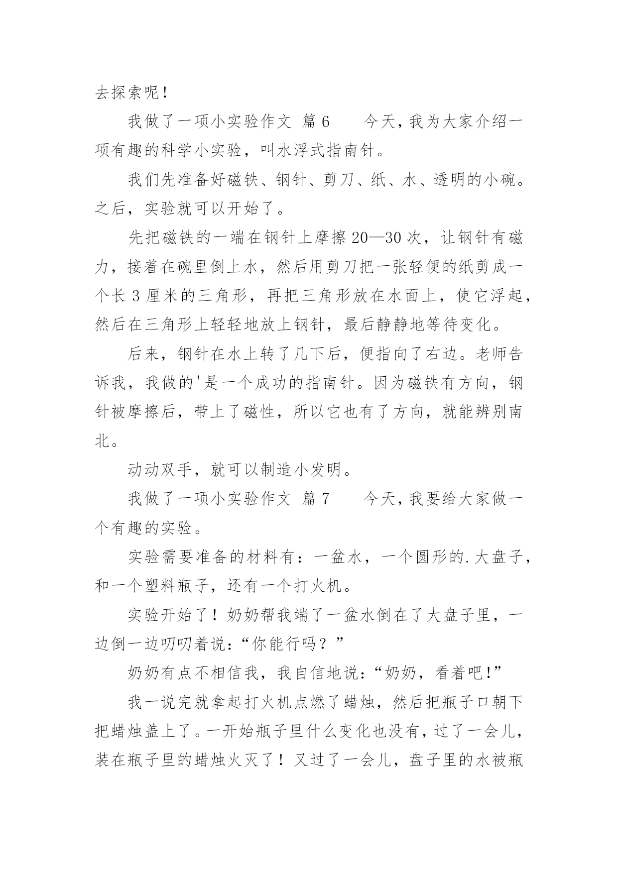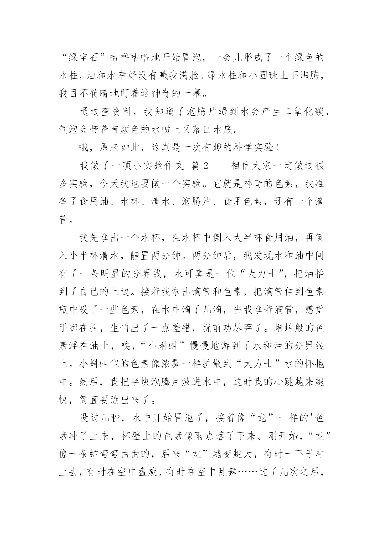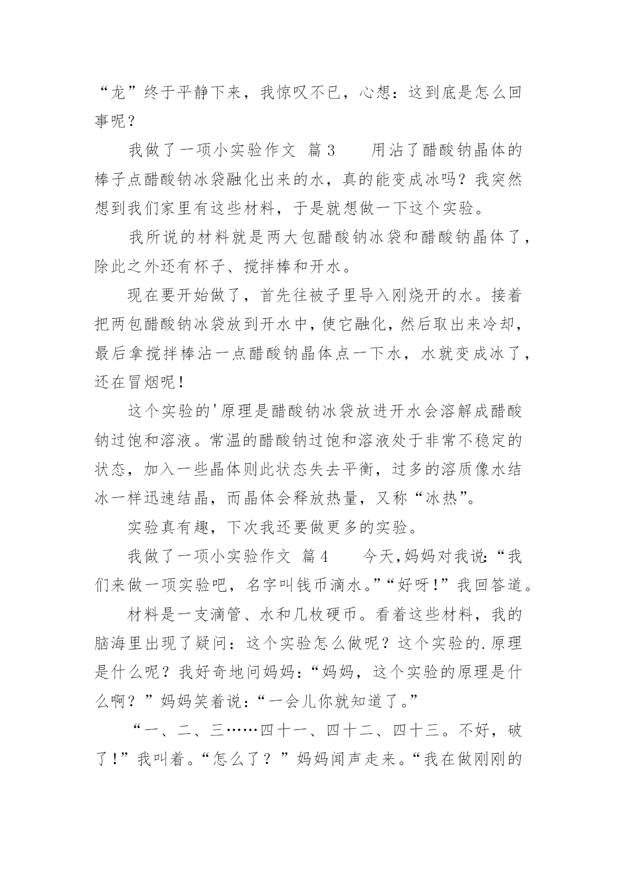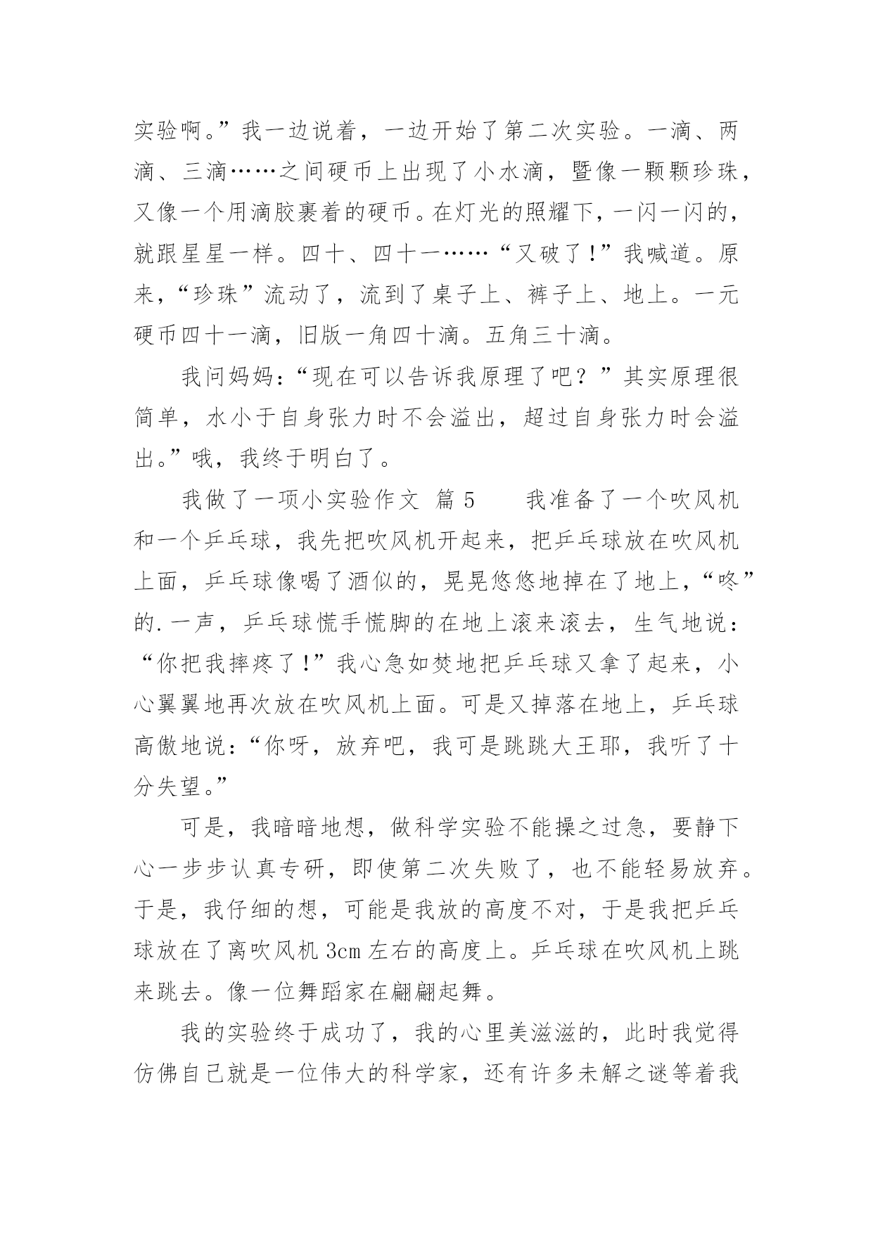 我做了一项小实验作文 我做了一项小实验作文300字(通用66篇)在平日的学习、工作和生活里,大家都写过作文,肯定对各类作文都很熟悉吧,作文要求篇章结构完整,一定要避免无结尾作文的出现。如何写一篇有思想、有文采的作文呢?以下是小编精心整理的我做了一项小实验作文300字,欢迎大家借鉴与参考,希望对大家有所帮助。我做了一项小实验作文篇1我在电视上见过火山爆发的场景,今天我要做一个小实验叫做“冒泡的岩浆瓶”。做这个实验我们需要的材料有:食用油、清水、泡腾片、食用色素、水杯和滴管。所有材料准备就绪,那我们就开始实验啦!我先往水杯里倒入大半杯食用油,然后倒入小半杯清水,倒完后我就把杯子静置两分钟。水真是个大力士,把油给举起来了!因为我知道水和油是不相溶的,所以,厚厚的一层油浮了上来。接着,我再用滴管吸了一些绿色色素,向杯子里滴了几滴,色素躺在油汁形成的床上,接着慢慢溶入了水的怀抱。黄色的油下面出现了一块绿宝石。最后,要放泡腾片了,我想放入泡腾片后,油和水会不会溅我满脸吗?我开始忐忑不安起来。我壮着胆子放入了泡腾片,奇迹发生了,平静的'“绿宝石”咕噜咕噜地开始冒泡,一会儿形成了一个绿色的水柱,油和水幸好没有溅我满脸。绿水柱和小圆珠上下沸腾,我目不转睛地盯着这神奇的一幕。通过查资料,我知道了泡腾片遇到水会产生二氧化碳,气泡会带着有颜色的水喷上又落回水底。哦,原来如此,这真是一次有趣的科学实验!我做了一项小实验作文篇2相信大家一定做过很多实验,今天我也要做一个实验。它就是神奇的色素,我准备了食用油、水杯、清水、泡腾片、食用色素,还有一个滴管。我先拿出一个水杯,在水杯中倒入大半杯食用油,再倒入小半杯清水,静置两分钟。两分钟后,我发现水和油中间有了一条明显的分界线,水可真是一位“大力士”,把油抬到了自己的上边。接着我拿出滴管和色素,把滴管伸到色素瓶中吸了一些色素,在水中滴了几滴,当我拿着滴管,感觉手都在抖,生怕出了一点差错,就前功尽弃了。蝌蚪般的色素浮在油上,唉,“小蝌蚪”慢慢地游到了水和油的分界线上。小蝌蚪似的色素像浓雾一样扩散到“大力士”水的怀抱中。然后,我把半块泡腾片放进水中,这时我的心跳越来越快,简直要蹦出来了。没过几秒,水中开始冒泡了,接着像“龙”一样的'色素冲了上来,杯壁上的色素像雨点落了下来。刚开始,“龙”像一条蛇弯弯曲曲的,后来“龙”越变越大,有时一下子冲上去,有时在空中盘旋,有时在空中乱舞……过了几次之后,“龙”终于平静下来,我惊叹不已,心想:这到底是怎么回事呢?我做了一项小实验作文篇3用沾了醋酸钠晶体的棒子点醋酸钠冰袋融化出来的水,真的能变成冰吗?我突然想到我们家里有这些材料,于是就想做一下这个实验。我所说的材料就是两大包醋酸钠冰袋和醋酸钠晶体了,除此之外还有杯子、搅拌棒和开水。现在要开始做了,首先往被子里导入刚烧开的水。接着把两包醋酸钠冰袋放到开水中,使它融化,然后取出来冷却,最后拿搅拌棒沾一点醋酸钠晶体点一下水,水就变成冰了,还在冒烟呢!这个实验的'原理是醋酸钠冰袋放进开水会溶解成醋酸钠过饱和溶液。常温的醋酸钠过饱和溶液处于非常不稳定的状态,加入一些晶体则此状态失去平衡,过多的溶质像水结冰一样迅速结晶,而晶体会释放热量,又称“冰热”。实验真有趣,下次我还要做更多的实验。我做了一项小实验作文篇4今天,妈妈对我说:“我们来做一项实验吧,名字叫钱币滴水。”“好呀!”我回答道。材料是一支滴管、水和几枚硬币。看着这些材料,我的脑海里出现了疑问:这个实验怎么做呢?这个实验的.原理是什么呢?我好奇地问妈妈:“妈妈,这个实验的原理是什么啊?”妈妈笑着说:“一会儿你就知道了。”“一、二、三……四十一、四十二、四十三。不好,破了!”我叫着。“怎么了?”妈妈闻声走来。“我在做刚刚的实验啊。”我一边说着,一边开始了第二次实验。一滴、两滴、三滴……之间硬币上出现了小水滴,暨像一颗颗珍珠,又像一个用滴胶裹着的硬币。在灯光的照耀下,一闪一闪的,就跟星星一样。四十、四十一……“又破了!”我喊道。原来,“珍珠”流动了,流到了桌子上、裤子上、地上。一元硬币四十一滴,旧版一角四十滴。五角三十滴。我问妈妈:“现在可以告诉我原理了吧?”其实原理很简单,水小于自身张力时不会溢出,超过自身张力时会溢出。”哦,我终于明白了。我做了一项小实验作文篇5我准备了一个吹风机和一个乒乓球,我先把吹风机开起来,把乒乓球放在吹风机上面,乒乓球像喝了酒似的,晃晃悠悠地掉在了地上,“咚”的.一声,乒乓球慌手慌脚的在地上滚来滚去,生气地说:“你把我摔疼了!”我心急如焚地把乒乓球又拿了起来,小心翼翼地再次放在吹风机上面。可是又掉落在地上,乒乓球高傲地说:“你呀,放弃吧,我可是跳跳大王耶,我听了十分失望。”可是,我暗暗地想,做科学实验不能操之过急,要静下心一步步认真专研,即使第二次失败了,也不