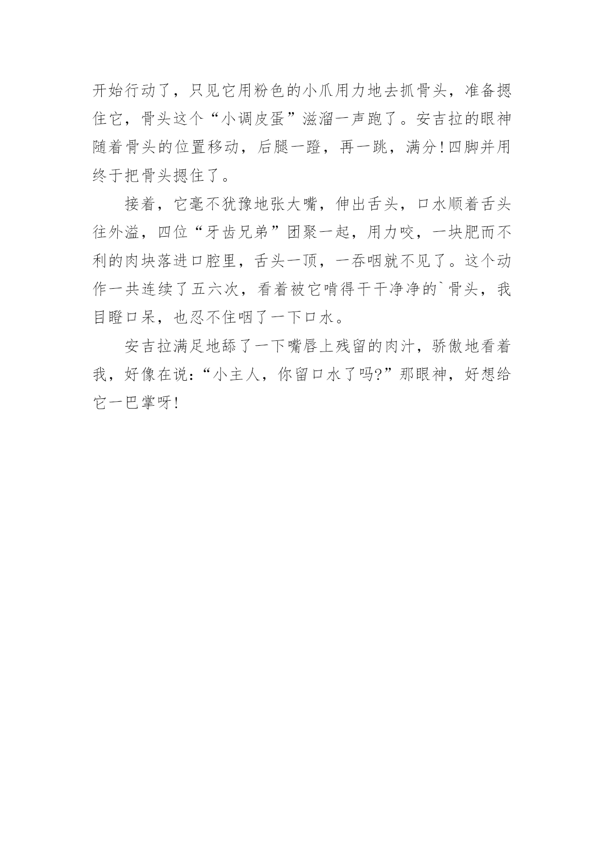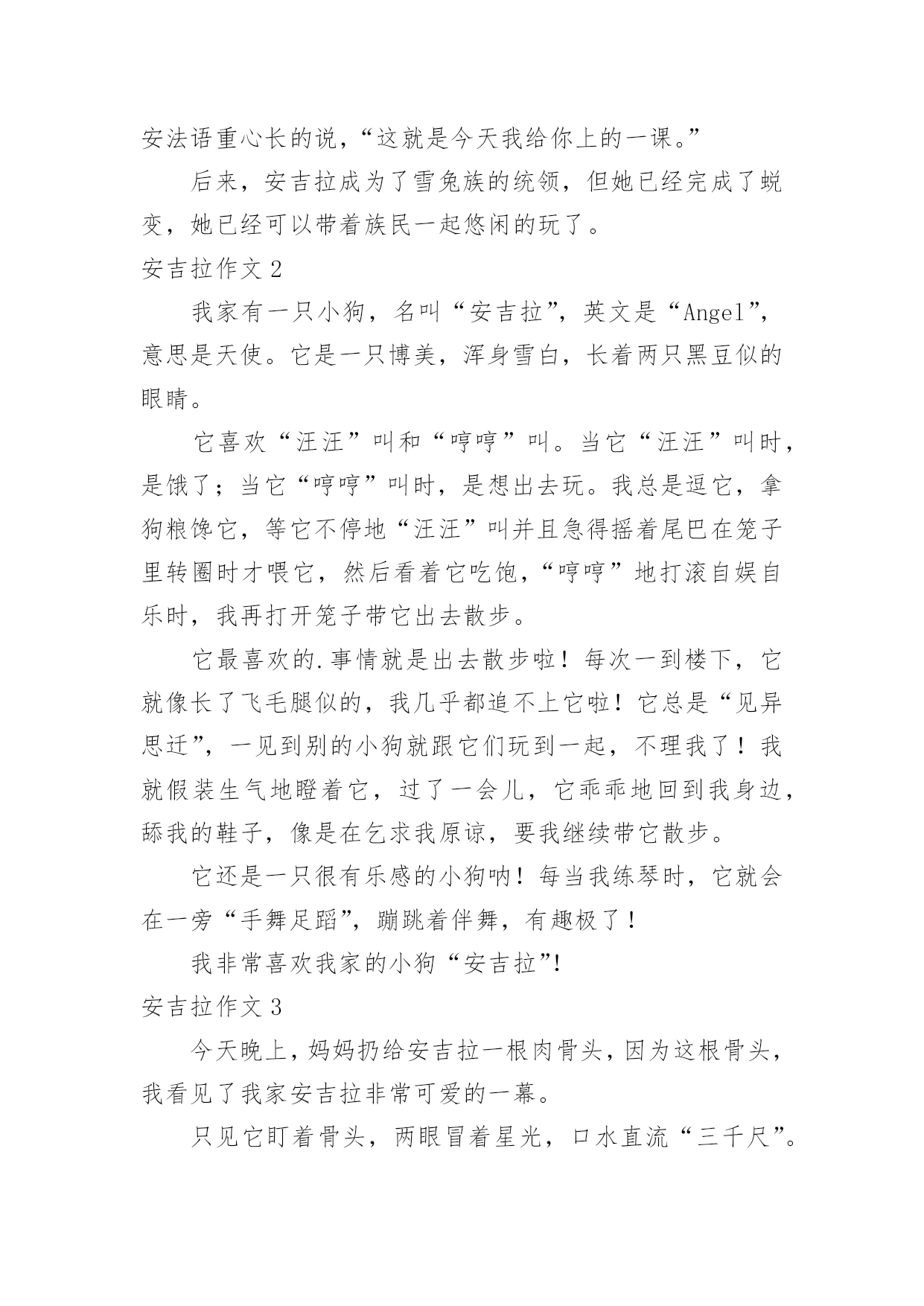 安吉拉作文 安吉拉作文在日常生活或是工作学习中,大家都经常看到作文的身影吧,作文要求篇章结构完整,一定要避免无结尾作文的出现。为了让您在写作文时更加简单方便,以下是小编为大家收集的安吉拉作文,欢迎阅读与收藏。安吉拉作文1安吉拉是一只小兔子,同时,她还是兔子里的贵族,雪兔。这天,安吉拉跟随哥哥安法去森林祷告,谁知,却碰上了凶狠的狮子大王。狮子大嘴一张,“雪兔兄妹,本大王饿了,快点来给本王当美食吧!”两只兔子吓得撒腿就跑,安吉拉拍拍自己的小心脏,“天啊,哥哥,森林太可怕了,我们回家吧。”安法摇摇头,他沉着脸,“安吉拉,如果你害怕那你就独自一人回去和父母交待。”安吉拉害怕自己一人回家虎会遇到危险,只好小心翼翼的.跟随着哥哥。不过,幸运的是,小兔子们没有在遇到危险,顺利完成了祷告。回家的路上,安法轻轻抚摸着妹妹的头,“安吉拉,有些事情你始终是要面对,这些事,是你一辈子都逃不掉的。”安法语重心长的说,“这就是今天我给你上的一课。”后来,安吉拉成为了雪兔族的统领,但她已经完成了蜕变,她已经可以带着族民一起悠闲的玩了。安吉拉作文2我家有一只小狗,名叫“安吉拉”,英文是“Angel”,意思是天使。它是一只博美,浑身雪白,长着两只黑豆似的眼睛。它喜欢“汪汪”叫和“哼哼”叫。当它“汪汪”叫时,是饿了;当它“哼哼”叫时,是想出去玩。我总是逗它,拿狗粮馋它,等它不停地“汪汪”叫并且急得摇着尾巴在笼子里转圈时才喂它,然后看着它吃饱,“哼哼”地打滚自娱自乐时,我再打开笼子带它出去散步。它最喜欢的.事情就是出去散步啦!每次一到楼下,它就像长了飞毛腿似的,我几乎都追不上它啦!它总是“见异思迁”,一见到别的小狗就跟它们玩到一起,不理我了!我就假装生气地瞪着它,过了一会儿,它乖乖地回到我身边,舔我的鞋子,像是在乞求我原谅,要我继续带它散步。它还是一只很有乐感的小狗呐!每当我练琴时,它就会在一旁“手舞足蹈”,蹦跳着伴舞,有趣极了!我非常喜欢我家的小狗“安吉拉”!安吉拉作文3今天晚上,妈妈扔给安吉拉一根肉骨头,因为这根骨头,我看见了我家安吉拉非常可爱的一幕。只见它盯着骨头,两眼冒着星光,口水直流“三千尺”。开始行动了,只见它用粉色的小爪用力地去抓骨头,准备摁住它,骨头这个“小调皮蛋”滋溜一声跑了。安吉拉的眼神随着骨头的位置移动,后腿一蹬,再一跳,满分!四脚并用终于把骨头摁住了。接着,它毫不犹豫地张大嘴,伸出舌头,口水顺着舌头往外溢,四位“牙齿兄弟”团聚一起,用力咬,一块肥而不利的肉块落进口腔里,舌头一顶,一吞咽就不见了。这个动作一共连续了五六次,看着被它啃得干干净净的`骨头,我目瞪口呆,也忍不住咽了一下口水。安吉拉满足地舔了一下嘴唇上残留的肉汁,骄傲地看着我,好像在说:“小主人,你留口水了吗?”那眼神,好想给它一巴掌呀!