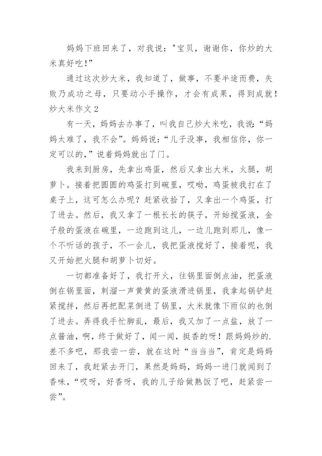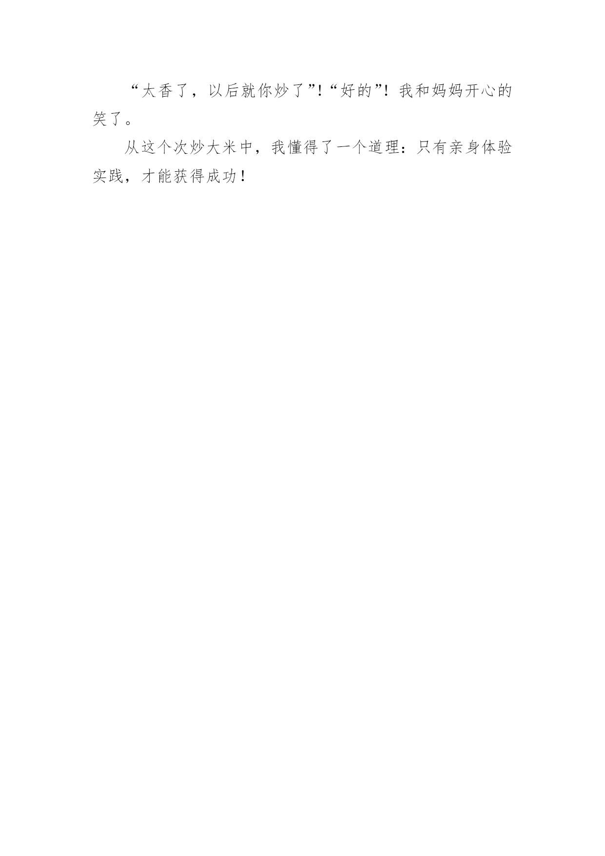 炒大米作文 炒大米作文无论是身处学校还是步入社会,大家都经常看到作文的身影吧,借助作文人们可以实现文化交流的目的。那么你有了解过作文吗?以下是小编为大家整理的炒大米作文,仅供参考,欢迎大家阅读。炒大米作文1妈妈每天给我做饭很辛苦,今天妈妈上班去了,她中午就回来了,所以,我要给妈妈炒大米。首先,把焖好的米饭放到一个盘子中,从冰箱里取出两颗鸡量,拿出一个削过皮的胡萝卜,把鸡蛋在碗边敲一下,打入碗中,就在这时,我把其中的一颗鸡蛋打到了灶台上,我便急忙地把它放到花盆里,因为奶奶跟我说过,鸡蛋也是一种肥料,这种肥料可以养花,如果像掉地的或者是坏掉的鸡蛋都可以放到花盆是去养花。接着,把鸡蛋的蛋清与蛋黄搅拌均匀之后,把黄瓜、营养丰富的胡萝卜,能补充维生素C的蒜苔和美味的'火腿肠都一律切成丁。接下来,我就打开火,在锅里倒上油,把刚才切好的菜都放里去,再放上鸡蛋,来回翻炒上十下左右,再把大米倒入锅中,再继续炒,我小心翼翼地翻炒,生怕烫着手!妈妈下班回来了,对我说:"宝贝,谢谢你,你炒的大米真好吃!”通过这次炒大米,我知道了,做事,不要半途而费,失败乃成功之母,只要动小手操作,才会有成果,得到成就!炒大米作文2有一天,妈妈去办事了,叫我自己炒大米吃,我说:“妈妈太难了,我不会”。妈妈说:“儿子没事,我相信你,你一定可以的,”说着妈妈就出了门。我来到厨房,先拿出鸡蛋,然后又拿出大米,火腿,胡萝卜。接着把圆圆的鸡蛋打到碗里,哎呦,鸡蛋被我打在了桌子上,这可怎么办呢?赶紧收拾了,又拿出一个鸡蛋,打了进去。然后,我又拿了一根长长的筷子,开始搅蛋液,金子般的蛋液在碗里,一边跑到这儿,一边儿跑到那儿,像一个不听话的孩子,不一会儿,我把蛋液搅好了,接着呢,我又开始把火腿和胡萝卜切好。一切都准备好了,我打开火,往锅里面倒点油,把蛋液倒在锅里面,刺溜一声黄黄的蛋液滑进锅里,我拿起锅铲赶紧搅拌,然后再把配菜倒进了锅里,大米就像下雨似的也倒了进去。弄得我手忙脚乱,最后,我又加了一点盐,放了一点酱油,啊,终于做好了,闻一闻,挺香的呀!跟妈妈炒的.差不多吧,那我尝一尝,就在这时“当当当”,肯定是妈妈回来了,我赶紧去开门,果然是妈妈,妈妈一进门就闻到了香味,“哎呀,好香呀,我的儿子给做熟饭了吧,赶紧尝一尝”。“太香了,以后就你炒了”!“好的”!我和妈妈开心的笑了。从这个次炒大米中,我懂得了一个道理:只有亲身体验实践,才能获得成功!