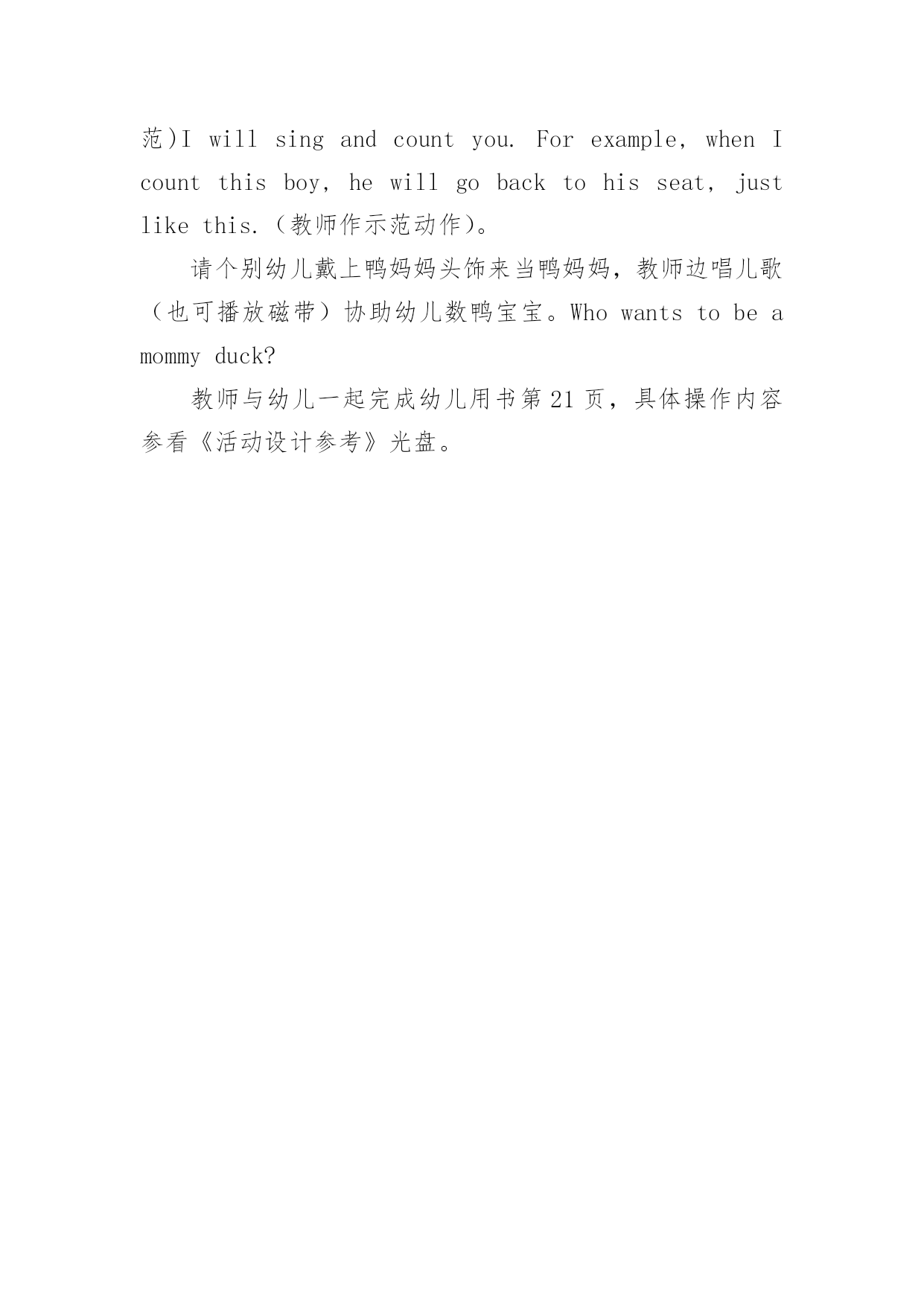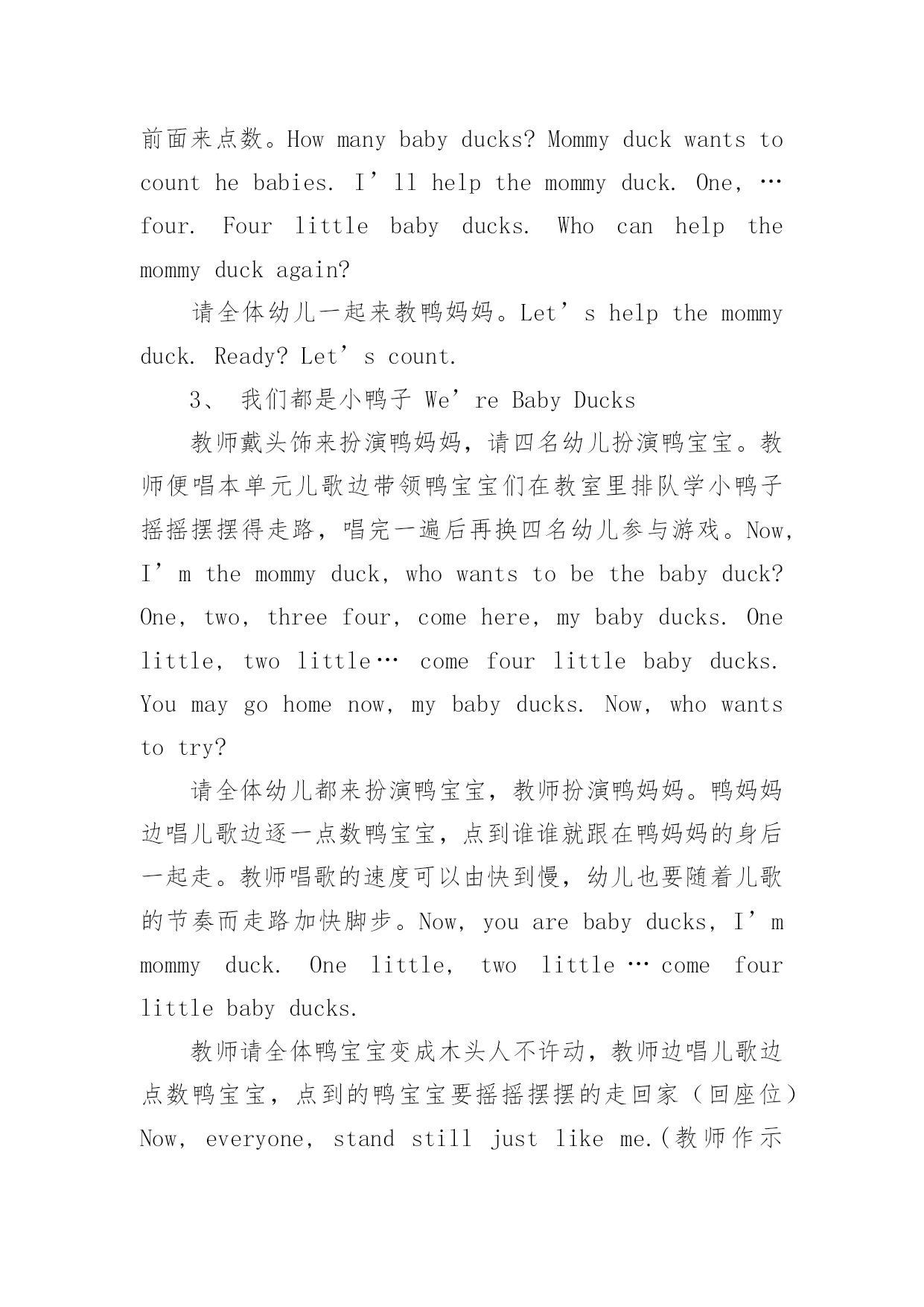 11月份英语托班教案 11月份英语托班教案活动目标:1、亲近英语,培养幼儿主动参与英语活动意识。2、初步感知数字1到4的顺序及集合,暗示数量的增长。3、通过整首儿歌的语感培养,幼儿初步理解儿歌内容(四只鸭宝宝的`故事)。活动教具:鸭妈妈头饰或玩具各一个,鸭宝宝玩具四个。活动说明:1、情景表演ActItOut教师戴鸭妈妈头饰扮成鸭妈妈,四处寻找鸭宝宝,边找边模仿小鸭子叫声quack,quack,quack…教师将鸭宝宝一只一只地找到,将鸭宝宝放在一起数总和。Look,whatisit?Yes,aduck.I’mmommyduck.Wherearemybabyducks?Quack,quack,quack…Oh,heretheyare.Onelittlebabyduck…fourlittlebabyducks.Oh,allmybabyducksarehere.Let’scountthemagain.One,twothree,four,fourlittlebabyducks.2、数一数Let’sCount教师摘下头饰拿出鸭妈妈玩具,请幼儿来教鸭妈妈数数看有多少个鸭宝宝。教师先做点数示范,然后请个别幼儿到前面来点数。Howmanybabyducks?Mommyduckwantstocounthebabies.I’llhelpthemommyduck.One,…four.Fourlittlebabyducks.Whocanhelpthemommyduckagain?请全体幼儿一起来教鸭妈妈。Let’shelpthemommyduck.Ready?Let’scount.3、我们都是小鸭子We’reBabyDucks教师戴头饰来扮演鸭妈妈,请四名幼儿扮演鸭宝宝。教师便唱本单元儿歌边带领鸭宝宝们在教室里排队学小鸭子摇摇摆摆得走路,唱完一遍后再换四名幼儿参与游戏。Now,I’mthemommyduck,whowantstobethebabyduck?One,two,threefour,comehere,mybabyducks.Onelittle,twolittle…comefourlittlebabyducks.Youmaygohomenow,mybabyducks.Now,whowantstotry?请全体幼儿都来扮演鸭宝宝,教师扮演鸭妈妈。鸭妈妈边唱儿歌边逐一点数鸭宝宝,点到谁谁就跟在鸭妈妈的身后一起走。教师唱歌的速度可以由快到慢,幼儿也要随着儿歌的节奏而走路加快脚步。Now,youarebabyducks,I’mmommyduck.Onelittle,twolittle…comefourlittlebabyducks.教师请全体鸭宝宝变成木头人不许动,教师边唱儿歌边点数鸭宝宝,点到的鸭宝宝要摇摇摆摆的走回家(回座位)Now,everyone,standstilljustlikeme.(教师作示范)Iwillsingandcountyou.Forexample,whenIcountthisboy,hewillgobacktohisseat,justlikethis.(教师作示范动作)。请个别幼儿戴上鸭妈妈头饰来当鸭妈妈,教师边唱儿歌(也可播放磁带)协助幼儿数鸭宝宝。Whowantstobeamommyduck?教师与幼儿一起完成幼儿用书,具体操作内容参看《活动设计参考》光盘。