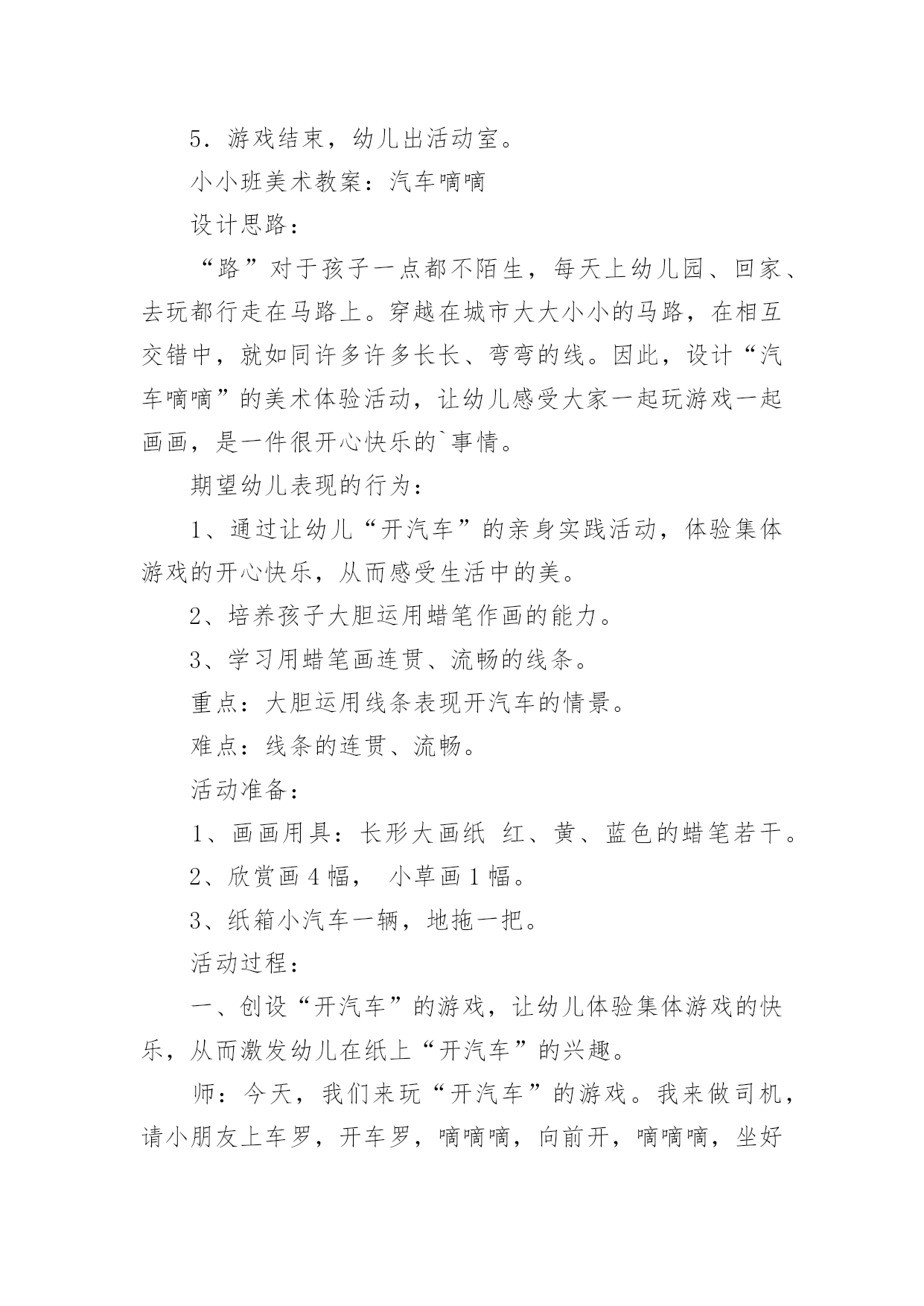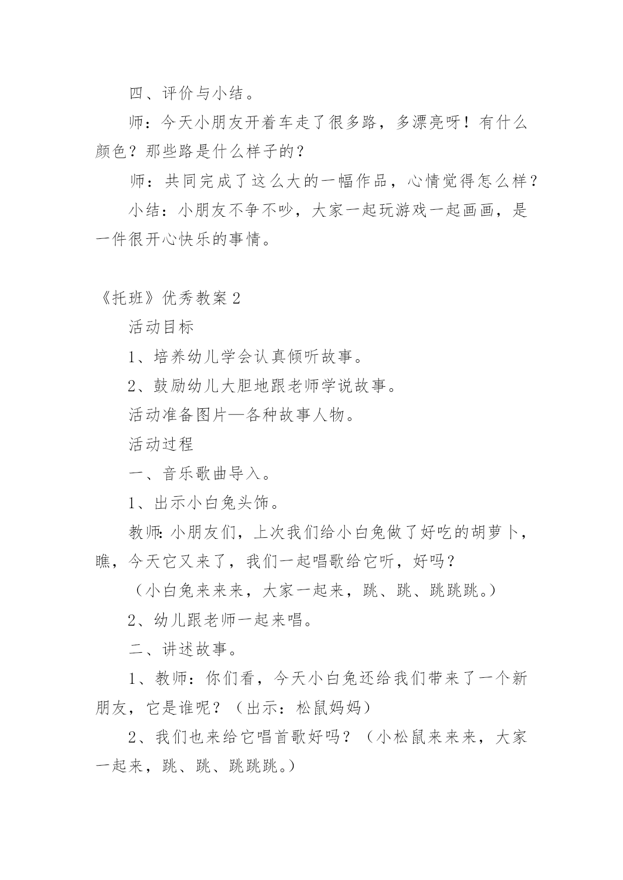 《托班》优秀教案 《托班》优秀教案作为一位杰出的老师,通常需要用到教案来辅助教学,编写教案有利于我们准确把握教材的重点与难点,进而选择恰当的教学方法。教案应该怎么写才好呢?下面是小编帮大家整理的《托班》优秀教案,欢迎大家分享。《托班》优秀教案1活动目标:一、通过有趣的歌词激发幼儿对歌唱的兴趣。二、幼儿投入情景表演,在欢乐的气氛下进行模仿律动,感受游戏的乐趣。三、遵守游戏规则。活动准备:一、老鼠头饰;小猫头饰、图片、房子;奶酪图片;“下水管道”。二、幼儿熟悉儿歌旋律、歌词。活动过程:一、律动:《小老鼠上灯台》二、吸气呼气练习三、复习歌曲《猫和老鼠》四、游戏:猫和老鼠1.交代游戏规则:(1)让幼儿自由发挥,说说老鼠的律动动作应该是怎样的(吃东西,走路等)。(2)特别强调老鼠走路的动作。(老师引导语:“为了不惊醒小猫,小老鼠们应该踮起脚尖来轻轻地走路。”)(3)跟幼儿交代如果有猫来的时候应该怎样做。(老师引导语:“小猫的爪子是很锋利的,而且小猫比我们要大很多很多,如果给小猫抓住,我们就别想吃美味的奶酪了,更别想回家见老鼠妈妈了,所以如果等一下见到小猫的话,你们记住要赶快跑到安全的地方,千万不要呆在小猫的家中,知道吗?”)2.游戏。3.重复游戏一次。4.加大难度:设障碍物(1)在走去小猫家的路上,加设一条“下水管道”,老鼠必须经过“下水管道”才能到达小猫的家。(老师引导语:“这次为了不让小猫发现,我们改走小猫家的下水管道,但由于那条路又湿又窄,一不小心就会掉到污水里,那污水又臭又脏,小老鼠会被淹死的,淹死就不能吃奶酪了。所以你们必须在管道的中间走,才不会掉到污水里。知道吗?”)(2)小老鼠边唱着歌边跟在老鼠妈妈后面走,经过下水管道,老鼠妈妈再提醒一次:“这里就是下水管道,你们一定要在中间走,不要掉到污水里啊!”5.游戏结束,幼儿出活动室。小小班美术教案:汽车嘀嘀设计思路:“路”对于孩子一点都不陌生,每天上幼儿园、回家、去玩都行走在马路上。穿越在城市大大小小的马路,在相互交错中,就如同许多许多长长、弯弯的线。因此,设计“汽车嘀嘀”的美术体验活动,让幼儿感受大家一起玩游戏一起画画,是一件很开心快乐的`事情。期望幼儿表现的行为:1、通过让幼儿“开汽车”的亲身实践活动,体验集体游戏的开心快乐,从而感受生活中的美。2、培养孩子大胆运用蜡笔作画的能力。3、学习用蜡笔画连贯、流畅的线条。重点:大胆运用线条表现开汽车的情景。难点:线条的连贯、流畅。活动准备:1、画画用具:长形大画纸红、黄、蓝色的蜡笔若干。2、欣赏画4幅,小草画1幅。3、纸箱小汽车一辆,地拖一把。活动过程:一、创设“开汽车”的游戏,让幼儿体验集体游戏的快乐,从而激发幼儿在纸上“开汽车”的兴趣。师:今天,我们来玩“开汽车”的游戏。我来做司机,请小朋友上车罗,开车罗,嘀嘀嘀,向前开,嘀嘀嘀,坐好了,要转弯了,到了麦当劳……师:玩开汽车的时候,心情觉得怎么样?大家一起玩游戏的时候多开心呀。二、引导幼儿如何表现汽车开过的路。1、观察刚才玩游戏汽车开过的路。提问:你发现了什么?像什么?2、分别出示小草和路的画,用对比的方法,启发幼儿对路的理解。提问:它和我们画过的小雨点是一样的吗?雨点的线条怎么样?路的线条是怎样的?3、教师示范,帮助幼儿解决难点。师:今天我们就用蜡笔当汽车,嘀嘀,车子向前开了,一会往这边转弯,来到了麦当劳,一会又往那边转弯,来到了公园,嘀嘀嘀,上立交桥了,绕个圈圈,开到很远很远地方。4、激发幼儿创作的兴趣,鼓励幼儿用喜欢的颜色蜡笔来当汽车。提问:你想开车去什么地方?去那里走过什么样的路?你可以上来画给大家看吗?5、交代作画要求。师:今天老师为小朋友准备了很大的纸,我们一起在纸上开汽车,桌子旁边有蜡笔,两个小朋友一起用一盒,大家不争不抢。三、幼儿创作,教师巡回指导。四、评价与小结。师:今天小朋友开着车走了很多路,多漂亮呀!有什么颜色?那些路是什么样子的?师:共同完成了这么大的一幅作品,心情觉得怎么样?小结:小朋友不争不吵,大家一起玩游戏一起画画,是一件很开心快乐的事情。《托班》优秀教案2活动目标1、培养幼儿学会认真倾听故事。2、鼓励幼儿大胆地跟老师学说故事。活动准备图片—各种故事人物。活动过程一、音乐歌曲导入。1、出示小白兔头饰。教师:小朋友们,上次我们给小白兔做了好吃的胡萝卜,瞧,今天它又来了,我们一起唱歌给它听,好吗?(小白兔来来来,大家一起来,跳、跳、跳跳跳。)2、幼儿跟老师一起来唱。二、讲述故事。1、教师:你们看,今天小白兔还给我们带来了一个新朋友,它是谁呢?(出示:松鼠妈妈)2、我们也来给它唱首歌好吗?(小松鼠来来来,大家一起来,跳、跳、跳跳跳。)3、今天,松鼠妈妈还带来了三个松鼠宝宝呢!她们今天要去看他们的奶奶,松鼠妈妈怕太阳晒着她们,给了她们每人一把伞。穿红裙子的