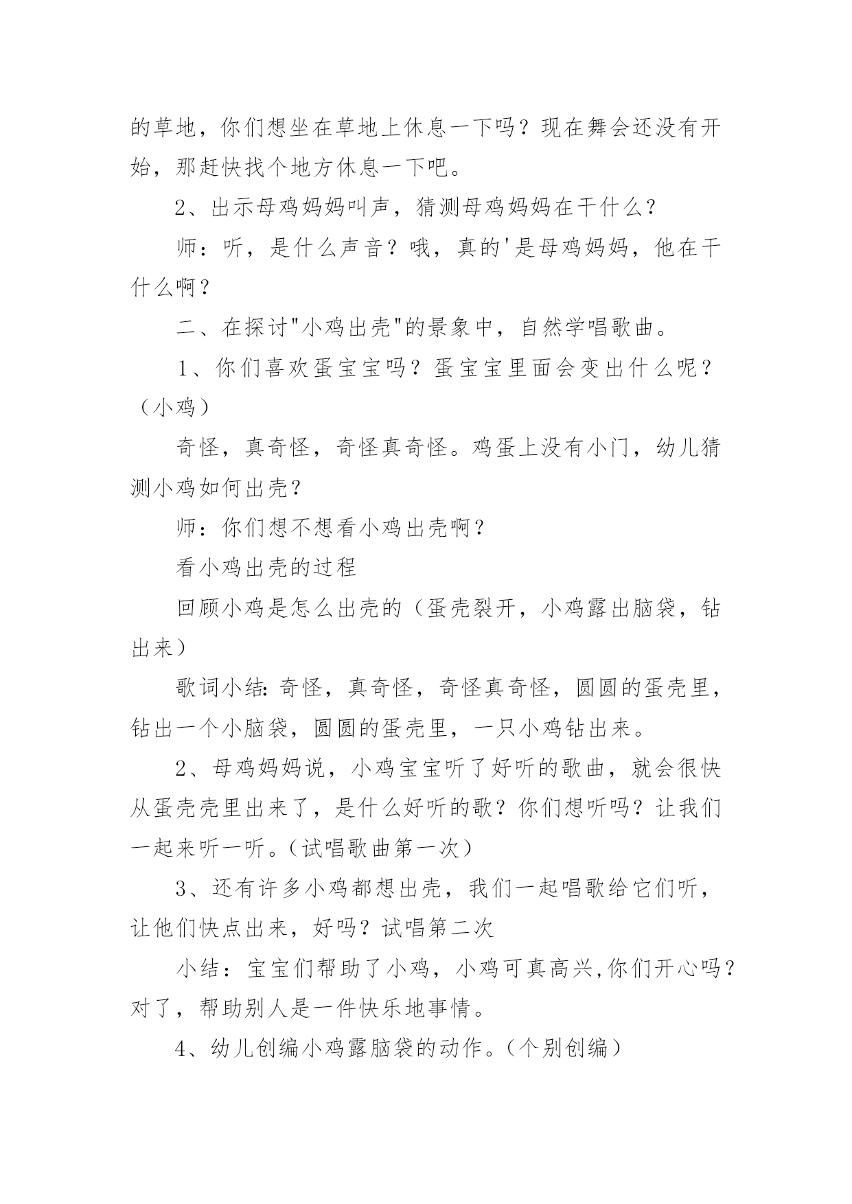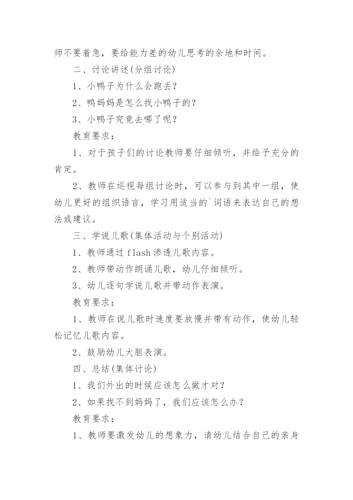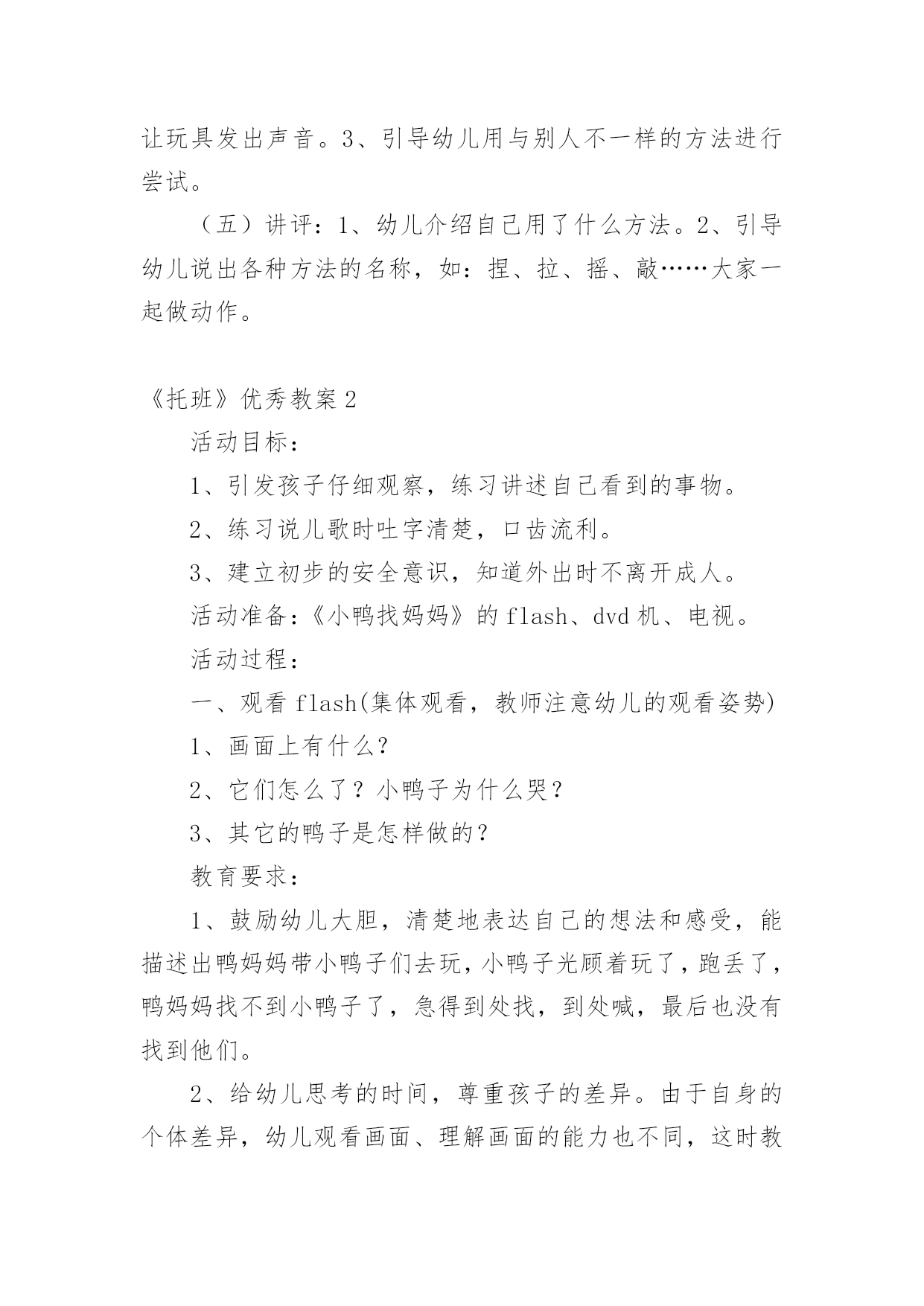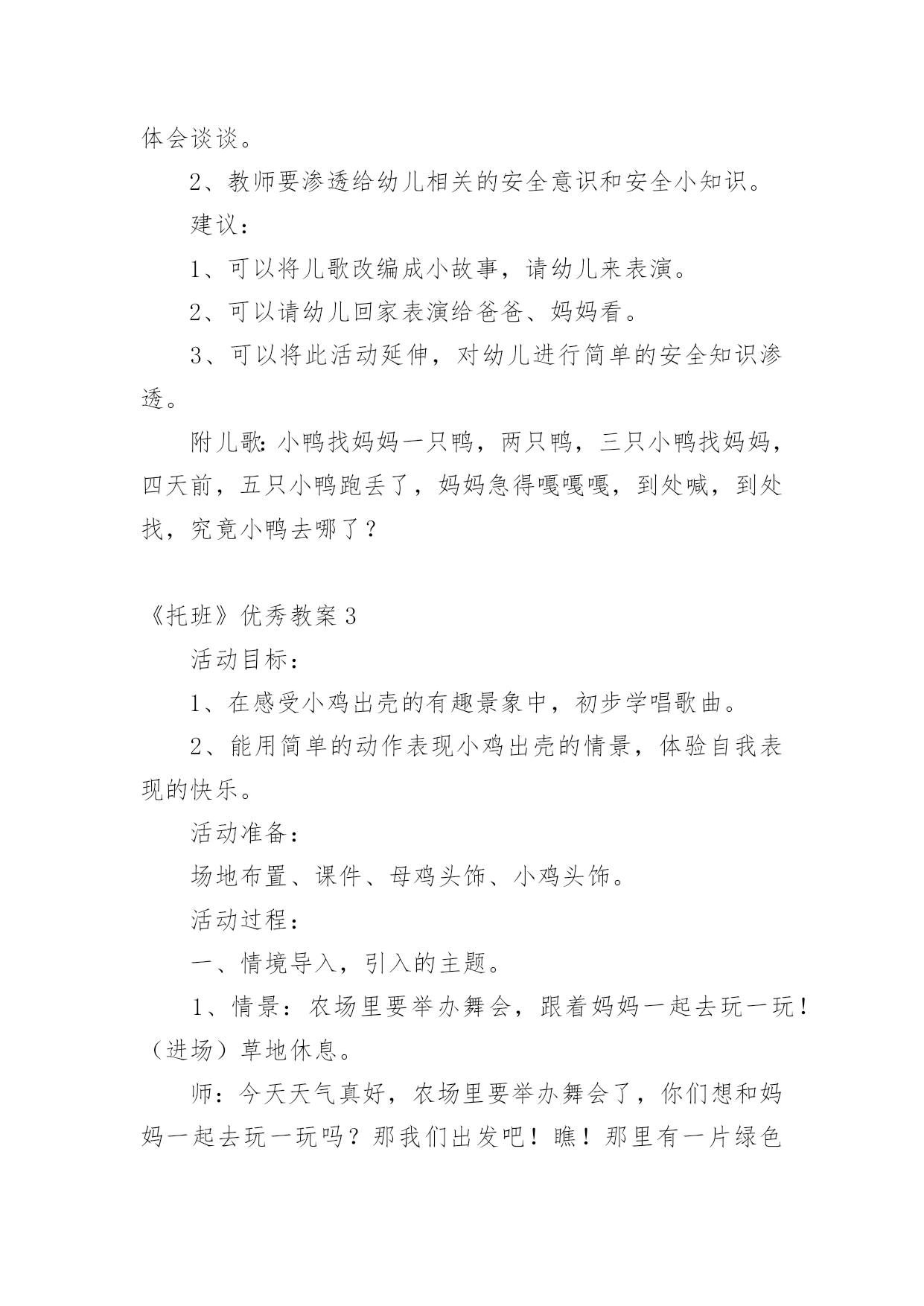 《托班》优秀教案 《托班》优秀教案作为一位无私奉献的人民教师,时常需要编写教案,编写教案有利于我们准确把握教材的重点与难点,进而选择恰当的教学方法。那么大家知道正规的教案是怎么写的吗?下面是小编整理的《托班》优秀教案,欢迎大家分享。《托班》优秀教案1教学目标:1、通过幼儿自主探索,了解玩具发声的各种方法。2、初步激发幼儿对探索活动的兴趣。教学准备:各种玩具教学过程:(一)启发提问,引起兴趣:通过游戏,引出声音的主题。(二)第一次探索:1、激发幼儿让玩具发出声音的愿望。2、幼儿探索电动玩具的发声方法。(三)交流讨论:1、幼儿介绍自己用了什么方法让玩具发出声音的`。2、引导幼儿说出“开关”,了解开关的作用。(四)第二次探索:1、启发提问,激发幼儿帮助其他的玩具发出声音。2、幼儿第二次探索,尝试用其他方法来让玩具发出声音。3、引导幼儿用与别人不一样的方法进行尝试。(五)讲评:1、幼儿介绍自己用了什么方法。2、引导幼儿说出各种方法的名称,如:捏、拉、摇、敲……大家一起做动作。《托班》优秀教案2活动目标:1、引发孩子仔细观察,练习讲述自己看到的事物。2、练习说儿歌时吐字清楚,口齿流利。3、建立初步的安全意识,知道外出时不离开成人。活动准备:《小鸭找妈妈》的flash、dvd机、电视。活动过程:一、观看flash(集体观看,教师注意幼儿的观看姿势)1、画面上有什么?2、它们怎么了?小鸭子为什么哭?3、其它的鸭子是怎样做的?教育要求:1、鼓励幼儿大胆,清楚地表达自己的想法和感受,能描述出鸭妈妈带小鸭子们去玩,小鸭子光顾着玩了,跑丢了,鸭妈妈找不到小鸭子了,急得到处找,到处喊,最后也没有找到他们。2、给幼儿思考的时间,尊重孩子的差异。由于自身的个体差异,幼儿观看画面、理解画面的能力也不同,这时教师不要着急,要给能力差的幼儿思考的余地和时间。二、讨论讲述(分组讨论)1、小鸭子为什么会跑丢?2、鸭妈妈是怎么找小鸭子的?3、小鸭子究竟去哪了呢?教育要求:1、对于孩子们的讨论教师要仔细倾听,并给予充分的肯定。2、教师在巡视每组讨论时,可以参与到其中一组,使幼儿更好的组织语言,学习用适当的`词语来表达自己的想法或建议。三、学说儿歌(集体活动与个别活动)1、教师通过flash渗透儿歌内容。2、教师带动作朗诵儿歌,幼儿仔细倾听。3、幼儿逐句学说儿歌并带动作表演。教育要求:1、教师在说儿歌时速度要放慢并带有动作,使幼儿轻松记忆儿歌内容。2、鼓励幼儿大胆表演。四、总结(集体讨论)1、我们外出的时候应该怎么做才对?2、如果找不到妈妈了,我们应该怎么办?教育要求:1、教师要激发幼儿的想象力,请幼儿结合自己的亲身体会谈谈。2、教师要渗透给幼儿相关的安全意识和安全小知识。建议:1、可以将儿歌改编成小故事,请幼儿来表演。2、可以请幼儿回家表演给爸爸、妈妈看。3、可以将此活动延伸,对幼儿进行简单的安全知识渗透。附儿歌:小鸭找妈妈一只鸭,两只鸭,三只小鸭找妈妈,四天前,五只小鸭跑丢了,妈妈急得嘎嘎嘎,到处喊,到处找,究竟小鸭去哪了?《托班》优秀教案3活动目标:1、在感受小鸡出壳的有趣景象中,初步学唱歌曲。2、能用简单的动作表现小鸡出壳的情景,体验自我表现的快乐。活动准备:场地布置、课件、母鸡头饰、小鸡头饰。活动过程:一、情境导入,引入的主题。1、情景:农场里要举办舞会,跟着妈妈一起去玩一玩!(进场)草地休息。师:今天天气真好,农场里要举办舞会了,你们想和妈妈一起去玩一玩吗?那我们出发吧!瞧!那里有一片绿色的草地,你们想坐在草地上休息一下吗?现在舞会还没有开始,那赶快找个地方休息一下吧。2、出示母鸡妈妈叫声,猜测母鸡妈妈在干什么?师:听,是什么声音?哦,真的'是母鸡妈妈,他在干什么啊?二、在探讨"小鸡出壳"的景象中,自然学唱歌曲。1、你们喜欢蛋宝宝吗?蛋宝宝里面会变出什么呢?(小鸡)奇怪,真奇怪,奇怪真奇怪。鸡蛋上没有小门,幼儿猜测小鸡如何出壳?师:你们想不想看小鸡出壳啊?看小鸡出壳的过程回顾小鸡是怎么出壳的(蛋壳裂开,小鸡露出脑袋,钻出来)歌词小结:奇怪,真奇怪,奇怪真奇怪,圆圆的蛋壳里,钻出一个小脑袋,圆圆的蛋壳里,一只小鸡钻出来。2、母鸡妈妈说,小鸡宝宝听了好听的歌曲,就会很快从蛋壳壳里出来了,是什么好听的歌?你们想听吗?让我们一起来听一听。(试唱歌曲第一次)3、还有许多小鸡都想出壳,我们一起唱歌给它们听,让他们快点出来,好吗?试唱第二次小结:宝宝们帮助了小鸡,小鸡可真高兴,你们开心吗?对了,帮助别人是一件快乐地事情。4、幼儿创编小鸡露脑袋的动作。(个别创编)师:刚才妈妈觉得小鸡露脑袋的动作真可爱,我们也一起来试一试吧!我们一起来做做看。(集体创想钻出小脑袋的动作)带动作,完整歌曲表演。师:刚才宝宝做的真好,我们也一起来做小鸡出壳的动作吧!三、听音乐,用简单的身体动作