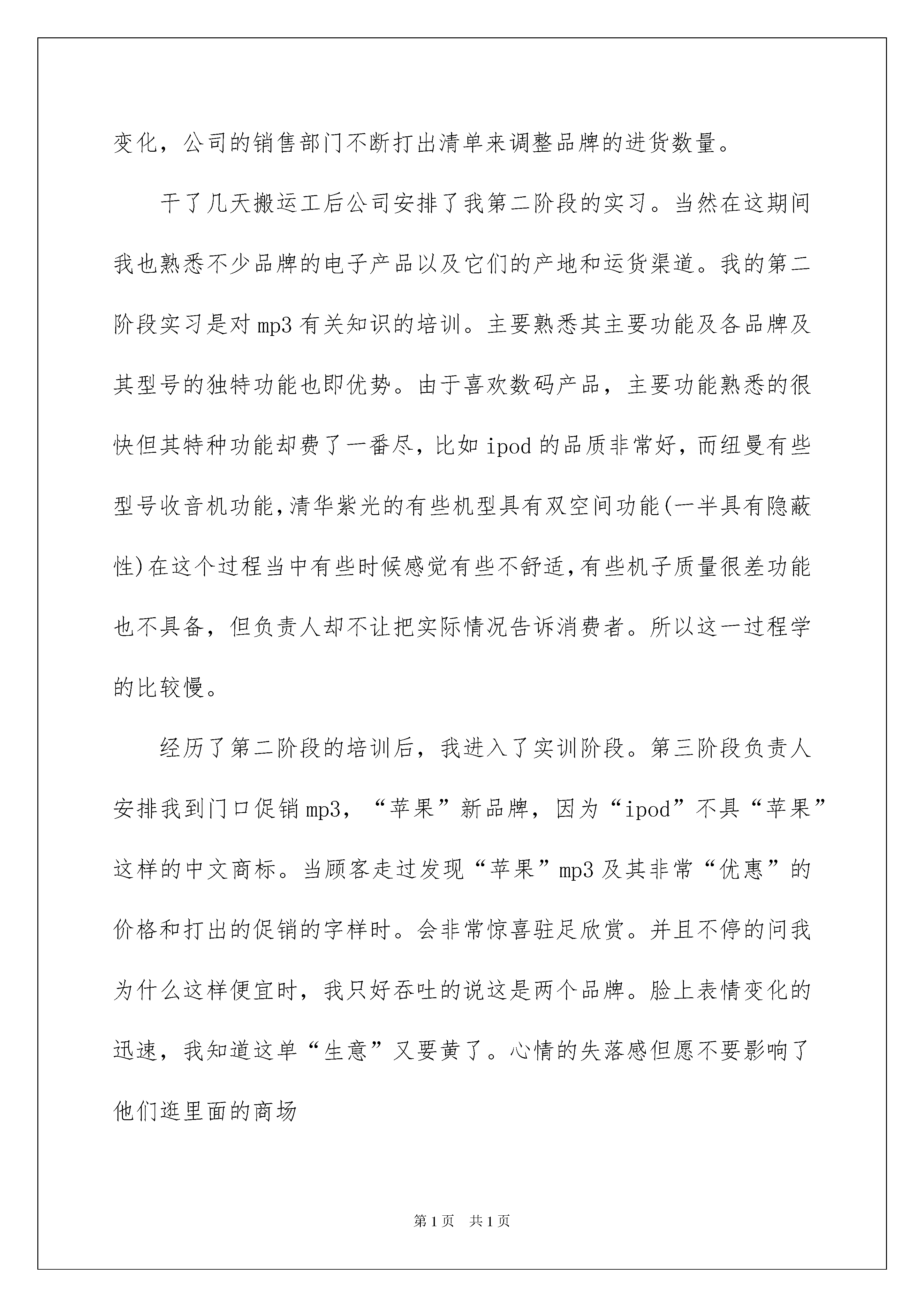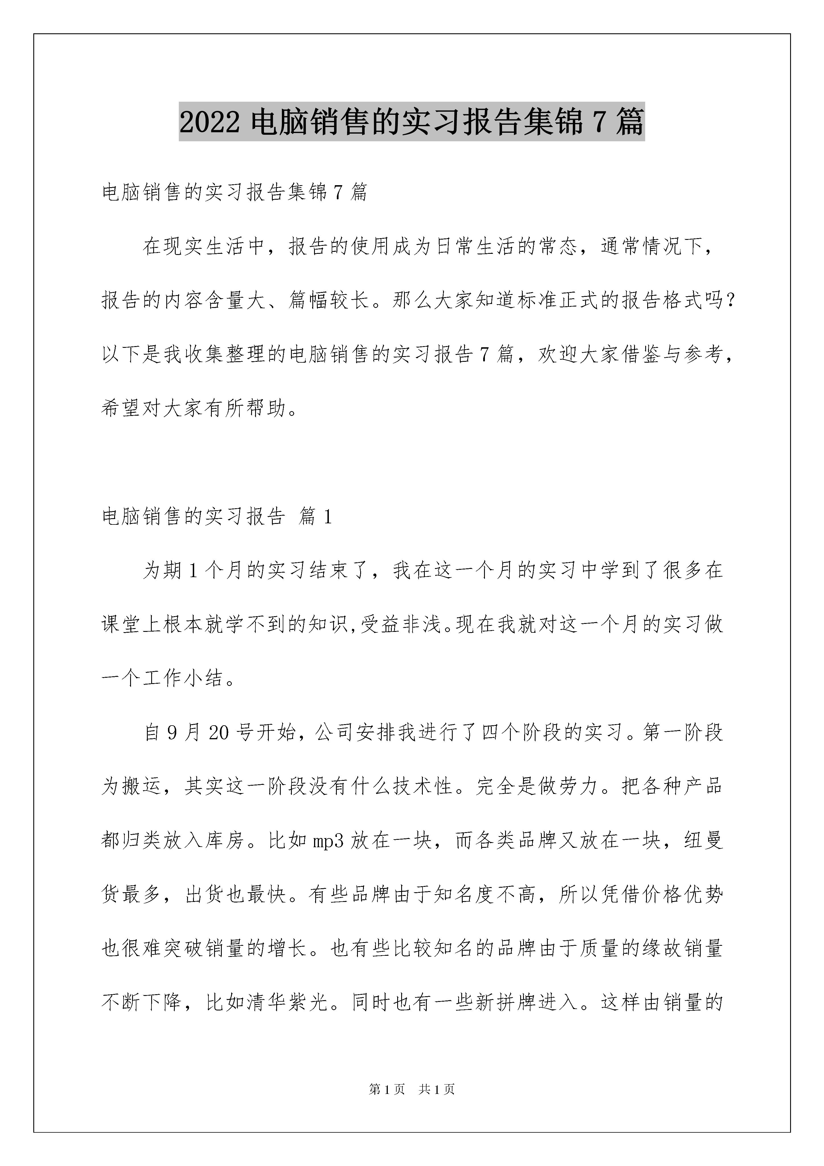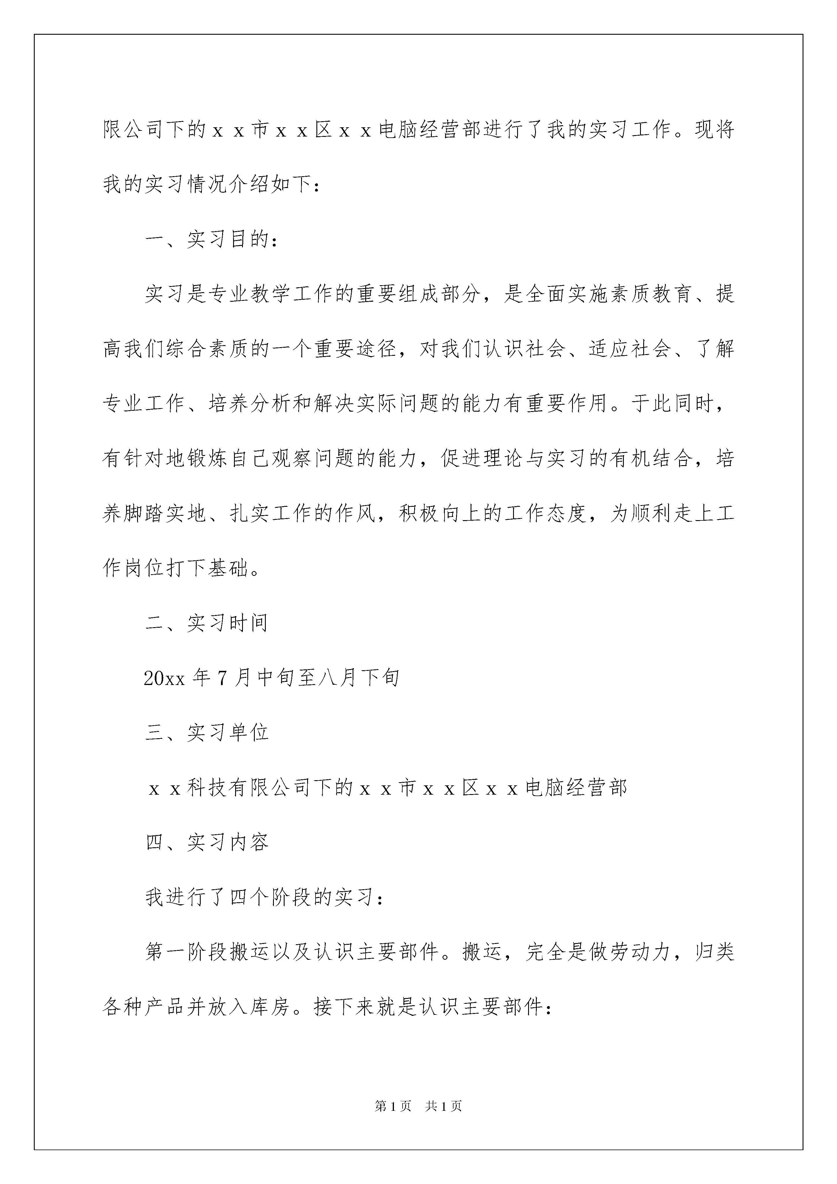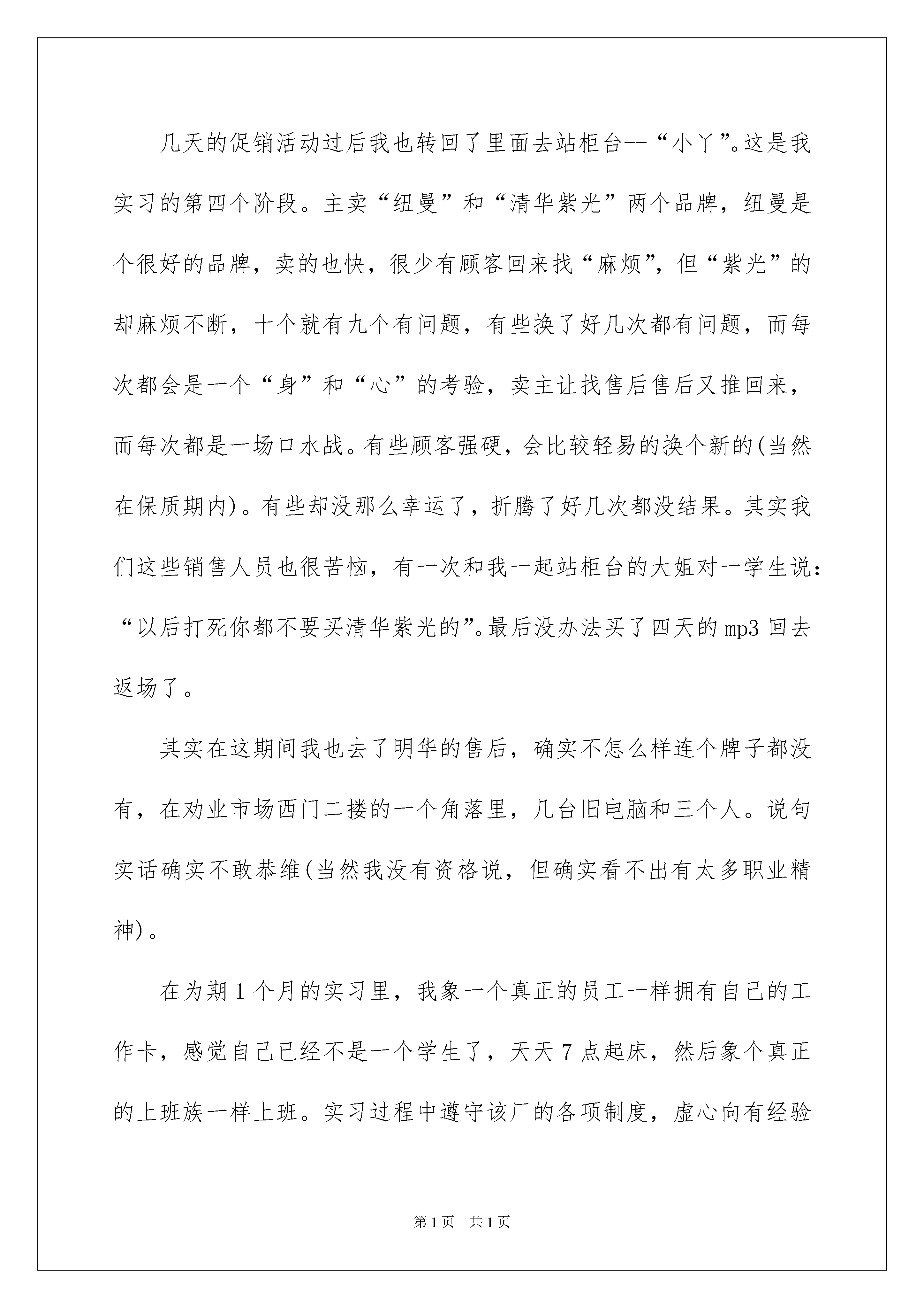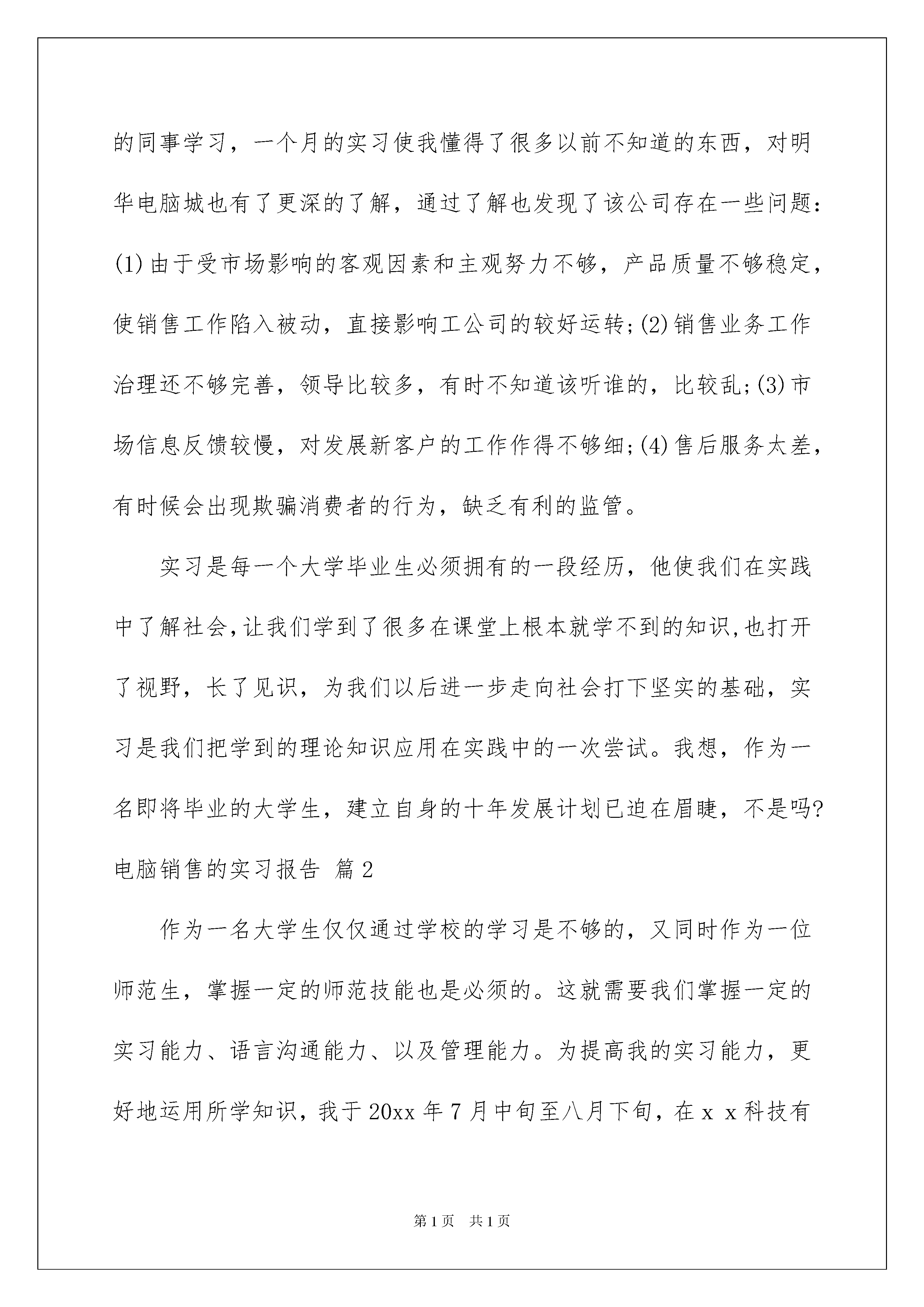 2022电脑销售的实习报告集锦7篇电脑销售的实习报告集锦7篇在现实生活中,报告的使用成为日常生活的常态,通常情况下,报告的内容含量大、篇幅较长。那么大家知道标准正式的报告格式吗?以下是我收集整理的电脑销售的实习报告7篇,欢迎大家借鉴与参考,希望对大家有所帮助。电脑销售的实习报告篇1为期1个月的实习结束了,我在这一个月的实习中学到了很多在课堂上根本就学不到的知识,受益非浅。现在我就对这一个月的实习做一个工作小结。自9月20号开始,公司安排我进行了四个阶段的实习。第一阶段为搬运,其实这一阶段没有什么技术性。完全是做劳力。把各种产品都归类放入库房。比如mp3放在一块,而各类品牌又放在一块,纽曼货最多,出货也最快。有些品牌由于知名度不高,所以凭借价格优势也很难突破销量的增长。也有些比较知名的品牌由于质量的缘故销量不断下降,比如清华紫光。同时也有一些新拼牌进入。这样由销量的变化,公司的销售部门不断打出清单来调整品牌的进货数量。干了几天搬运工后公司安排了我第二阶段的实习。当然在这期间我也熟悉不少品牌的电子产品以及它们的产地和运货渠道。我的第二阶段实习是对mp3有关知识的培训。主要熟悉其主要功能及各品牌及其型号的独特功能也即优势。由于喜欢数码产品,主要功能熟悉的很快但其特种功能却费了一番尽,比如ipod的品质非常好,而纽曼有些型号收音机功能,清华紫光的有些机型具有双空间功能(一半具有隐蔽性)在这个过程当中有些时候感觉有些不舒适,有些机子质量很差功能也不具备,但负责人却不让把实际情况告诉消费者。所以这一过程学的比较慢。经历了第二阶段的培训后,我进入了实训阶段。第三阶段负责人安排我到门口促销mp3,“苹果”新品牌,因为“ipod”不具“苹果”这样的中文商标。当顾客走过发现“苹果”mp3及其非常“优惠”的价格和打出的促销的字样时。会非常惊喜驻足欣赏。并且不停的问我为什么这样便宜时,我只好吞吐的说这是两个品牌。脸上表情变化的迅速,我知道这单“生意”又要黄了。心情的失落感但愿不要影响了他们逛里面的商场几天的促销活动过后我也转回了里面去站柜台--“小丫”。这是我实习的第四个阶段。主卖“纽曼”和“清华紫光”两个品牌,纽曼是个很好的品牌,卖的也快,很少有顾客回来找“麻烦”,但“紫光”的却麻烦不断,十个就有九个有问题,有些换了好几次都有问题,而每次都会是一个“身”和“心”的考验,卖主让找售后售后又推回来,而每次都是一场口水战。有些顾客强硬,会比较轻易的换个新的(当然在保质期内)。有些却没那么幸运了,折腾了好几次都没结果。其实我们这些销售人员也很苦恼,有一次和我一起站柜台的大姐对一学生说:“以后打死你都不要买清华紫光的”。最后没办法买了四天的mp3回去返场了。其实在这期间我也去了明华的售后,确实不怎么样连个牌子都没有,在劝业市场西门二搂的一个角落里,几台旧电脑和三个人。说句实话确实不敢恭维(当然我没有资格说,但确实看不出有太多职业精神)。在为期1个月的实习里,我象一个真正的员工一样拥有自己的工作卡,感觉自己已经不是一个学生了,天天7点起床,然后象个真正的上班族一样上班。实习过程中遵守该厂的各项制度,虚心向有经验的同事学习,一个月的实习使我懂得了很多以前不知道的东西,对明华电脑城也有了更深的了解,通过了解也发现了该公司存在一些问题:(1)由于受市场影响的客观因素和主观努力不够,产品质量不够稳定,使销售工作陷入被动,直接影响工公司的较好运转;(2)销售业务工作治理还不够完善,领导比较多,有时不知道该听谁的,比较乱;(3)市场信息反馈较慢,对发展新客户的工作作得不够细;(4)售后服务太差,有时候会出现欺骗消费者的行为,缺乏有利的监管。实习是每一个大学毕业生必须拥有的一段经历,他使我们在实践中了解社会,让我们学到了很多在课堂上根本就学不到的知识,也打开了视野,长了见识,为我们以后进一步走向社会打下坚实的基础,实习是我们把学到的理论知识应用在实践中的一次尝试。我想,作为一名即将毕业的大学生,建立自身的十年发展计划已迫在眉睫,不是吗?电脑销售的实习报告篇2作为一名大学生仅仅通过学校的学习是不够的,又同时作为一位师范生,掌握一定的师范技能也是必须的。这就需要我们掌握一定的实习能力、语言沟通能力、以及管理能力。为提高我的实习能力,更好地运用所学知识,我于20xx年7月中旬至八月下旬,在xx科技有限公司下的xx市xx区xx电脑经营部进行了我的实习工作。现将我的实习情况介绍如下:一、实习目的:实习是专业教学工作的重要组成部分,是全面实施素质教育、提高我们综合素质的一个重要途径,对我们认识社会、适应社会、了解专业工作、培养分析
