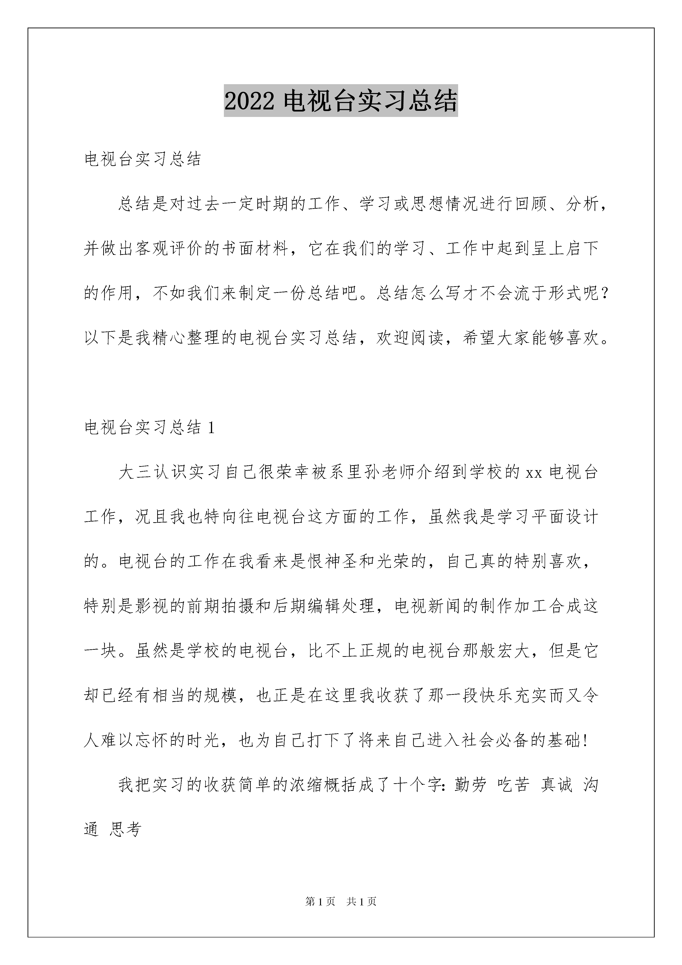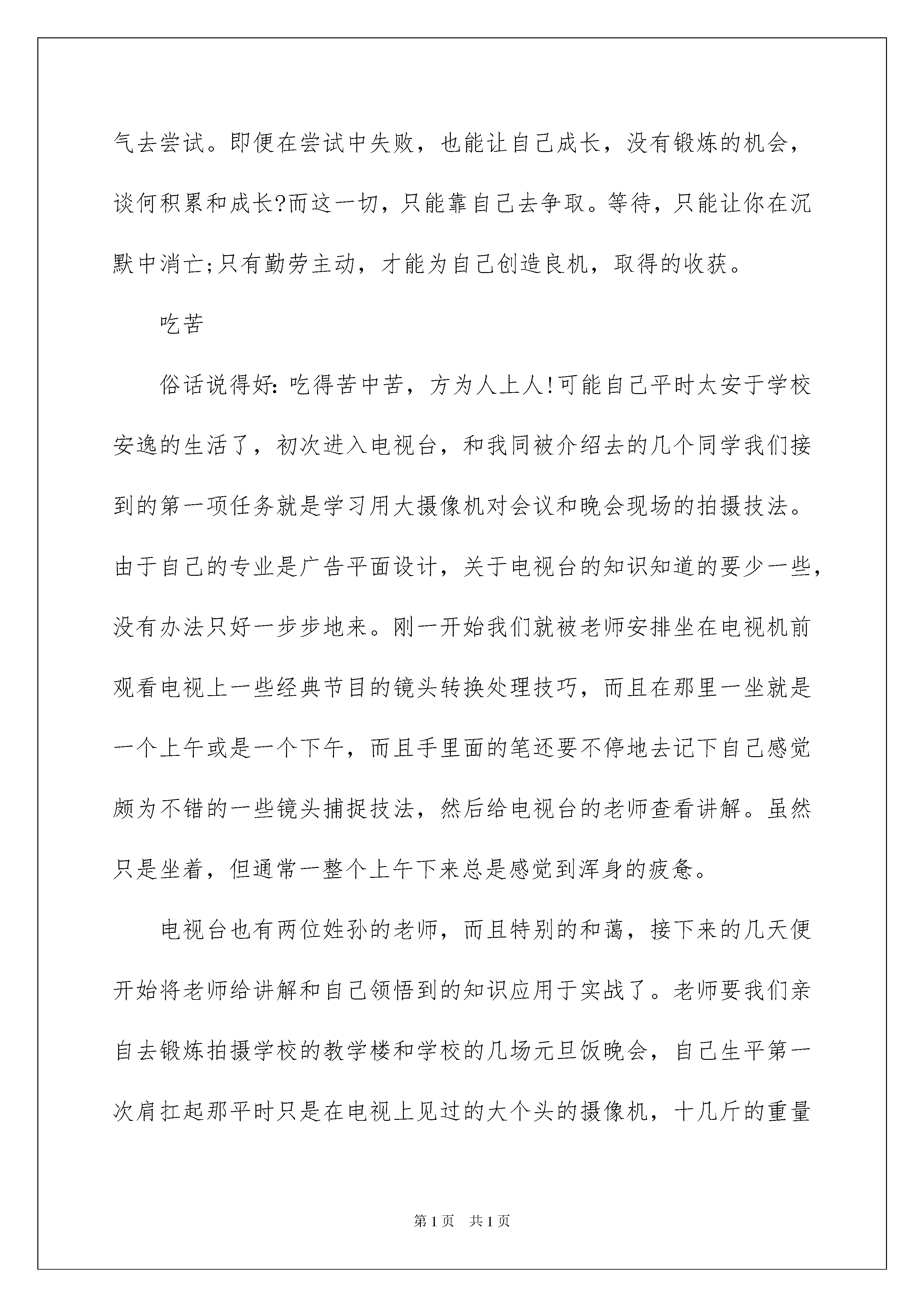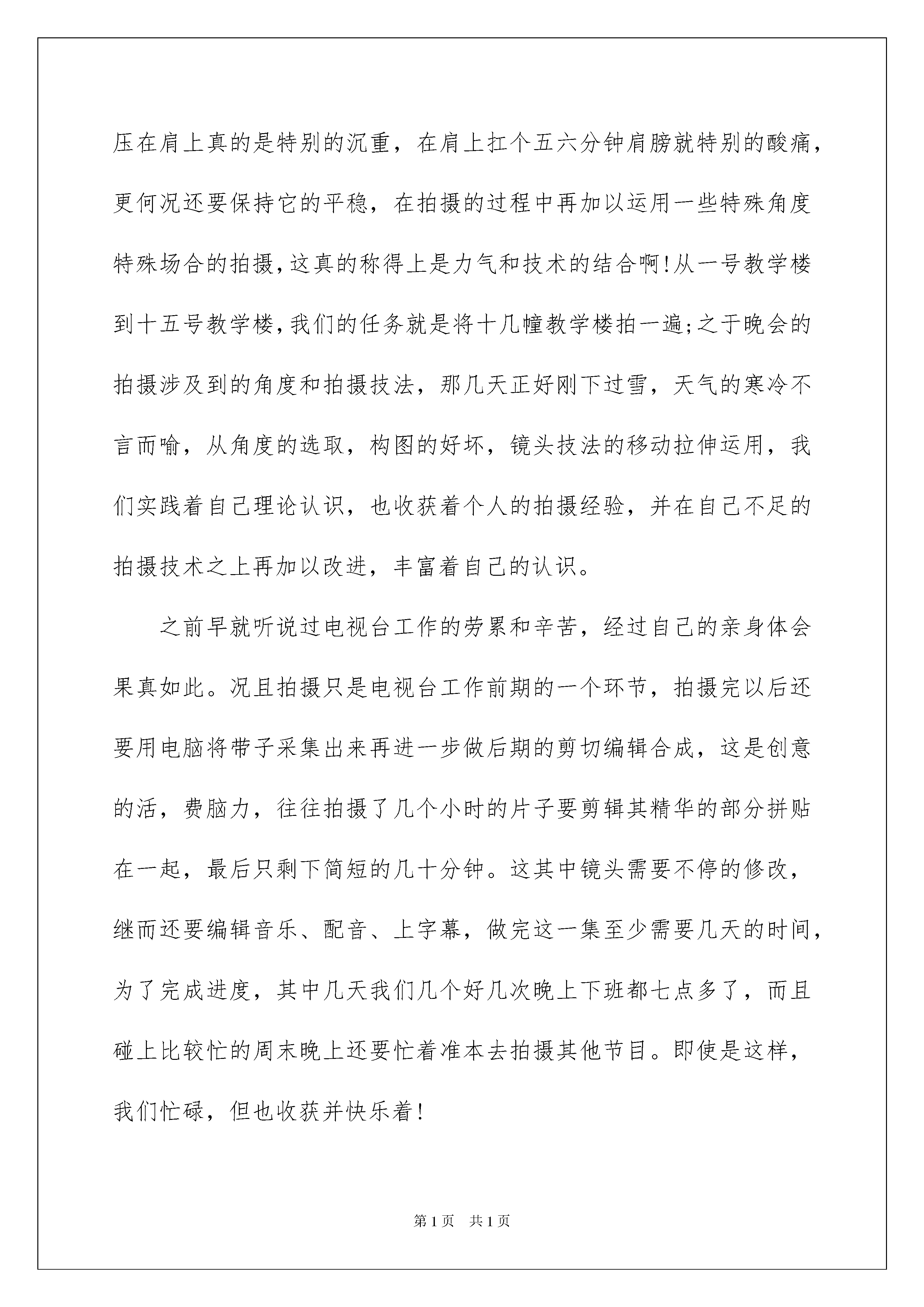 2022电视台实习总结电视台实习总结总结是对过去一定时期的工作、学习或思想情况进行回顾、分析,并做出客观评价的书面材料,它在我们的学习、工作中起到呈上启下的作用,不如我们来制定一份总结吧。总结怎么写才不会流于形式呢?以下是我精心整理的电视台实习总结,欢迎阅读,希望大家能够喜欢。电视台实习总结1大三认识实习自己很荣幸被系里孙老师介绍到学校的xx电视台工作,况且我也特向往电视台这方面的工作,虽然我是学习平面设计的。电视台的工作在我看来是恨神圣和光荣的,自己真的特别喜欢,特别是影视的前期拍摄和后期编辑处理,电视新闻的制作加工合成这一块。虽然是学校的电视台,比不上正规的电视台那般宏大,但是它却已经有相当的规模,也正是在这里我收获了那一段快乐充实而又令人难以忘怀的时光,也为自己打下了将来自己进入社会必备的基础!我把实习的收获简单的浓缩概括成了十个字:勤劳吃苦真诚沟通思考勤劳勤劳带给我们欢乐,勤劳给予我们收获。在电视台工作的日子里,我早上每天准时八点到达,然后就是将电视台的卫生打扫一遍,扫地拖地。有时还要检查一下水壶里面的水还够不够,提前为老师烧上水,我的辛勤劳动得到了老师的一致好评。虽然只是零散的杂活但是透过它却可以读懂一个人的勤劳与执着。勤劳让我取得了老师的信任和认可,份内的工作当然要认真完成,但勇敢的“主动请缨”却能为我赢得的机会。在做完老师布置的任务后我总会鼓起勇气向老师再申请一些任务,有时候自己工作的效率连老师都感到惊讶,老师自然地也愿意把的任务交给我,而且在工作上的勤问、勤学、勤做,让我有了意想不到的收获。几位老师特别健谈,每每和她聊天她总会给我们讲一大堆不为我们平时所获知的东西,其中我了解到了新闻媒体的广泛应用以及它的快速发展,当今是一个信息化的社会,美国全部的财富中现在有八成是信息所创造的,信息的传播制作在其中显得尤为重要,这一切使我知道自己所要学习的还有很多。虽然开始也会有顾忌,怕“主动出击”申请新的工作会招惹“不知天高地厚”的蔑视。但事实告诉我,应该对自己有信心,应该有勇气去尝试。即便在尝试中失败,也能让自己成长,没有锻炼的机会,谈何积累和成长?而这一切,只能靠自己去争取。等待,只能让你在沉默中消亡;只有勤劳主动,才能为自己创造良机,取得的收获。吃苦俗话说得好:吃得苦中苦,方为人上人!可能自己平时太安于学校安逸的生活了,初次进入电视台,和我同被介绍去的几个同学我们接到的第一项任务就是学习用大摄像机对会议和晚会现场的拍摄技法。由于自己的专业是广告平面设计,关于电视台的知识知道的要少一些,没有办法只好一步步地来。刚一开始我们就被老师安排坐在电视机前观看电视上一些经典节目的镜头转换处理技巧,而且在那里一坐就是一个上午或是一个下午,而且手里面的笔还要不停地去记下自己感觉颇为不错的一些镜头捕捉技法,然后给电视台的老师查看讲解。虽然只是坐着,但通常一整个上午下来总是感觉到浑身的疲惫。电视台也有两位姓孙的老师,而且特别的和蔼,接下来的几天便开始将老师给讲解和自己领悟到的知识应用于实战了。老师要我们亲自去锻炼拍摄学校的教学楼和学校的几场元旦饭晚会,自己生平第一次肩扛起那平时只是在电视上见过的大个头的摄像机,十几斤的重量压在肩上真的是特别的沉重,在肩上扛个五六分钟肩膀就特别的酸痛,更何况还要保持它的平稳,在拍摄的过程中再加以运用一些特殊角度特殊场合的拍摄,这真的称得上是力气和技术的结合啊!从一号教学楼到十五号教学楼,我们的任务就是将十几幢教学楼拍一遍;之于晚会的拍摄涉及到的角度和拍摄技法,那几天正好刚下过雪,天气的寒冷不言而喻,从角度的选取,构图的好坏,镜头技法的移动拉伸运用,我们实践着自己理论认识,也收获着个人的拍摄经验,并在自己不足的拍摄技术之上再加以改进,丰富着自己的认识。之前早就听说过电视台工作的劳累和辛苦,经过自己的亲身体会果真如此。况且拍摄只是电视台工作前期的一个环节,拍摄完以后还要用电脑将带子采集出来再进一步做后期的剪切编辑合成,这是创意的活,费脑力,往往拍摄了几个小时的片子要剪辑其精华的部分拼贴在一起,最后只剩下简短的几十分钟。这其中镜头需要不停的修改,继而还要编辑音乐、配音、上字幕,做完这一集至少需要几天的时间,为了完成进度,其中几天我们几个好几次晚上下班都七点多了,而且碰上比较忙的周末晚上还要忙着准本去拍摄其他节目。即使是这样,我们忙碌,但也收获并快乐着!真诚人有时可以伪装自己的面目自己的心,但是真诚的力量是绝对不容忽视的。在进入新闻部的第一天我就开始细心地记下了三个老师的名字,每每上下班时候,总会喊上一句:老师早上好老师再见!在学校电视台还有教育技术学的几个大