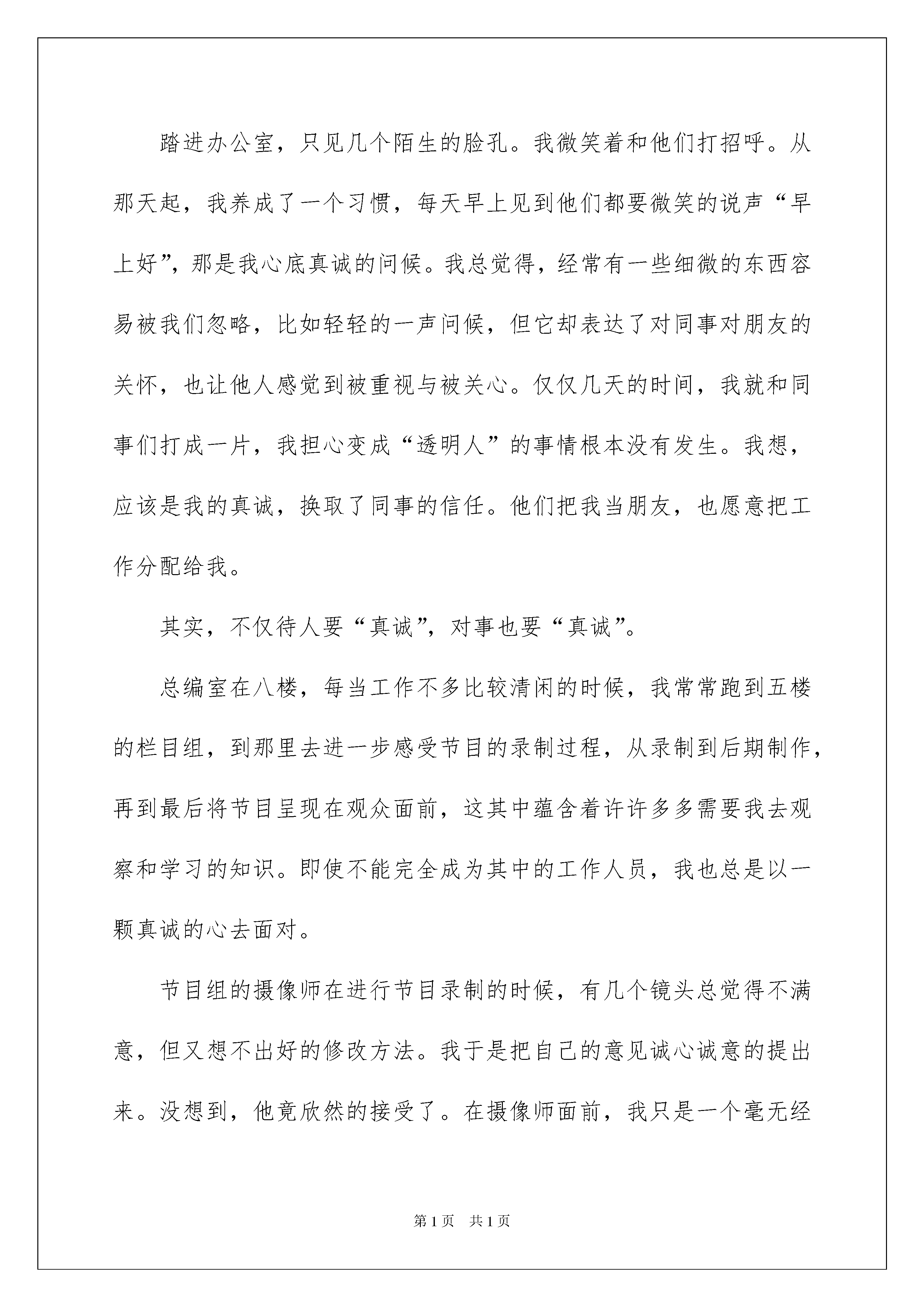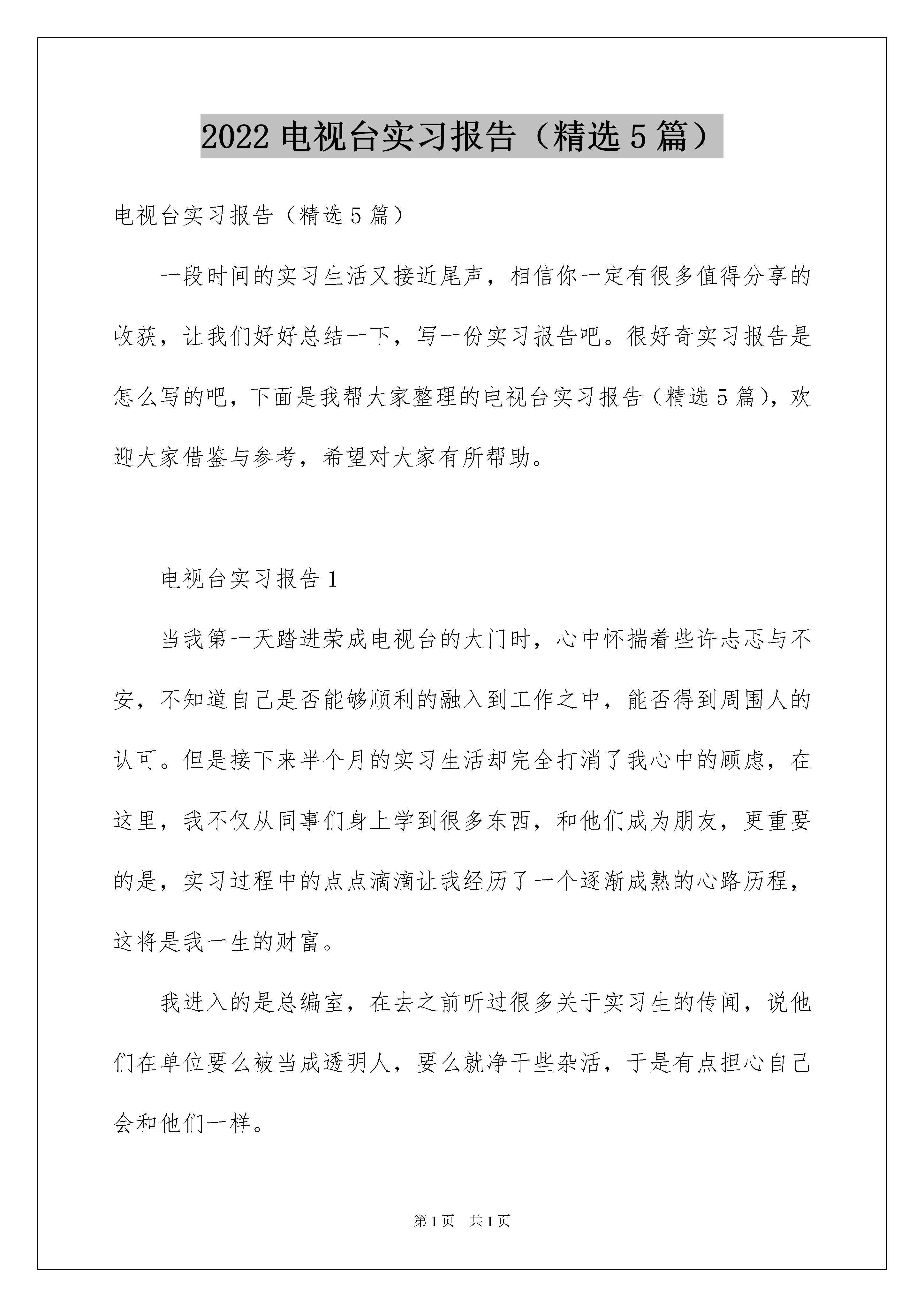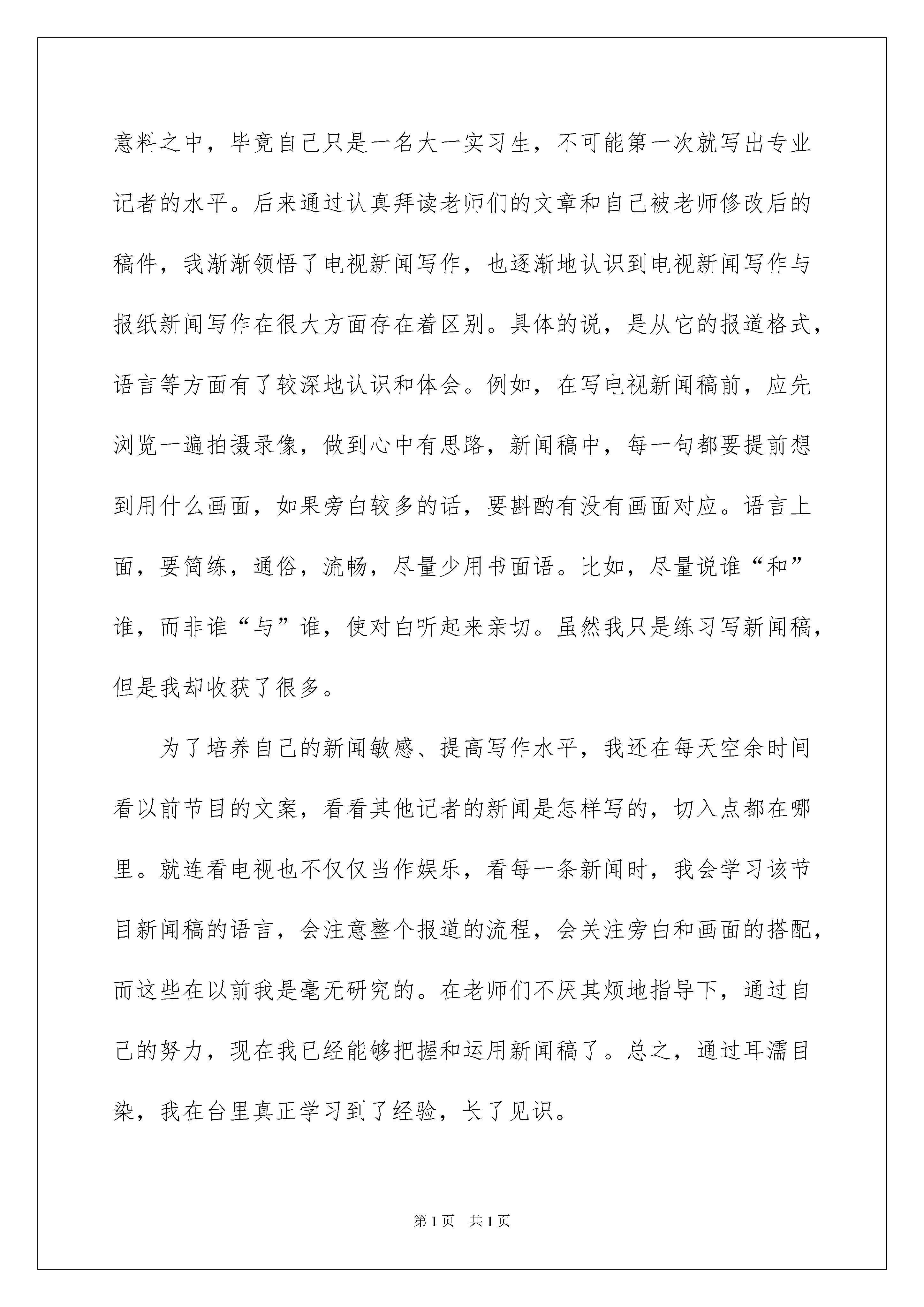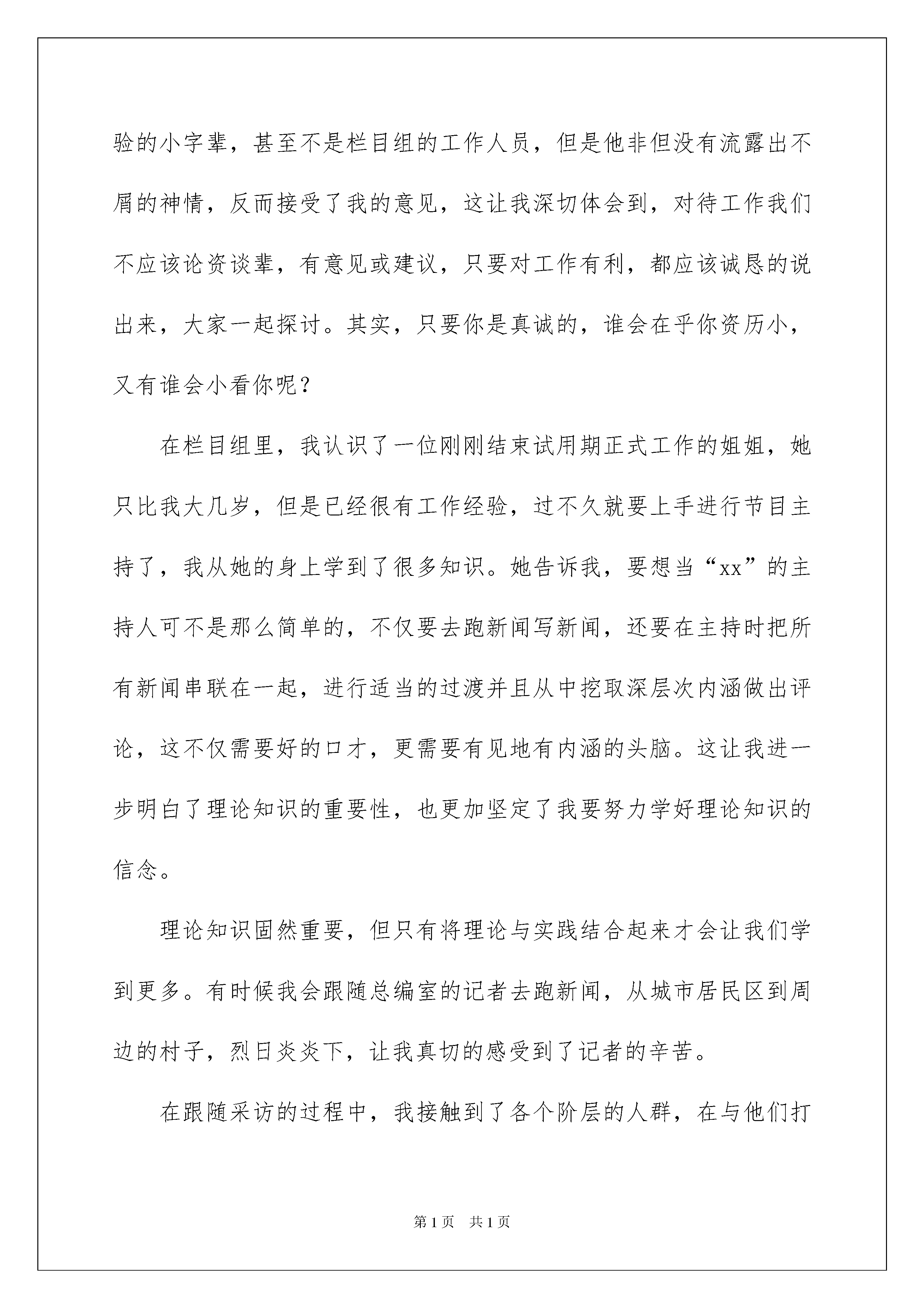 2022电视台实习报告(精选5篇)电视台实习报告(精选5篇)一段时间的实习生活又接近尾声,相信你一定有很多值得分享的收获,让我们好好总结一下,写一份实习报告吧。很好奇实习报告是怎么写的吧,下面是我帮大家整理的电视台实习报告(精选5篇),欢迎大家借鉴与参考,希望对大家有所帮助。电视台实习报告1当我第一天踏进荣成电视台的大门时,心中怀揣着些许忐忑与不安,不知道自己是否能够顺利的融入到工作之中,能否得到周围人的认可。但是接下来半个月的实习生活却完全打消了我心中的顾虑,在这里,我不仅从同事们身上学到很多东西,和他们成为朋友,更重要的是,实习过程中的点点滴滴让我经历了一个逐渐成熟的心路历程,这将是我一生的财富。我进入的是总编室,在去之前听过很多关于实习生的传闻,说他们在单位要么被当成透明人,要么就净干些杂活,于是有点担心自己会和他们一样。踏进办公室,只见几个陌生的脸孔。我微笑着和他们打招呼。从那天起,我养成了一个习惯,每天早上见到他们都要微笑的说声“早上好”,那是我心底真诚的问候。我总觉得,经常有一些细微的东西容易被我们忽略,比如轻轻的一声问候,但它却表达了对同事对朋友的关怀,也让他人感觉到被重视与被关心。仅仅几天的时间,我就和同事们打成一片,我担心变成“透明人”的事情根本没有发生。我想,应该是我的真诚,换取了同事的信任。他们把我当朋友,也愿意把工作分配给我。其实,不仅待人要“真诚”,对事也要“真诚”。总编室在八楼,每当工作不多比较清闲的时候,我常常跑到五楼的栏目组,到那里去进一步感受节目的录制过程,从录制到后期制作,再到最后将节目呈现在观众面前,这其中蕴含着许许多多需要我去观察和学习的知识。即使不能完全成为其中的工作人员,我也总是以一颗真诚的心去面对。节目组的摄像师在进行节目录制的时候,有几个镜头总觉得不满意,但又想不出好的修改方法。我于是把自己的意见诚心诚意的提出来。没想到,他竟欣然的接受了。在摄像师面前,我只是一个毫无经验的小字辈,甚至不是栏目组的工作人员,但是他非但没有流露出不屑的神情,反而接受了我的意见,这让我深切体会到,对待工作我们不应该论资谈辈,有意见或建议,只要对工作有利,都应该诚恳的说出来,大家一起探讨。其实,只要你是真诚的,谁会在乎你资历小,又有谁会小看你呢?在栏目组里,我认识了一位刚刚结束试用期正式工作的姐姐,她只比我大几岁,但是已经很有工作经验,过不久就要上手进行节目主持了,我从她的身上学到了很多知识。她告诉我,要想当“xx”的主持人可不是那么简单的,不仅要去跑新闻写新闻,还要在主持时把所有新闻串联在一起,进行适当的过渡并且从中挖取深层次内涵做出评论,这不仅需要好的口才,更需要有见地有内涵的头脑。这让我进一步明白了理论知识的重要性,也更加坚定了我要努力学好理论知识的信念。理论知识固然重要,但只有将理论与实践结合起来才会让我们学到更多。有时候我会跟随总编室的记者去跑新闻,从城市居民区到周边的村子,烈日炎炎下,让我真切的感受到了记者的辛苦。在跟随采访的过程中,我接触到了各个阶层的人群,在与他们打交道的同时,自己也学到了以前所没有学到过的东西,那就是交流,沟通。这两个词看似简单,而且人人都会,重要的是如何交流如何沟通。作为记者,要善于把新闻事件背后的故事挖掘出来,要让被采访对象能够信任你,把积压在心里的话向你倾诉,这样才能使一条新闻能够丰满起来,而不至于只是个骨架没有内容。除了要善于交流沟通外,还要对别人真诚,只要你拿出真诚对待他人,尊重别人,别人也会谅解你,配合你。在一次采访中,采访对象是一位80多岁的老人,由于老人的耳朵不灵活,很难听见我们在说些什么,甚至出现文不对题的情况,但是我们并没有放弃,而是慢慢的将问题说给老人听,努力配合着老人,最终顺利完成了此次采访任务。我想,要成为一名优秀的记者,不仅要有好的口才和清晰地思路,更要有充足的耐心,任何新闻都不是从天上掉下来的,任何采访也都不会是一帆风顺的,这时就需要我们拥有一颗不焦躁的心,不能急功近利,只有这样,才会更容易和人们沟通,做出最好的新闻。写作是采访的表现和结果,实习期间,我锻炼了我的新闻写作能力。犹记得自己在写第一篇新闻稿时是多么不知所措:抓不准切入点,抓不住事件的重点,文字不够紧凑,一连改了好几次。不过这在我的`意料之中,毕竟自己只是一名大一实习生,不可能第一次就写出专业记者的水平。后来通过认真拜读老师们的文章和自己被老师修改后的稿件,我渐渐领悟了电视新闻写作,也逐渐地认识到电视新闻写作与报纸新闻写作在很大方面存在着区别。具体的说,是从它的报道格式,语言等方面有了较深地认识和体会。例如,在写电视新闻稿前