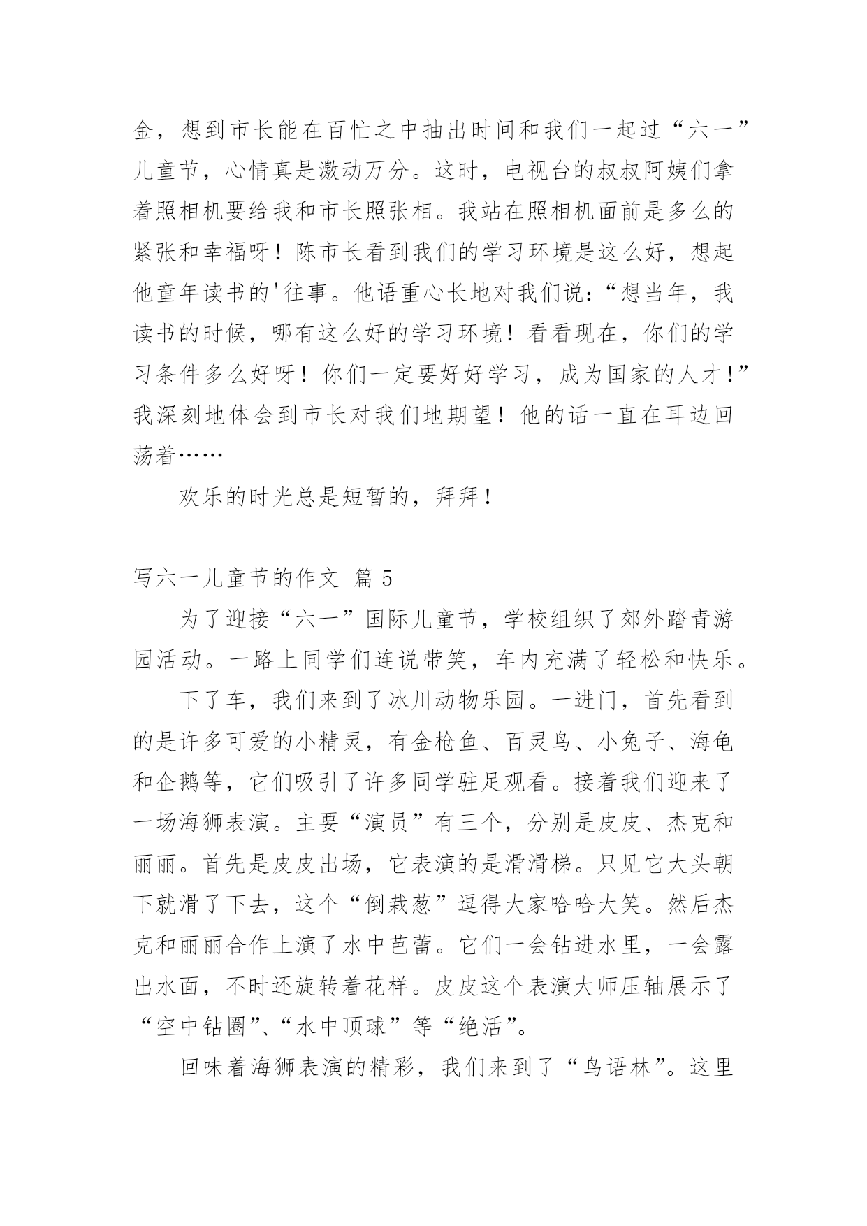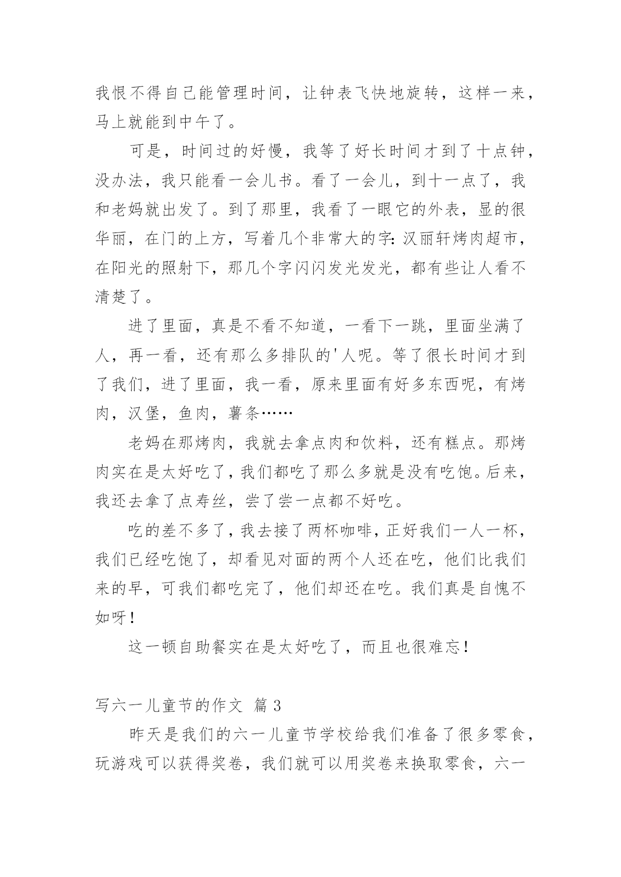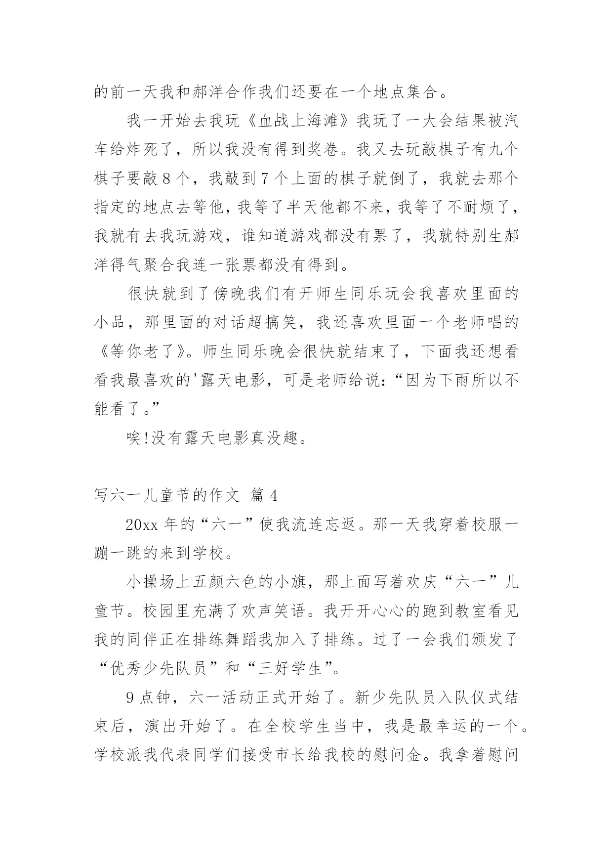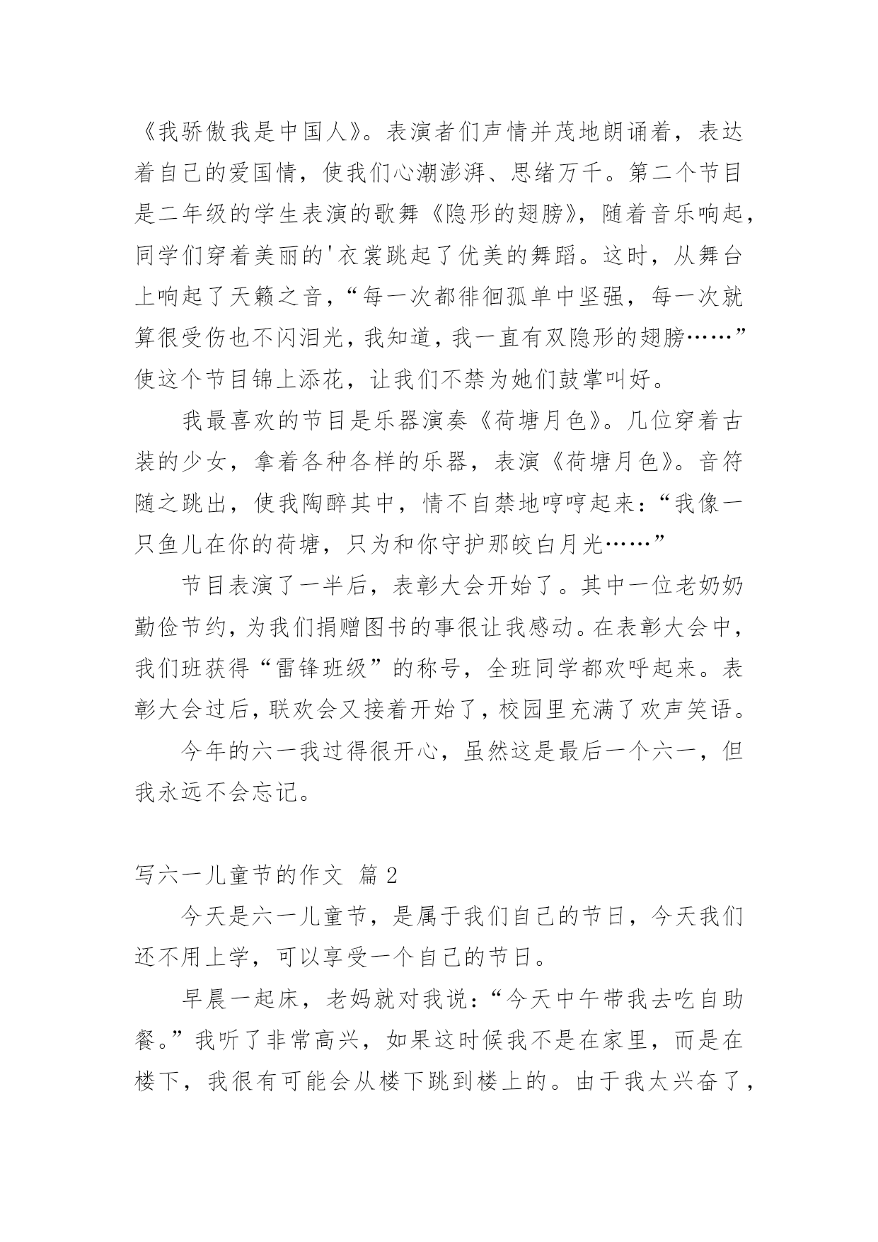 写六一儿童节的作文 【精华】写六一儿童节的作文六篇无论是在学校还是在社会中,许多人都写过作文吧,写作文可以锻炼我们的独处习惯,让自己的心静下来,思考自己未来的方向。相信许多人会觉得作文很难写吧,以下是小编收集整理的写六一儿童节的作文6篇,希望能够帮助到大家。写六一儿童节的作文篇1送去五月的芬芳,迎来六月的时光,我们的心像怒放的花朵,荡起一片欢乐的海洋!六月,是童年的摇篮,是童年的梦乡;六月,是童年的沃土,是童年的太阳。星期四下午,一来到学校,就感到一阵热闹的气氛,操场正前搭着一个舞台,上面写着“我健康我阳光我快乐我成长”。哦,我才想起来了,今天下午要开“六一”联欢会,一想到这里,我高兴地差点叫出声来。这时,李老师踏着铃声走了进来,对同学们说:“一会儿下楼看联欢会,要注意保持秩序和环境。”说完,便让同学们搬着凳子排好队下楼。来到楼下,才发现真可谓是人山人海!一至六年级的全体师生欢聚一堂,共同享受这美好的时光。不一会儿,联欢会就开始了。第一个节目是诗歌朗诵《我骄傲我是中国人》。表演者们声情并茂地朗诵着,表达着自己的爱国情,使我们心潮澎湃、思绪万千。第二个节目是二年级的学生表演的歌舞《隐形的翅膀》,随着音乐响起,同学们穿着美丽的'衣裳跳起了优美的舞蹈。这时,从舞台上响起了天籁之音,“每一次都徘徊孤单中坚强,每一次就算很受伤也不闪泪光,我知道,我一直有双隐形的翅膀……”使这个节目锦上添花,让我们不禁为她们鼓掌叫好。我最喜欢的节目是乐器演奏《荷塘月色》。几位穿着古装的少女,拿着各种各样的乐器,表演《荷塘月色》。音符随之跳出,使我陶醉其中,情不自禁地哼哼起来:“我像一只鱼儿在你的荷塘,只为和你守护那皎白月光……”节目表演了一半后,表彰大会开始了。其中一位老奶奶勤俭节约,为我们捐赠图书的事很让我感动。在表彰大会中,我们班获得“雷锋班级”的称号,全班同学都欢呼起来。表彰大会过后,联欢会又接着开始了,校园里充满了欢声笑语。今年的六一我过得很开心,虽然这是最后一个六一,但我永远不会忘记。写六一儿童节的作文篇2今天是六一儿童节,是属于我们自己的节日,今天我们还不用上学,可以享受一个自己的节日。早晨一起床,老妈就对我说:“今天中午带我去吃自助餐。”我听了非常高兴,如果这时候我不是在家里,而是在楼下,我很有可能会从楼下跳到楼上的。由于我太兴奋了,我恨不得自己能管理时间,让钟表飞快地旋转,这样一来,马上就能到中午了。可是,时间过的好慢,我等了好长时间才到了十点钟,没办法,我只能看一会儿书。看了一会儿,到十一点了,我和老妈就出发了。到了那里,我看了一眼它的外表,显的很华丽,在门的上方,写着几个非常大的字:汉丽轩烤肉超市,在阳光的照射下,那几个字闪闪发光发光,都有些让人看不清楚了。进了里面,真是不看不知道,一看下一跳,里面坐满了人,再一看,还有那么多排队的'人呢。等了很长时间才到了我们,进了里面,我一看,原来里面有好多东西呢,有烤肉,汉堡,鱼肉,薯条……老妈在那烤肉,我就去拿点肉和饮料,还有糕点。那烤肉实在是太好吃了,我们都吃了那么多就是没有吃饱。后来,我还去拿了点寿丝,尝了尝一点都不好吃。吃的差不多了,我去接了两杯咖啡,正好我们一人一杯,我们已经吃饱了,却看见对面的两个人还在吃,他们比我们来的早,可我们都吃完了,他们却还在吃。我们真是自愧不如呀!这一顿自助餐实在是太好吃了,而且也很难忘!写六一儿童节的作文篇3昨天是我们的六一儿童节学校给我们准备了很多零食,玩游戏可以获得奖卷,我们就可以用奖卷来换取零食,六一的前一天我和郝洋合作我们还要在一个地点集合。我一开始去我玩《血战上海滩》我玩了一大会结果被汽车给炸死了,所以我没有得到奖卷。我又去玩敲棋子有九个棋子要敲8个,我敲到7个上面的棋子就倒了,我就去那个指定的地点去等他,我等了半天他都不来,我等了不耐烦了,我就有去我玩游戏,谁知道游戏都没有票了,我就特别生郝洋得气聚合我连一张票都没有得到。很快就到了傍晚我们有开师生同乐玩会我喜欢里面的小品,那里面的对话超搞笑,我还喜欢里面一个老师唱的《等你老了》。师生同乐晚会很快就结束了,下面我还想看看我最喜欢的'露天电影,可是老师给说:“因为下雨所以不能看了。”唉!没有露天电影真没趣。写六一儿童节的作文篇420xx年的“六一”使我流连忘返。那一天我穿着校服一蹦一跳的来到学校。小操场上五颜六色的小旗,那上面写着欢庆“六一”儿童节。校园里充满了欢声笑语。我开开心心的跑到教室看见我的同伴正在排练舞蹈我加入了排练。过了一会我们颁发了“优秀少先队员”和“三好学生”。9点钟,六一活动正式开始了。新少先队员入队仪式结束后,演出开始了。在全校学生当中,我是最幸运的一个。学校派我代表同学们接受市长给我校的慰问金。我拿着慰问金,想到市长能在百忙之中抽出时间和我们一起过“六一”儿童节,心情真是激