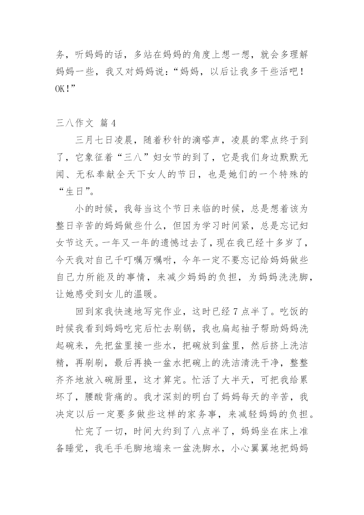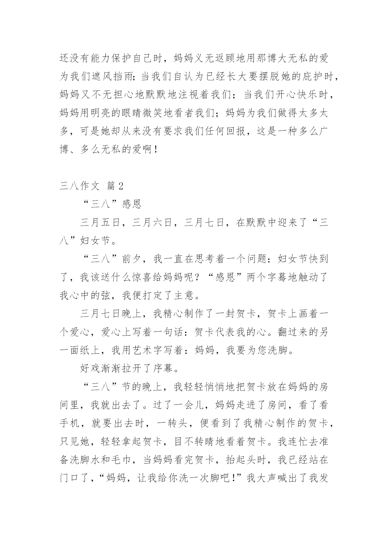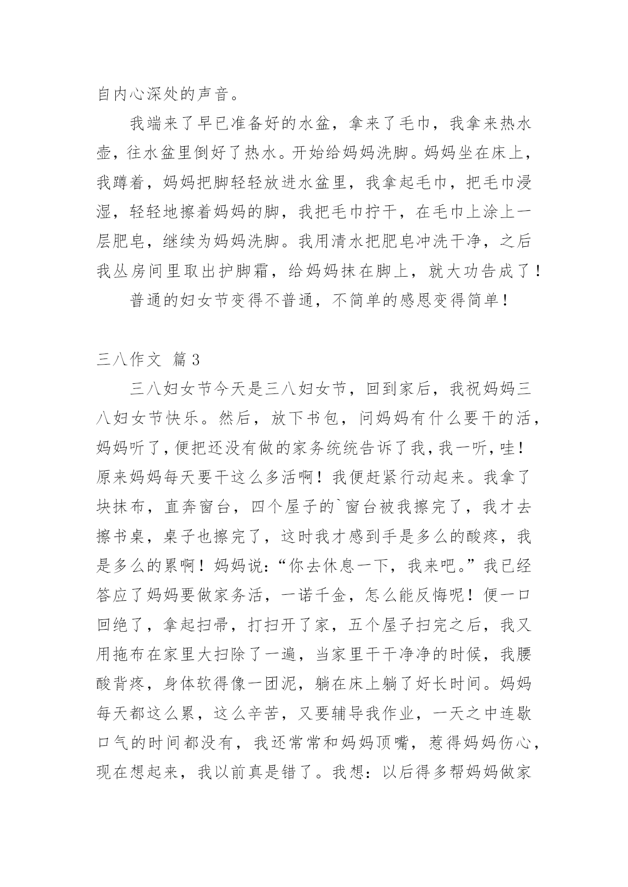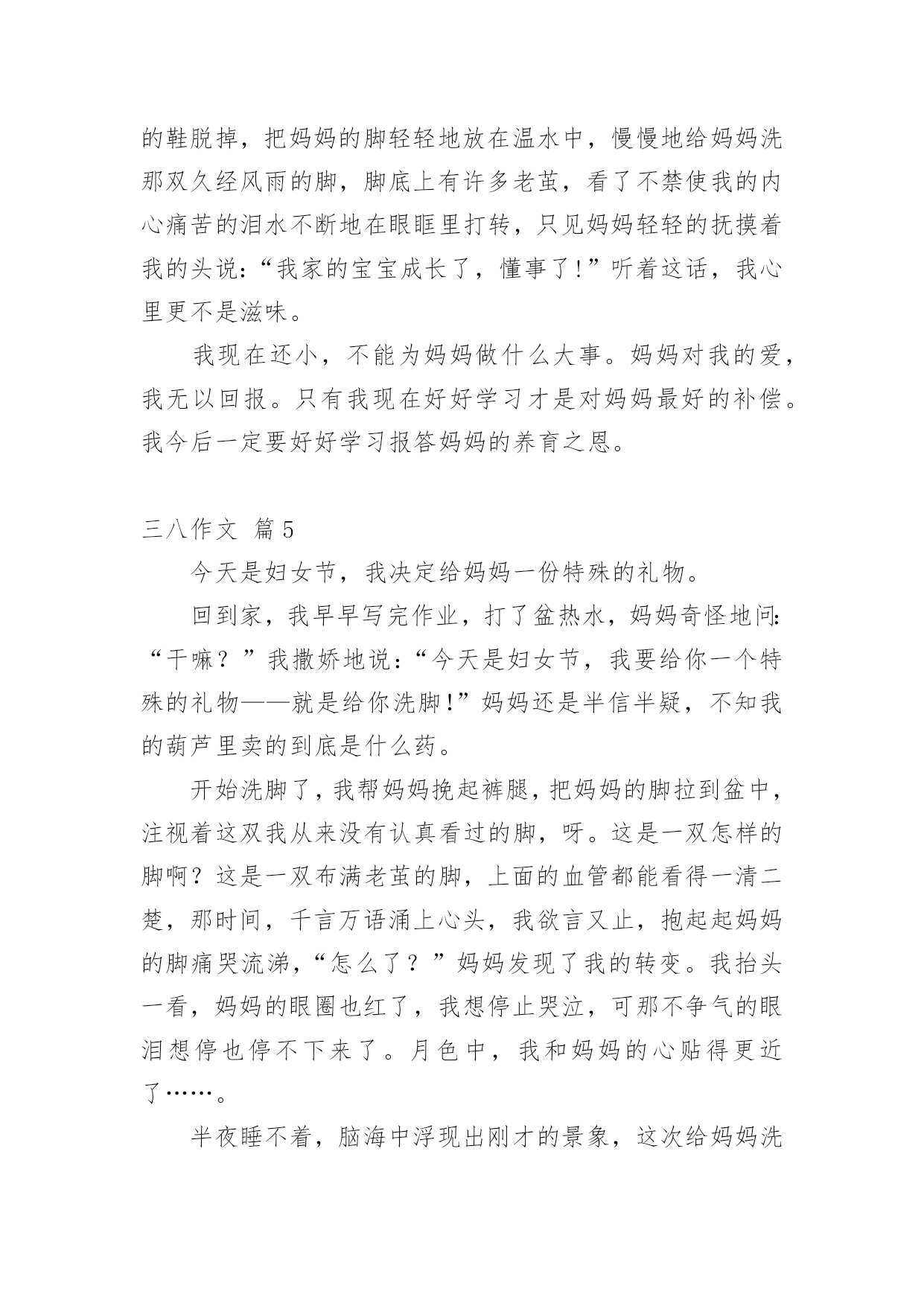 三八作文 【热门】三八作文六篇无论在学习、工作或是生活中,大家总少不了接触作文吧,通过作文可以把我们那些零零散散的思想,聚集在一块。你知道作文怎样写才规范吗?以下是小编帮大家整理的三八作文6篇,希望对大家有所帮助。三八作文篇1有一首歌,它唱出了人们的肺腑之言,所以,会唱的人很多,留传了也很久,歌的名字叫《世上只有妈妈好》。是啊,我们每个人能说出的最甜美的字眼是"妈妈",能发出的最美好的呼唤是"妈妈"。"妈妈",这个简单却又意味深长的的字眼,充满了希望,充满了关爱,充满了抚慰,充满了所有的甜蜜和所有的美好感情。是妈妈,给了我们生命,也给了我们浓浓的爱。早晨,当我们匆匆忙忙从床上爬起时,是谁的身影徘徊在门口张望?当我们带着一身的疲惫回到家时,又是谁为我们准备好了洗澡水?当我们学习上遇到难题时,又是谁陪着我们一起苦思冥想,然后又悄悄地在书桌旁放上一杯牛奶?是妈妈,是我们亲爱的妈妈!从小到大,妈妈一直是我们身边最亲最爱的人,在我们还不清楚表达时,妈妈不厌其烦地教我们呀呀学语;当我们还没有能力保护自己时,妈妈义无返顾地用那博大无私的爱为我们遮风挡雨;当我们自认为已经长大要摆脱她的庇护时,妈妈又不无担心地默默地注视着我们;当我们开心快乐时,妈妈用明亮的眼睛微笑地看者我们;妈妈为我们做得太多太多,可是她却从来没有要求我们任何回报,这是一种多么广博、多么无私的爱啊!三八作文篇2“三八”感恩三月五日,三月六日,三月七日,在默默中迎来了“三八”妇女节。“三八”前夕,我一直在思考着一个问题:妇女节快到了,我该送什么惊喜给妈妈呢?“感恩”两个字蓦地触动了我心中的弦,我便打定了主意。三月七日晚上,我精心制作了一封贺卡,贺卡上画着一个爱心,爱心上写着一句话:贺卡代表我的心。翻过来的另一面纸上,我用艺术字写着:妈妈,我要为您洗脚。好戏渐渐拉开了序幕。“三八”节的晚上,我轻轻悄悄地把贺卡放在妈妈的房间里,我就出去了。过了一会儿,妈妈走进了房间,看了看手机,就要出去时,一转头,便看到了我精心制作的贺卡,只见她,轻轻拿起贺卡,目不转睛地看着贺卡。我连忙去准备洗脚水和毛巾,当妈妈看完贺卡,抬起头时,我已经站在门口了,“妈妈,让我给你洗一次脚吧!”我大声喊出了我发自内心深处的声音。我端来了早已准备好的水盆,拿来了毛巾,我拿来热水壶,往水盆里倒好了热水。开始给妈妈洗脚。妈妈坐在床上,我蹲着,妈妈把脚轻轻放进水盆里,我拿起毛巾,把毛巾浸湿,轻轻地擦着妈妈的脚,我把毛巾拧干,在毛巾上涂上一层肥皂,继续为妈妈洗脚。我用清水把肥皂冲洗干净,之后我丛房间里取出护脚霜,给妈妈抹在脚上,就大功告成了!普通的妇女节变得不普通,不简单的感恩变得简单!三八作文篇3三八妇女节今天是三八妇女节,回到家后,我祝妈妈三八妇女节快乐。然后,放下书包,问妈妈有什么要干的活,妈妈听了,便把还没有做的家务统统告诉了我,我一听,哇!原来妈妈每天要干这么多活啊!我便赶紧行动起来。我拿了块抹布,直奔窗台,四个屋子的`窗台被我擦完了,我才去擦书桌,桌子也擦完了,这时我才感到手是多么的酸疼,我是多么的累啊!妈妈说:“你去休息一下,我来吧。”我已经答应了妈妈要做家务活,一诺千金,怎么能反悔呢!便一口回绝了,拿起扫帚,打扫开了家,五个屋子扫完之后,我又用拖布在家里大扫除了一遍,当家里干干净净的时候,我腰酸背疼,身体软得像一团泥,躺在床上躺了好长时间。妈妈每天都这么累,这么辛苦,又要辅导我作业,一天之中连歇口气的时间都没有,我还常常和妈妈顶嘴,惹得妈妈伤心,现在想起来,我以前真是错了。我想:以后得多帮妈妈做家务,听妈妈的话,多站在妈妈的角度上想一想,就会多理解妈妈一些,我又对妈妈说:“妈妈,以后让我多干些活吧!OK!”三八作文篇4三月七日凌晨,随着秒针的滴嗒声,凌晨的零点终于到了,它象征着“三八”妇女节的到了,它是我们身边默默无闻、无私奉献全天下女人的节日,也是她们的一个特殊的“生日”。小的时候,我每当这个节日来临的时候,总是想着该为整日辛苦的妈妈做些什么,但因为学习时间紧,总是忘记妇女节这天。一年又一年的遗憾过去了,现在我已经十多岁了,今天我对自己千叮嘱万嘱咐,今年一定不要忘记给妈妈做些自己力所能及的事情,来减少妈妈的负担,为妈妈洗洗脚,让她感受到女儿的温暖。回到家我快速地写完作业,这时已经7点半了。吃饭的时候我看到妈妈吃完后忙去刷锅,我也扁起袖子帮助妈妈洗起碗来,先把盆里接一些水,把碗放到盆里,然后挤上洗洁精,再刷刷,最后再换一盆水把碗上的洗洁清洗干净,整整齐齐地放入碗厨里,这才算完。忙活了大半天,可把我给累坏了,腰酸背痛的。我才深刻的明白了妈妈每天的辛苦,我决定以后一定要多做些这样的家务事,来减轻妈妈的负担。忙完了一切,时间大约到了八点半了,妈妈坐在床上准备睡觉,我毛手毛脚地端来一盆洗脚水,小心翼翼地把妈妈的鞋