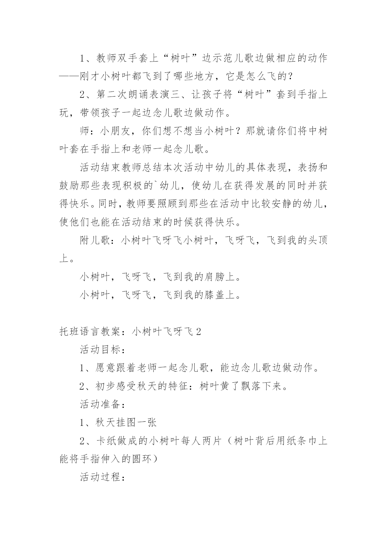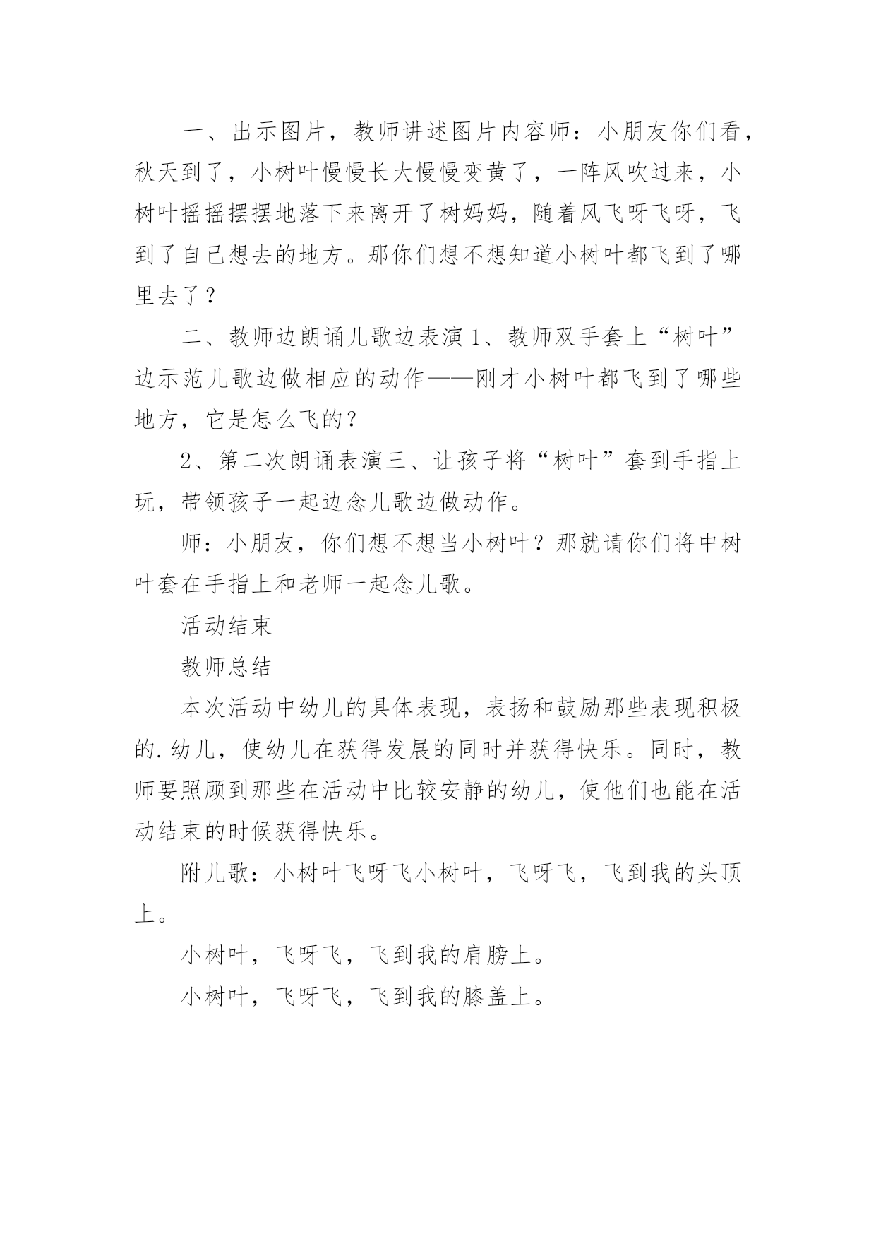 托班语言教案:小树叶飞呀飞 托班语言教案:小树叶飞呀飞作为一名默默奉献的教育工作者,时常需要编写教案,借助教案可以恰当地选择和运用教学方法,调动学生学习的积极性。如何把教案做到重点突出呢?以下是小编整理的托班语言教案:小树叶飞呀飞,仅供参考,欢迎大家阅读。托班语言教案:小树叶飞呀飞1活动目标:1、愿意跟着老师一起念儿歌,能边念儿歌边做动作。2、初步感受秋天的特征:树叶黄了飘落下来活动准备:1、秋天挂图一张2、卡纸做成的小树叶每人两片(树叶背后用纸条巾上能将手指伸入的圆环)活动过程:一、出示图片,教师讲述图片内容师:小朋友你们看,秋天到了,小树叶慢慢长大慢慢变黄了,一阵风吹过来,小树叶摇摇摆摆地落下来离开了树妈妈,随着风飞呀飞呀,飞到了自己想去的地方。那你们想不想知道小树叶都飞到了哪里去了?二、教师边朗诵儿歌边表演1、教师双手套上“树叶”边示范儿歌边做相应的动作——刚才小树叶都飞到了哪些地方,它是怎么飞的?2、第二次朗诵表演三、让孩子将“树叶”套到手指上玩,带领孩子一起边念儿歌边做动作。师:小朋友,你们想不想当小树叶?那就请你们将中树叶套在手指上和老师一起念儿歌。活动结束教师总结本次活动中幼儿的具体表现,表扬和鼓励那些表现积极的`幼儿,使幼儿在获得发展的同时并获得快乐。同时,教师要照顾到那些在活动中比较安静的幼儿,使他们也能在活动结束的时候获得快乐。附儿歌:小树叶飞呀飞小树叶,飞呀飞,飞到我的头顶上。小树叶,飞呀飞,飞到我的肩膀上。小树叶,飞呀飞,飞到我的膝盖上。托班语言教案:小树叶飞呀飞2活动目标:1、愿意跟着老师一起念儿歌,能边念儿歌边做动作。2、初步感受秋天的特征:树叶黄了飘落下来。活动准备:1、秋天挂图一张2、卡纸做成的小树叶每人两片(树叶背后用纸条巾上能将手指伸入的圆环)活动过程:一、出示图片,教师讲述图片内容师:小朋友你们看,秋天到了,小树叶慢慢长大慢慢变黄了,一阵风吹过来,小树叶摇摇摆摆地落下来离开了树妈妈,随着风飞呀飞呀,飞到了自己想去的地方。那你们想不想知道小树叶都飞到了哪里去了?二、教师边朗诵儿歌边表演1、教师双手套上“树叶”边示范儿歌边做相应的动作——刚才小树叶都飞到了哪些地方,它是怎么飞的?2、第二次朗诵表演三、让孩子将“树叶”套到手指上玩,带领孩子一起边念儿歌边做动作。师:小朋友,你们想不想当小树叶?那就请你们将中树叶套在手指上和老师一起念儿歌。活动结束教师总结本次活动中幼儿的具体表现,表扬和鼓励那些表现积极的.幼儿,使幼儿在获得发展的同时并获得快乐。同时,教师要照顾到那些在活动中比较安静的幼儿,使他们也能在活动结束的时候获得快乐。附儿歌:小树叶飞呀飞小树叶,飞呀飞,飞到我的头顶上。小树叶,飞呀飞,飞到我的肩膀上。小树叶,飞呀飞,飞到我的膝盖上。