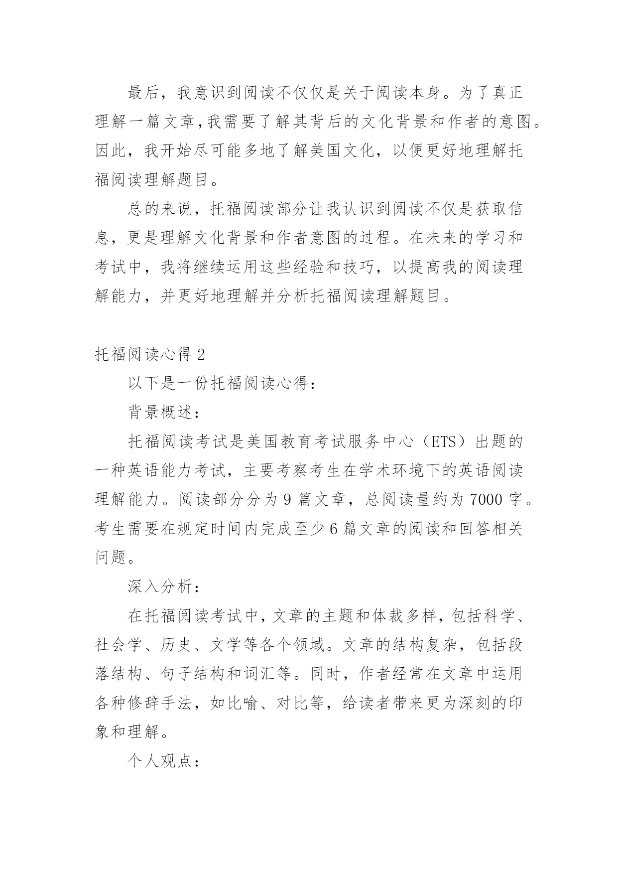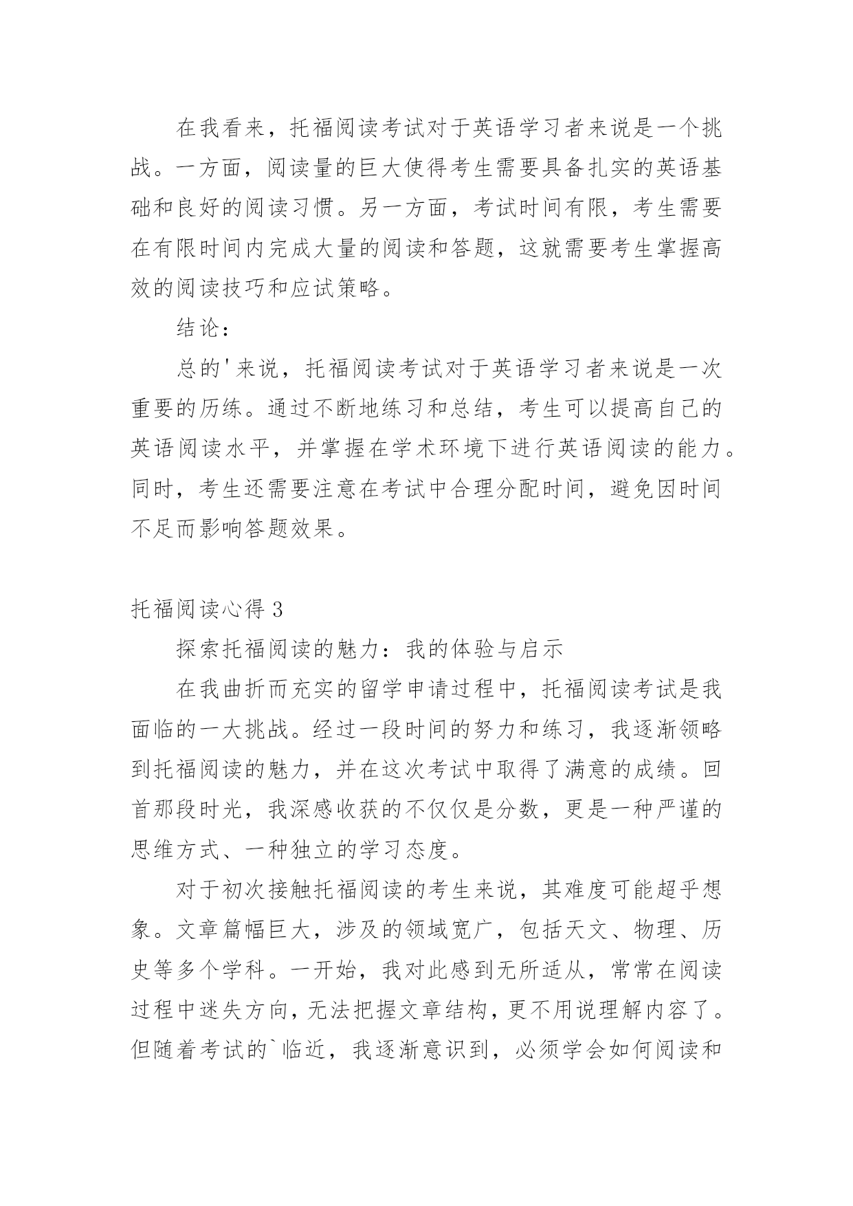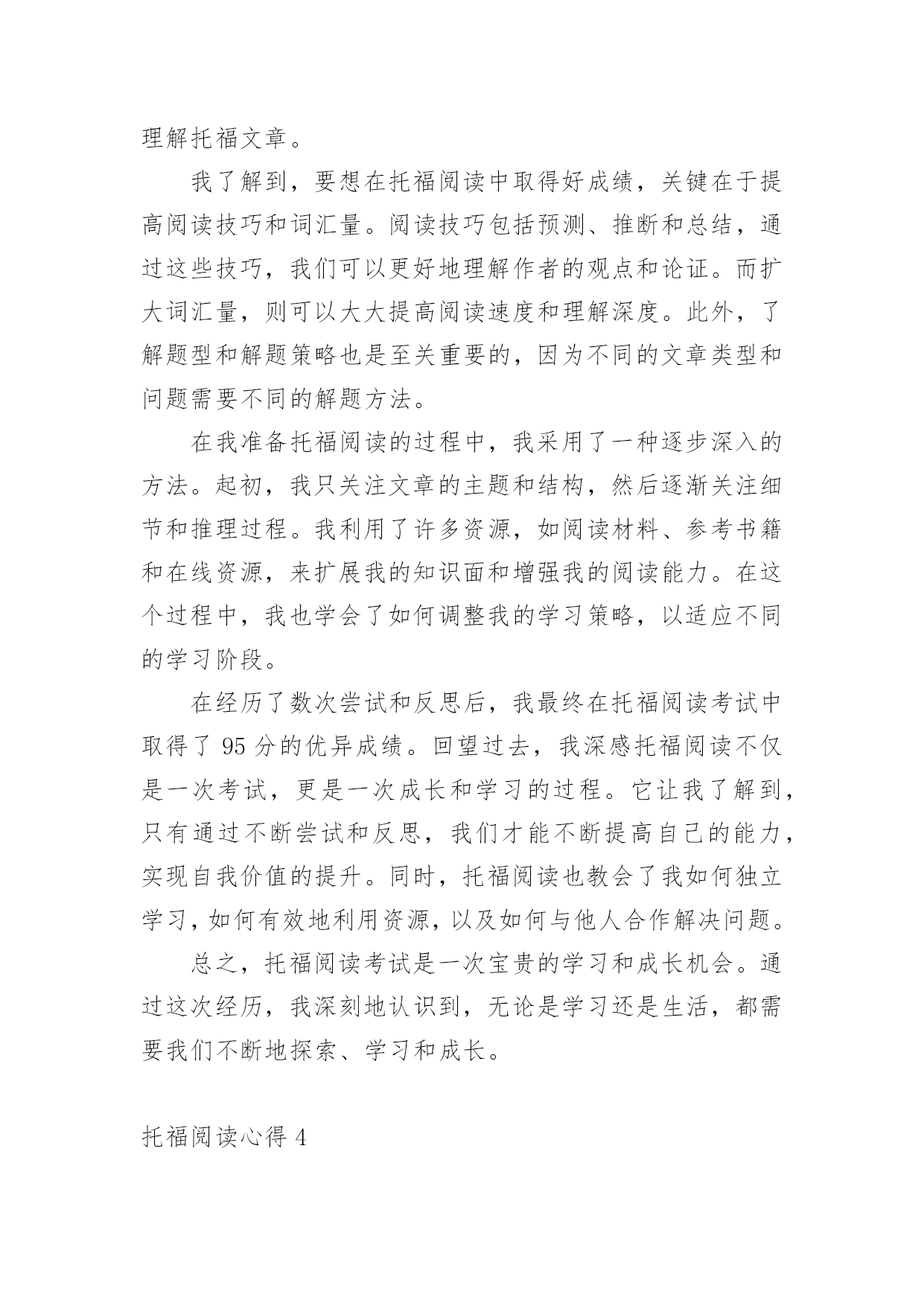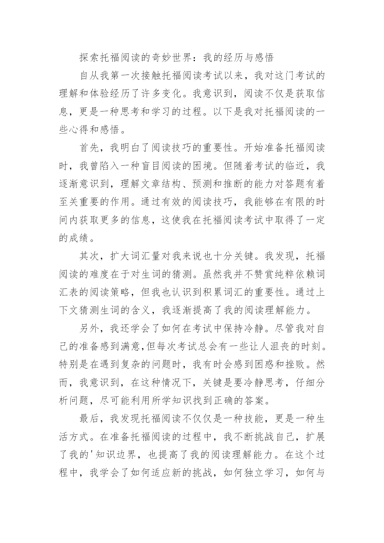 托福阅读心得 托福阅读心得我们心里有一些收获后,好好地写一份心得体会,如此就可以提升我们写作能力了。那么如何写心得体会才能更有感染力呢?以下是小编收集整理的托福阅读心得,欢迎大家分享。托福阅读心得1探索托福阅读的深度与广度:我的体验与感悟在我那不短也不长的托福考试之旅中,阅读部分给我带来了极大的挑战。我曾一度怀疑自己是否能够读懂并理解这些来自美国文化背景的复杂文章。然而,通过不断的努力和尝试,我找到了应对阅读理解的方法,并在此过程中获得了宝贵的经验教训。首先,我了解到阅读理解并不仅仅是关于语言能力的.。即使我能看懂每一个单词,如果我没有理解文章的结构或者没有把握住作者的观点,我也无法成功地完成阅读理解题目。因此,理解并分析文章的结构以及作者的观点变得尤为重要。其次,我逐渐认识到阅读技巧的重要性。在考试中,我学会了快速浏览文章,抓住关键词和重点,以便在有限的时间内尽可能多地获取信息。同时,我也学会了在理解的基础上进行推理和判断,以便更好地理解作者的意图。最后,我意识到阅读不仅仅是关于阅读本身。为了真正理解一篇文章,我需要了解其背后的文化背景和作者的意图。因此,我开始尽可能多地了解美国文化,以便更好地理解托福阅读理解题目。总的来说,托福阅读部分让我认识到阅读不仅是获取信息,更是理解文化背景和作者意图的过程。在未来的学习和考试中,我将继续运用这些经验和技巧,以提高我的阅读理解能力,并更好地理解并分析托福阅读理解题目。托福阅读心得2以下是一份托福阅读心得:背景概述:托福阅读考试是美国教育考试服务中心(ETS)出题的一种英语能力考试,主要考察考生在学术环境下的英语阅读理解能力。阅读部分分为9篇文章,总阅读量约为7000字。考生需要在规定时间内完成至少6篇文章的阅读和回答相关问题。深入分析:在托福阅读考试中,文章的主题和体裁多样,包括科学、社会学、历史、文学等各个领域。文章的结构复杂,包括段落结构、句子结构和词汇等。同时,作者经常在文章中运用各种修辞手法,如比喻、对比等,给读者带来更为深刻的印象和理解。个人观点:在我看来,托福阅读考试对于英语学习者来说是一个挑战。一方面,阅读量的巨大使得考生需要具备扎实的英语基础和良好的阅读习惯。另一方面,考试时间有限,考生需要在有限时间内完成大量的阅读和答题,这就需要考生掌握高效的阅读技巧和应试策略。结论:总的'来说,托福阅读考试对于英语学习者来说是一次重要的历练。通过不断地练习和总结,考生可以提高自己的英语阅读水平,并掌握在学术环境下进行英语阅读的能力。同时,考生还需要注意在考试中合理分配时间,避免因时间不足而影响答题效果。托福阅读心得3探索托福阅读的魅力:我的体验与启示在我曲折而充实的留学申请过程中,托福阅读考试是我面临的一大挑战。经过一段时间的努力和练习,我逐渐领略到托福阅读的魅力,并在这次考试中取得了满意的成绩。回首那段时光,我深感收获的不仅仅是分数,更是一种严谨的思维方式、一种独立的学习态度。对于初次接触托福阅读的考生来说,其难度可能超乎想象。文章篇幅巨大,涉及的领域宽广,包括天文、物理、历史等多个学科。一开始,我对此感到无所适从,常常在阅读过程中迷失方向,无法把握文章结构,更不用说理解内容了。但随着考试的`临近,我逐渐意识到,必须学会如何阅读和理解托福文章。我了解到,要想在托福阅读中取得好成绩,关键在于提高阅读技巧和词汇量。阅读技巧包括预测、推断和总结,通过这些技巧,我们可以更好地理解作者的观点和论证。而扩大词汇量,则可以大大提高阅读速度和理解深度。此外,了解题型和解题策略也是至关重要的,因为不同的文章类型和问题需要不同的解题方法。在我准备托福阅读的过程中,我采用了一种逐步深入的方法。起初,我只关注文章的主题和结构,然后逐渐关注细节和推理过程。我利用了许多资源,如阅读材料、参考书籍和在线资源,来扩展我的知识面和增强我的阅读能力。在这个过程中,我也学会了如何调整我的学习策略,以适应不同的学习阶段。在经历了数次尝试和反思后,我最终在托福阅读考试中取得了95分的优异成绩。回望过去,我深感托福阅读不仅是一次考试,更是一次成长和学习的过程。它让我了解到,只有通过不断尝试和反思,我们才能不断提高自己的能力,实现自我价值的提升。同时,托福阅读也教会了我如何独立学习,如何有效地利用资源,以及如何与他人合作解决问题。总之,托福阅读考试是一次宝贵的学习和成长机会。通过这次经历,我深刻地认识到,无论是学习还是生活,都需要我们不断地探索、学习和成长。托福阅读心得4探索托福阅读的奇妙世界:我的经历与感悟自从我第一次接触托福阅读考试以来,我对这门考试的理解和体验经历了许多变化。我意识到,阅读不仅是获取信息,更是一种思考和学习的过程。以下是我对托福阅读的一些心得和感悟。首先,我明白了阅读技巧的重要性。开始准备托福阅读时