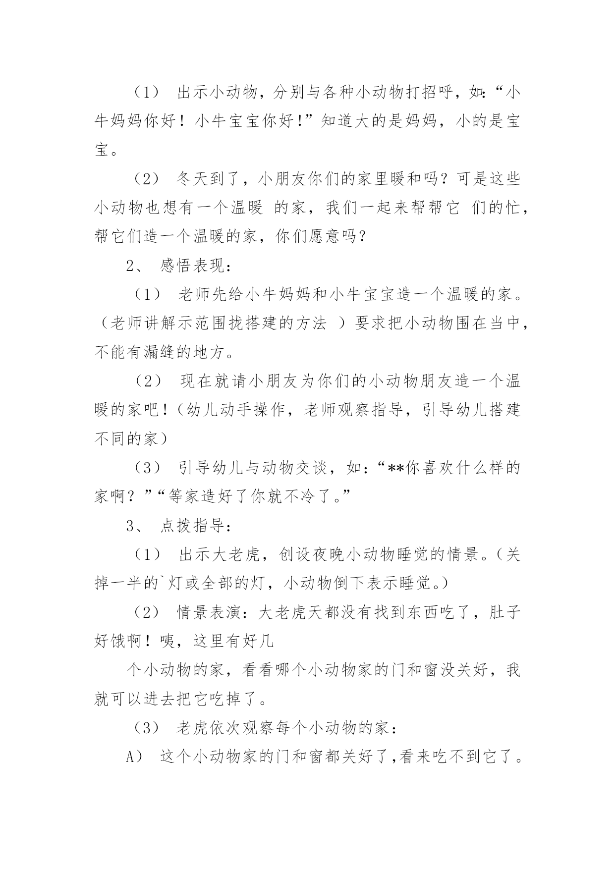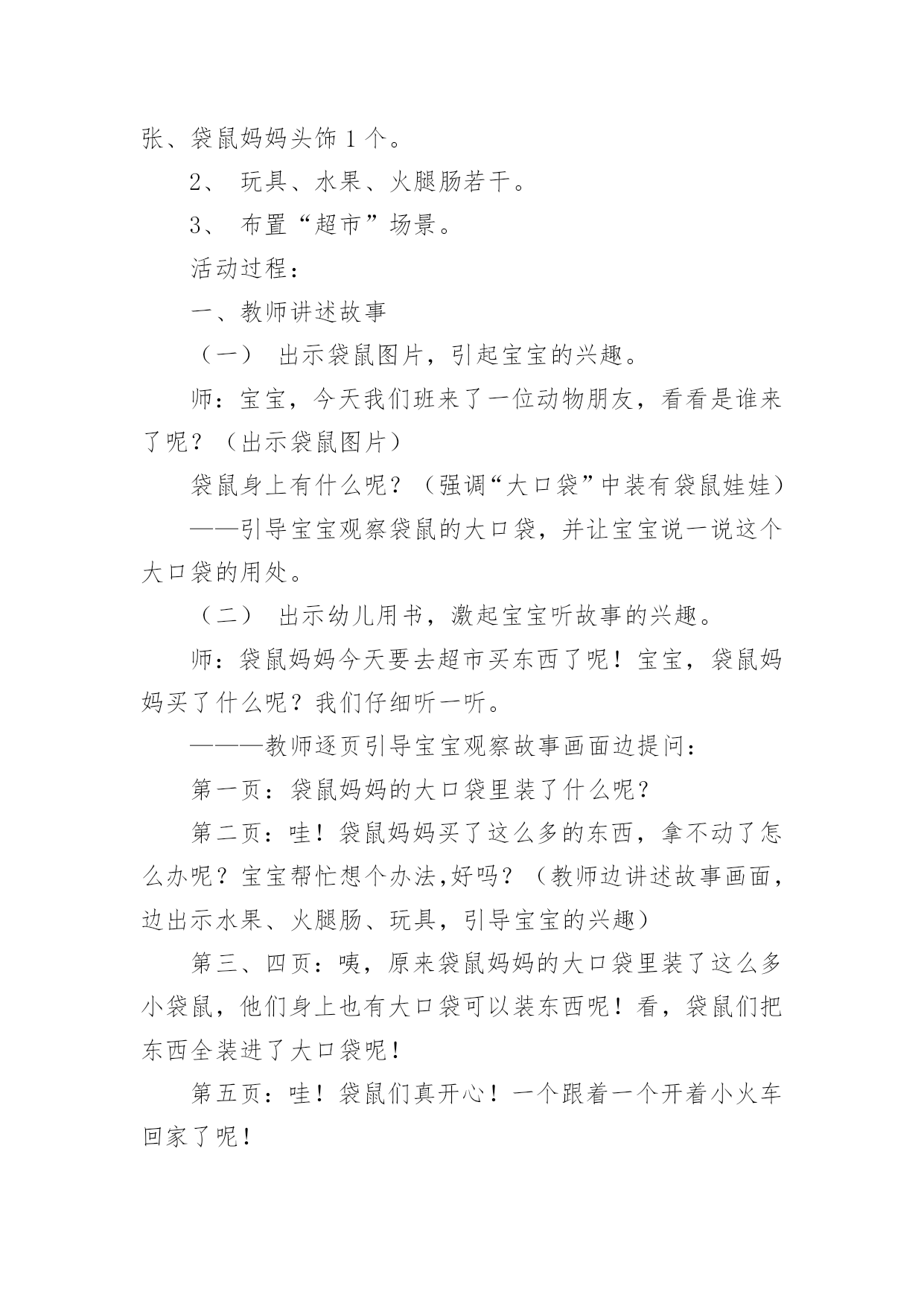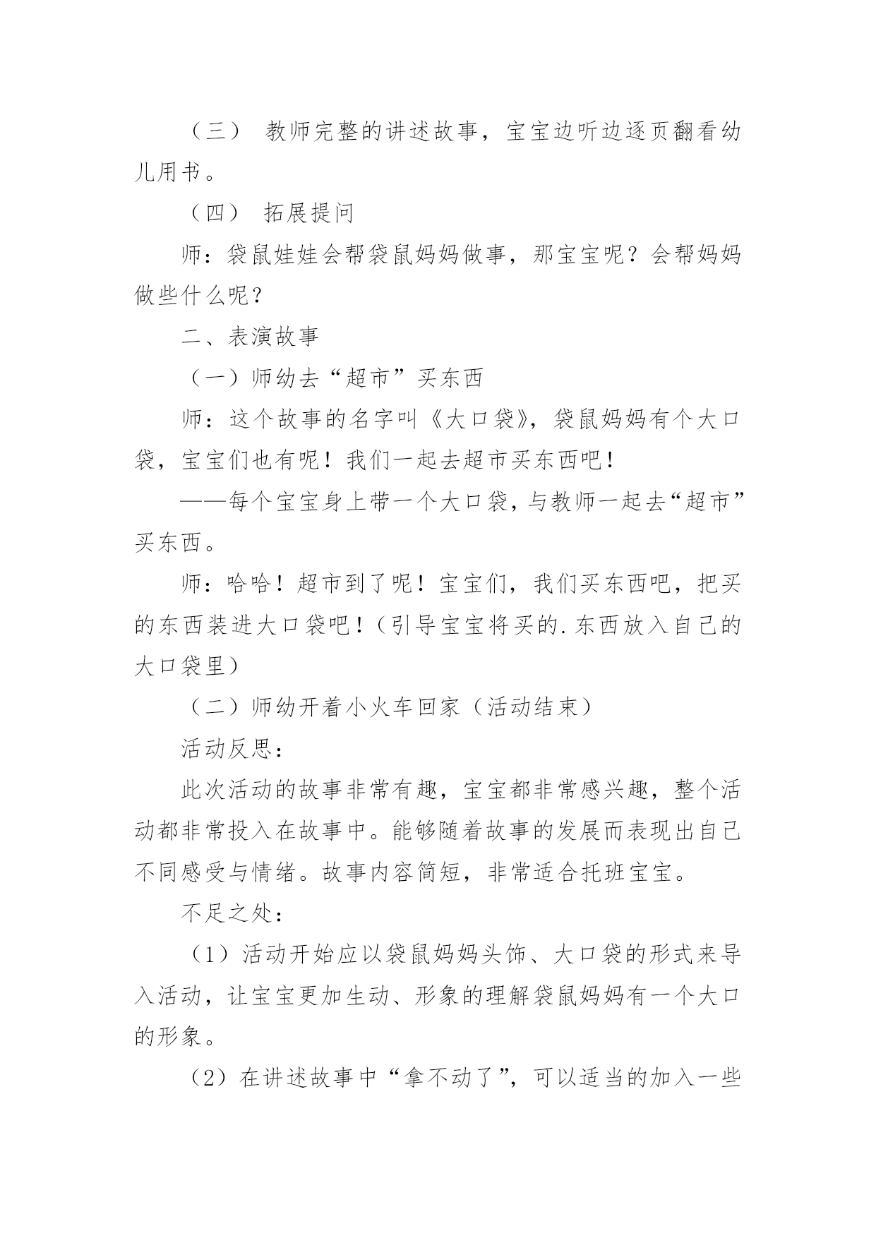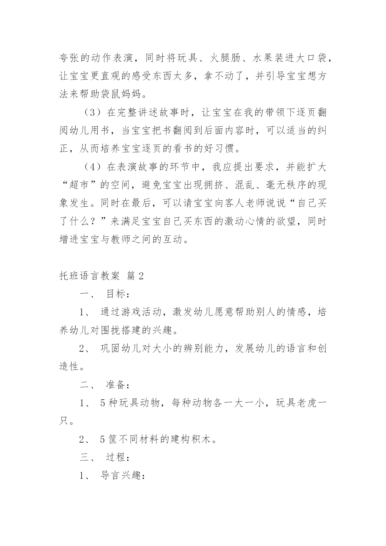 托班语言教案 关于托班语言教案模板汇编9篇作为一名教学工作者,常常要根据教学需要编写教案,编写教案有利于我们准确把握教材的重点与难点,进而选择恰当的教学方法。那么问题来了,教案应该怎么写?以下是小编为大家整理的托班语言教案9篇,供大家参考借鉴,希望可以帮助到有需要的朋友。托班语言教案篇1设计意图:让宝宝体验了妈妈的辛苦,同时感受到了帮助妈妈做事的快乐。因此,选择了“以帮助妈妈做事、关心妈妈”为主旨的故事,让宝宝通过听故事来深入的体验帮妈妈做事的快乐。同时托班宝宝由于年龄还小,故事是最喜欢的,我也抓住了这一点,选择此次的语言活动,满足宝宝说话的愿望和要求,多给宝宝以鼓励、多给宝宝创造说话的机会。活动目标:1、初步理解故事的内容情节。2、喜欢听故事,并体验表演故事的乐趣。3、能跟着教师一起逐页讲述故事的内容。活动准备:1、幼儿用书人手一本、大口袋人手一个、袋鼠图片1张、袋鼠妈妈头饰1个。2、玩具、水果、火腿肠若干。3、布置“超市”场景。活动过程:一、教师讲述故事(一)出示袋鼠图片,引起宝宝的兴趣。师:宝宝,今天我们班来了一位动物朋友,看看是谁来了呢?(出示袋鼠图片)袋鼠身上有什么呢?(强调“大口袋”中装有袋鼠娃娃)——引导宝宝观察袋鼠的大口袋,并让宝宝说一说这个大口袋的用处。(二)出示幼儿用书,激起宝宝听故事的兴趣。师:袋鼠妈妈今天要去超市买东西了呢!宝宝,袋鼠妈妈买了什么呢?我们仔细听一听。———教师逐页引导宝宝观察故事画面边提问:第一页:袋鼠妈妈的大口袋里装了什么呢?第二页:哇!袋鼠妈妈买了这么多的东西,拿不动了怎么办呢?宝宝帮忙想个办法,好吗?(教师边讲述故事画面,边出示水果、火腿肠、玩具,引导宝宝的兴趣)第三、四页:咦,原来袋鼠妈妈的大口袋里装了这么多小袋鼠,他们身上也有大口袋可以装东西呢!看,袋鼠们把东西全装进了大口袋呢!第五页:哇!袋鼠们真开心!一个跟着一个开着小火车回家了呢!(三)教师完整的讲述故事,宝宝边听边逐页翻看幼儿用书。(四)拓展提问师:袋鼠娃娃会帮袋鼠妈妈做事,那宝宝呢?会帮妈妈做些什么呢?二、表演故事(一)师幼去“超市”买东西师:这个故事的名字叫《大口袋》,袋鼠妈妈有个大口袋,宝宝们也有呢!我们一起去超市买东西吧!——每个宝宝身上带一个大口袋,与教师一起去“超市”买东西。师:哈哈!超市到了呢!宝宝们,我们买东西吧,把买的东西装进大口袋吧!(引导宝宝将买的.东西放入自己的大口袋里)(二)师幼开着小火车回家(活动结束)活动反思:此次活动的故事非常有趣,宝宝都非常感兴趣,整个活动都非常投入在故事中。能够随着故事的发展而表现出自己不同感受与情绪。故事内容简短,非常适合托班宝宝。不足之处:(1)活动开始应以袋鼠妈妈头饰、大口袋的形式来导入活动,让宝宝更加生动、形象的理解袋鼠妈妈有一个大口的形象。(2)在讲述故事中“拿不动了”,可以适当的加入一些夸张的动作表演,同时将玩具、火腿肠、水果装进大口袋,让宝宝更直观的感受东西太多,拿不动了,并引导宝宝想方法来帮助袋鼠妈妈。(3)在完整讲述故事时,让宝宝在我的带领下逐页翻阅幼儿用书,当宝宝把书翻阅到后面内容时,可以适当的纠正,从而培养宝宝逐页的看书的好习惯。(4)在表演故事的环节中,我应提出要求,并能扩大“超市”的空间,避免宝宝出现拥挤、混乱、毫无秩序的现象发生。同时在最后,可以请宝宝向客人老师说说“自己买了什么?”来满足宝宝自己买东西的激动心情的欲望,同时增进宝宝与教师之间的互动。托班语言教案篇2一、目标:1、通过游戏活动,激发幼儿愿意帮助别人的情感,培养幼儿对围拢搭建的兴趣。2、巩固幼儿对大小的辨别能力,发展幼儿的语言和创造性。二、准备:1、5种玩具动物,每种动物各一大一小,玩具老虎一只。2、5筐不同材料的建构积木。三、过程:1、导言兴趣:(1)出示小动物,分别与各种小动物打招呼,如:“小牛妈妈你好!小牛宝宝你好!”知道大的是妈妈,小的是宝宝。(2)冬天到了,小朋友你们的家里暖和吗?可是这些小动物也想有一个温暖的家,我们一起来帮帮它们的忙,帮它们造一个温暖的家,你们愿意吗?2、感悟表现:(1)老师先给小牛妈妈和小牛宝宝造一个温暖的家。(老师讲解示范围拢搭建的方法)要求把小动物围在当中,不能有漏缝的地方。(2)现在就请小朋友为你们的小动物朋友造一个温暖的家吧!(幼儿动手操作,老师观察指导,引导幼儿搭建不同的家)(3)引导幼儿与动物交谈,如:“**你喜欢什么样的家啊?”“等家造好了你就不冷了。”3、点拨指导:(1)出示大老虎,创设夜晚小动物睡觉的情景。(关掉一半的`灯或全部的灯,小动物倒下表示睡觉。)(2)情景表演:大老虎天都没有找到东西吃了,肚子好饿啊!咦,这里有好几个小动物的家,看看哪个小动物家的门和窗没关好,我就可以进去把它吃掉了。(3)老虎依次观察每个小动物的家:A