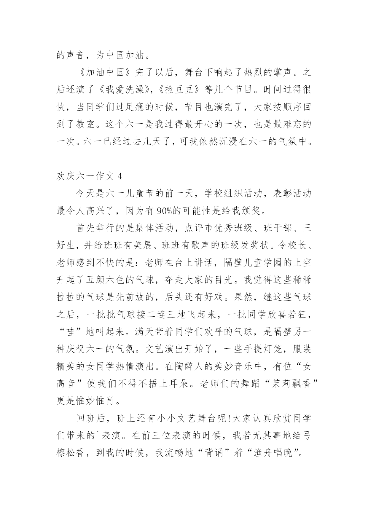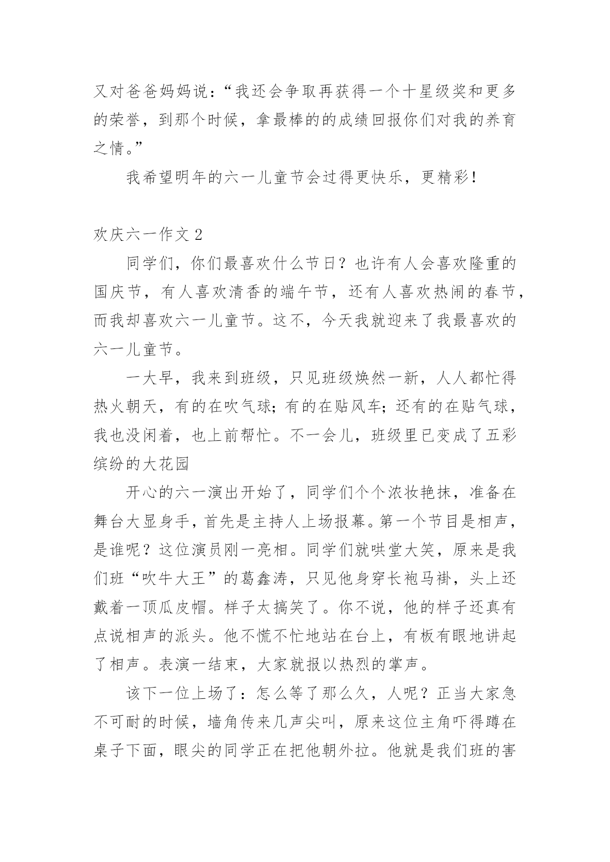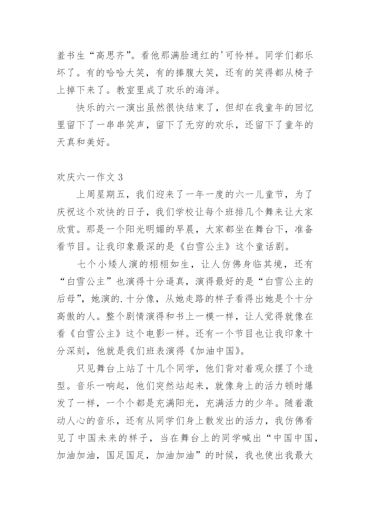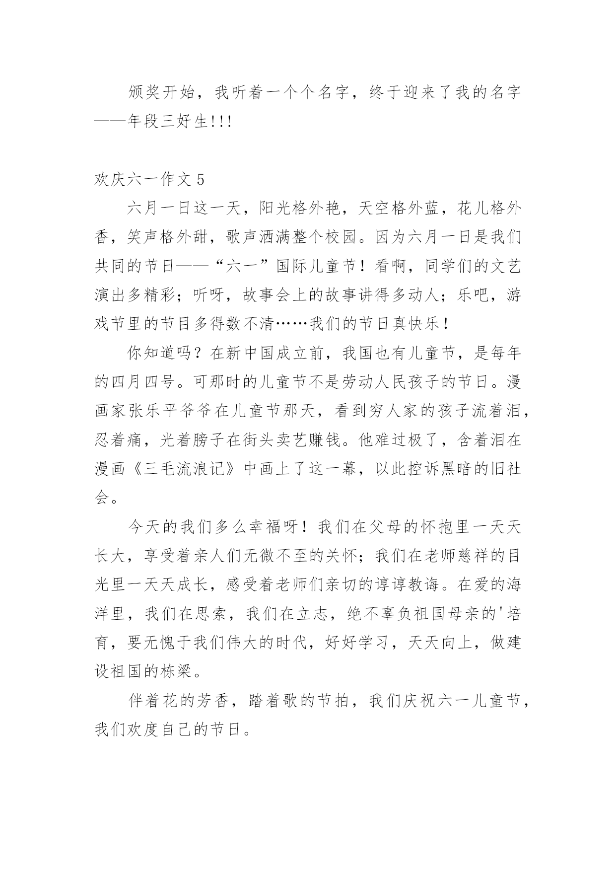 欢庆六一作文 欢庆六一作文【热】在日常学习、工作或生活中,大家都跟作文打过交道吧,作文一定要做到主题集中,围绕同一主题作深入阐述,切忌东拉西扯,主题涣散甚至无主题。那么你有了解过作文吗?以下是小编精心整理的欢庆六一作文,欢迎阅读,希望大家能够喜欢。欢庆六一作文1今天是六一儿童节。我们学校举办了“我们在阳光下成长”庆六一活动。首先是校领导讲话。郝校长要求我们要勤奋学习,天天向上,做一个优秀的四好学生,为祖国争光。然后是一年级的小同学佩戴红领巾,高年级的大哥哥大姐姐们给一年级的小同学带上了鲜艳的红领巾并在国旗下宣誓。轮到星级代表上台领奖了,我很紧张。当听到我名字的时候,我激动地走上台,对领导敬了个礼。领完奖,我们便在台前合影留念。最后我们开始了隆重的歌咏比赛。我们班演唱的`歌曲是《吹草哨》和《祖国,祖国,我们爱你》这两首歌曲。当每个班都表演完,宣布结果时,我们班获得了二等奖,同学们都欢呼起来。这个六一儿童节,我过得很快乐。回到家,爸爸妈妈对我的成绩很满意,并表扬了我,我感到无比自豪。接着,我又对爸爸妈妈说:“我还会争取再获得一个十星级奖和更多的荣誉,到那个时候,拿最棒的的成绩回报你们对我的养育之情。”我希望明年的六一儿童节会过得更快乐,更精彩!欢庆六一作文2同学们,你们最喜欢什么节日?也许有人会喜欢隆重的国庆节,有人喜欢清香的端午节,还有人喜欢热闹的春节,而我却喜欢六一儿童节。这不,今天我就迎来了我最喜欢的六一儿童节。一大早,我来到班级,只见班级焕然一新,人人都忙得热火朝天,有的在吹气球;有的在贴风车;还有的在贴气球,我也没闲着,也上前帮忙。不一会儿,班级里已变成了五彩缤纷的大花园开心的六一演出开始了,同学们个个浓妆艳抹,准备在舞台大显身手,首先是主持人上场报幕。第一个节目是相声,是谁呢?这位演员刚一亮相。同学们就哄堂大笑,原来是我们班“吹牛大王”的葛鑫涛,只见他身穿长袍马褂,头上还戴着一顶瓜皮帽。样子太搞笑了。你不说,他的样子还真有点说相声的派头。他不慌不忙地站在台上,有板有眼地讲起了相声。表演一结束,大家就报以热烈的掌声。该下一位上场了:怎么等了那么久,人呢?正当大家急不可耐的时候,墙角传来几声尖叫,原来这位主角吓得蹲在桌子下面,眼尖的同学正在把他朝外拉。他就是我们班的害羞书生“高思齐”。看他那满脸通红的'可怜样。同学们都乐坏了。有的哈哈大笑,有的捧腹大笑,还有的笑得都从椅子上掉下来了。教室里成了欢乐的海洋。快乐的六一演出虽然很快结束了,但却在我童年的回忆里留下了一串串笑声,留下了无穷的欢乐,还留下了童年的天真和美好。欢庆六一作文3上周星期五,我们迎来了一年一度的六一儿童节,为了庆祝这个欢快的日子,我们学校让每个班排几个舞来让大家欣赏。那是一个阳光明媚的早晨,大家都坐在舞台下,准备看节目。让我印象最深的是《白雪公主》这个童话剧。七个小矮人演的栩栩如生,让人仿佛身临其境,还有“白雪公主”也演得十分逼真,演得最好的是“白雪公主的后母”,她演的.十分像,从她走路的样子看得出她是个十分高傲的人。整个剧情演得和书上一模一样,让人觉得就像在看《白雪公主》这个电影一样。还有一个节目也让我印象十分深刻,他就是我们班表演得《加油中国》。只见舞台上站了十几个同学,他们背对着观众摆了个造型。音乐一响起,他们突然站起来,就像身上的活力顿时爆发了一样,一个个都是充满阳光,充满活力的少年。随着激动人心的音乐,还有从同学们身上散发出的活力,我仿佛看见了中国未来的样子,当在舞台上的同学喊出“中国中国,加油加油,国足国足,加油加油”的时候,我也使出我最大的声音,为中国加油。《加油中国》完了以后,舞台下响起了热烈的掌声。之后还演了《我爱洗澡》,《捡豆豆》等几个节目。时间过得很快,当同学们过足瘾的时候,节目也演完了,大家按顺序回到了教室。这个六一是我过得最开心的一次,也是最难忘的一次。六一已经过去几天了,可我依然沉浸在六一的气氛中。欢庆六一作文4今天是六一儿童节的前一天,学校组织活动,表彰活动最令人高兴了,因为有90%的可能性是给我颁奖。首先举行的是集体活动,点评市优秀班级、班干部、三好生,并给班班有美展、班班有歌声的班级发奖状。令校长、老师感到不快的是:老师在台上讲话,隔壁儿童学园的上空升起了五颜六色的气球,夺走大家的目光。我觉得这些稀稀拉拉的气球是先前放的,后头还有好戏。果然,继这些气球之后,一批批气球接二连三地飞起来,一批同学欣喜若狂,“哇”地叫起来。满天带着同学们欢呼的气球,是隔壁另一种庆祝六一的气氛。文艺演出开始了,一些手提灯笼,服装精美的女同学热情演出。在陶醉人的美妙音乐中,有位“女高音”使我们不得不捂上耳朵。老师们的舞蹈“茉莉飘香”更是惟妙惟肖。回班后,班上还有小小文艺舞台呢!大家认真欣赏同学们带来的`表演。在前三位表演的时候,我若无其事地给弓檫松