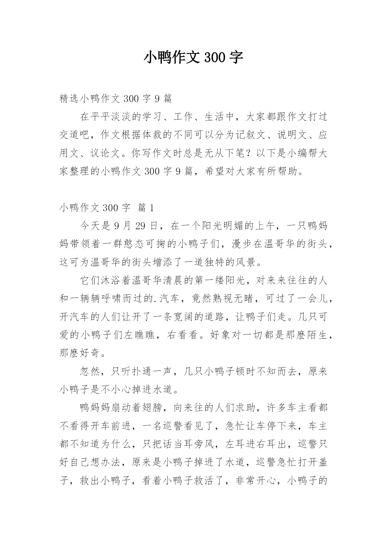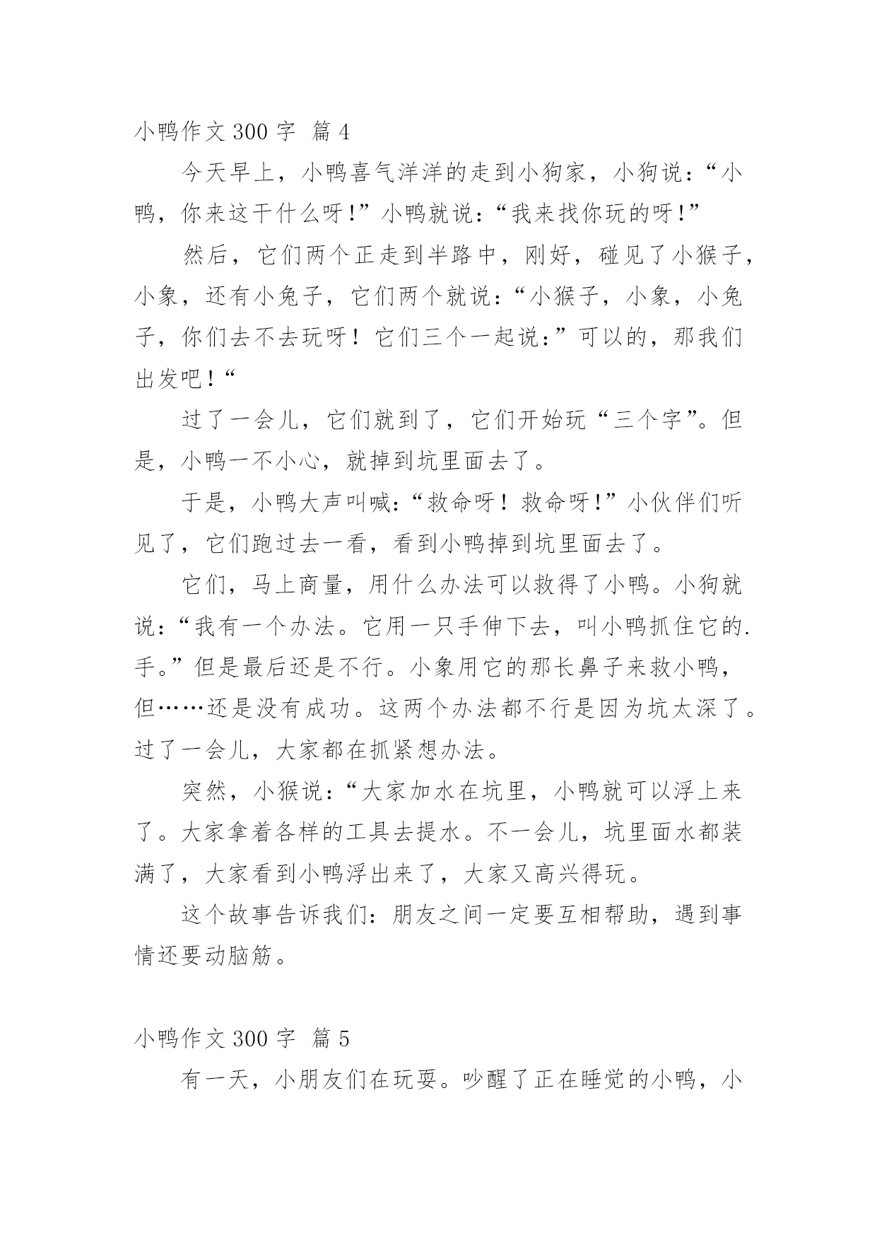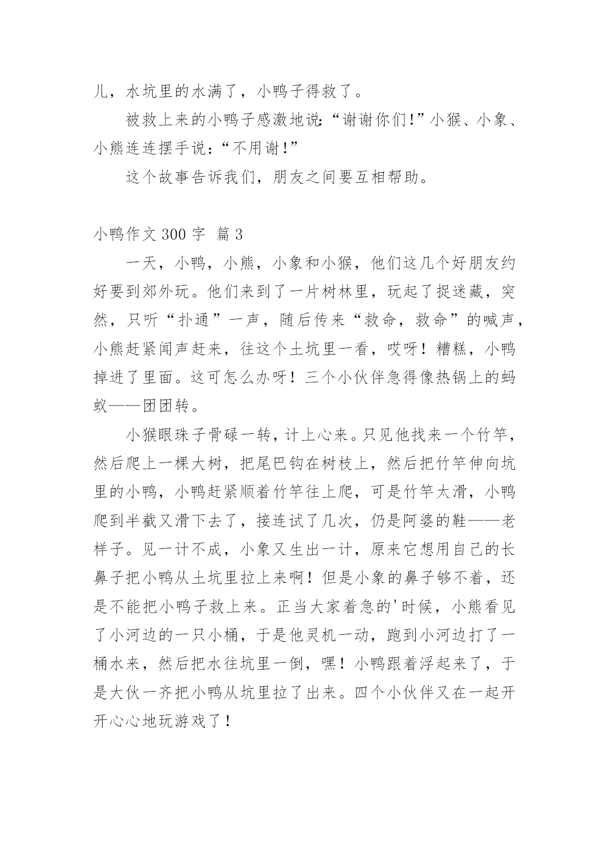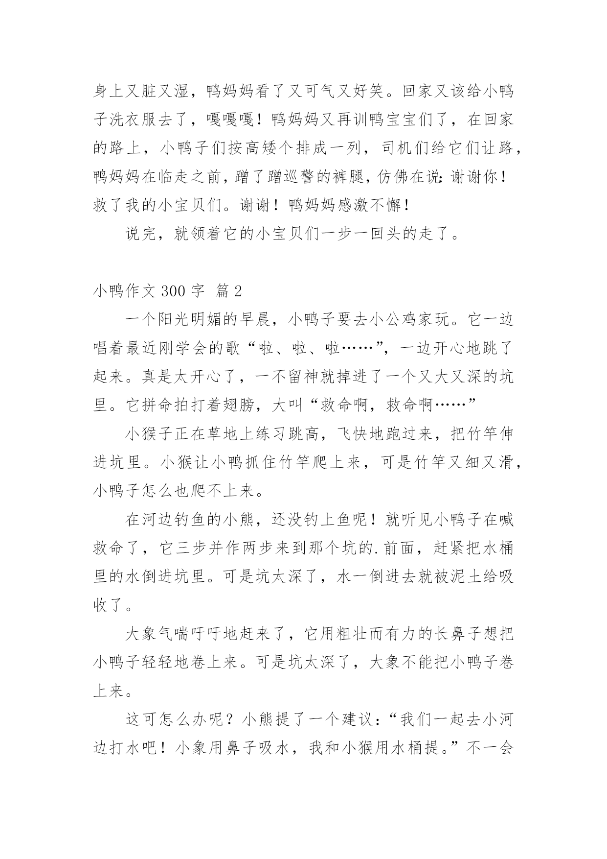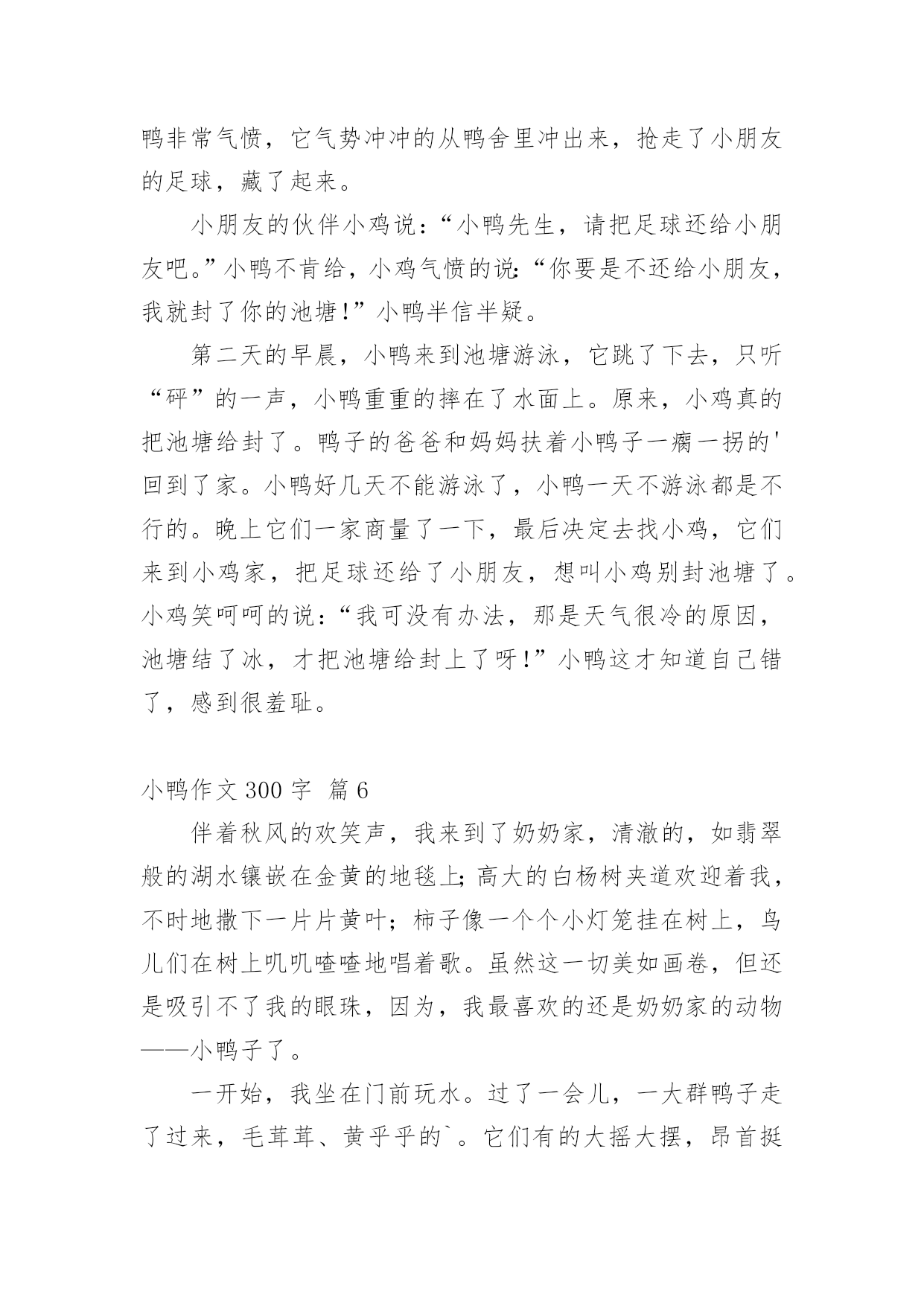 小鸭作文300字 精选小鸭作文300字9篇在平平淡淡的学习、工作、生活中,大家都跟作文打过交道吧,作文根据体裁的不同可以分为记叙文、说明文、应用文、议论文。你写作文时总是无从下笔?以下是小编帮大家整理的小鸭作文300字9篇,希望对大家有所帮助。小鸭作文300字篇1今天是9月29日,在一个阳光明媚的上午,一只鸭妈妈带领着一群憨态可掬的小鸭子们,漫步在温哥华的街头,这可为温哥华的街头增添了一道独特的风景。它们沐浴着温哥华清晨的第一缕阳光,对来来往往的人和一辆辆呼啸而过的.汽车,竟然熟视无睹,可过了一会儿,开汽车的人们让开了一条宽阔的道路,让鸭子们走。几只可爱的小鸭子们左瞧瞧,右看看。好象对一切都是那麽陌生,那麽好奇。忽然,只听扑通一声,几只小鸭子顿时不知而去,原来小鸭子是不小心掉进水道。鸭妈妈扇动着翅膀,向来往的人们求助,许多车主看都不看得开车前进,一名巡警看见了,急忙让车停下来,车主都不知道为什么,只把话当耳旁风,左耳进右耳出,巡警只好自己想办法,原来是小鸭子掉进了水道,巡警急忙打开盖子,救出小鸭子,看着小鸭子救活了,非常开心,小鸭子的身上又脏又湿,鸭妈妈看了又可气又好笑。回家又该给小鸭子洗衣服去了,嘎嘎嘎!鸭妈妈又再训鸭宝宝们了,在回家的路上,小鸭子们按高矮个排成一列,司机们给它们让路,鸭妈妈在临走之前,蹭了蹭巡警的裤腿,仿佛在说:谢谢你!救了我的小宝贝们。谢谢!鸭妈妈感激不懈!说完,就领着它的小宝贝们一步一回头的走了。小鸭作文300字篇2一个阳光明媚的早晨,小鸭子要去小公鸡家玩。它一边唱着最近刚学会的歌“啦、啦、啦……”,一边开心地跳了起来。真是太开心了,一不留神就掉进了一个又大又深的坑里。它拼命拍打着翅膀,大叫“救命啊,救命啊……”小猴子正在草地上练习跳高,飞快地跑过来,把竹竿伸进坑里。小猴让小鸭抓住竹竿爬上来,可是竹竿又细又滑,小鸭子怎么也爬不上来。在河边钓鱼的小熊,还没钓上鱼呢!就听见小鸭子在喊救命了,它三步并作两步来到那个坑的.前面,赶紧把水桶里的水倒进坑里。可是坑太深了,水一倒进去就被泥土给吸收了。大象气喘吁吁地赶来了,它用粗壮而有力的长鼻子想把小鸭子轻轻地卷上来。可是坑太深了,大象不能把小鸭子卷上来。这可怎么办呢?小熊提了一个建议:“我们一起去小河边打水吧!小象用鼻子吸水,我和小猴用水桶提。”不一会儿,水坑里的水满了,小鸭子得救了。被救上来的小鸭子感激地说:“谢谢你们!”小猴、小象、小熊连连摆手说:“不用谢!”这个故事告诉我们,朋友之间要互相帮助。小鸭作文300字篇3一天,小鸭,小熊,小象和小猴,他们这几个好朋友约好要到郊外玩。他们来到了一片树林里,玩起了捉迷藏,突然,只听“扑通”一声,随后传来“救命,救命”的喊声,小熊赶紧闻声赶来,往这个土坑里一看,哎呀!糟糕,小鸭掉进了里面。这可怎么办呀!三个小伙伴急得像热锅上的蚂蚁——团团转。小猴眼珠子骨碌一转,计上心来。只见他找来一个竹竿,然后爬上一棵大树,把尾巴钩在树枝上,然后把竹竿伸向坑里的小鸭,小鸭赶紧顺着竹竿往上爬,可是竹竿太滑,小鸭爬到半截又滑下去了,接连试了几次,仍是阿婆的鞋——老样子。见一计不成,小象又生出一计,原来它想用自己的长鼻子把小鸭从土坑里拉上来啊!但是小象的鼻子够不着,还是不能把小鸭子救上来。正当大家着急的'时候,小熊看见了小河边的一只小桶,于是他灵机一动,跑到小河边打了一桶水来,然后把水往坑里一倒,嘿!小鸭跟着浮起来了,于是大伙一齐把小鸭从坑里拉了出来。四个小伙伴又在一起开开心心地玩游戏了!小鸭作文300字篇4今天早上,小鸭喜气洋洋的走到小狗家,小狗说:“小鸭,你来这干什么呀!”小鸭就说:“我来找你玩的呀!”然后,它们两个正走到半路中,刚好,碰见了小猴子,小象,还有小兔子,它们两个就说:“小猴子,小象,小兔子,你们去不去玩呀!它们三个一起说:”可以的,那我们出发吧!“过了一会儿,它们就到了,它们开始玩“三个字”。但是,小鸭一不小心,就掉到坑里面去了。于是,小鸭大声叫喊:“救命呀!救命呀!”小伙伴们听见了,它们跑过去一看,看到小鸭掉到坑里面去了。它们,马上商量,用什么办法可以救得了小鸭。小狗就说:“我有一个办法。它用一只手伸下去,叫小鸭抓住它的.手。”但是最后还是不行。小象用它的那长鼻子来救小鸭,但……还是没有成功。这两个办法都不行是因为坑太深了。过了一会儿,大家都在抓紧想办法。突然,小猴说:“大家加水在坑里,小鸭就可以浮上来了。大家拿着各样的工具去提水。不一会儿,坑里面水都装满了,大家看到小鸭浮出来了,大家又高兴得玩。这个故事告诉我们:朋友之间一定要互相帮助,遇到事情还要动脑筋。小鸭作文300字篇5有一天,小朋友们在玩耍。吵醒了正在睡觉的小鸭,小鸭非常气愤,它气势冲冲的从鸭舍里冲出来,抢走了小朋友的足球,藏了起来。小朋友的伙伴小鸡说:“小鸭先生