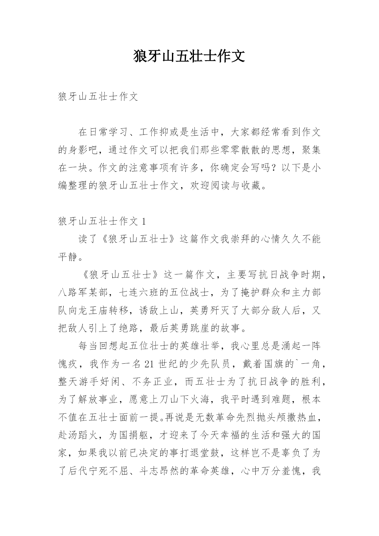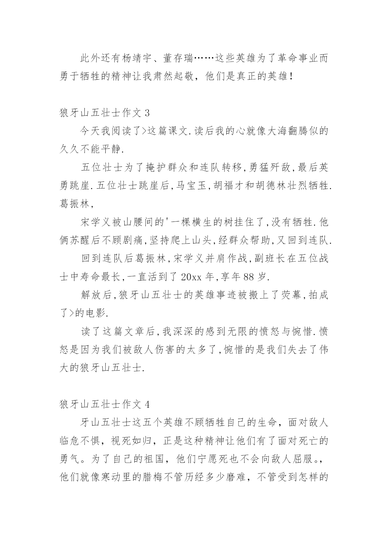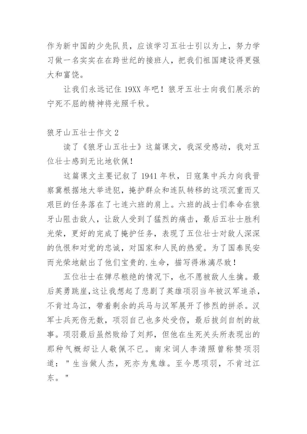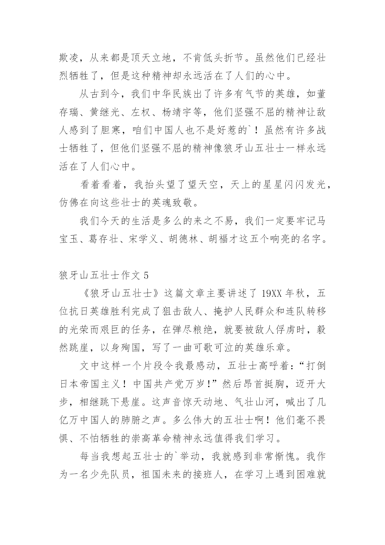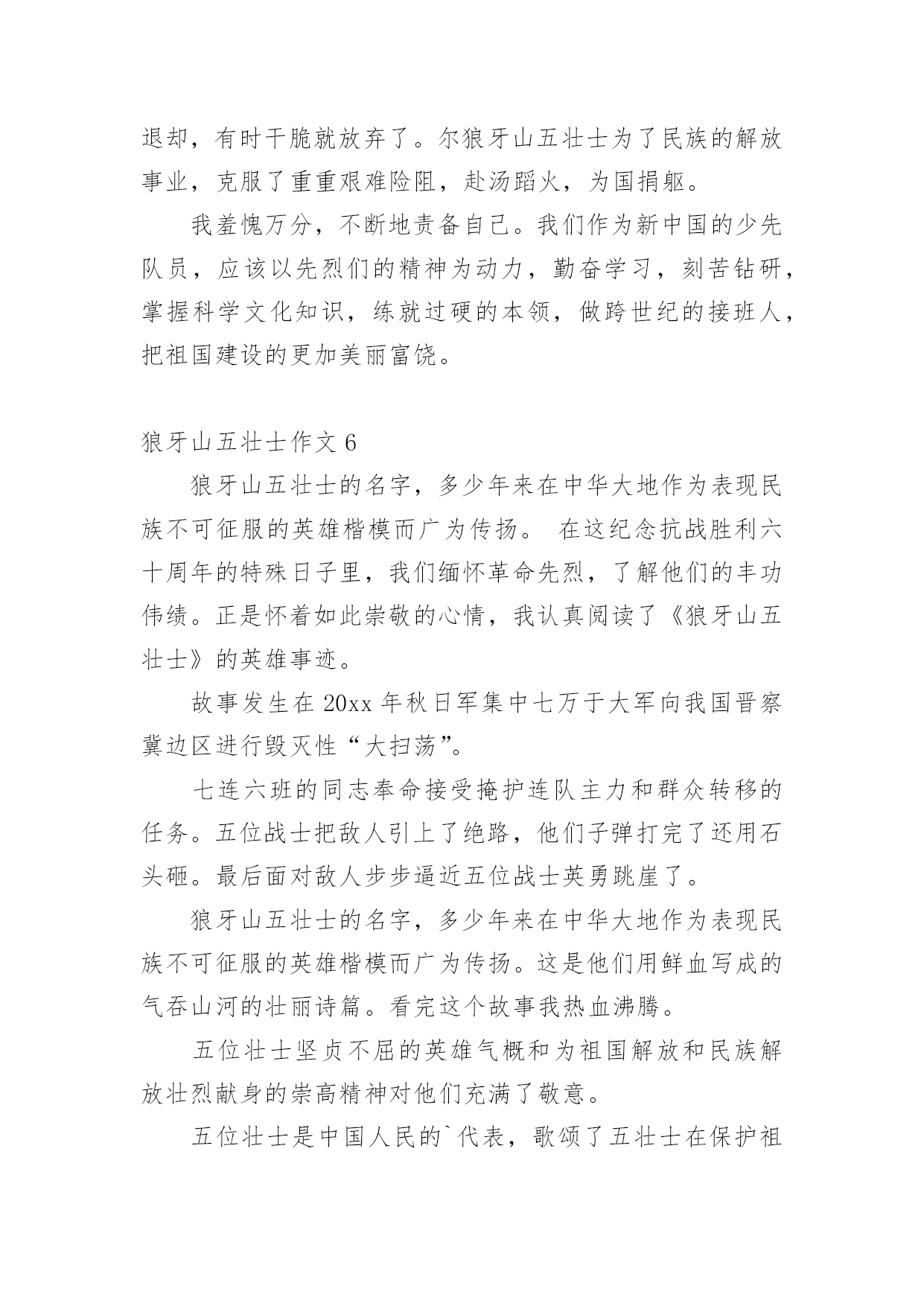 狼牙山五壮士作文 狼牙山五壮士作文在日常学习、工作抑或是生活中,大家都经常看到作文的身影吧,通过作文可以把我们那些零零散散的思想,聚集在一块。作文的注意事项有许多,你确定会写吗?以下是小编整理的狼牙山五壮士作文,欢迎阅读与收藏。狼牙山五壮士作文1读了《狼牙山五壮士》这篇作文我崇拜的心情久久不能平静。《狼牙山五壮士》这一篇作文,主要写抗日战争时期,八路军某部,七连六班的五位战士,为了掩护群众和主力部队向龙王庙转移,诱敌上山,英勇歼灭了大部分敌人后,又把敌人引上了绝路,最后英勇跳崖的故事。每当回想起五位壮士的英雄壮举,我心里总是涌起一阵愧疚,我作为一名21世纪的少先队员,戴着国旗的`一角,整天游手好闲、不务正业,而五壮士为了抗日战争的胜利,为了解放事业,愿意上刀山下火海,我平时遇到难题,根本不值在五壮士面前一提。再说是无数革命先烈抛头颅撒热血,赴汤蹈火,为国捐躯,才迎来了今天幸福的生活和强大的国家,如果我以前已决定的事打退堂鼓,这样岂不是辜负了为了后代宁死不屈、斗志昂然的革命英雄,心中万分羞愧,我作为新中国的少先队员,应该学习五壮士引以为上,努力学习做一名实实在在跨世纪的接班人,把我们祖国建设得更强大和富饶。让我们永远记住19XX年吧!狼牙五壮士向我们展示的宁死不屈的精神将光照千秋。狼牙山五壮士作文2读了《狼牙山五壮士》这篇课文,我深受感动,我对五位壮士感到无比地钦佩!这篇课文主要记叙了1941年秋,日寇集中兵力向我晋察冀根据地大举进犯,掩护群众和连队转移的这项沉重而又艰巨的任务落在了七连六班的肩上。六班的战士们奉命在狼牙山阻击敌人,让敌人受到了猛烈的痛击,最后五壮士胜利光荣,更好的完成了掩护任务,表现了五位壮士对敌人深深的仇恨和对党的忠诚,对国家和人民的热爱。为了国泰民安而光荣地献出了他们宝贵的.生命,描写得淋漓尽致!五位壮士在弹尽粮绝的情况下,也不愿被敌人生擒。最后英勇跳崖,这让我想起了悲剧了英雄项羽当年被汉军追杀,不肯过乌江,带着剩余的兵马与汉军展开了惨烈的拼杀。汉军士兵死伤无数,项羽自己也多处受伤,最后拔剑自刎的故事。项羽最后虽然败给了刘邦,但他在生死关头所表现出的那种气概却让人敬佩不已。南宋词人李清照曾称赞项羽道:"生当做人杰,死亦为鬼雄。至今思项羽,不肯过江东。"此外还有杨靖宇、董存瑞……这些英雄为了革命事业而勇于牺牲的精神让我肃然起敬,他们是真正的英雄!狼牙山五壮士作文3今天我阅读了>这篇课文.读后我的心就像大海翻腾似的久久不能平静.五位壮士为了掩护群众和连队转移,勇猛歼敌,最后英勇跳崖.五位壮士跳崖后,马宝玉,胡福才和胡德林壮烈牺牲.葛振林,宋学义被山腰间的'一棵横生的树挂住了,没有牺牲.他俩苏醒后不顾剧痛,坚持爬上山头,经群众帮助,又回到连队.回到连队后葛振林,宋学义并肩作战,副班长在五位战士中寿命最长,一直活到了20xx年,享年88岁.解放后,狼牙山五壮士的英雄事迹被搬上了荧幕,拍成了>的电影.读了这篇文章后,我深深的感到无限的愤怒与惋惜.愤怒是因为我们被敌人伤害的太多了,惋惜的是我们失去了伟大的狼牙山五壮士.狼牙山五壮士作文4牙山五壮士这五个英雄不顾牺牲自己的生命,面对敌人临危不惧,视死如归,正是这种精神让他们有了面对死亡的勇气。为了自己的祖国,他们宁愿死也不会向敌人屈服。,他们就像寒动里的腊梅不管历经多少磨难,不管受到怎样的欺凌,从来都是顶天立地,不肯低头折节。虽然他们已经壮烈牺牲了,但是这种精神却永远活在了人们的心中。从古到今,我们中华民族出了许多有气节的英雄,如董存瑞、黄继光、左权、杨靖宇等,他们坚强不屈的精神让敌人感到了胆寒,咱们中国人也不是好惹的`!虽然有许多战士牺牲了,但他们坚强不屈的精神像狼牙山五壮士一样永远活在了人们心中。看着看着,我抬头望了望天空,天上的星星闪闪发光,仿佛在向这些壮士的英魂致敬。我们今天的生活是多么的来之不易,我们一定要牢记马宝玉、葛存壮、宋学义、胡德林、胡福才这五个响亮的名字。狼牙山五壮士作文5《狼牙山五壮士》这篇文章主要讲述了19XX年秋,五位抗日英雄胜利完成了狙击敌人、掩护人民群众和连队转移的光荣而艰巨的任务,在弹尽粮绝,就要被敌人俘虏时,毅然跳崖,以身殉国,写了一曲可歌可泣的英雄乐章。文中这样一个片段令我最感动,五壮士高呼着:“打倒日本帝国主义!中国共产党万岁!”然后昂首挺胸,迈开大步,相继跳下悬崖。这声音惊天动地、气壮山河,喊出了几亿万中国人的肺腑之声。多么伟大的五壮士啊!他们毫不畏惧、不怕牺牲的崇高革命精神永远值得我们学习。每当我想起五壮士的`举动,我就感到非常惭愧。我作为一名少先队员,祖国未来的接班人,在学习上遇到困难就退却,有时干脆就放弃了。尔狼牙山五壮士为了民族的解放事业,克服了重重艰难险阻,赴汤蹈火,为国捐躯。我羞愧万分,不断地责备自己。我们作为新中国的