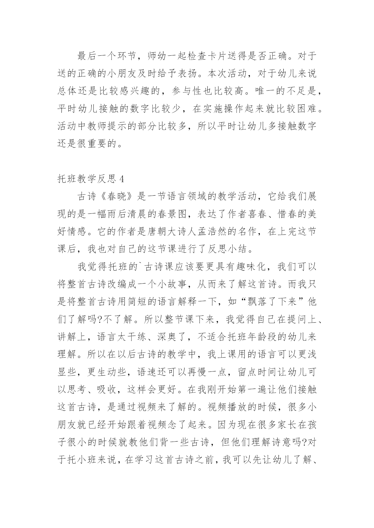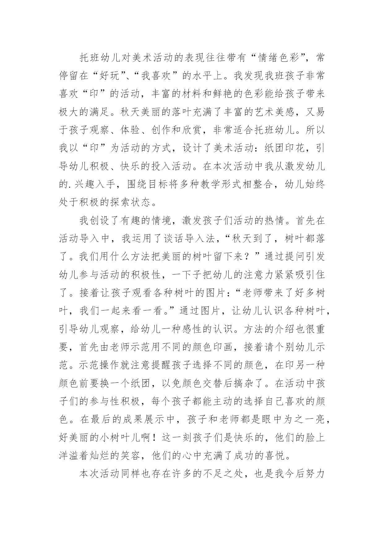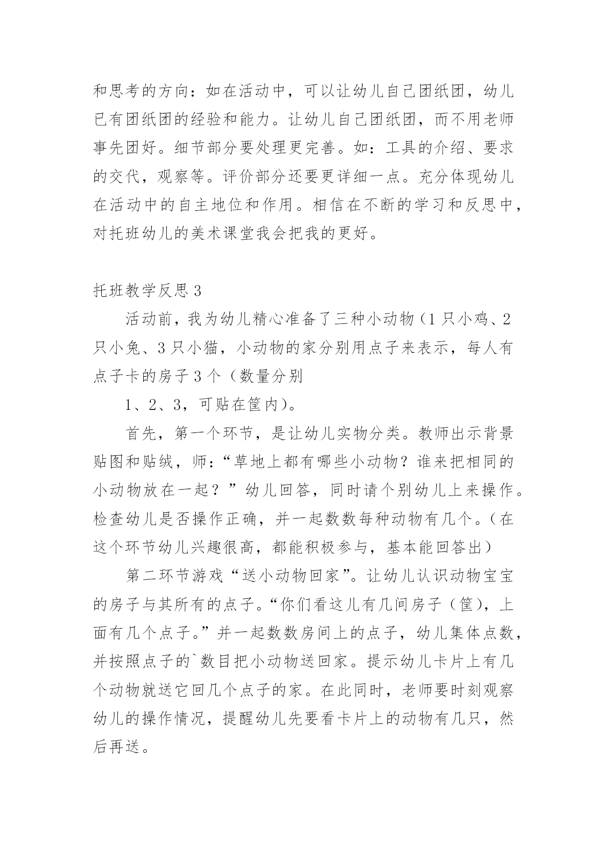 托班教学反思 托班教学反思作为一名人民老师,教学是我们的工作之一,教学反思能很好的记录下我们的课堂经验,怎样写教学反思才更能起到其作用呢?以下是小编帮大家整理的托班教学反思,供大家参考借鉴,希望可以帮助到有需要的朋友。托班教学反思1关于《小山羊犄角》的这故事,我只写了一节课中的重点部分,还有明确了目标是让宝宝理解故事就行,我没有讲的太复杂,宝宝对什么事感兴趣的`时间很短,但是我这么说不是推卸我课上不足的地方。为此我反思了,上面说了我个人的想法。下面我说说不足的地方:1、讲故事之前我没有用引入,有自己的想法。2、这节课我只达到的目标,过程有些简单。3、结尾时加上游戏,能延长宝宝的兴趣,这点是我可后想到的,有点晚了。反思后让我懂得什么事都不是绝对的,有些方面是我没想到的,是我的过错。经过这件事后,我在以后的工作上有了进步。托班教学反思2托班幼儿对美术活动的表现往往带有“情绪色彩”,常停留在“好玩”、“我喜欢”的水平上。我发现我班孩子非常喜欢“印”的活动,丰富的材料和鲜艳的色彩能给孩子带来极大的满足。秋天美丽的落叶充满了丰富的艺术美感,又易于孩子观察、体验、创作和欣赏,非常适合托班幼儿。所以我以“印”为活动的方式,设计了美术活动:纸团印花,引导幼儿积极、快乐的投入活动。在本次活动中我从激发幼儿的.兴趣入手,围绕目标将多种教学形式相整合,幼儿始终处于积极的探索状态。我创设了有趣的情境,激发孩子们活动的热情。首先在活动导入中,我运用了谈话导入法,“秋天到了,树叶都落了。我们用什么方法把美丽的树叶留下来?”通过提问引发幼儿参与活动的积极性,一下子把幼儿的注意力紧紧吸引住了。接着让孩子观看各种树叶的图片:“老师带来了好多树叶,我们一起来看一看。”通过图片,让幼儿认识各种树叶,引导幼儿观察,给幼儿一种感性的认识。方法的介绍也很重要,首先由老师示范用不同的颜色印画,接着请个别幼儿示范。示范操作就注意提醒孩子选择不同的颜色,在印另一种颜色前要换一个纸团,以免颜色交替后搞杂了。在活动中孩子们的参与性积极,每个孩子都能主动的选择自己喜欢的颜色。在最后的成果展示中,孩子和老师都是眼中为之一亮,好美丽的小树叶儿啊!这一刻孩子们是快乐的,他们的脸上洋溢着灿烂的笑容,他们的心中充满了成功的喜悦。本次活动同样也存在许多的不足之处,也是我今后努力和思考的方向:如在活动中,可以让幼儿自己团纸团,幼儿已有团纸团的经验和能力。让幼儿自己团纸团,而不用老师事先团好。细节部分要处理更完善。如:工具的介绍、要求的交代,观察等。评价部分还要更详细一点。充分体现幼儿在活动中的自主地位和作用。相信在不断的学习和反思中,对托班幼儿的美术课堂我会把我的更好。托班教学反思3活动前,我为幼儿精心准备了三种小动物(1只小鸡、2只小兔、3只小猫,小动物的家分别用点子来表示,每人有点子卡的房子3个(数量分别1、2、3,可贴在筐内)。首先,第一个环节,是让幼儿实物分类。教师出示背景贴图和贴绒,师:“草地上都有哪些小动物?谁来把相同的小动物放在一起?”幼儿回答,同时请个别幼儿上来操作。检查幼儿是否操作正确,并一起数数每种动物有几个。(在这个环节幼儿兴趣很高,都能积极参与,基本能回答出)第二环节游戏“送小动物回家”。让幼儿认识动物宝宝的房子与其所有的点子。“你们看这儿有几间房子(筐),上面有几个点子。”并一起数数房间上的点子,幼儿集体点数,并按照点子的`数目把小动物送回家。提示幼儿卡片上有几个动物就送它回几个点子的家。在此同时,老师要时刻观察幼儿的操作情况,提醒幼儿先要看卡片上的动物有几只,然后再送。最后一个环节,师幼一起检查卡片送得是否正确。对于送的正确的小朋友及时给予表扬。本次活动,对于幼儿来说总体还是比较感兴趣的,参与性也比较高。唯一的不足是,平时幼儿接触的数字比较少,在实施操作起来就比较困难。活动中教师提示的部分比较多,所以平时让幼儿多接触数字还是很重要的。托班教学反思4古诗《春晓》是一节语言领域的教学活动,它给我们展现的是一幅雨后清晨的春景图,表达了作者喜春、惜春的美好情感。它的作者是唐朝大诗人孟浩然的名作,在上完这节课后,我也对自己的这节课进行了反思小结。我觉得托班的`古诗课应该要更具有趣味化,我们可以将整首古诗改编成一个小故事,从而来了解这首诗。而我只是将整首古诗用简短的语言解释一下,如“飘落了下来”他们了解吗?不了解。所以整节课下来,我觉得自己在提问上、讲解上,语言太干练、深奥了,不适合托班年龄段的幼儿来理解。所以在以后古诗的教学中,我上课用的语言可以更浅显些,更生动些,语速还可以再慢一点,留点时间让幼儿可以思考、吸收,这样会更好。在我刚开始第一遍让他们接触这首古诗,是通过视频来了解的。视频播放的时候,很多小朋友就已经开始跟着视频念了起来。因为现在很多家长在孩子很小的时候就教他们背