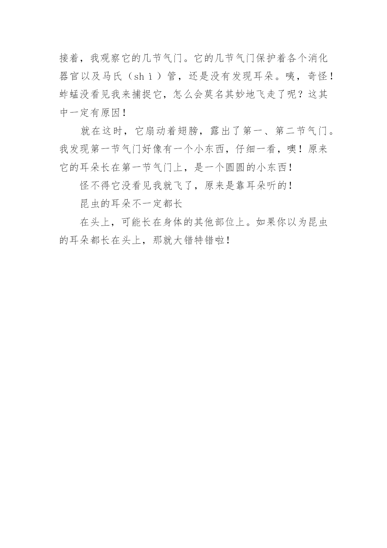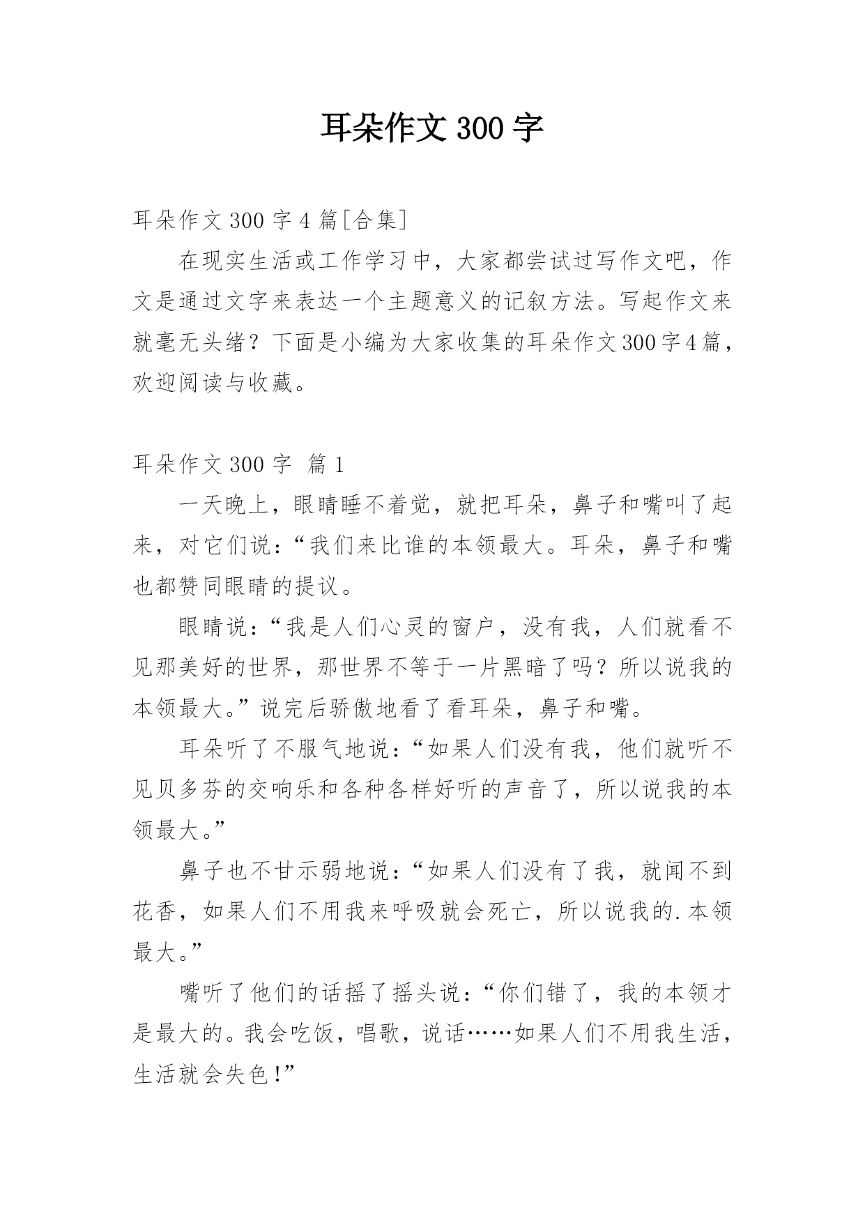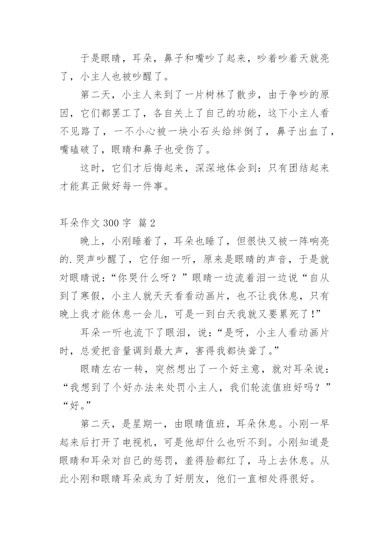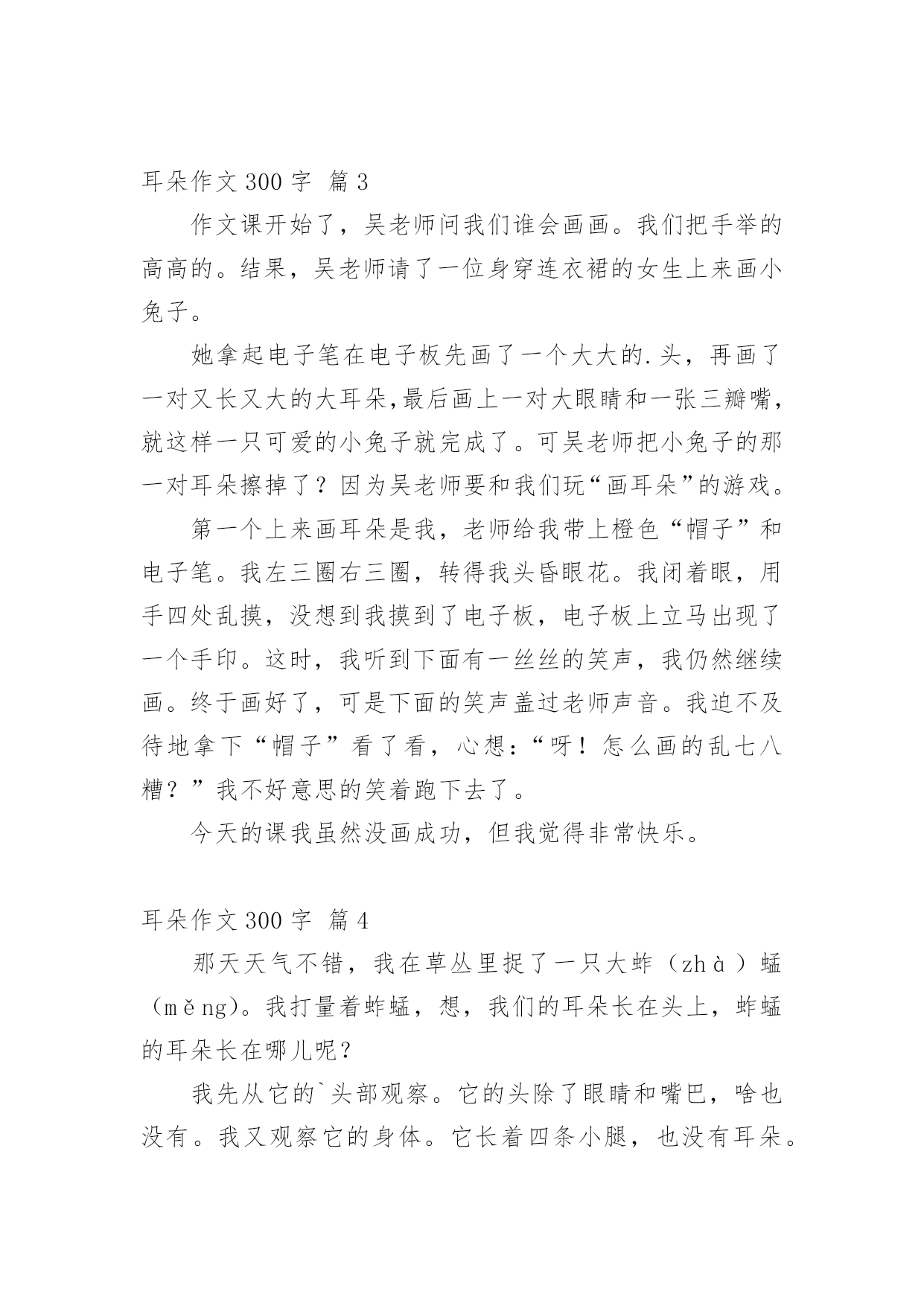 耳朵作文300字 耳朵作文300字4篇[合集]在现实生活或工作学习中,大家都尝试过写作文吧,作文是通过文字来表达一个主题意义的记叙方法。写起作文来就毫无头绪?下面是小编为大家收集的耳朵作文300字4篇,欢迎阅读与收藏。耳朵作文300字篇1一天晚上,眼睛睡不着觉,就把耳朵,鼻子和嘴叫了起来,对它们说:“我们来比谁的本领最大。耳朵,鼻子和嘴也都赞同眼睛的提议。眼睛说:“我是人们心灵的窗户,没有我,人们就看不见那美好的世界,那世界不等于一片黑暗了吗?所以说我的本领最大。”说完后骄傲地看了看耳朵,鼻子和嘴。耳朵听了不服气地说:“如果人们没有我,他们就听不见贝多芬的交响乐和各种各样好听的声音了,所以说我的本领最大。”鼻子也不甘示弱地说:“如果人们没有了我,就闻不到花香,如果人们不用我来呼吸就会死亡,所以说我的.本领最大。”嘴听了他们的话摇了摇头说:“你们错了,我的本领才是最大的。我会吃饭,唱歌,说话……如果人们不用我生活,生活就会失色!”于是眼睛,耳朵,鼻子和嘴吵了起来,吵着吵着天就亮了,小主人也被吵醒了。第二天,小主人来到了一片树林了散步,由于争吵的原因,它们都罢工了,各自关上了自己的功能,这下小主人看不见路了,一不小心被一块小石头给绊倒了,鼻子出血了,嘴磕破了,眼睛和鼻子也受伤了。这时,它们才后悔起来,深深地体会到:只有团结起来才能真正做好每一件事。耳朵作文300字篇2晚上,小刚睡着了,耳朵也睡了,但很快又被一阵响亮的.哭声吵醒了,它仔细一听,原来是眼睛的声音,于是就对眼睛说:“你哭什么呀?”眼睛一边流着泪一边说“自从到了寒假,小主人就天天看看动画片,也不让我休息,只有晚上我才能休息一会儿,可是一到白天我就又要累死了!”耳朵一听也流下了眼泪,说:“是呀,小主人看动画片时,总爱把音量调到最大声,害得我都快聋了。”眼睛左右一转,突然想出了一个好主意,就对耳朵说:“我想到了个好办法来处罚小主人,我们轮流值班好吗?”“好。”第二天,是星期一,由眼睛值班,耳朵休息。小刚一早起来后打开了电视机,可是他却什么也听不到。小刚知道是眼睛和耳朵对自己的惩罚,羞得脸都红了,马上去休息。从此小刚和眼睛耳朵成为了好朋友,他们一直相处得很好。耳朵作文300字篇3作文课开始了,吴老师问我们谁会画画。我们把手举的高高的。结果,吴老师请了一位身穿连衣裙的女生上来画小兔子。她拿起电子笔在电子板先画了一个大大的.头,再画了一对又长又大的大耳朵,最后画上一对大眼睛和一张三瓣嘴,就这样一只可爱的小兔子就完成了。可吴老师把小兔子的那一对耳朵擦掉了?因为吴老师要和我们玩“画耳朵”的游戏。第一个上来画耳朵是我,老师给我带上橙色“帽子”和电子笔。我左三圈右三圈,转得我头昏眼花。我闭着眼,用手四处乱摸,没想到我摸到了电子板,电子板上立马出现了一个手印。这时,我听到下面有一丝丝的笑声,我仍然继续画。终于画好了,可是下面的笑声盖过老师声音。我迫不及待地拿下“帽子”看了看,心想:“呀!怎么画的乱七八糟?”我不好意思的笑着跑下去了。今天的课我虽然没画成功,但我觉得非常快乐。耳朵作文300字篇4那天天气不错,我在草丛里捉了一只大蚱(zhà)蜢(měng)。我打量着蚱蜢,想,我们的耳朵长在头上,蚱蜢的耳朵长在哪儿呢?我先从它的`头部观察。它的头除了眼睛和嘴巴,啥也没有。我又观察它的身体。它长着四条小腿,也没有耳朵。接着,我观察它的几节气门。它的几节气门保护着各个消化器官以及马氏(shì)管,还是没有发现耳朵。咦,奇怪!蚱蜢没看见我来捕捉它,怎么会莫名其妙地飞走了呢?这其中一定有原因!就在这时,它扇动着翅膀,露出了第一、第二节气门。我发现第一节气门好像有一个小东西,仔细一看,噢!原来它的耳朵长在第一节气门上,是一个圆圆的小东西!怪不得它没看见我就飞了,原来是靠耳朵听的!昆虫的耳朵不一定都长在头上,可能长在身体的其他部位上。如果你以为昆虫的耳朵都长在头上,那就大错特错啦!