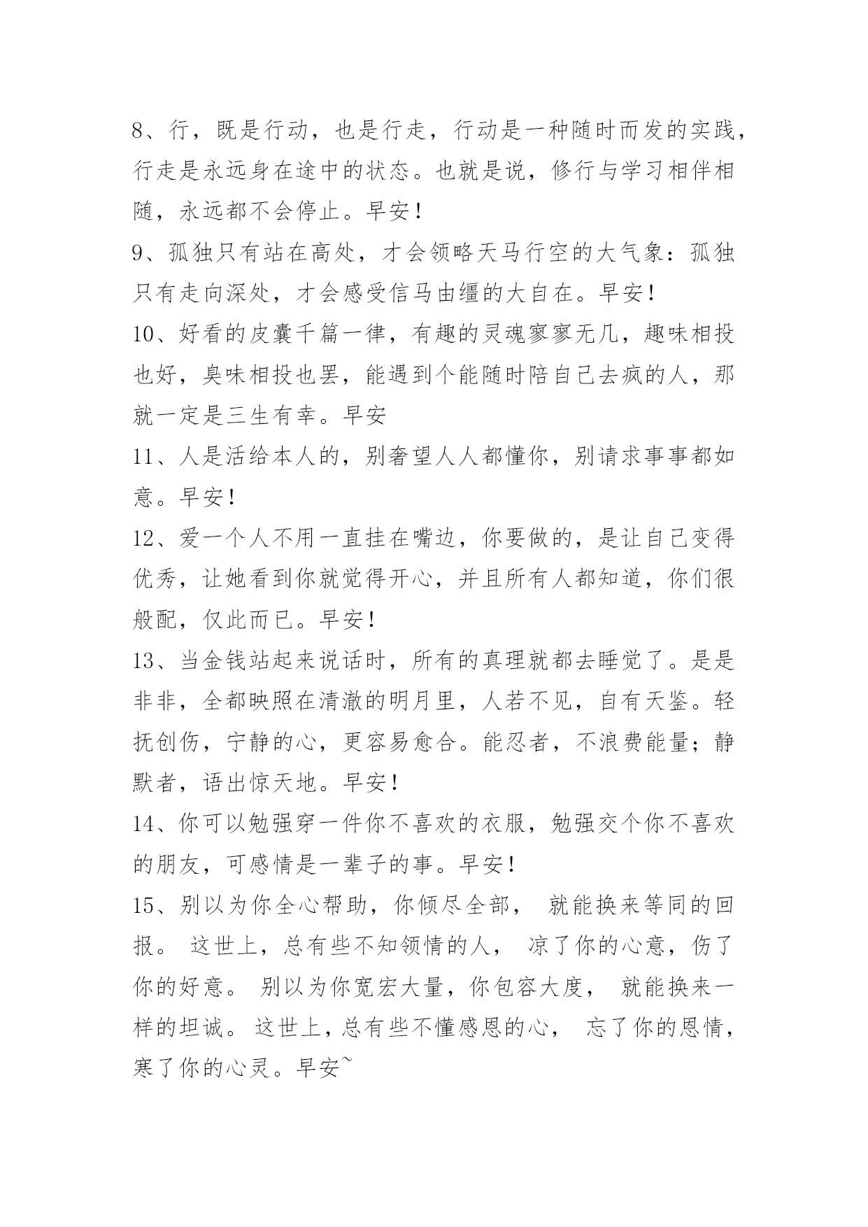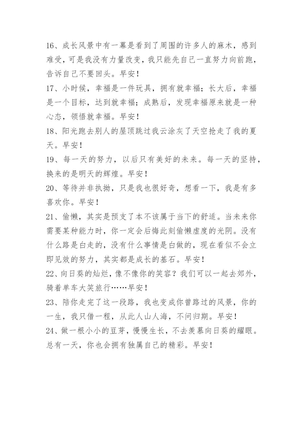 简单的新版早安问候语 简单的新版早安问候语24句不以物喜,不以己悲,心灵淡然若水,人生如行云流水,自在、安详。早安!下面是小编帮大家整理的新版早安问候语24句,欢迎大家分享。1、热热烈烈的大多轰然倒下,平平淡淡却最终震撼人心,执手之时,冷暖两心知;执手之时,悲喜两忘。早安!2、每一个已成为现实的理想,都是用汗水凝结而成的珍珠在闪光。早安!3、俗话说虎毒不食子,俗话又说无毒丈夫,大千世界,纷扰人生,面对抉择,你将何去何从,祝你思想放开,坦然选择,闯出霸气人生路!早安!4、不懂闭嘴的人迟早会吃亏。早安!5、有时候宁可自己独处,也不要和融不进去的人待在一起,不要刻意的去维持关系,让自己越来越虚伪。早安!6、金矿的山上还有着其他花朵,除了具备发现的眼睛外,还需要有着肯流汗的心。成功提醒:金子常常就埋在身旁的泥土里,勤奋是最好的点金指。早安!7、生活的强者,会及时调整自己的心态,让心情时常保持积极向上,充满阳光。生活中,很多时候都需要我们有耐心,耐心做人,耐心做事,更要耐心生活,倘若一味地追求快,往往会适得其反。早安,朋友。8、行,既是行动,也是行走,行动是一种随时而发的实践,行走是永远身在途中的状态。也就是说,修行与学习相伴相随,永远都不会停止。早安!9、孤独只有站在高处,才会领略天马行空的大气象:孤独只有走向深处,才会感受信马由缰的大自在。早安!10、好看的皮囊千篇一律,有趣的灵魂寥寥无几,趣味相投也好,臭味相投也罢,能遇到个能随时陪自己去疯的人,那就一定是三生有幸。早安11、人是活给本人的,别奢望人人都懂你,别请求事事都如意。早安!12、爱一个人不用一直挂在嘴边,你要做的,是让自己变得优秀,让她看到你就觉得开心,并且所有人都知道,你们很般配,仅此而已。早安!13、当金钱站起来说话时,所有的真理就都去睡觉了。是是非非,全都映照在清澈的明月里,人若不见,自有天鉴。轻抚创伤,宁静的心,更容易愈合。能忍者,不浪费能量;静默者,语出惊天地。早安!14、你可以勉强穿一件你不喜欢的衣服,勉强交个你不喜欢的朋友,可感情是一辈子的事。早安!15、别以为你全心帮助,你倾尽全部,就能换来等同的回报。这世上,总有些不知领情的人,凉了你的心意,伤了你的好意。别以为你宽宏大量,你包容大度,就能换来一样的坦诚。这世上,总有些不懂感恩的心,忘了你的恩情,寒了你的心灵。早安~16、成长风景中有一幕是看到了周围的许多人的麻木,感到难受,可是我没有力量改变,我只能先自己一直努力向前跑,告诉自己不要回头。早安!17、小时候,幸福是一件玩具,拥有就幸福;长大后,幸福是一个目标,达到就幸福;成熟后,发现幸福原来就是一种心态,领悟就幸福。早安!18、阳光跑去别人的屋顶跳过我云涂灰了天空抢走了我的夏天。早安!19、每一天的努力,以后只有美好的未来。每一天的坚持,换来的是明天的辉煌。早安!20、等待并非执拗,只是我也很好奇,想看一下,我是有多喜欢你。早安!21、偷懒,其实是预支了本不该属于当下的舒适。当未来你需要某种能力时,你一定会后悔此刻偷懒虚度的光阴。没有什么路是白走的,没有什么事情是白做的,现在看似不会立即见效的努力,其实都是成长的基石。早安!22、向日葵的灿烂,像不像你的笑容?我们可以一起去郊外,骑着单车大笑旅行……早安!23、陪你走完了这一段路,我也变成你曾路过的风景,你的一生,我只借一程,从此人山人海,不问归期。早安!24、做一根小小的豆芽,慢慢生长,不去羡慕向日葵的耀眼。总有一天,你也会拥有独属自己的精彩。早安!