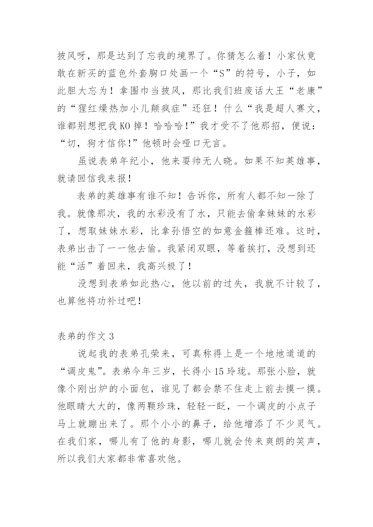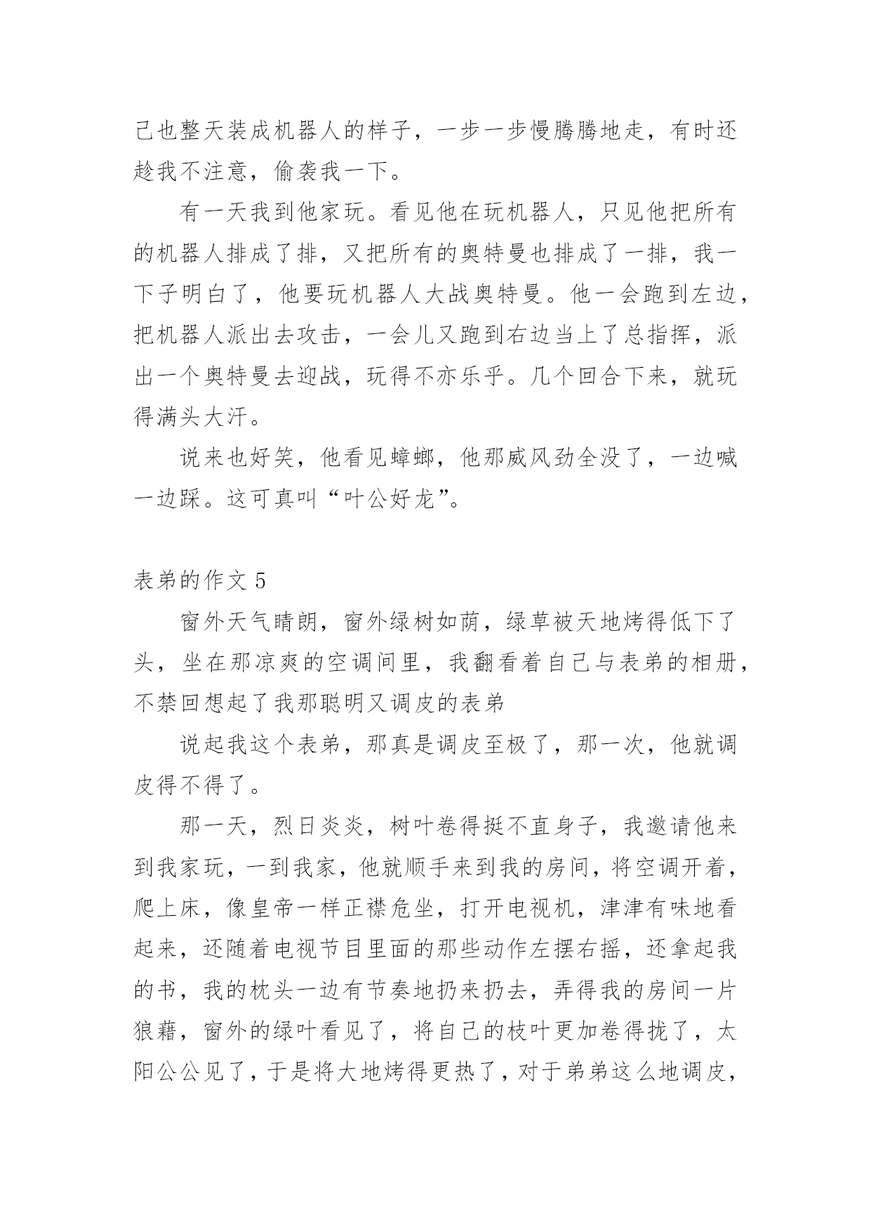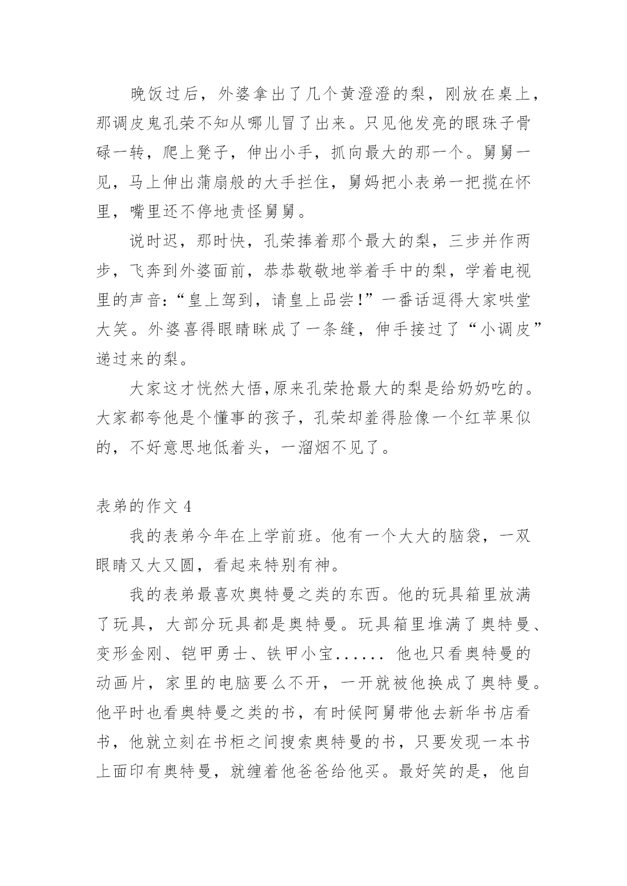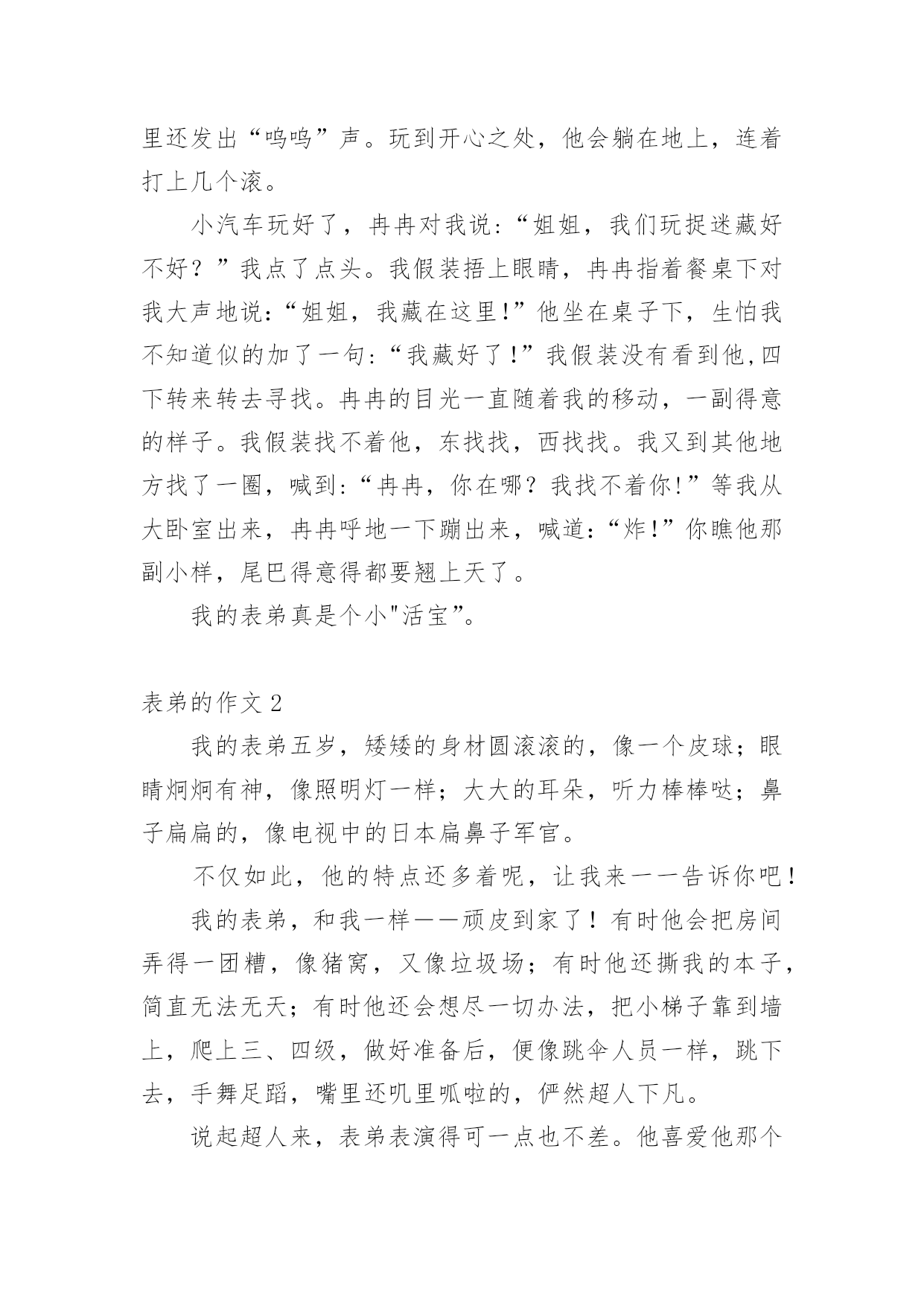 表弟的作文 表弟的作文【热】在平时的学习、工作或生活中,大家都接触过作文吧,作文是从内部言语向外部言语的过渡,即从经过压缩的简要的、自己能明白的语言,向开展的、具有规范语法结构的、能为他人所理解的外部语言形式的转化。那么,怎么去写作文呢?以下是小编收集整理的表弟的作文,欢迎阅读与收藏。表弟的作文1我有一个可爱的小表弟,小名叫冉冉。他今年三岁了,调皮时,喜欢用眼睛斜着看你,透着一翱机灵样。他精力充沛,仿佛不知道疲倦,在家里一刻都不闲着。暑假里的一天,我来到表哥家玩。一进门,冉冉就从卧空里冲了过来,一下子抱住了我,一副讨好的笑脸,对我撒娇:“姐姐,你给我带了什么好吃的?”我从包里拿出来奶酪棒的一瞬间,冉冉两眼放光,如闪电般从我的手中把奶酪棒抢走。他迅速地把外壳撕开,一口塞进嘴里,像饿狼似的。吃完后,他满意地咂咂嘴,一脸满足样。接着,他骑上扭扭车,围着客厅转了一圈又转一圈。他的车技还真不错,拐弯处,身体灵活地一斜,几乎不用减速稳稳地拐了过去。玩了一会儿,他又换新的游戏项目了,从玩具箱里把所有的玩具都倒了出来,弄得满地都是。他把所有的汽车排成一排,然后一辆接一辆,把它们推向前方,嘴里还发出“呜呜”声。玩到开心之处,他会躺在地上,连着打上几个滚。小汽车玩好了,冉冉对我说:“姐姐,我们玩捉迷藏好不好?”我点了点头。我假装捂上眼睛,冉冉指着餐桌下对我大声地说:“姐姐,我藏在这里!”他坐在桌子下,生怕我不知道似的加了一句:“我藏好了!”我假装没有看到他,四下转来转去寻找。冉冉的目光一直随着我的移动,一副得意的样子。我假装找不着他,东找找,西找找。我又到其他地方找了一圈,喊到:“冉冉,你在哪?我找不着你!”等我从大卧室出来,冉冉呼地一下蹦出来,喊道:“炸!”你瞧他那副小样,尾巴得意得都要翘上天了。我的表弟真是个小"活宝”。表弟的作文2我的表弟五岁,矮矮的身材圆滚滚的,像一个皮球;眼睛炯炯有神,像照明灯一样;大大的耳朵,听力棒棒哒;鼻子扁扁的,像电视中的日本扁鼻子军官。不仅如此,他的特点还多着呢,让我来一一告诉你吧!我的表弟,和我一样――顽皮到家了!有时他会把房间弄得一团糟,像猪窝,又像垃圾场;有时他还撕我的本子,简直无法无天;有时他还会想尽一切办法,把小梯子靠到墙上,爬上三、四级,做好准备后,便像跳伞人员一样,跳下去,手舞足蹈,嘴里还叽里呱啦的,俨然超人下凡。说起超人来,表弟表演得可一点也不差。他喜爱他那个披风呀,那是达到了忘我的境界了。你猜怎么着!小家伙竟敢在新买的蓝色外套胸口处画一个“S”的符号,小子,如此胆大忘为!拿围巾当披风,那比我们班废话大王“老康”的“猩红燥热加小儿颠疯症”还狂!什么“我是超人赛文,谁都别想把我KO掉!哈哈哈!”我才受不了他那招,便说:“切,狗才信你!”他顿时会哑口无言。虽说表弟年纪小,他来耍帅无人晓。如果不知英雄事,就请回信我来报!表弟的英雄事有谁不知!告诉你,所有人都不知-除了我。就像那次,我的水彩没有了水,只能去偷拿妹妹的水彩了,想取妹妹水彩,比拿孙悟空的如意金箍棒还难。这时,表弟出击了一一他去偷。我紧闭双眼,等着挨打,没想到还能“活”着回来,我高兴极了!没想到表弟如此热心,他以前的过失,我就不计较了,也算他将功补过吧!表弟的作文3说起我的表弟孔荣来,可真称得上是一个地地道道的“调皮鬼”。表弟今年三岁,长得小15玲珑。那张小脸,就像个刚出炉的小面包,谁见了都会禁不住走上前去摸一摸。他眼睛大大的,像两颗珍珠,轻轻一眨,一个调皮的小点子马上就蹦出来了。那个小小的鼻子,给他增添了不少灵气。在我们家,哪儿有了他的身影,哪儿就会传来爽朗的笑声,所以我们大家都非常喜欢他。晚饭过后,外婆拿出了几个黄澄澄的梨,刚放在桌上,那调皮鬼孔荣不知从哪儿冒了出来。只见他发亮的眼珠子骨碌一转,爬上凳子,伸出小手,抓向最大的那一个。舅舅一见,马上伸出蒲扇般的大手拦住,舅妈把小表弟一把揽在怀里,嘴里还不停地责怪舅舅。说时迟,那时快,孔荣捧着那个最大的梨,三步并作两步,飞奔到外婆面前,恭恭敬敬地举着手中的梨,学着电视里的声音:“皇上驾到,请皇上品尝!”一番话逗得大家哄堂大笑。外婆喜得眼睛眯成了一条缝,伸手接过了“小调皮”递过来的梨。大家这才恍然大悟,原来孔荣抢最大的梨是给奶奶吃的。大家都夸他是个懂事的孩子,孔荣却羞得脸像一个红苹果似的,不好意思地低着头,一溜烟不见了。表弟的作文4我的表弟今年在上学前班。他有一个大大的脑袋,一双眼睛又大又圆,看起来特别有神。我的表弟最喜欢奥特曼之类的东西。他的玩具箱里放满了玩具,大部分玩具都是奥特曼。玩具箱里堆满了奥特曼、变形金刚、铠甲勇士、铁甲小宝......他也只看奥特曼的动画片,家里的电脑要么不开,一开就被他换成了奥特曼。他平时也看奥特曼之类的书,有时候阿舅带他去新华书店看书,他就立刻在书柜之间搜索奥特曼