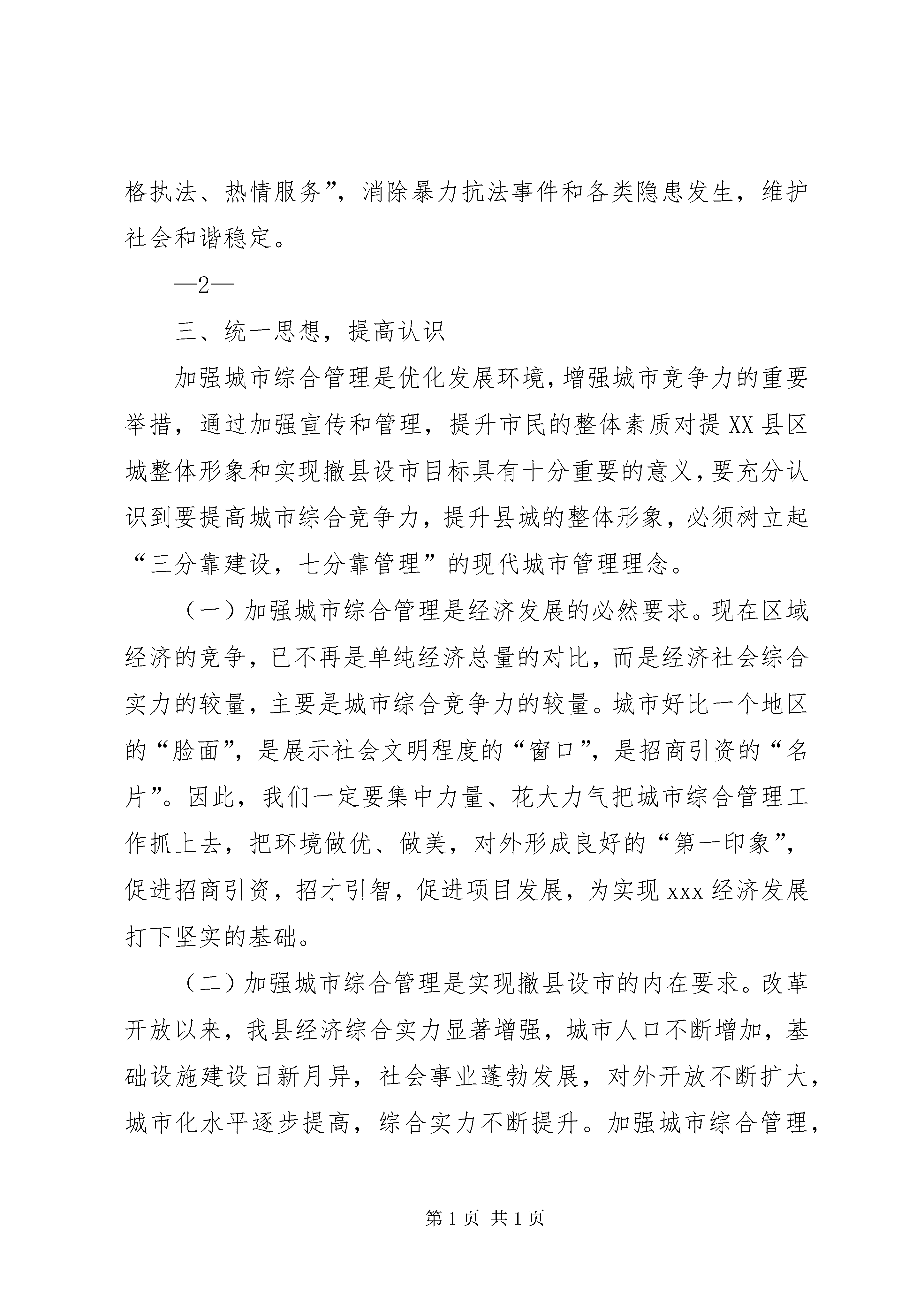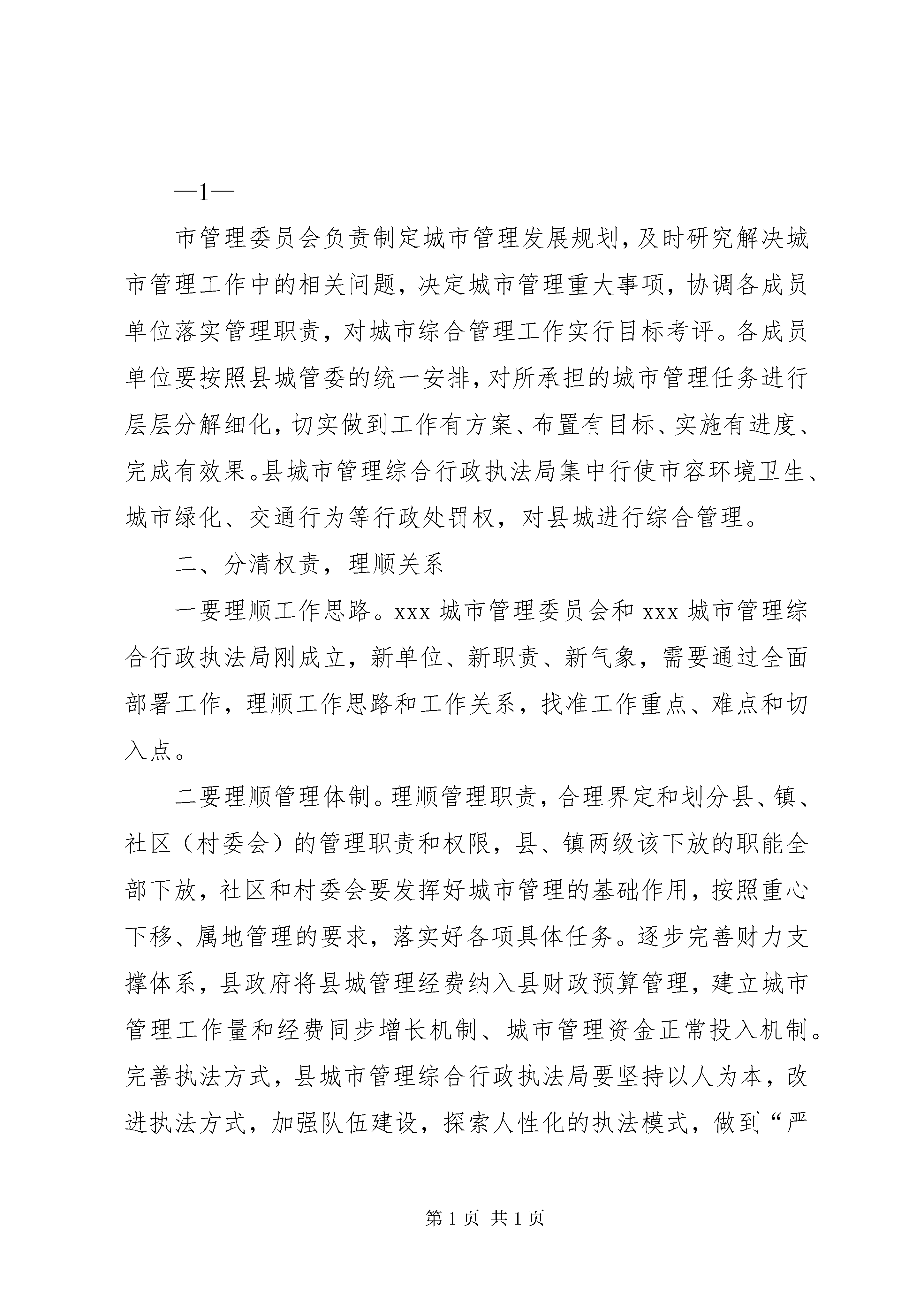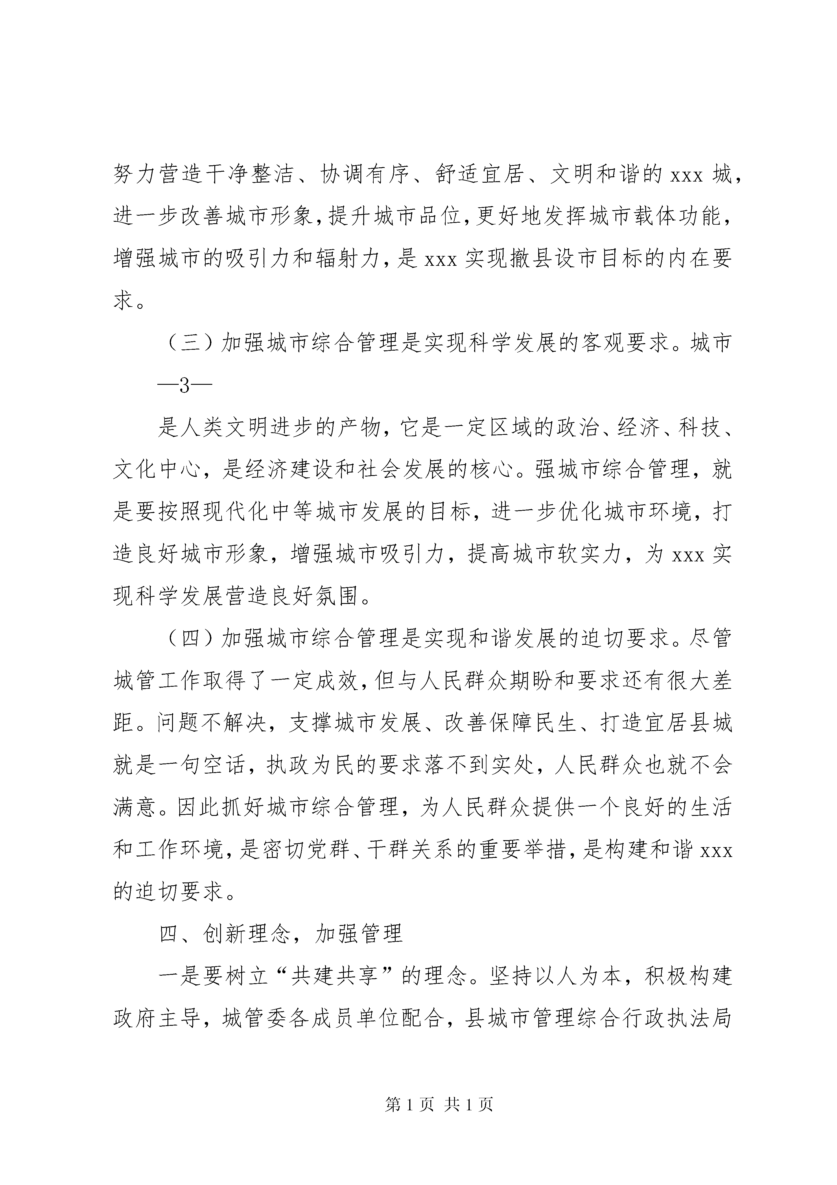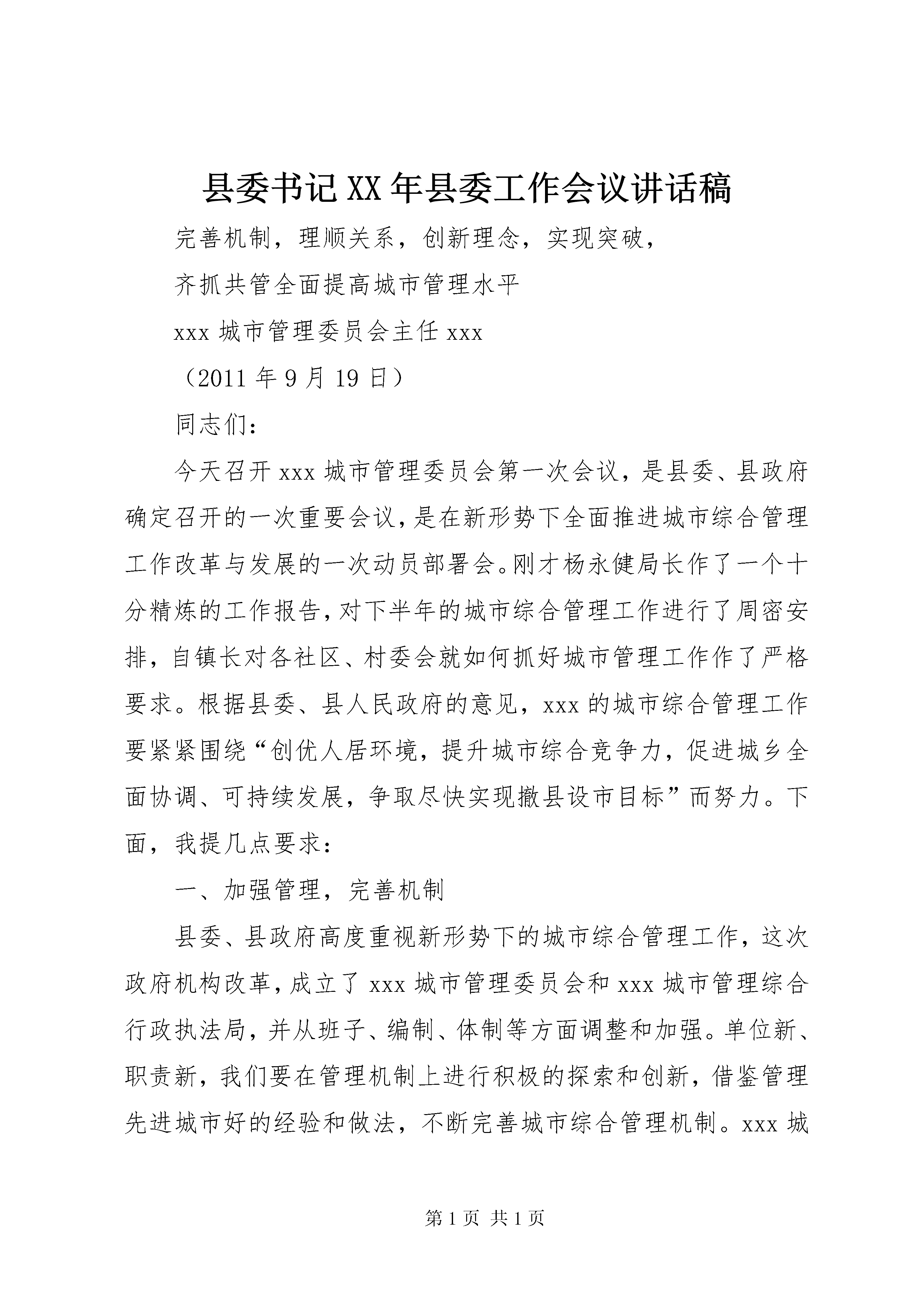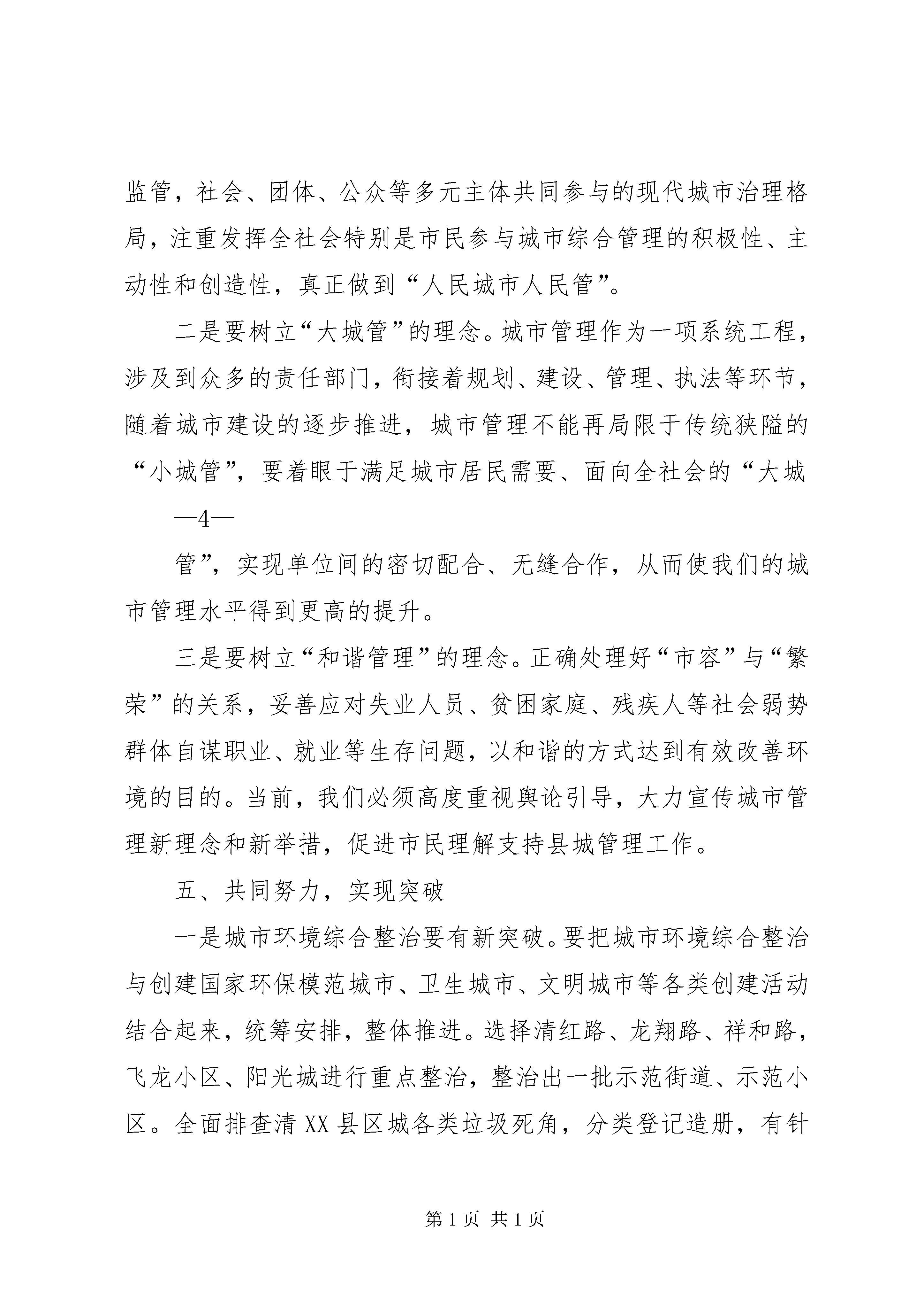 县委书记XX年县委工作会议讲话稿完善机制,理顺关系,创新理念,实现突破,齐抓共管全面提高城市管理水平xxx城市管理委员会主任xxx(2011年9月19日)同志们:今天召开xxx城市管理委员会第一次会议,是县委、县政府确定召开的一次重要会议,是在新形势下全面推进城市综合管理工作改革与发展的一次动员部署会。刚才杨永健局长作了一个十分精炼的工作报告,对下半年的城市综合管理工作进行了周密安排,自镇长对各社区、村委会就如何抓好城市管理工作作了严格要求。根据县委、县人民政府的意见,xxx的城市综合管理工作要紧紧围绕“创优人居环境,提升城市综合竞争力,促进城乡全面协调、可持续发展,争取尽快实现撤县设市目标”而努力。下面,我提几点要求:一、加强管理,完善机制县委、县政府高度重视新形势下的城市综合管理工作,这次政府机构改革,成立了xxx城市管理委员会和xxx城市管理综合行政执法局,并从班子、编制、体制等方面调整和加强。单位新、职责新,我们要在管理机制上进行积极的探索和创新,借鉴管理先进城市好的经验和做法,不断完善城市综合管理机制。xxx城—1—市管理委员会负责制定城市管理发展规划,及时研究解决城市管理工作中的相关问题,决定城市管理重大事项,协调各成员单位落实管理职责,对城市综合管理工作实行目标考评。各成员单位要按照县城管委的统一安排,对所承担的城市管理任务进行层层分解细化,切实做到工作有方案、布置有目标、实施有进度、完成有效果。县城市管理综合行政执法局集中行使市容环境卫生、城市绿化、交通行为等行政处罚权,对县城进行综合管理。二、分清权责,理顺关系一要理顺工作思路。xxx城市管理委员会和xxx城市管理综合行政执法局刚成立,新单位、新职责、新气象,需要通过全面部署工作,理顺工作思路和工作关系,找准工作重点、难点和切入点。二要理顺管理体制。理顺管理职责,合理界定和划分县、镇、社区(村委会)的管理职责和权限,县、镇两级该下放的职能全部下放,社区和村委会要发挥好城市管理的基础作用,按照重心下移、属地管理的要求,落实好各项具体任务。逐步完善财力支撑体系,县政府将县城管理经费纳入县财政预算管理,建立城市管理工作量和经费同步增长机制、城市管理资金正常投入机制。完善执法方式,县城市管理综合行政执法局要坚持以人为本,改进执法方式,加强队伍建设,探索人性化的执法模式,做到“严格执法、热情服务”,消除暴力抗法事件和各类隐患发生,维护社会和谐稳定。—2—三、统一思想,提高认识加强城市综合管理是优化发展环境,增强城市竞争力的重要举措,通过加强宣传和管理,提升市民的整体素质对提XX县区城整体形象和实现撤县设市目标具有十分重要的意义,要充分认识到要提高城市综合竞争力,提升县城的整体形象,必须树立起“三分靠建设,七分靠管理”的现代城市管理理念。(一)加强城市综合管理是经济发展的必然要求。现在区域经济的竞争,已不再是单纯经济总量的对比,而是经济社会综合实力的较量,主要是城市综合竞争力的较量。城市好比一个地区的“脸面”,是展示社会文明程度的“窗口”,是招商引资的“名片”。因此,我们一定要集中力量、花大力气把城市综合管理工作抓上去,把环境做优、做美,对外形成良好的“第一印象”,促进招商引资,招才引智,促进项目发展,为实现xxx经济发展打下坚实的基础。(二)加强城市综合管理是实现撤县设市的内在要求。改革开放以来,我县经济综合实力显著增强,城市人口不断增加,基础设施建设日新月异,社会事业蓬勃发展,对外开放不断扩大,城市化水平逐步提高,综合实力不断提升。加强城市综合管理,努力营造干净整洁、协调有序、舒适宜居、文明和谐的xxx城,进一步改善城市形象,提升城市品位,更好地发挥城市载体功能,增强城市的吸引力和辐射力,是xxx实现撤县设市目标的内在要求。(三)加强城市综合管理是实现科学发展的客观要求。城市—3—是人类文明进步的产物,它是一定区域的政治、经济、科技、文化中心,是经济建设和社会发展的核心。强城市综合管理,就是要按照现代化中等城市发展的目标,进一步优化城市环境,打造良好城市形象,增强城市吸引力,提高城市软实力,为xxx实现科学发展营造良好氛围。(四)加强城市综合管理是实现和谐发展的迫切要求。尽管城管工作取得了一定成效,但与人民群众期盼和要求还有很大差距。问题不解决,支撑城市发展、改善保障民生、打造宜居县城就是一句空话,执政为民的要求落不到实处,人民群众也就不会满意。因此抓好城市综合管理,为人民群众提供一个良好的生活和工作环境,是密切党群、干群关系的重要举措,是构建和谐xxx的迫切要求。四、创新理念,加强管理一是要树立“共建共享”的理念。坚持以人为本,积极构建政府主导,城管委各成员单位配合,县城市管理综合行政执法局监管,社会、团体、公众等多元主体共同参与的现代城市