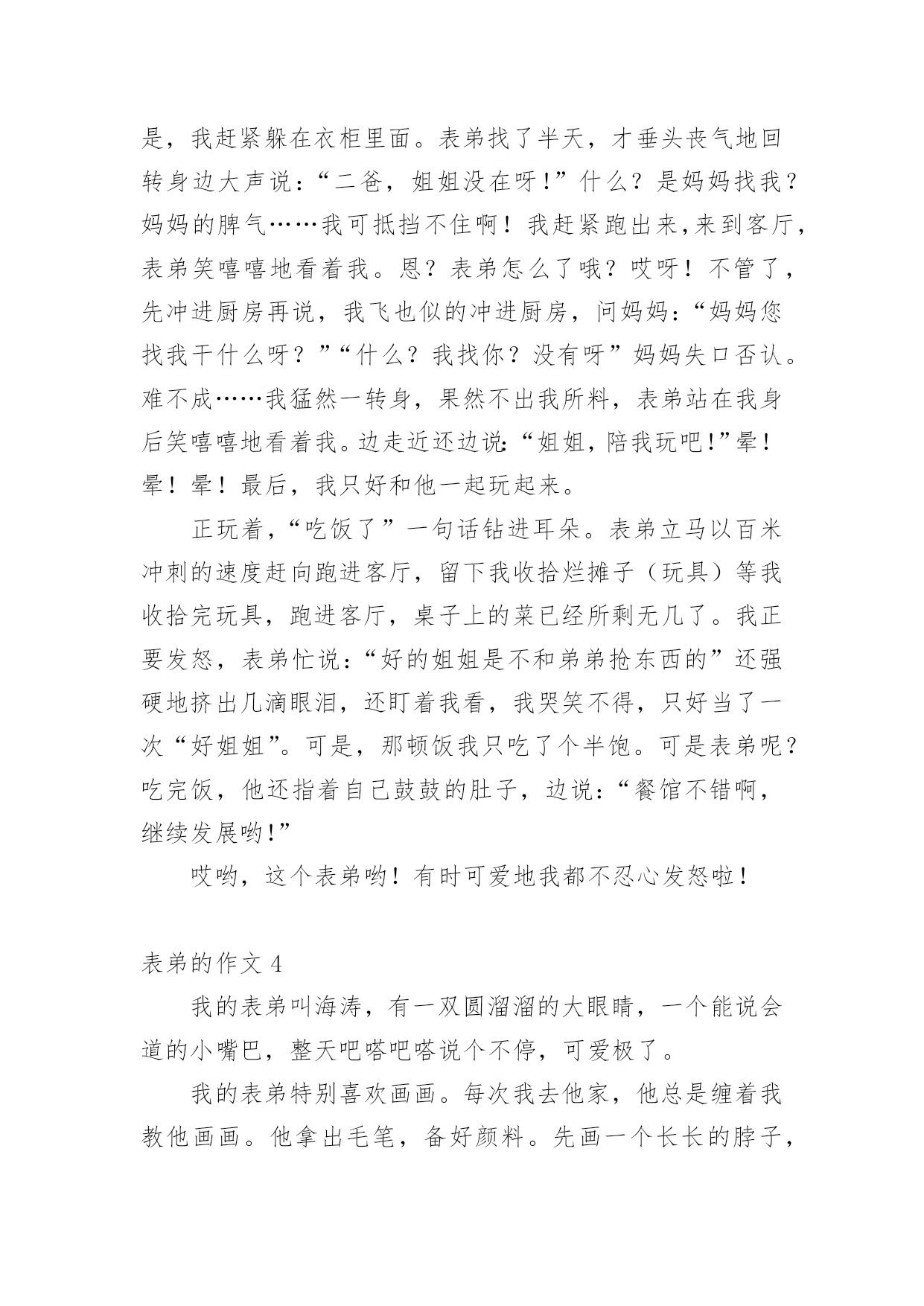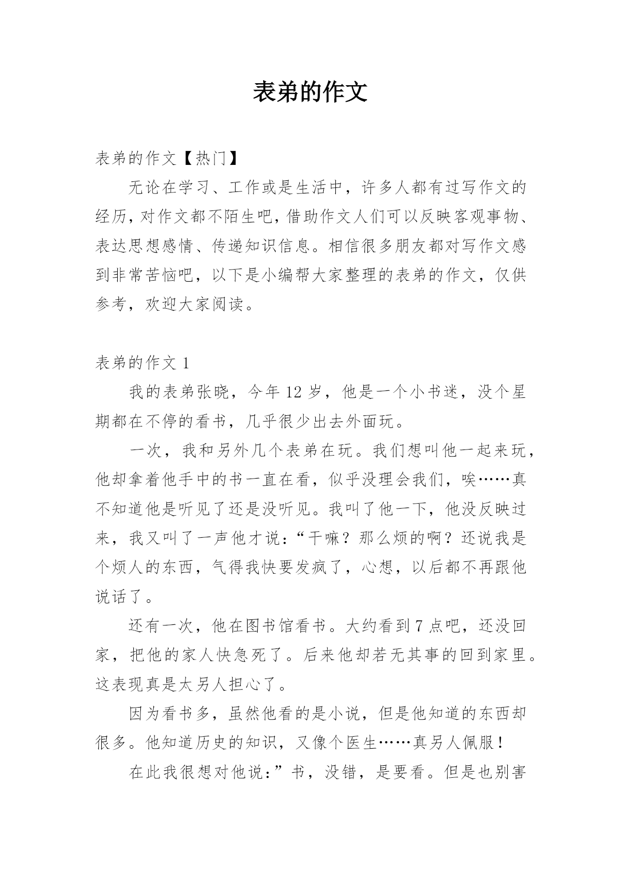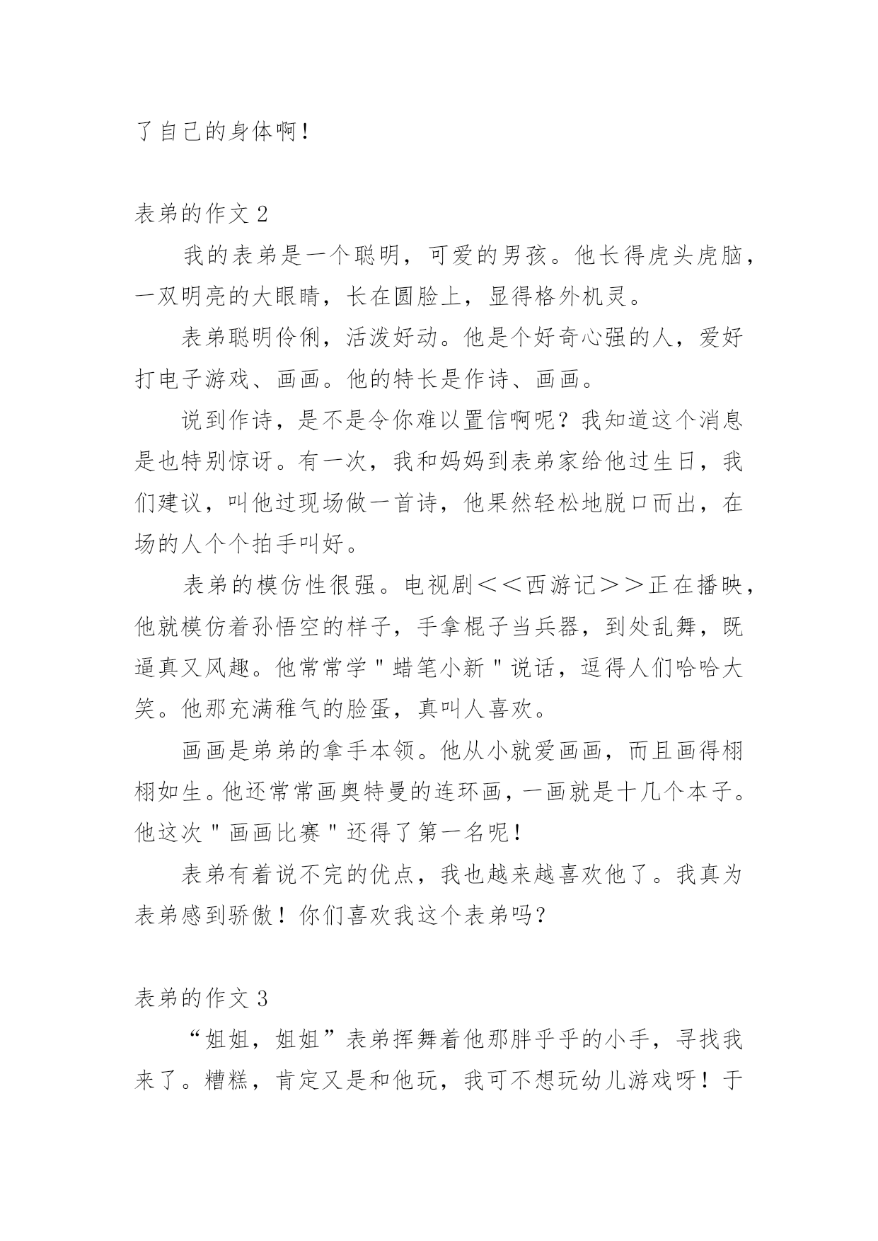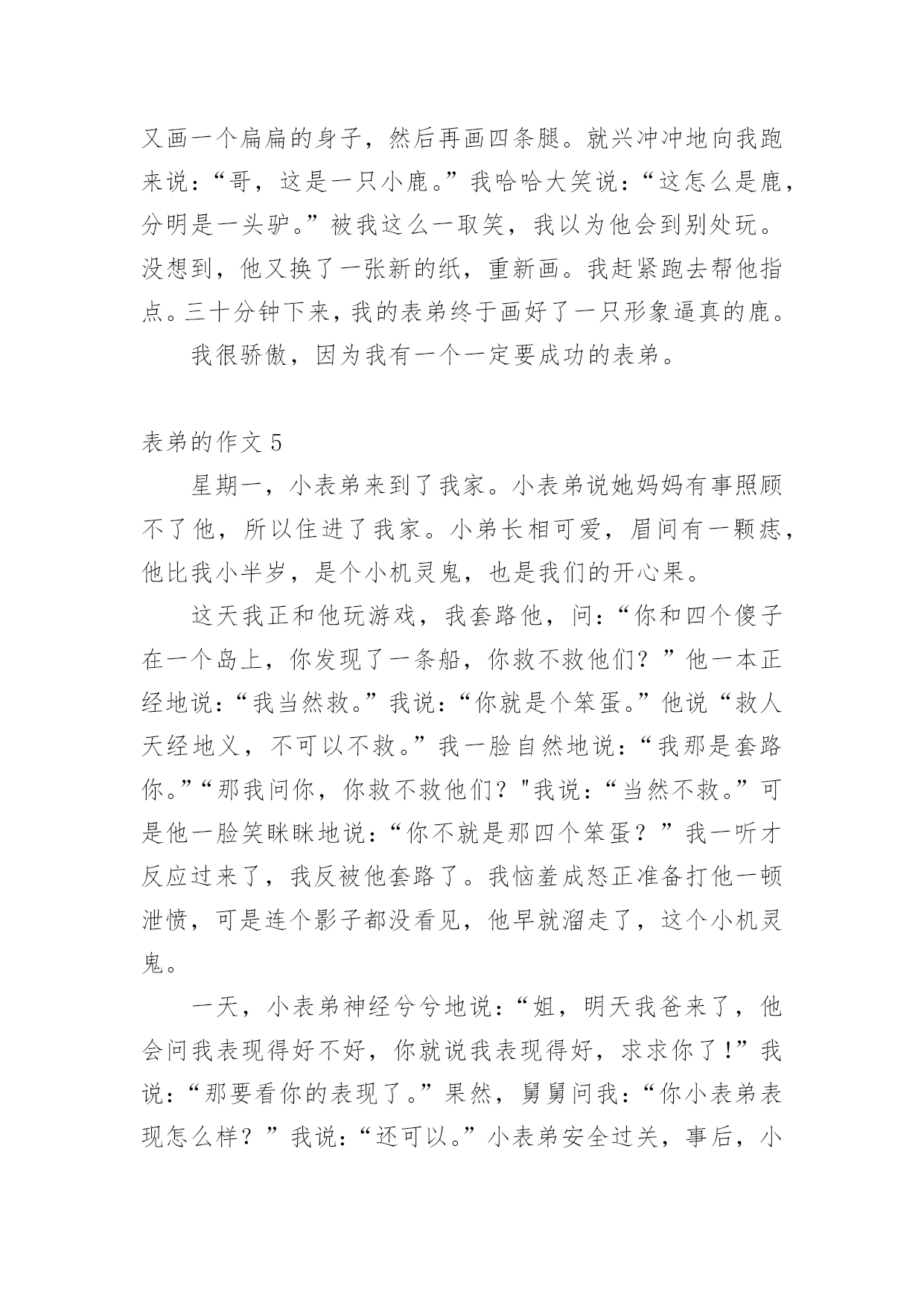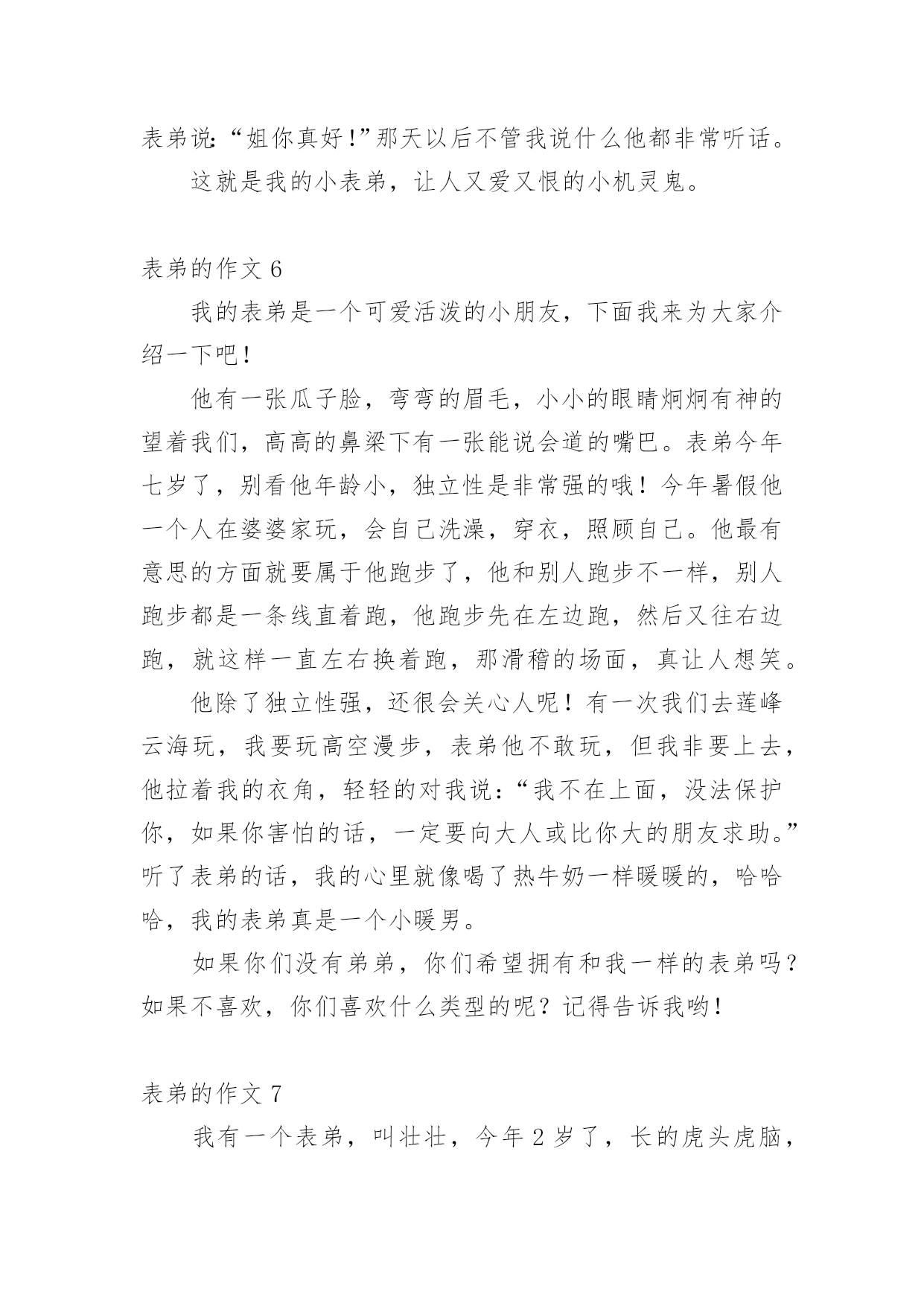 表弟的作文 表弟的作文【热门】无论在学习、工作或是生活中,许多人都有过写作文的经历,对作文都不陌生吧,借助作文人们可以反映客观事物、表达思想感情、传递知识信息。相信很多朋友都对写作文感到非常苦恼吧,以下是小编帮大家整理的表弟的作文,仅供参考,欢迎大家阅读。表弟的作文1我的表弟张晓,今年12岁,他是一个小书迷,没个星期都在不停的看书,几乎很少出去外面玩。一次,我和另外几个表弟在玩。我们想叫他一起来玩,他却拿着他手中的书一直在看,似乎没理会我们,唉……真不知道他是听见了还是没听见。我叫了他一下,他没反映过来,我又叫了一声他才说:“干嘛?那么烦的啊?还说我是个烦人的东西,气得我快要发疯了,心想,以后都不再跟他说话了。还有一次,他在图书馆看书。大约看到7点吧,还没回家,把他的家人快急死了。后来他却若无其事的回到家里。这表现真是太另人担心了。因为看书多,虽然他看的是小说,但是他知道的东西却很多。他知道历史的知识,又像个医生……真另人佩服!在此我很想对他说:”书,没错,是要看。但是也别害了自己的身体啊!表弟的作文2我的表弟是一个聪明,可爱的男孩。他长得虎头虎脑,一双明亮的大眼睛,长在圆脸上,显得格外机灵。表弟聪明伶俐,活泼好动。他是个好奇心强的人,爱好打电子游戏、画画。他的特长是作诗、画画。说到作诗,是不是令你难以置信啊呢?我知道这个消息是也特别惊讶。有一次,我和妈妈到表弟家给他过生日,我们建议,叫他过现场做一首诗,他果然轻松地脱口而出,在场的人个个拍手叫好。表弟的模仿性很强。电视剧<<西游记>>正在播映,他就模仿着孙悟空的样子,手拿棍子当兵器,到处乱舞,既逼真又风趣。他常常学"蜡笔小新"说话,逗得人们哈哈大笑。他那充满稚气的脸蛋,真叫人喜欢。画画是弟弟的拿手本领。他从小就爱画画,而且画得栩栩如生。他还常常画奥特曼的连环画,一画就是十几个本子。他这次"画画比赛"还得了第一名呢!表弟有着说不完的优点,我也越来越喜欢他了。我真为表弟感到骄傲!你们喜欢我这个表弟吗?表弟的作文3“姐姐,姐姐”表弟挥舞着他那胖乎乎的小手,寻找我来了。糟糕,肯定又是和他玩,我可不想玩幼儿游戏呀!于是,我赶紧躲在衣柜里面。表弟找了半天,才垂头丧气地回转身边大声说:“二爸,姐姐没在呀!”什么?是妈妈找我?妈妈的脾气……我可抵挡不住啊!我赶紧跑出来,来到客厅,表弟笑嘻嘻地看着我。恩?表弟怎么了哦?哎呀!不管了,先冲进厨房再说,我飞也似的冲进厨房,问妈妈:“妈妈您找我干什么呀?”“什么?我找你?没有呀”妈妈失口否认。难不成……我猛然一转身,果然不出我所料,表弟站在我身后笑嘻嘻地看着我。边走近还边说:“姐姐,陪我玩吧!”晕!晕!晕!最后,我只好和他一起玩起来。正玩着,“吃饭了”一句话钻进耳朵。表弟立马以百米冲刺的速度赶向跑进客厅,留下我收拾烂摊子(玩具)等我收拾完玩具,跑进客厅,桌子上的菜已经所剩无几了。我正要发怒,表弟忙说:“好的姐姐是不和弟弟抢东西的”还强硬地挤出几滴眼泪,还盯着我看,我哭笑不得,只好当了一次“好姐姐”。可是,那顿饭我只吃了个半饱。可是表弟呢?吃完饭,他还指着自己鼓鼓的肚子,边说:“餐馆不错啊,继续发展哟!”哎哟,这个表弟哟!有时可爱地我都不忍心发怒啦!表弟的作文4我的表弟叫海涛,有一双圆溜溜的大眼睛,一个能说会道的小嘴巴,整天吧嗒吧嗒说个不停,可爱极了。我的表弟特别喜欢画画。每次我去他家,他总是缠着我教他画画。他拿出毛笔,备好颜料。先画一个长长的脖子,又画一个扁扁的身子,然后再画四条腿。就兴冲冲地向我跑来说:“哥,这是一只小鹿。”我哈哈大笑说:“这怎么是鹿,分明是一头驴。”被我这么一取笑,我以为他会到别处玩。没想到,他又换了一张新的纸,重新画。我赶紧跑去帮他指点。三十分钟下来,我的表弟终于画好了一只形象逼真的鹿。我很骄傲,因为我有一个一定要成功的表弟。表弟的作文5星期一,小表弟来到了我家。小表弟说她妈妈有事照顾不了他,所以住进了我家。小弟长相可爱,眉间有一颗痣,他比我小半岁,是个小机灵鬼,也是我们的开心果。这天我正和他玩游戏,我套路他,问:“你和四个傻子在一个岛上,你发现了一条船,你救不救他们?”他一本正经地说:“我当然救。”我说:“你就是个笨蛋。”他说“救人天经地义,不可以不救。”我一脸自然地说:“我那是套路你。”“那我问你,你救不救他们?"我说:“当然不救。”可是他一脸笑眯眯地说:“你不就是那四个笨蛋?”我一听才反应过来了,我反被他套路了。我恼羞成怒正准备打他一顿泄愤,可是连个影子都没看见,他早就溜走了,这个小机灵鬼。一天,小表弟神经兮兮地说:“姐,明天我爸来了,他会问我表现得好不好,你就说我表现得好,求求你了!”我说:“那要看你的表现了。”果然,舅舅问我:“你小表弟表现怎么样?”我说:“还可以。”小表弟安全过关,事后,小表弟说:“姐你真好!”那天
