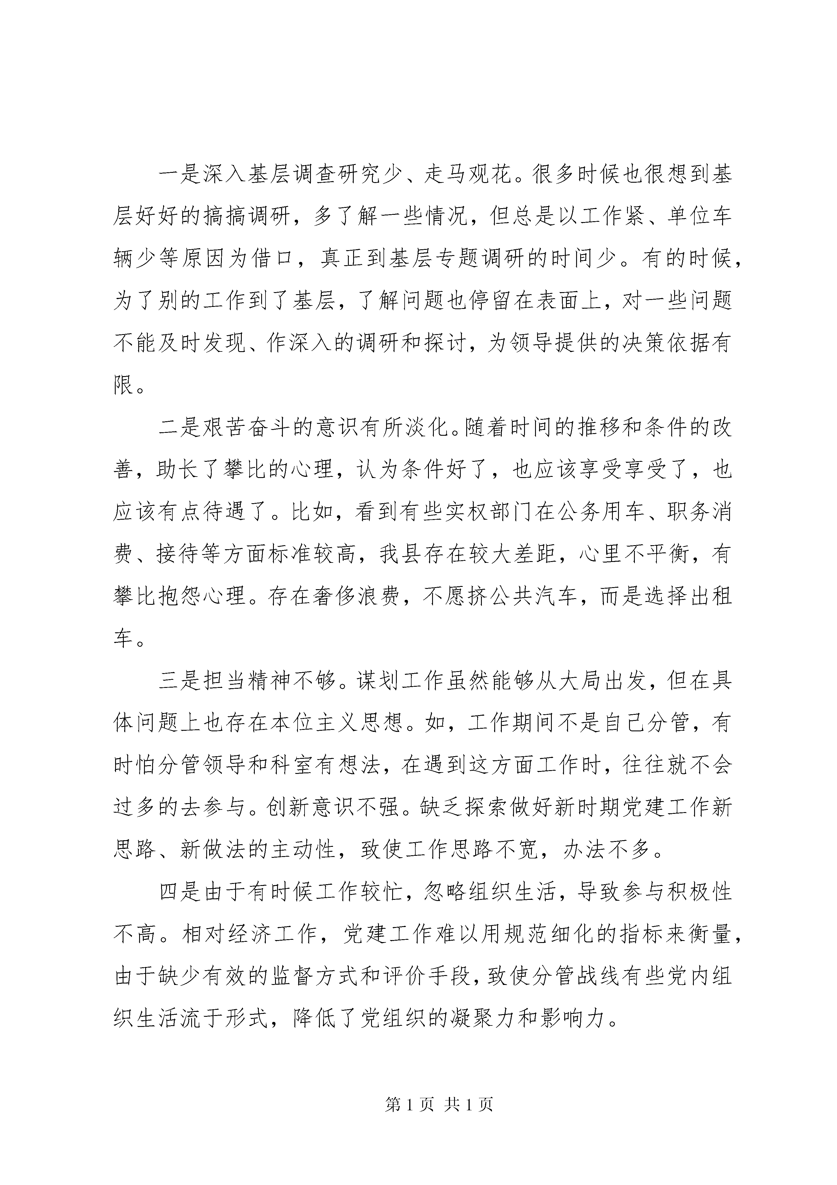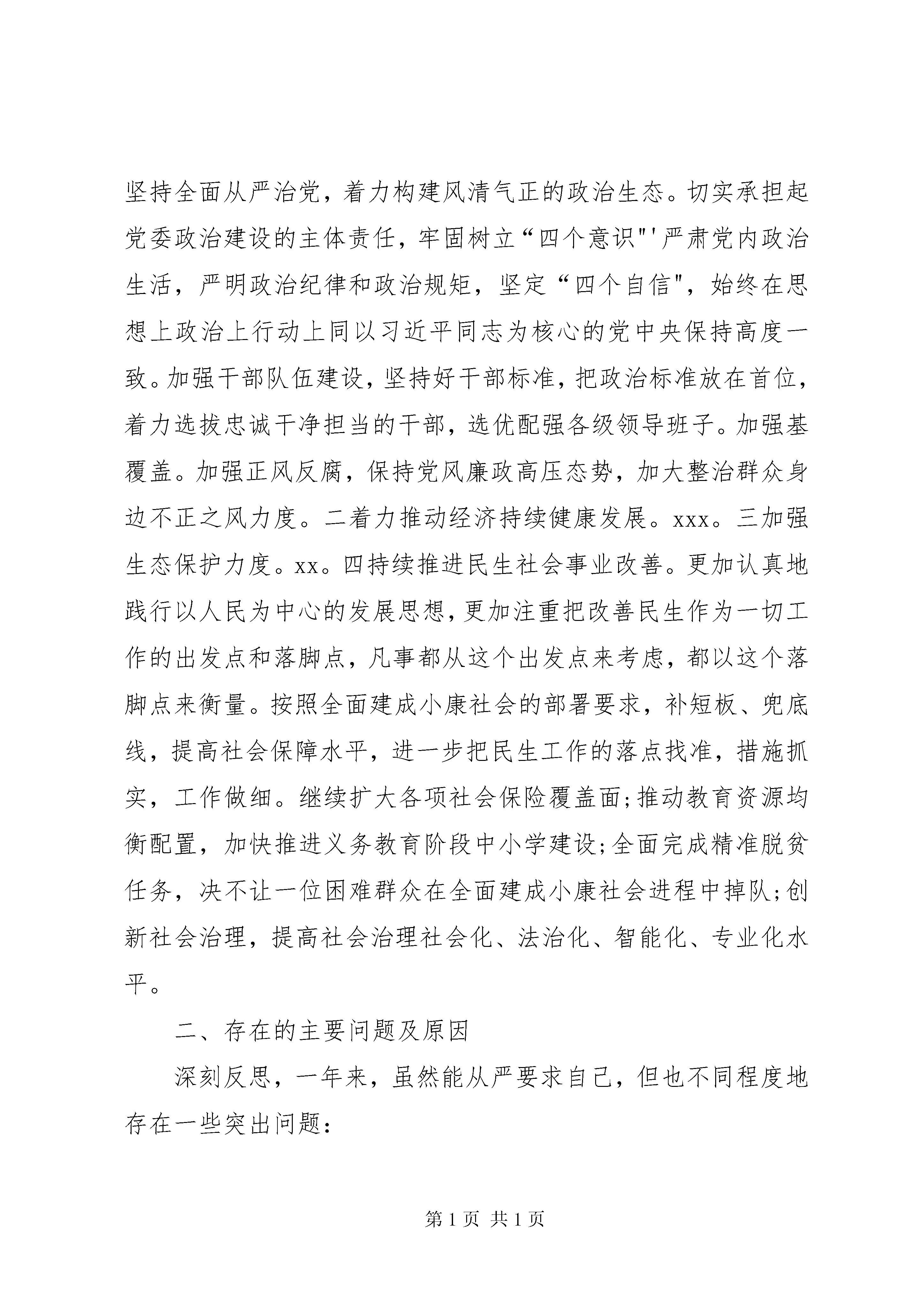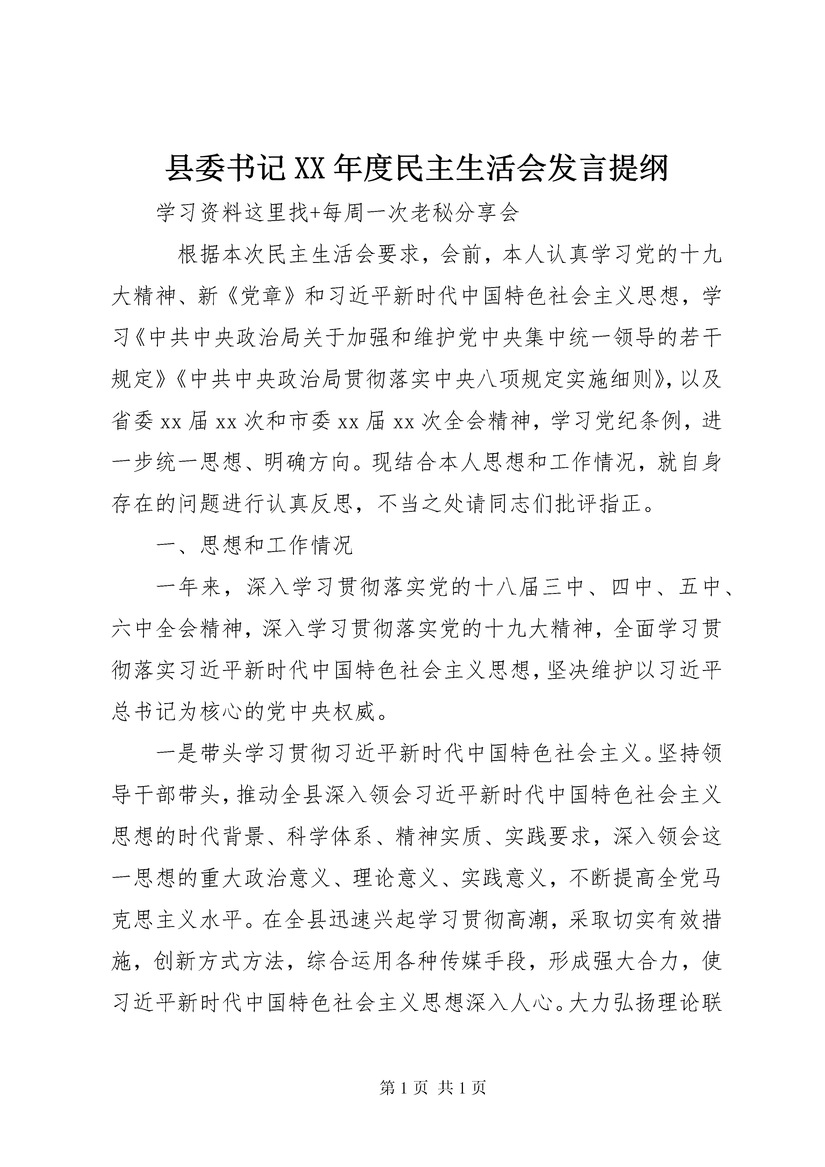 县委书记XX年度民主生活会发言提纲学习资料这里找+每周一次老秘分享会根据本次民主生活会要求,会前,本人认真学习党的十九大精神、新《党章》和习近平新时代中国特色社会主义思想,学习《中共中央政治局关于加强和维护党中央集中统一领导的若干规定》《中共中央政治局贯彻落实中央八项规定实施细则》,以及省委xx届xx次和市委xx届xx次全会精神,学习党纪条例,进一步统一思想、明确方向。现结合本人思想和工作情况,就自身存在的问题进行认真反思,不当之处请同志们批评指正。一、思想和工作情况一年来,深入学习贯彻落实党的十八届三中、四中、五中、六中全会精神,深入学习贯彻落实党的十九大精神,全面学习贯彻落实习近平新时代中国特色社会主义思想,坚决维护以习近平总书记为核心的党中央权威。一是带头学习贯彻习近平新时代中国特色社会主义。坚持领导干部带头,推动全县深入领会习近平新时代中国特色社会主义思想的时代背景、科学体系、精神实质、实践要求,深入领会这一思想的重大政治意义、理论意义、实践意义,不断提高全党马克思主义水平。在全县迅速兴起学习贯彻高潮,采取切实有效措施,创新方式方法,综合运用各种传媒手段,形成强大合力,使习近平新时代中国特色社会主义思想深入人心。大力弘扬理论联系实际的优良学风,强化问题意识、树立问题导向,着力提高学习本领、政治领导本领、改革创新本领、科学发展本领,保持政治定力,坚持实干兴邦,以昂扬的精神状态,努力创造经得起实践、人民、历史检验的新业绩。自觉用习近平新时代中国特色社会主义思想武装头脑、指导实践、推动工作。二是带头维护习近平总书记党中央的核心、全党的核心地位,维护党中央权威和集中统一领导。全面从严治党,核心是加强党的领导。坚决维护党中央权威、保证全党令行禁止,是党和国家前途命运所系,是全国各族人民根本利益所在,也是加强和规范党内政治生活的重要目的。坚持党中央的集中统一领导。自觉在思想上政治上行动上向党中央保持高度一致,严明党的政治纪律和政治规矩,自觉维护党中央权威,并具体体现到自己的全部工作中。全局各级党组织、全体党员特别是领导干部都要向党中央看齐,向党的理论和路线方针政策看齐,向党中央决策部署看齐,做到党中央提倡的坚决响应、党中央决定的坚决执行、党中央禁止的坚决不做,共同营造风清气正的政治生态,确保党始终站在时代前列,始终成为中国特色社会主义事业的坚强领导核心。真正做到了对党忠诚、襟怀坦白,守纪律、讲规矩,自觉在思想上政治上行动上同以习近平同志为核心的党中央保持高度一致。三是带头遵守、执行中央八项规定及实施细则。密切联系群众,积极接待处理群众来信来访,态度热情。主动研究工作,推进工作有力度、有方法、有措施,能够不断探索解决问题的新方法、新思路,比如防范、应对、处理突发性事件、信访问题等方面。能积极深入到基层单位解存在的突出问题和困难,找准问题的焦点和难点并及时做培训,克难攻坚。坚持改会风文风,尽量少开会,开短会,开有实际效果的会。写文章尽量说实话,注重练就“写"功,力争用最少的字、用自己的话把事说清楚,一个最基本的要求就是说人话、说实话。从自身做起,从点滴做起,把厉行勤俭节约、反对铺张浪费贯彻在实际工作和日常生活中,落实到具体行动上。发扬艰苦奋斗的优良传统,提倡节约、反对浪费,自觉树立“节约光荣、浪费可耻”的价值观,从不利用公款东拉西扯、胡吃海喝,铺张浪费、纸醉金迷。不仅注意自身在8小时以内的工作作风和言行,而且注意自己在8小时以外的生活细节。在生活方面,本人始终严以律己,从不参与赌博,从不做违法乱纪的事,生活情趣健康。严格执行党风廉政建设有关规定,自觉遵守廉政准则,不断提高拒腐防变能力和抵御风险的能力,做到防微杜渐,竖不攀,横不比,扎扎实实管好自己。加强党性锻炼、作风养成和能力建设,在名利上和待遇上不计较、不攀比、不失衡,多动手,不伸手,干干净净做事,老老实实做人,扛得住艰苦,耐得住寂寞,抵得住诱惑。四是带头贯彻落实党的十九大决策部署。以贯彻落实十九大精神为动力,调方向、把脉搏、下气力,认真抓好各项工作。一坚持全面从严治党,着力构建风清气正的政治生态。切实承担起党委政治建设的主体责任,牢固树立“四个意识"'严肃党内政治生活,严明政治纪律和政治规矩,坚定“四个自信",始终在思想上政治上行动上同以习近平同志为核心的党中央保持高度一致。加强干部队伍建设,坚持好干部标准,把政治标准放在首位,着力选拔忠诚干净担当的干部,选优配强各级领导班子。加强基覆盖。加强正风反腐,保持党风廉政高压态势,加大整治群众身边不正之风力度。二着力推动经济持续健康发展。xxx。三加强生态保护力度。xx。四持续推进民生社会事业改善。更加认真地践行以人民为中心的发展思想,更加注重把改善民生作为一切工作的出发点和落脚点,凡事都从这个出发点来考虑,都以