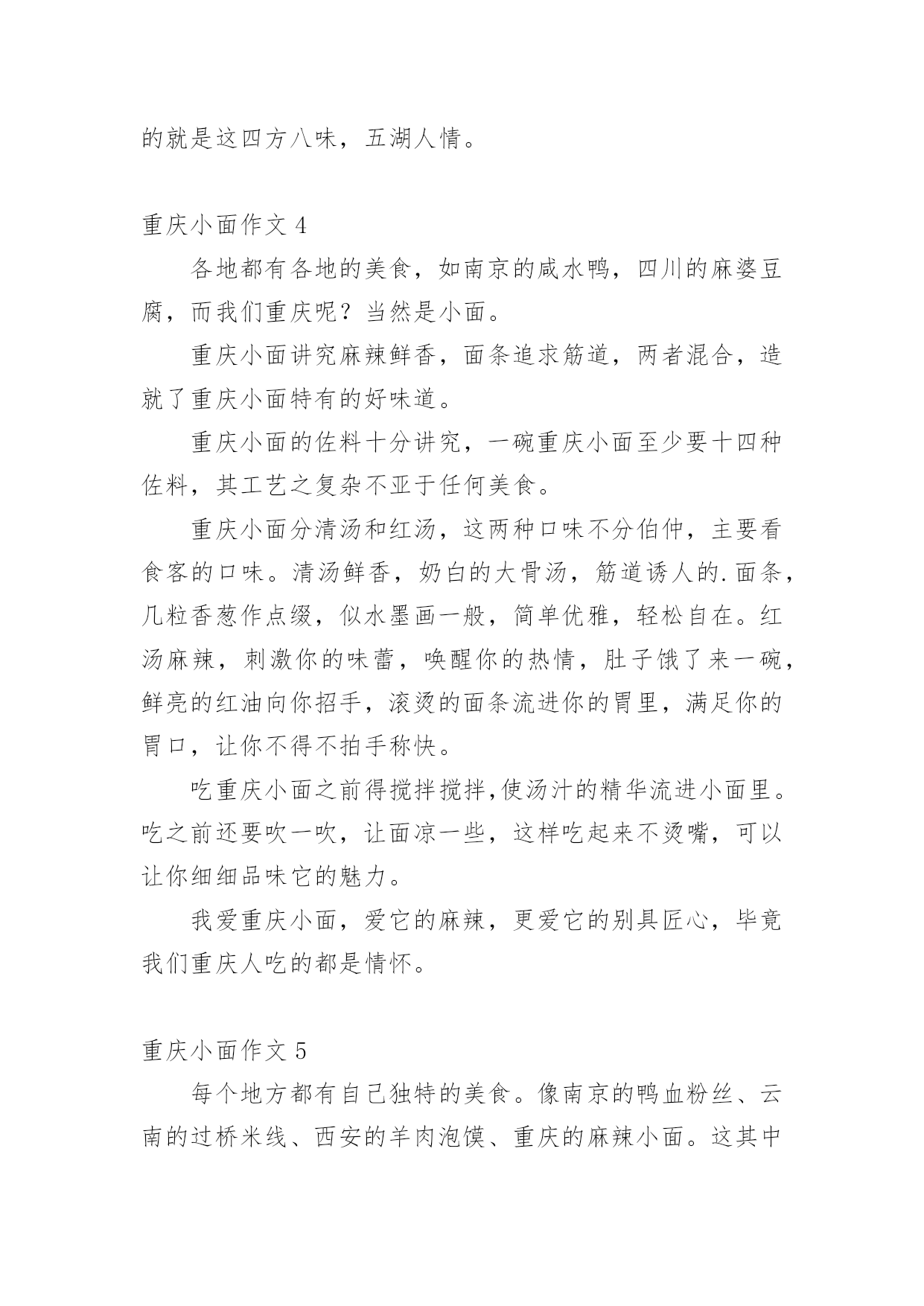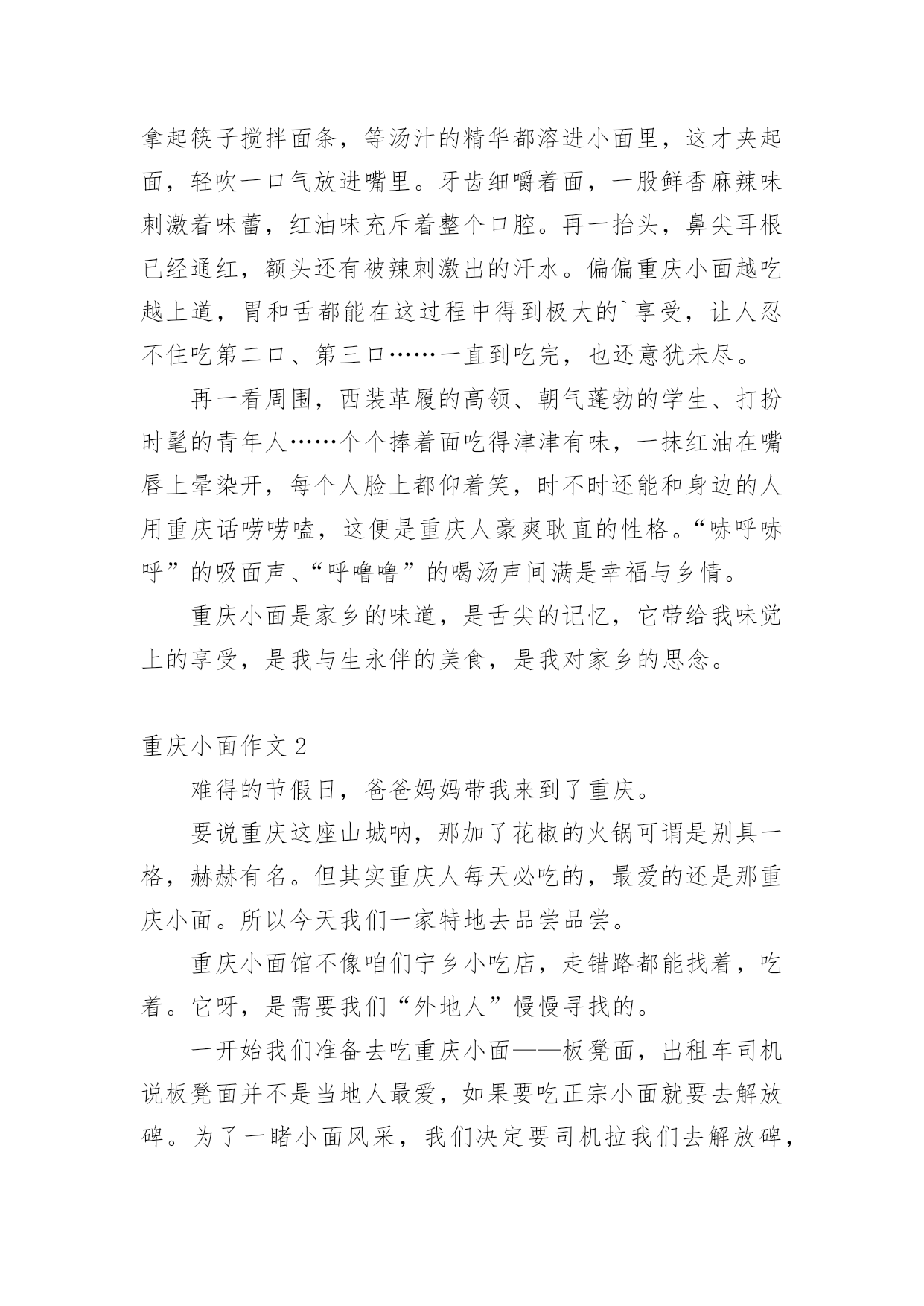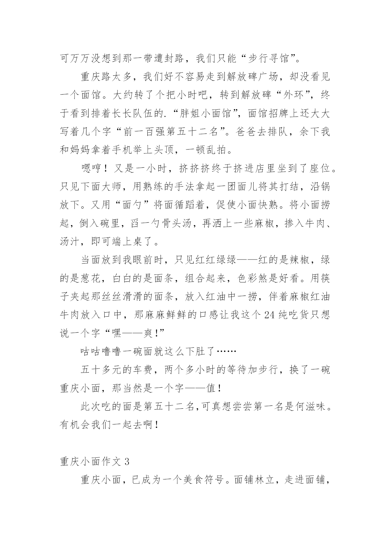 重庆小面作文 重庆小面作文8篇无论是身处学校还是步入社会,大家都尝试过写作文吧,作文是人们把记忆中所存储的有关知识、经验和思想用书面形式表达出来的记叙方式。相信许多人会觉得作文很难写吧,下面是小编为大家收集的重庆小面作文,欢迎阅读,希望大家能够喜欢。重庆小面作文1不论我身处何地,人在何方,重庆小面的味道都会一直萦绕于心。因为它饱含一世深长的乡情,家乡重庆的味道都被浓缩在这碗重庆小面里,我把它放在心里,永远回味。“嬢嬢,来碗面。”重庆人的一天,都是从路边面摊上的一碗重庆小面开始。“要嘚!”老板脸上挂着笑,高声应到。然后一转身,揭开锅盖,里面的水已经开始沸腾,小水泡在水面上“扑通扑通”地跳跃着,待那层似雨后云雾般的水汽飘散,老板这才抓起一把面、择来几片菜叶丢进锅里;然后又干净利落地抽出碗,酱油、花椒、油辣子……老板两只手共同操作,十多种配料撒进碗里一气呵成;最后,老板把面和菜叶捞出放入碗里,加入汤汁,一碗色香味俱全的重庆小面就做好了。面被端上了桌,筋道诱人的面条此时还冒着热气,鲜亮的红油上几粒香葱作点缀,诱得人直流口水。我迫不及待地拿起筷子搅拌面条,等汤汁的精华都溶进小面里,这才夹起面,轻吹一口气放进嘴里。牙齿细嚼着面,一股鲜香麻辣味刺激着味蕾,红油味充斥着整个口腔。再一抬头,鼻尖耳根已经通红,额头还有被辣刺激出的汗水。偏偏重庆小面越吃越上道,胃和舌都能在这过程中得到极大的`享受,让人忍不住吃第二口、第三口……一直到吃完,也还意犹未尽。再一看周围,西装革履的高领、朝气蓬勃的学生、打扮时髦的青年人……个个捧着面吃得津津有味,一抹红油在嘴唇上晕染开,每个人脸上都仰着笑,时不时还能和身边的人用重庆话唠唠嗑,这便是重庆人豪爽耿直的性格。“哧呼哧呼”的吸面声、“呼噜噜”的喝汤声间满是幸福与乡情。重庆小面是家乡的味道,是舌尖的记忆,它带给我味觉上的享受,是我与生永伴的美食,是我对家乡的思念。重庆小面作文2难得的节假日,爸爸妈妈带我来到了重庆。要说重庆这座山城呐,那加了花椒的火锅可谓是别具一格,赫赫有名。但其实重庆人每天必吃的,最爱的还是那重庆小面。所以今天我们一家特地去品尝品尝。重庆小面馆不像咱们宁乡小吃店,走错路都能找着,吃着。它呀,是需要我们“外地人”慢慢寻找的。一开始我们准备去吃重庆小面——板凳面,出租车司机说板凳面并不是当地人最爱,如果要吃正宗小面就要去解放碑。为了一睹小面风采,我们决定要司机拉我们去解放碑,可万万没想到那一带遭封路,我们只能“步行寻馆”。重庆路太多,我们好不容易走到解放碑广场,却没看见一个面馆。大约转了个把小时吧,转到解放碑“外环”,终于看到排着长长队伍的.“胖姐小面馆”,面馆招牌上还大大写着几个字“前一百强第五十二名”。爸爸去排队,余下我和妈妈拿着手机举上头顶,一顿乱拍。嗯哼!又是一小时,挤挤挤终于挤进店里坐到了座位。只见下面大师,用熟练的手法拿起一团面儿将其打结,沿锅放下。又用“面勺”将面循蹈着,促使小面快熟。将小面捞起,倒入碗里,舀一勺骨头汤,再洒上一些麻椒,掺入牛肉、汤汁,即可端上桌了。当面放到我眼前时,只见红红绿绿——红的是辣椒,绿的是葱花,白白的是面条,组合起来,色彩煞是好看。用筷子夹起那丝丝滑滑的面条,放入红油中一捞,伴着麻椒红油牛肉放入口中,那麻麻鲜鲜的口感让我这个24纯吃货只想说一个字“嘿——爽!”咕咕噜噜一碗面就这么下肚了……五十多元的车费,两个多小时的等待加步行,换了一碗重庆小面,那当然是一个字——值!此次吃的面是第五十二名,可真想尝尝第一名是何滋味。有机会我们一起去啊!重庆小面作文3重庆小面,已成为一个美食符号。面铺林立,走进面铺,大大方方对老板提出要求:“老板,二两小面。汤宽一点、青多一点、味重一点、面硬一点……”我最喜欢一碗卧个荷包蛋的小面,加一点咸菜,在口中慢慢咀嚼。辣椒如火似的,围绕着我的味蕾,燃烧着重庆人的心,燃烧着我的心。重庆小面,有这样的一个来历:在三国时期,刘备、关羽、张飞在桃园结义后,桃园的主人专门为他们做了三碗面,选了当时人比较喜欢的粉做主料,寓意这三人的友情像这粉条一样绵长,又加了一种特辣的小尖椒,和老坛酸菜以及红糖与黄莲在里面,意思是让三人明白酸甜苦辣都不怕。重庆的小面由此演变而来。重庆的小面既好吃,做法又简单。首先,水煮沸,接着将面条放入沸水中,面条忽地散开,像层层波浪,在水里翻腾。再拿出一个大碗,倒入一些油和准备好的.调料,这时,将刚煮好的面条滑入碗中。最后点上翠绿的葱花,一碗还冒着热气的小面就完成了。我看着眼前的面条,它冒着诱人的香气,这香气,像一只无形的手抓住了我的鼻子,抓住了我的心,让我移不开眼,移不开步。我用筷子轻轻的拌面,那面劲道十足,麻辣一下子扑入嘴里,慢慢的散开,少而味浓,汤鲜而厚味。慢慢地嚼,慢慢地咽。这吃面的样子准能让看到、闻到的人垂涎三尺。一碗