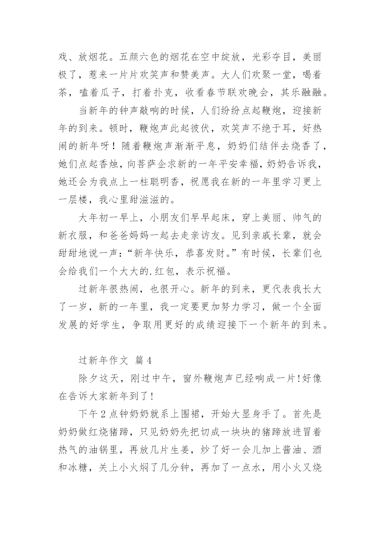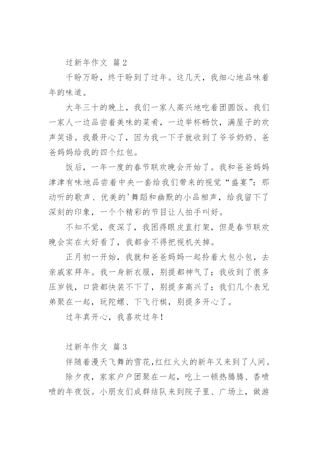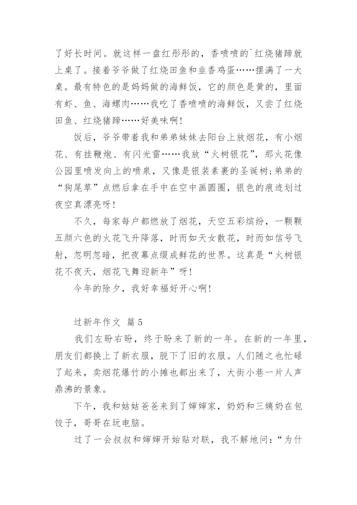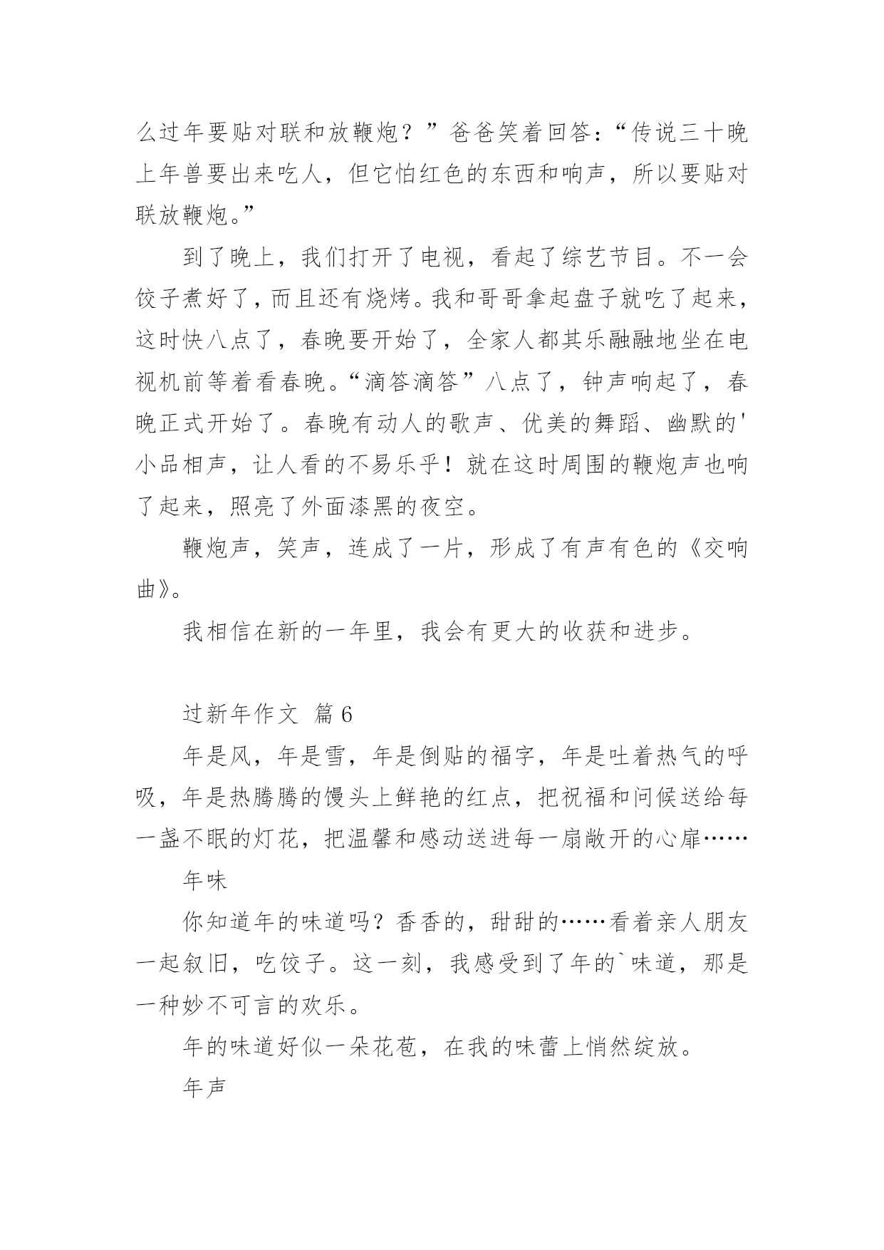 过新年作文 过新年作文【优秀】在平凡的学习、工作、生活中,大家最不陌生的就是作文了吧,作文可分为小学作文、中学作文、大学作文(论文)。那么一般作文是怎么写的呢?下面是小编为大家收集的过新年作文,欢迎阅读与收藏。过新年作文篇1“爆竹声中一岁除,春风送暖人屠苏”哦!过年了!过年了!要发压岁钱喽!又到了我最喜欢的传统节日了——春节。春节前几天,整条大街上人山人海,车水马龙。快看那边,大树上挂满了灯笼,就像一个个红红的.苹果。这几天,也是家家户户办年货的好时间,爷爷奶奶不停把礼品搬回家里,有鸡鸭鱼肉、瓜子糖、巧克力、牛奶、草莓,种类繁多!终于到除夕夜了,全家人都吃起了香喷喷的饺子,边吃边看联欢晚会。让我笑得肚子疼的是小岳岳的小品,只见他眼睛往上翻了个大白眼,真是太搞笑了。还有那充满魔幻的魔术,真是太精彩了!每次看大变活人,我都替他们捏一把汗,太刺激了!哈哈!快看,我弟弟吃成了大花猫。吃完饺子后,我许下三个愿望:希望年年有余;希望我们全家平安;希望我的学习更加进步。过新年作文篇2千盼万盼,终于盼到了过年。这几天,我细心地品味着年的味道。大年三十的晚上,我们一家人高兴地吃着团圆饭。我们一家人一边品尝着美味的菜肴,一边举杯畅饮,满屋子的欢声笑语。我最开心了,因为我一下子就收到了爷爷奶奶、爸爸妈妈给我的四个红包。饭后,一年一度的春节联欢晚会开始了。我和爸爸妈妈津津有味地品尝着中央一套给我们带来的视觉“盛宴”:那动听的歌声、优美的'舞蹈和幽默的小品相声,给我留下了深刻的印象,一个个精彩的节目让人拍手叫好。不知不觉,夜深了,我困得眼皮直打架,但是春节联欢晚会实在太好看了,我都舍不得把视机关掉。正月初一开始,我就和爸爸妈妈一起拎着大包小包,去亲戚家拜年。我一身新衣服,别提都神气了;我收到了很多压岁钱,口袋都快装不下了,别提多高兴了;我们几个表兄弟聚在一起,玩陀螺、下飞行棋,别提多开心了。过年真开心,我喜欢过年!过新年作文篇3伴随着漫天飞舞的雪花,红红火火的新年又来到了人间。除夕夜,家家户户团聚在一起,吃上一顿热腾腾、香喷喷的年夜饭。小朋友们成群结队来到院子里、广场上,做游戏、放烟花。五颜六色的烟花在空中绽放,光彩夺目,美丽极了,惹来一片片欢笑声和赞美声。大人们欢聚一堂,喝着茶,嗑着瓜子,打着扑克,收看春节联欢晚会,其乐融融。当新年的钟声敲响的时候,人们纷纷点起鞭炮,迎接新年的到来。顿时,鞭炮声此起彼伏,欢笑声不绝于耳,好热闹的新年呀!随着鞭炮声渐渐平息,奶奶们结伴去烧香了,她们点起香烛,向菩萨企求新的一年平安幸福,奶奶告诉我,她还会为我点上一柱聪明香,祝愿我在新的一年里学习更上一层楼,我心里甜滋滋的。大年初一早上,小朋友们早早起床,穿上美丽、帅气的新衣服,和爸爸妈妈一起去走亲访友。见到亲戚长辈,就会甜甜地说一声:“新年快乐,恭喜发财。”有时候,长辈们也会给我们一个大大的.红包,表示祝福。过新年很热闹,也很开心。新年的到来,更代表我长大了一岁,新的一年里,我一定要更加努力学习,做一个全面发展的好学生,争取用更好的成绩迎接下一个新年的到来。过新年作文篇4除夕这天,刚过中午,窗外鞭炮声已经响成一片!好像在告诉大家新年到了!下午2点钟奶奶就系上围裙,开始大显身手了。首先是奶奶做红烧猪蹄,只见奶奶先把切成一块块的猪蹄放进冒着热气的油锅里,再放几片生姜,炒了好一会儿加上酱油、酒和冰糖,关上小火焖了几分钟,再加了一点水,用小火又烧了好长时间。就这样一盘红彤彤的,香喷喷的`红烧猪蹄就上桌了。接着爷爷做了红烧田鱼和韭香鸡蛋……摆满了一大桌。最有特色的是妈妈做的海鲜饭,它的颜色是黄的,里面有虾、鱼、海螺肉……我吃了香喷喷的海鲜饭,又尝了红烧田鱼、红烧猪蹄……好美味啊!饭后,爷爷带着我和弟弟妹妹去阳台上放烟花,有小烟花、有挂鞭炮、有闪光雷……我放“火树银花”,那火花像公园里喷发向上的喷泉,又像是银装素裹的圣诞树;弟弟的“狗尾草”点燃后拿在手中在空中画圆圈,银色的痕迹划过夜空真漂亮呀!不久,每家每户都燃放了烟花,天空五彩缤纷,一颗颗五颜六色的火花飞升降落,时而如天女散花,时而如信号飞射,忽明忽暗,把夜幕点缀成鲜花的世界。这真是“火树银花不夜天,烟花飞舞迎新年”呀!今年的除夕,我好幸福好开心啊!过新年作文篇5我们左盼右盼,终于盼来了新的一年。在新的一年里,朋友们都换上了新衣服,脱下了旧的衣服。人们随之也忙碌了起来,卖烟花爆竹的小摊也都出来了,大街小巷一片人声鼎沸的景象。下午,我和姑姑爸爸来到了婶婶家,奶奶和三姨奶在包饺子,哥哥在玩电脑。过了一会叔叔和婶婶开始贴对联,我不解地问:“为什么过年要贴对联和放鞭炮?”爸爸笑着回答:“传说三十晚上年兽要出来吃人,但它怕红色的东西和响声,所以要贴对联放鞭炮。”到了晚上,我们打开了电视,看起了综艺节目。不一会饺子煮好了,而且还有烧烤。我