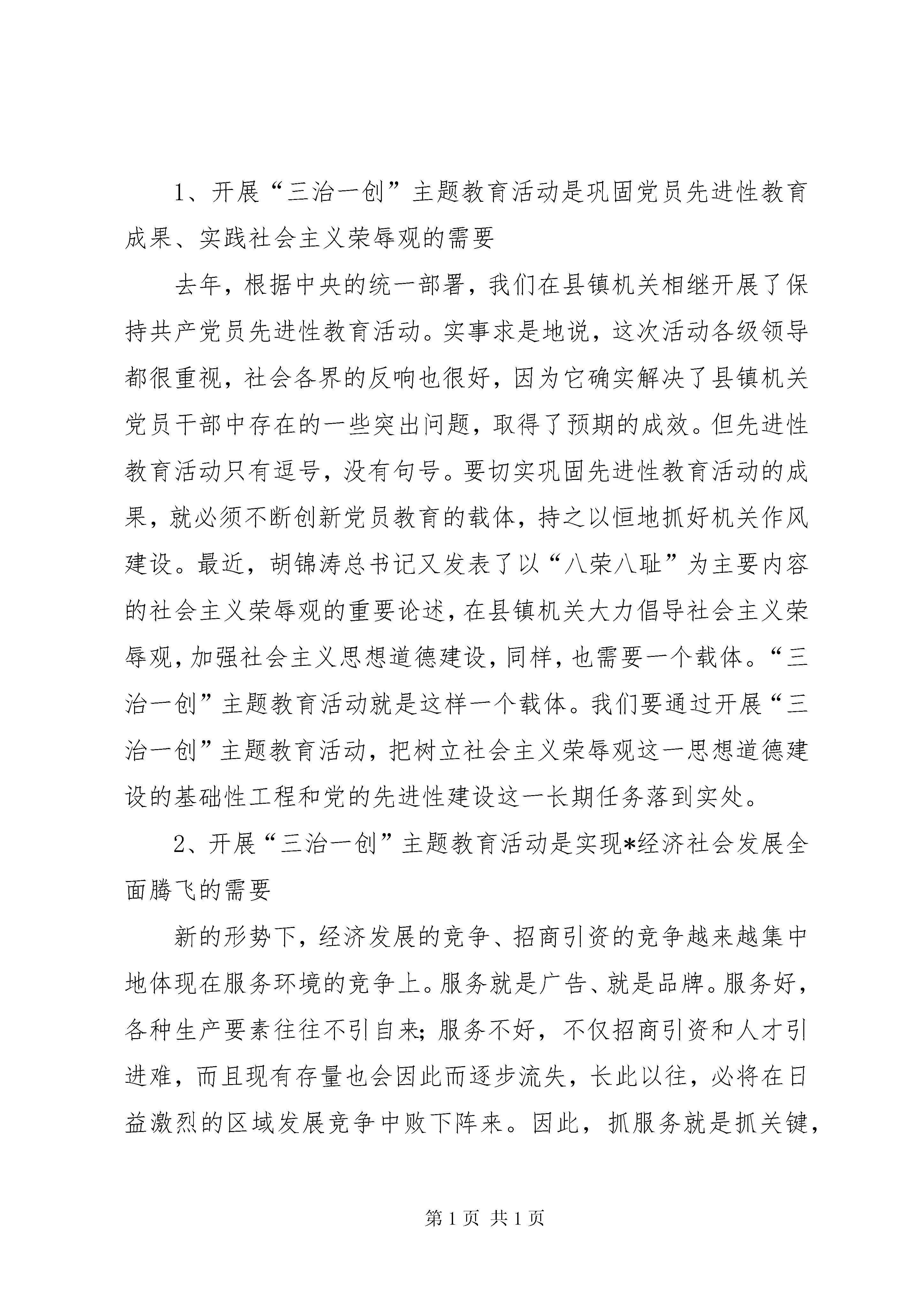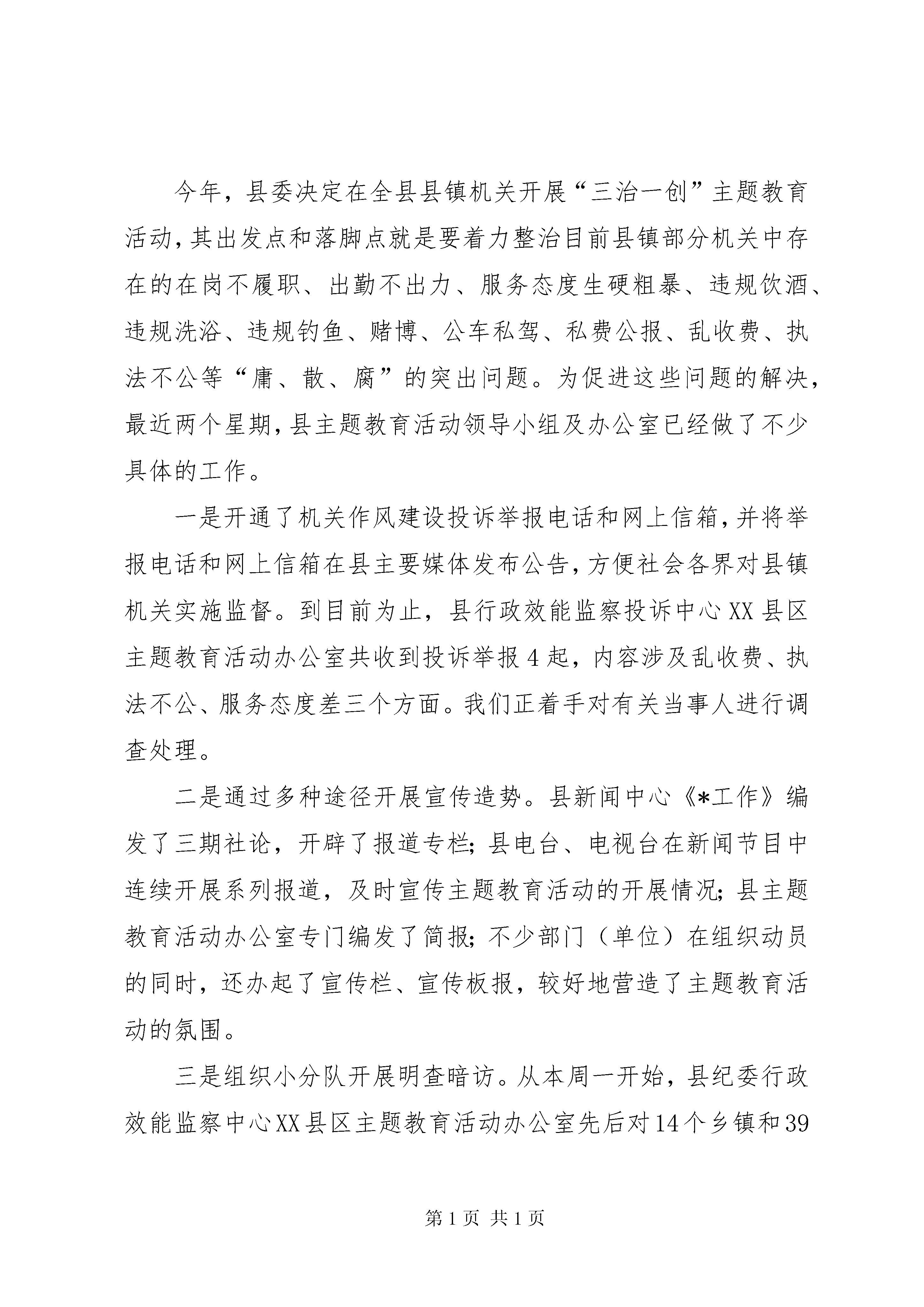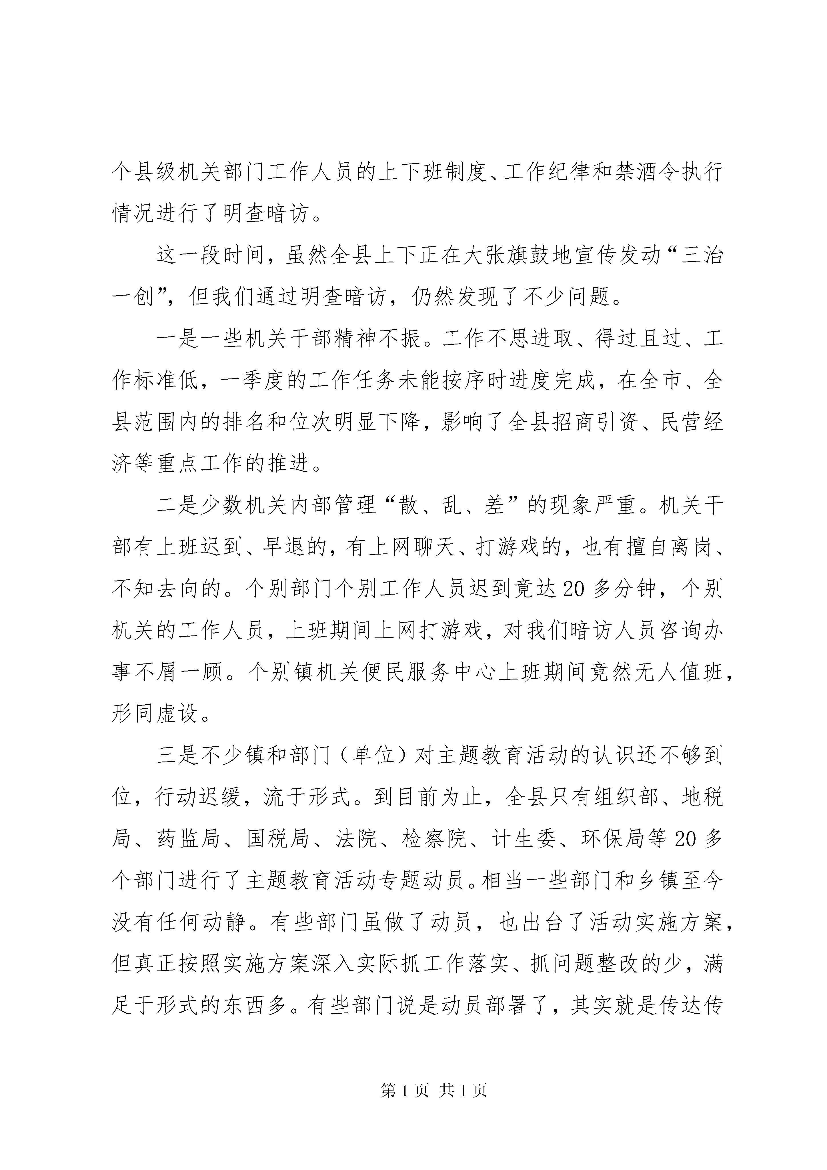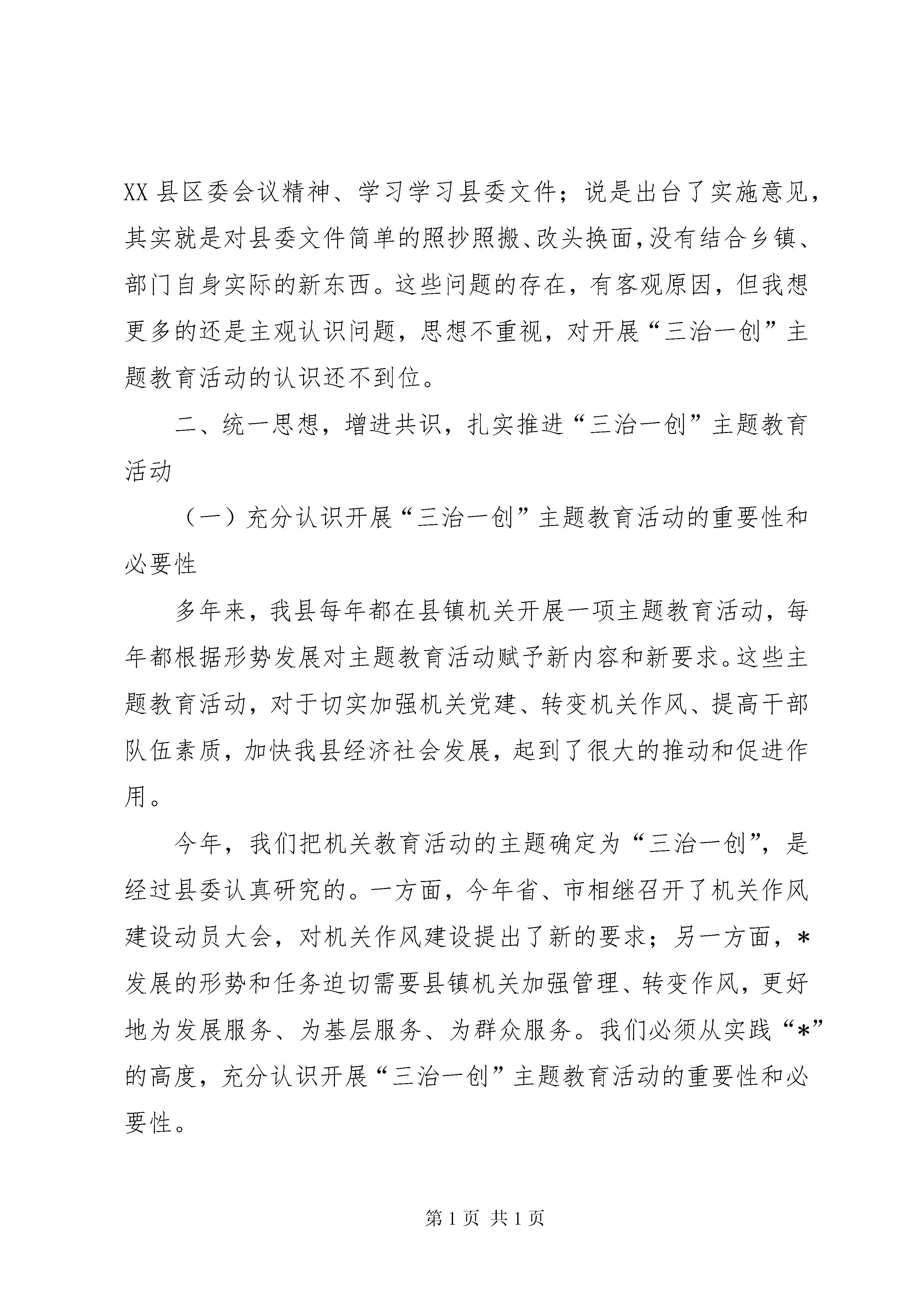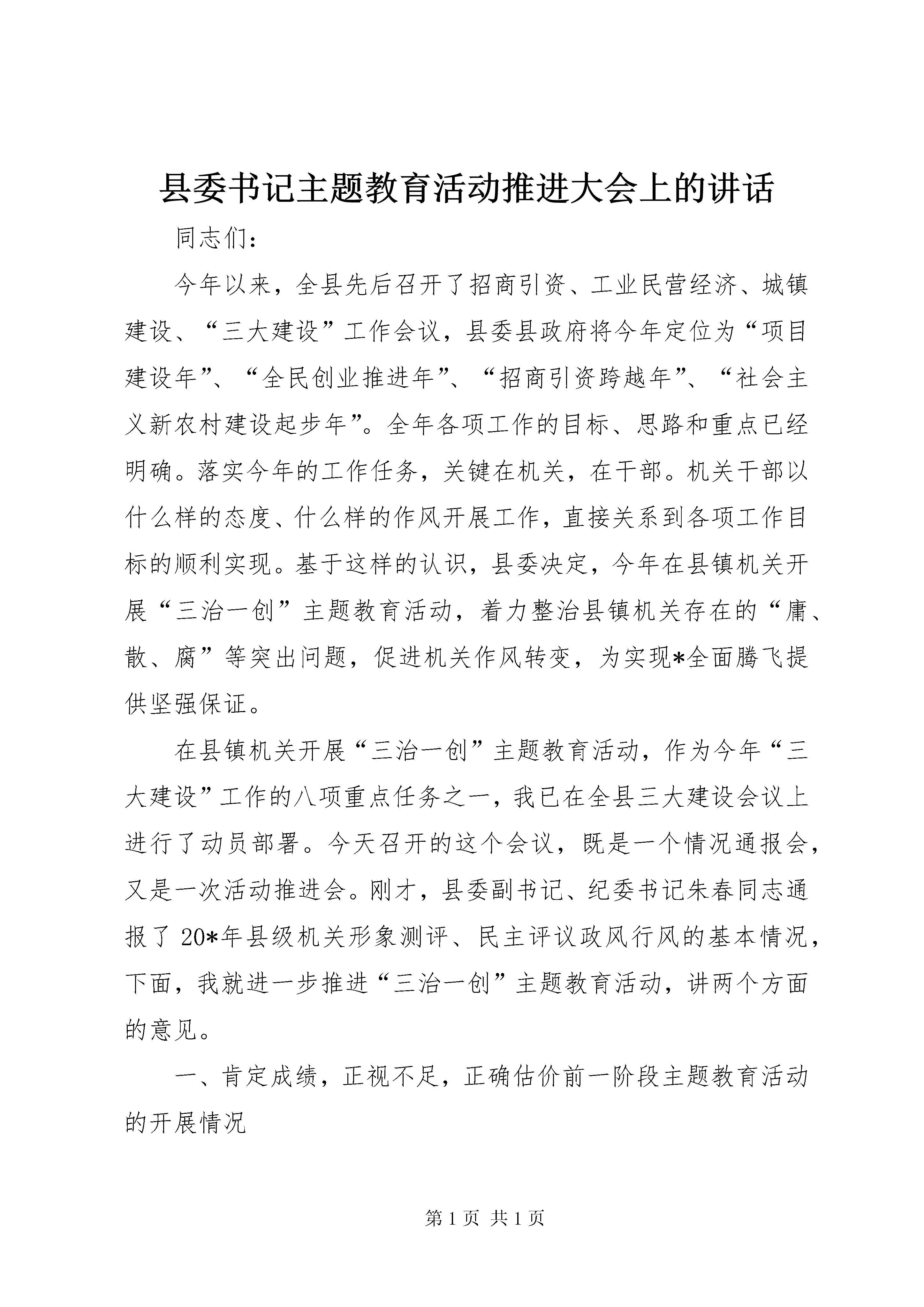 县委书记主题教育活动推进大会上的讲话同志们:今年以来,全县先后召开了招商引资、工业民营经济、城镇建设、“三大建设”工作会议,县委县政府将今年定位为“项目建设年”、“全民创业推进年”、“招商引资跨越年”、“社会主义新农村建设起步年”。全年各项工作的目标、思路和重点已经明确。落实今年的工作任务,关键在机关,在干部。机关干部以什么样的态度、什么样的作风开展工作,直接关系到各项工作目标的顺利实现。基于这样的认识,县委决定,今年在县镇机关开展“三治一创”主题教育活动,着力整治县镇机关存在的“庸、散、腐”等突出问题,促进机关作风转变,为实现*全面腾飞提供坚强保证。在县镇机关开展“三治一创”主题教育活动,作为今年“三大建设”工作的八项重点任务之一,我已在全县三大建设会议上进行了动员部署。今天召开的这个会议,既是一个情况通报会,又是一次活动推进会。刚才,县委副书记、纪委书记朱春同志通报了20*年县级机关形象测评、民主评议政风行风的基本情况,下面,我就进一步推进“三治一创”主题教育活动,讲两个方面的意见。一、肯定成绩,正视不足,正确估价前一阶段主题教育活动的开展情况今年,县委决定在全县县镇机关开展“三治一创”主题教育活动,其出发点和落脚点就是要着力整治目前县镇部分机关中存在的在岗不履职、出勤不出力、服务态度生硬粗暴、违规饮酒、违规洗浴、违规钓鱼、赌博、公车私驾、私费公报、乱收费、执法不公等“庸、散、腐”的突出问题。为促进这些问题的解决,最近两个星期,县主题教育活动领导小组及办公室已经做了不少具体的工作。一是开通了机关作风建设投诉举报电话和网上信箱,并将举报电话和网上信箱在县主要媒体发布公告,方便社会各界对县镇机关实施监督。到目前为止,县行政效能监察投诉中心XX县区主题教育活动办公室共收到投诉举报4起,内容涉及乱收费、执法不公、服务态度差三个方面。我们正着手对有关当事人进行调查处理。二是通过多种途径开展宣传造势。县新闻中心《*工作》编发了三期社论,开辟了报道专栏;县电台、电视台在新闻节目中连续开展系列报道,及时宣传主题教育活动的开展情况;县主题教育活动办公室专门编发了简报;不少部门(单位)在组织动员的同时,还办起了宣传栏、宣传板报,较好地营造了主题教育活动的氛围。三是组织小分队开展明查暗访。从本周一开始,县纪委行政效能监察中心XX县区主题教育活动办公室先后对14个乡镇和39个县级机关部门工作人员的上下班制度、工作纪律和禁酒令执行情况进行了明查暗访。这一段时间,虽然全县上下正在大张旗鼓地宣传发动“三治一创”,但我们通过明查暗访,仍然发现了不少问题。一是一些机关干部精神不振。工作不思进取、得过且过、工作标准低,一季度的工作任务未能按序时进度完成,在全市、全县范围内的排名和位次明显下降,影响了全县招商引资、民营经济等重点工作的推进。二是少数机关内部管理“散、乱、差”的现象严重。机关干部有上班迟到、早退的,有上网聊天、打游戏的,也有擅自离岗、不知去向的。个别部门个别工作人员迟到竟达20多分钟,个别机关的工作人员,上班期间上网打游戏,对我们暗访人员咨询办事不屑一顾。个别镇机关便民服务中心上班期间竟然无人值班,形同虚设。三是不少镇和部门(单位)对主题教育活动的认识还不够到位,行动迟缓,流于形式。到目前为止,全县只有组织部、地税局、药监局、国税局、法院、检察院、计生委、环保局等20多个部门进行了主题教育活动专题动员。相当一些部门和乡镇至今没有任何动静。有些部门虽做了动员,也出台了活动实施方案,但真正按照实施方案深入实际抓工作落实、抓问题整改的少,满足于形式的东西多。有些部门说是动员部署了,其实就是传达传XX县区委会议精神、学习学习县委文件;说是出台了实施意见,其实就是对县委文件简单的照抄照搬、改头换面,没有结合乡镇、部门自身实际的新东西。这些问题的存在,有客观原因,但我想更多的还是主观认识问题,思想不重视,对开展“三治一创”主题教育活动的认识还不到位。二、统一思想,增进共识,扎实推进“三治一创”主题教育活动(一)充分认识开展“三治一创”主题教育活动的重要性和必要性多年来,我县每年都在县镇机关开展一项主题教育活动,每年都根据形势发展对主题教育活动赋予新内容和新要求。这些主题教育活动,对于切实加强机关党建、转变机关作风、提高干部队伍素质,加快我县经济社会发展,起到了很大的推动和促进作用。今年,我们把机关教育活动的主题确定为“三治一创”,是经过县委认真研究的。一方面,今年省、市相继召开了机关作风建设动员大会,对机关作风建设提出了新的要求;另一方面,*发展的形势和任务迫切需要县镇机关加强管理、转变作风,更好地为发展服务、为基层服务、为群众服务。我们必须从实践“*”的高度,充分认识开展“三治一创”主题教育活动的重要性和必要性。1、开展“三治一创
