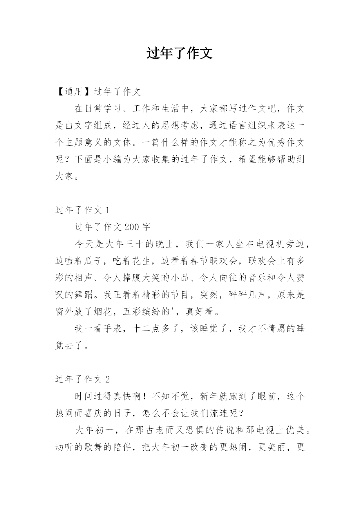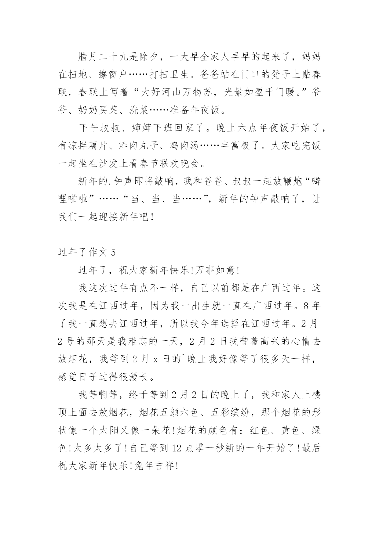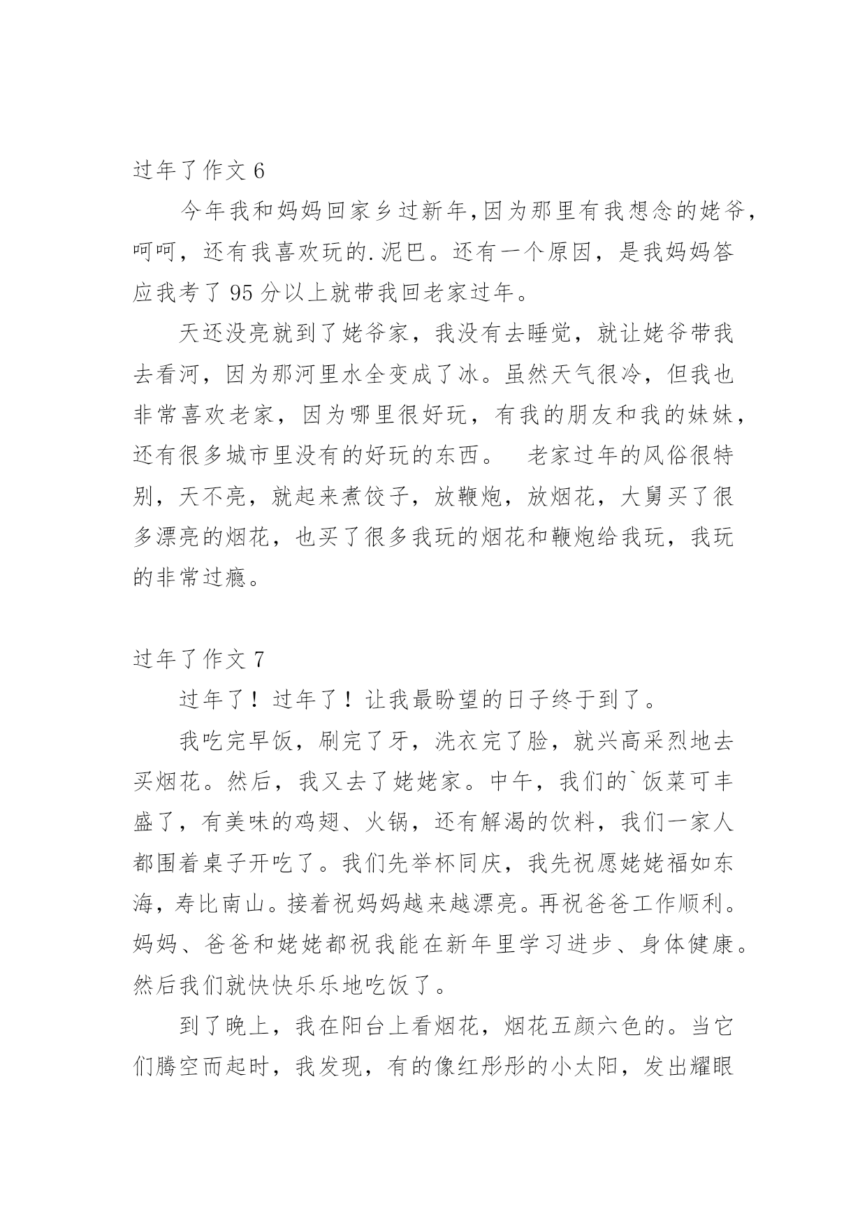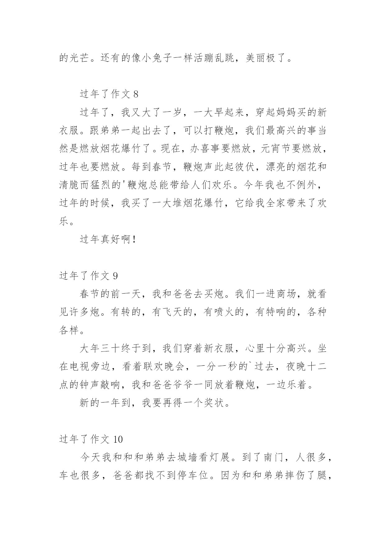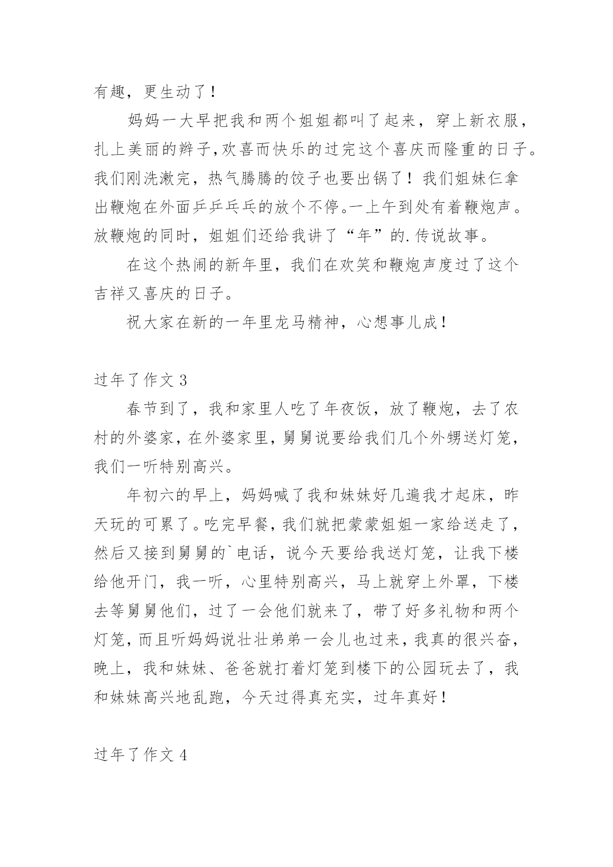 过年了作文 【通用】过年了作文在日常学习、工作和生活中,大家都写过作文吧,作文是由文字组成,经过人的思想考虑,通过语言组织来表达一个主题意义的文体。一篇什么样的作文才能称之为优秀作文呢?下面是小编为大家收集的过年了作文,希望能够帮助到大家。过年了作文1过年了作文200字今天是大年三十的晚上,我们一家人坐在电视机旁边,边嗑着瓜子,吃着花生,边看着春节联欢会,联欢会上有多彩的相声、令人捧腹大笑的小品、令人向往的音乐和令人赞叹的舞蹈。我正看着精彩的节目,突然,砰砰几声,原来是窗外放了烟花,五彩缤纷的',真好看。我一看手表,十二点多了,该睡觉了,我才不情愿的睡觉去了。过年了作文2时间过得真快啊!不知不觉,新年就跑到了眼前,这个热闹而喜庆的日子,怎么不会让我们流连呢?大年初一,在那古老而又恐惧的传说和那电视上优美。动听的歌舞的陪伴,把大年初一改变的更热闹,更美丽,更有趣,更生动了!妈妈一大早把我和两个姐姐都叫了起来,穿上新衣服,扎上美丽的辫子,欢喜而快乐的过完这个喜庆而隆重的日子。我们刚洗漱完,热气腾腾的饺子也要出锅了!我们姐妹仨拿出鞭炮在外面乒乒乓乓的放个不停。一上午到处有着鞭炮声。放鞭炮的同时,姐姐们还给我讲了“年”的.传说故事。在这个热闹的新年里,我们在欢笑和鞭炮声度过了这个吉祥又喜庆的日子。祝大家在新的一年里龙马精神,心想事儿成!过年了作文3春节到了,我和家里人吃了年夜饭,放了鞭炮,去了农村的外婆家,在外婆家里,舅舅说要给我们几个外甥送灯笼,我们一听特别高兴。年初六的早上,妈妈喊了我和妹妹好几遍我才起床,昨天玩的可累了。吃完早餐,我们就把蒙蒙姐姐一家给送走了,然后又接到舅舅的`电话,说今天要给我送灯笼,让我下楼给他开门,我一听,心里特别高兴,马上就穿上外罩,下楼去等舅舅他们,过了一会他们就来了,带了好多礼物和两个灯笼,而且听妈妈说壮壮弟弟一会儿也过来,我真的很兴奋,晚上,我和妹妹、爸爸就打着灯笼到楼下的公园玩去了,我和妹妹高兴地乱跑,今天过得真充实,过年真好!过年了作文4腊月二十九是除夕,一大早全家人早早的起来了,妈妈在扫地、擦窗户……打扫卫生。爸爸站在门口的凳子上贴春联,春联上写着“大好河山万物苏,光景如盈千门暖。”爷爷、奶奶买菜、洗菜……准备年夜饭。下午叔叔、婶婶下班回家了。晚上六点年夜饭开始了,有凉拌藕片、炸肉丸子、鸡肉汤……丰富极了。大家吃完饭一起坐在沙发上看春节联欢晚会。新年的.钟声即将敲响,我和爸爸、叔叔一起放鞭炮“噼哩啪啦”……“当、当、当……”,新年的钟声敲响了,让我们一起迎接新年吧!过年了作文5过年了,祝大家新年快乐!万事如意!我这次过年有点不一样,自己以前都是在广西过年。这次我是在江西过年,因为我一出生就一直在广西过年。8年了我一直想去江西过年,所以我今年选择在江西过年。2月2号的那天是我难忘的一天,2月2日我带着高兴的心情去放烟花,我等到2月x日的`晚上我好像等了很多天一样,感觉日子过得很漫长。我等啊等,终于等到2月2日的晚上了,我和家人上楼顶上面去放烟花,烟花五颜六色、五彩缤纷,那个烟花的形状像一个太阳又像一朵花!烟花的颜色有:红色、黄色、绿色!太多太多了!自己等到12点零一秒新的一年开始了!最后祝大家新年快乐!兔年吉祥!过年了作文6今年我和妈妈回家乡过新年,因为那里有我想念的姥爷,呵呵,还有我喜欢玩的.泥巴。还有一个原因,是我妈妈答应我考了95分以上就带我回老家过年。天还没亮就到了姥爷家,我没有去睡觉,就让姥爷带我去看河,因为那河里水全变成了冰。虽然天气很冷,但我也非常喜欢老家,因为哪里很好玩,有我的朋友和我的妹妹,还有很多城市里没有的好玩的东西。老家过年的风俗很特别,天不亮,就起来煮饺子,放鞭炮,放烟花,大舅买了很多漂亮的烟花,也买了很多我玩的烟花和鞭炮给我玩,我玩的非常过瘾。过年了作文7过年了!过年了!让我最盼望的日子终于到了。我吃完早饭,刷完了牙,洗衣完了脸,就兴高采烈地去买烟花。然后,我又去了姥姥家。中午,我们的`饭菜可丰盛了,有美味的鸡翅、火锅,还有解渴的饮料,我们一家人都围着桌子开吃了。我们先举杯同庆,我先祝愿姥姥福如东海,寿比南山。接着祝妈妈越来越漂亮。再祝爸爸工作顺利。妈妈、爸爸和姥姥都祝我能在新年里学习进步、身体健康。然后我们就快快乐乐地吃饭了。到了晚上,我在阳台上看烟花,烟花五颜六色的。当它们腾空而起时,我发现,有的像红彤彤的小太阳,发出耀眼的光芒。还有的像小兔子一样活蹦乱跳,美丽极了。过年了作文8过年了,我又大了一岁,一大早起来,穿起妈妈买的新衣服。跟弟弟一起出去了,可以打鞭炮,我们最高兴的事当然是燃放烟花爆竹了。现在,办喜事要燃放,元宵节要燃放,过年也要燃放。每到春节,鞭炮声此起彼伏,漂亮的烟花和清脆而猛烈的'鞭炮总能带给人们欢乐。今年我也不例外,过年的时候,我买了一大堆烟花爆