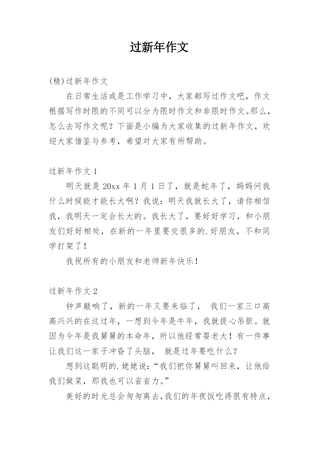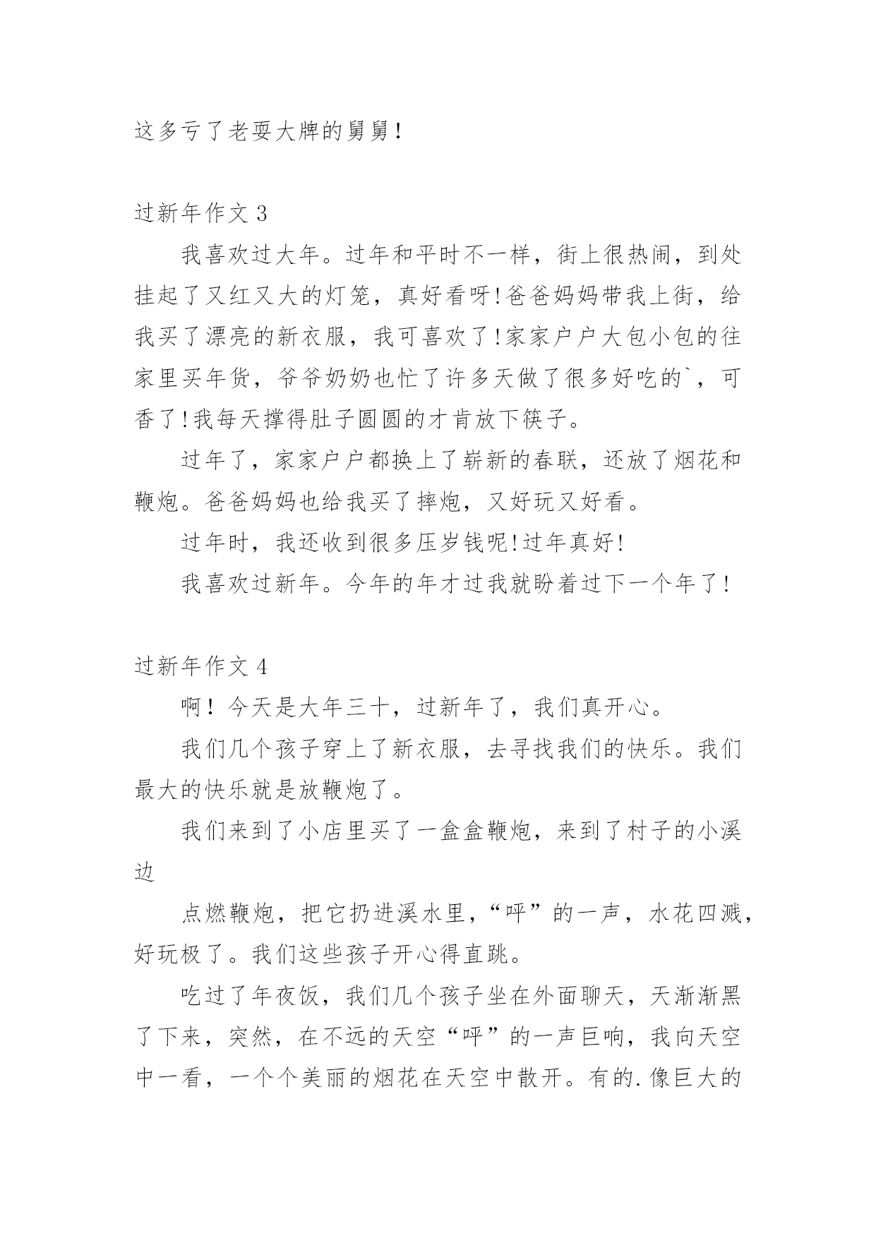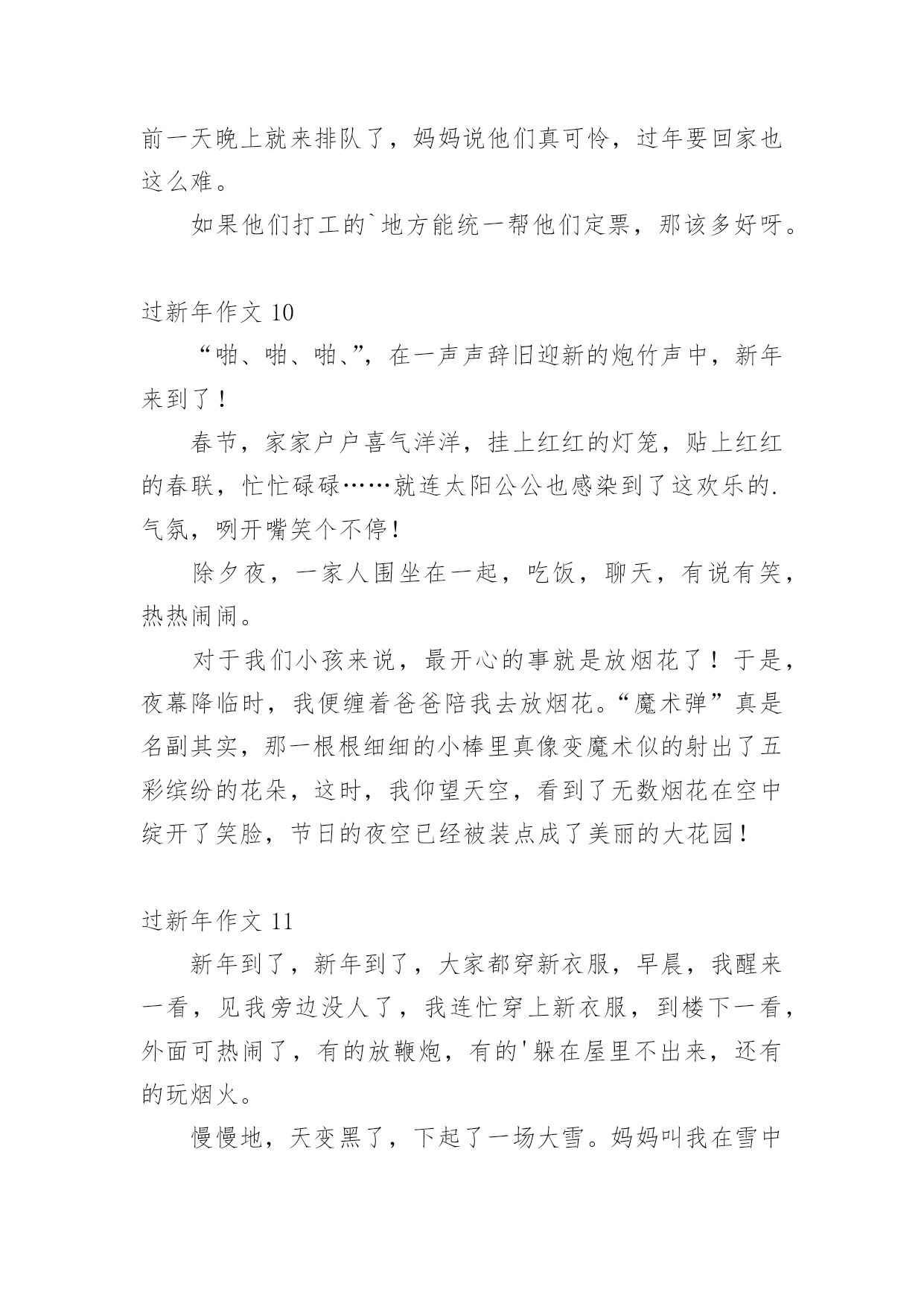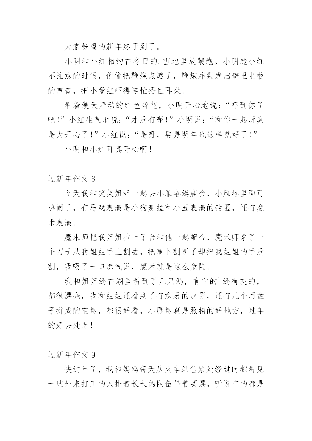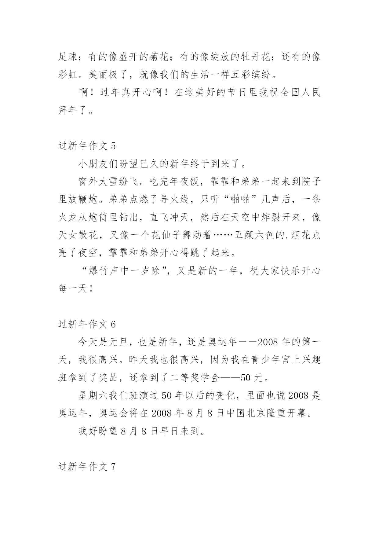 过新年作文 (精)过新年作文在日常生活或是工作学习中,大家都写过作文吧,作文根据写作时限的不同可以分为限时作文和非限时作文。那么,怎么去写作文呢?下面是小编为大家收集的过新年作文,欢迎大家借鉴与参考,希望对大家有所帮助。过新年作文1明天就是20xx年1月1日了,就是蛇年了,妈妈问我什么时候能才能长大啊?我说:明天我就长大了,请你相信我,我明天一定会长大的。我长大了,要好好学习,和小朋友们好好相处,在新的一年里要交很多的.好朋友,不和同学打架了!我祝所有的小朋友和老师新年快乐!过新年作文2钟声敲响了,新的一年又要来临了,我们一家三口高高兴兴的在这过年,一想到今年是牛年,我就提心吊胆。就因为今年是我舅舅的本命年,所以他经常耍老大!有一件事让我们这一家子冲昏了头脑,就是过年要吃什么?想到这聪明的.姥姥说:“我们把你舅舅叫回来,让他给我们做菜,那我也可以省省力。”美好的时光总会匆匆离去,我们的年夜饭吃得很有特点,这多亏了老耍大牌的舅舅!过新年作文3我喜欢过大年。过年和平时不一样,街上很热闹,到处挂起了又红又大的灯笼,真好看呀!爸爸妈妈带我上街,给我买了漂亮的新衣服,我可喜欢了!家家户户大包小包的往家里买年货,爷爷奶奶也忙了许多天做了很多好吃的`,可香了!我每天撑得肚子圆圆的才肯放下筷子。过年了,家家户户都换上了崭新的春联,还放了烟花和鞭炮。爸爸妈妈也给我买了摔炮,又好玩又好看。过年时,我还收到很多压岁钱呢!过年真好!我喜欢过新年。今年的年才过我就盼着过下一个年了!过新年作文4啊!今天是大年三十,过新年了,我们真开心。我们几个孩子穿上了新衣服,去寻找我们的快乐。我们最大的快乐就是放鞭炮了。我们来到了小店里买了一盒盒鞭炮,来到了村子的小溪边点燃鞭炮,把它扔进溪水里,“呯”的一声,水花四溅,好玩极了。我们这些孩子开心得直跳。吃过了年夜饭,我们几个孩子坐在外面聊天,天渐渐黑了下来,突然,在不远的天空“呯”的一声巨响,我向天空中一看,一个个美丽的烟花在天空中散开。有的.像巨大的足球;有的像盛开的菊花;有的像绽放的牡丹花;还有的像彩虹。美丽极了,就像我们的生活一样五彩缤纷。啊!过年真开心啊!在这美好的节日里我祝全国人民拜年了。过新年作文5小朋友们盼望已久的新年终于到来了。窗外大雪纷飞。吃完年夜饭,霏霏和弟弟一起来到院子里放鞭炮。弟弟点燃了导火线,只听“啪啪”几声后,一条火龙从炮筒里钻出,直飞冲天,然后在天空中炸裂开来,像天女散花,又像一个花仙子舞动着……五颜六色的.烟花点亮了夜空,霏霏和弟弟开心得跳了起来。“爆竹声中一岁除”,又是新的一年,祝大家快乐开心每一天!过新年作文6今天是元旦,也是新年,还是奥运年――2008年的第一天,我很高兴。昨天我也很高兴,因为我在青少年宫上兴趣班拿到了奖品,还拿到了二等奖学金——50元。星期六我们班演过50年以后的变化,里面也说2008是奥运年,奥运会将在2008年8月8日中国北京隆重开幕。我好盼望8月8日早日来到。过新年作文7大家盼望的新年终于到了。小明和小红相约在冬日的.雪地里放鞭炮。小明趁小红不注意的时候,偷偷把鞭炮点燃了,鞭炮炸裂发出噼里啪啦的声音,把小爱红吓得连忙捂住耳朵。看着漫天舞动的红色碎花,小明开心地说:“吓到你了吧!”小红生气地说:“才没有呢!”小明说:“和你一起玩真是太开心了!”小红说:“是呀,要是明年也这样就好了!”小明和小红可真开心啊!过新年作文8今天我和笑笑姐姐一起去小雁塔逛庙会,小雁塔里面可热闹了,有马戏表演是小狗麦拉和小丑表演的钻圈,还有魔术表演。魔术师把我姐姐拉上了台和他一起配合,魔术师拿了一个刀子从我姐姐手上割去,把萝卜割断了却把我姐姐的手没割,我吸了一口凉气说,魔术就是这么危险。我和姐姐还在湖里看到了几只鹅,有白的`还有灰的,都很漂亮,我和姐姐还看到了有意思的皮影,还有几个用盘子拼成的宝塔,都很好看,小雁塔真是照相的好地方,过年的好去处呀!过新年作文9快过年了,我和妈妈每天从火车站售票处经过时都看见一些外来打工的人排着长长的队伍等着买票,听说有的都是前一天晚上就来排队了,妈妈说他们真可怜,过年要回家也这么难。如果他们打工的`地方能统一帮他们定票,那该多好呀。过新年作文10“啪、啪、啪、”,在一声声辞旧迎新的炮竹声中,新年来到了!春节,家家户户喜气洋洋,挂上红红的灯笼,贴上红红的春联,忙忙碌碌……就连太阳公公也感染到了这欢乐的.气氛,咧开嘴笑个不停!除夕夜,一家人围坐在一起,吃饭,聊天,有说有笑,热热闹闹。对于我们小孩来说,最开心的事就是放烟花了!于是,夜幕降临时,我便缠着爸爸陪我去放烟花。“魔术弹”真是名副其实,那一根根细细的小棒里真像变魔术似的射出了五彩缤纷的花朵,这时,我仰望天空,看到了无数烟花在空中绽开了笑脸,节日的夜空已经被装点成了美丽的大花园!过新年作文11新年到了,