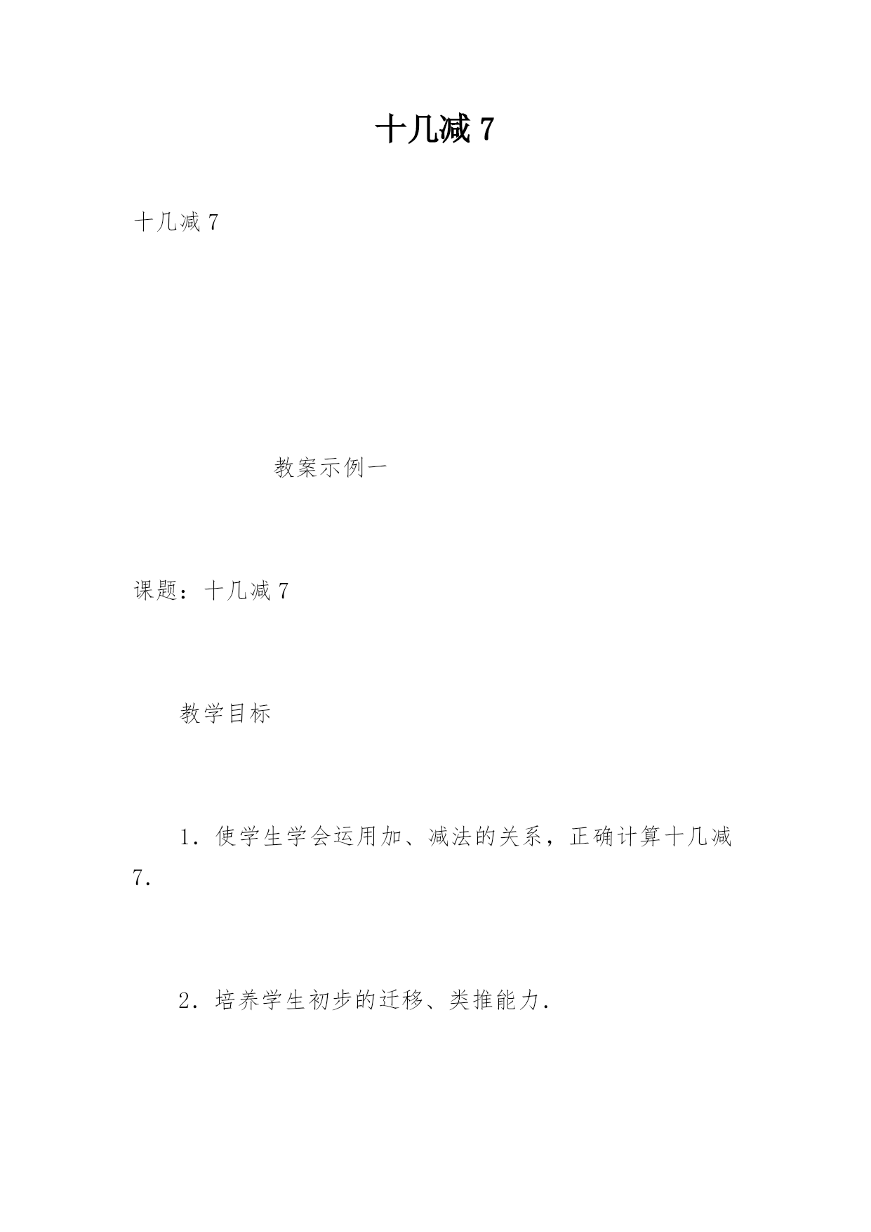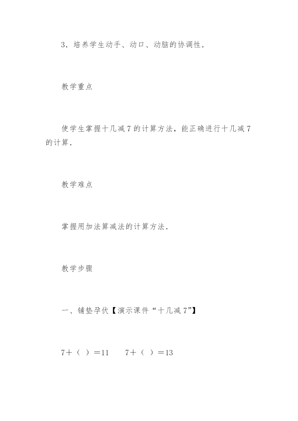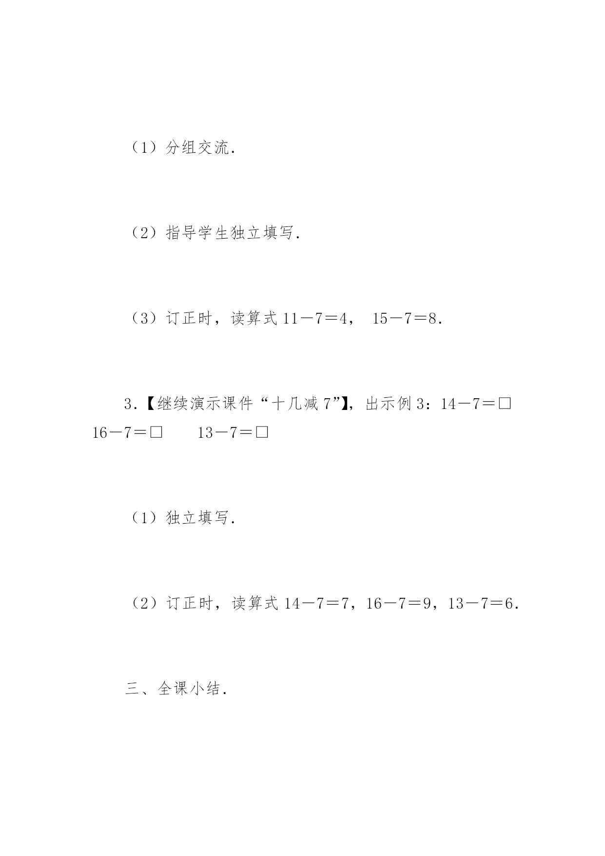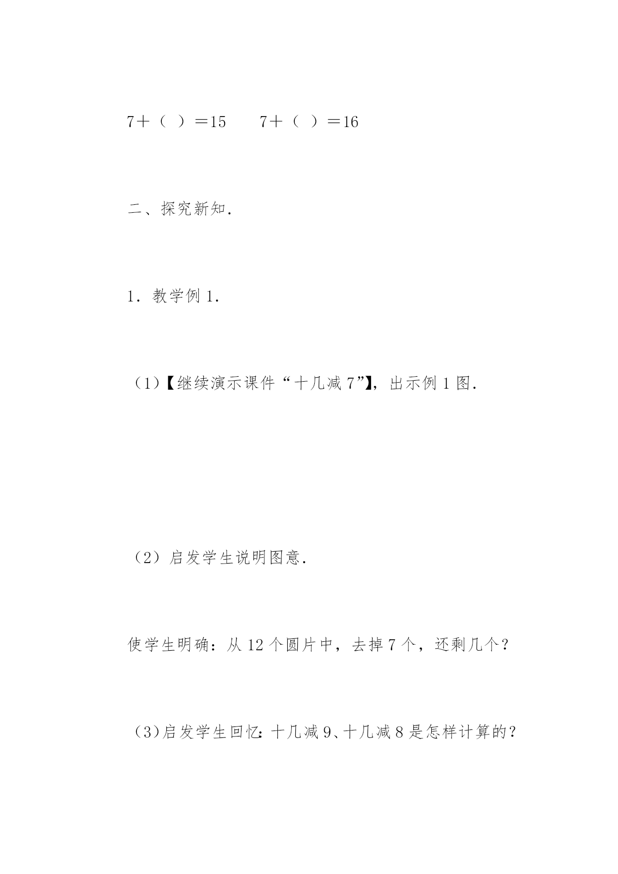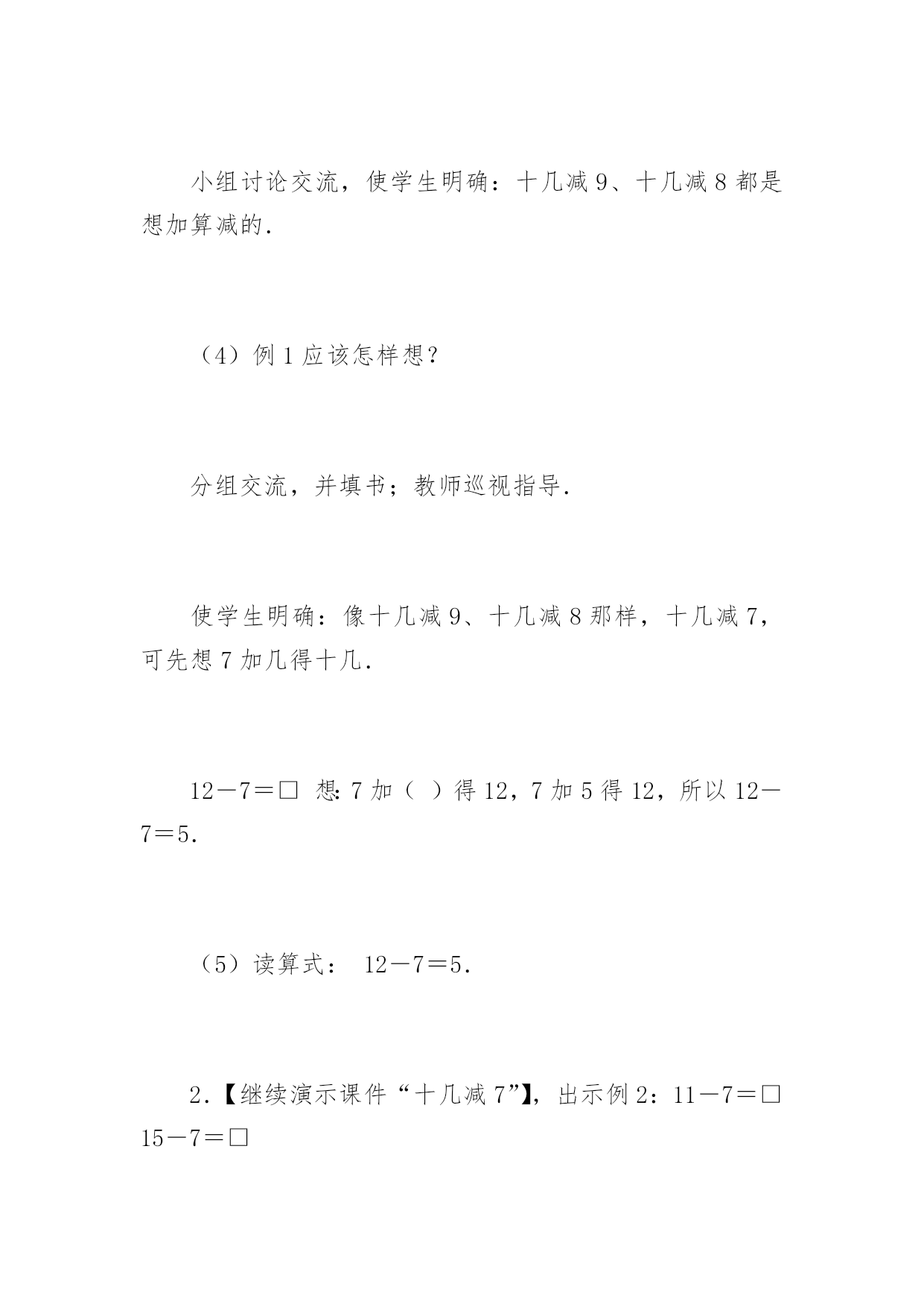 十几减7 十几减7教案示例一课题:十几减7教学目标1.使学生学会运用加、减法的关系,正确计算十几减7.2.培养学生初步的迁移、类推能力.3.培养学生动手、动口、动脑的协调性.教学重点使学生掌握十几减7的计算方法,能正确进行十几减7的计算.教学难点掌握用加法算减法的计算方法.教学步骤一、铺垫孕伏【演示课件“十几减7”】7+()=117+()=137+()=157+()=16二、探究新知.1.教学例1.(1)【继续演示课件“十几减7”】,出示例1图.(2)启发学生说明图意.使学生明确:从12个圆片中,去掉7个,还剩几个?(3)启发学生回忆:十几减9、十几减8是怎样计算的?小组讨论交流,使学生明确:十几减9、十几减8都是想加算减的.(4)例1应该怎样想?分组交流,并填书;教师巡视指导.使学生明确:像十几减9、十几减8那样,十几减7,可先想7加几得十几.12-7=□想:7加()得12,7加5得12,所以12-7=5.(5)读算式:12-7=5.2.【继续演示课件“十几减7”】,出示例2:11-7=□15-7=□(1)分组交流.(2)指导学生独立填写.(3)订正时,读算式11-7=4,15-7=8.3.【继续演示课件“十几减7”】,出示例3:14-7=□16-7=□13-7=□(1)独立填写.(2)订正时,读算式14-7=7,16-7=9,13-7=6.三、全课小结.教师引导学生总结十几减7的口算.随堂练习1.“做一做”第1题.7+5=7+7=7+8=12-7=14-7=15-7=一组一组地出示,做减法时说一说都是怎样想的.2.“做一做”第2题.7+□=117+□=137+□=1611-7=□13-7=□16-7=□学生无独立填写,订正时说一说是怎样想的.布置作业1.2.11-7=13-7=15-7=12-7=14-7=16-7=板书设计教案示例二课题:求另一个加数的减法应用题教学目标1.使学生初步学会解答求另一个加数的减法应用题.2.使学生知道简单应用题的结构和解题步骤.理解“求另一个加数的减法应用题”的数量关系,培养学生认真审题的学习习惯.3.通过比较例4和例5两种应用题的异同点,初步培养学生的观察和分析能力.教学重点求一个加数的减法应用题.教学难点根据数量关系灵活地选择解答方法.教学步骤一、铺垫孕伏【演示课件“求另一个加数的减法应用题”】1.口算:14-8=15-9=12-7=15-7=7+5=13-8=7+8=11-8=13-7=17-9=16-7=12-9=2.3.(1)(2)二、教学例4.由复习题3(1)引出例4.可以设计情境:草地上跑来7只白兔,又跑来5只黑兔.(1)引导学生根据情境提出问题.【继续演示课件“求另一个加数的减法应用题”】,出示例4.(2)正确读题.(3)指名找出两个已知条件和一个问题.教师在原题上画批.(4)根据条件和问题出示兔图.结合图教师提问:要求一共有多少只两个同学互相说一说,并在练习本上列式计算出结果.请一名学生口述,教师板书.(5)列式计算7+5=12(只).(6)口答:一共有12只兔.集体订正后师问:这道题为什么用加法解答?(求一共养多少只兔,就要把7只白兔和5只黑兔合起来,所以用加法解答)2.教学例5.【继续演示课件“求另一个加数的减法应用题”】由复习题3(2)引出例5.(1)学生读题.(2)指名叙述题意,说出已知条件的问题.同时教师出示:(3)比较例4和例5的相同点和不同点.(4)教师引导学生把两幅图联系起来说明:白兔的只数加上黑兔的只数一共是12只,白兔有7只,去掉白兔,剩下的就是黑兔.提问:求黑兔有几只,用什么方法计算?引导学生联系减法的含义:从一个数里去掉一部分,求另一部分用减法计算.算式为12-7=5(只).3.比较.师:这两道应用题有哪些地方相同?哪些地方不同?让学生充分发表意见,然后师生共同总结归纳出结果:相同的地方是:学校养7只白兔.不同的地方是:两个已知条件中的一个不同,问题也不同,解答方法也不同.师:什么时候用加法解答?什么时候用减法解答?(求两数和,用加法.已知和与一个加数,求另一个加数,用减法)三、全课小结.请同学们汇报这节课你又学会了什么知识?随堂练习1.小明家有7条白金鱼,8条红金鱼,一共有多少条金鱼?2.小明家有白金鱼和红金鱼一共15条.白金鱼有7条,红金鱼有几条?学生独立完成,然后订正,请学生说出想的过程.布置作业练习三10、11板书设计探究活动游戏:找朋友游戏目的使学生在轻松活泼的气氛中复习20以内的减法.游戏准备教师制作如下的数字卡和算式卡:游戏过程1.教师发下数字卡和算式卡.2.游戏过程举例:拿着的同学说:“我的朋友在哪里?”,拿着卡片的同学就回答:“你的朋友在这里”,并立刻走到拿的同学身边.其它的同学一起读:10减3等于7,对对对,请上位.