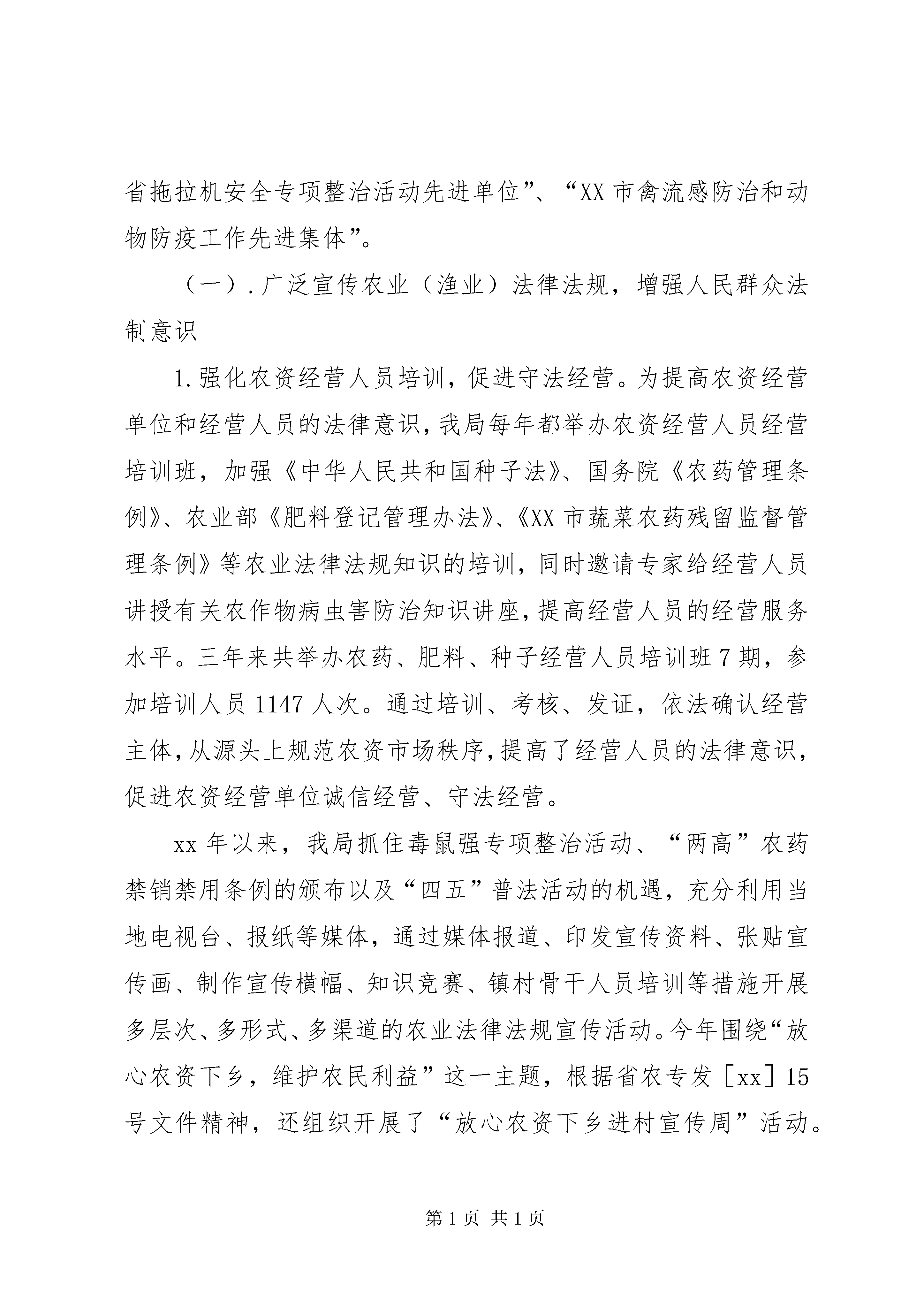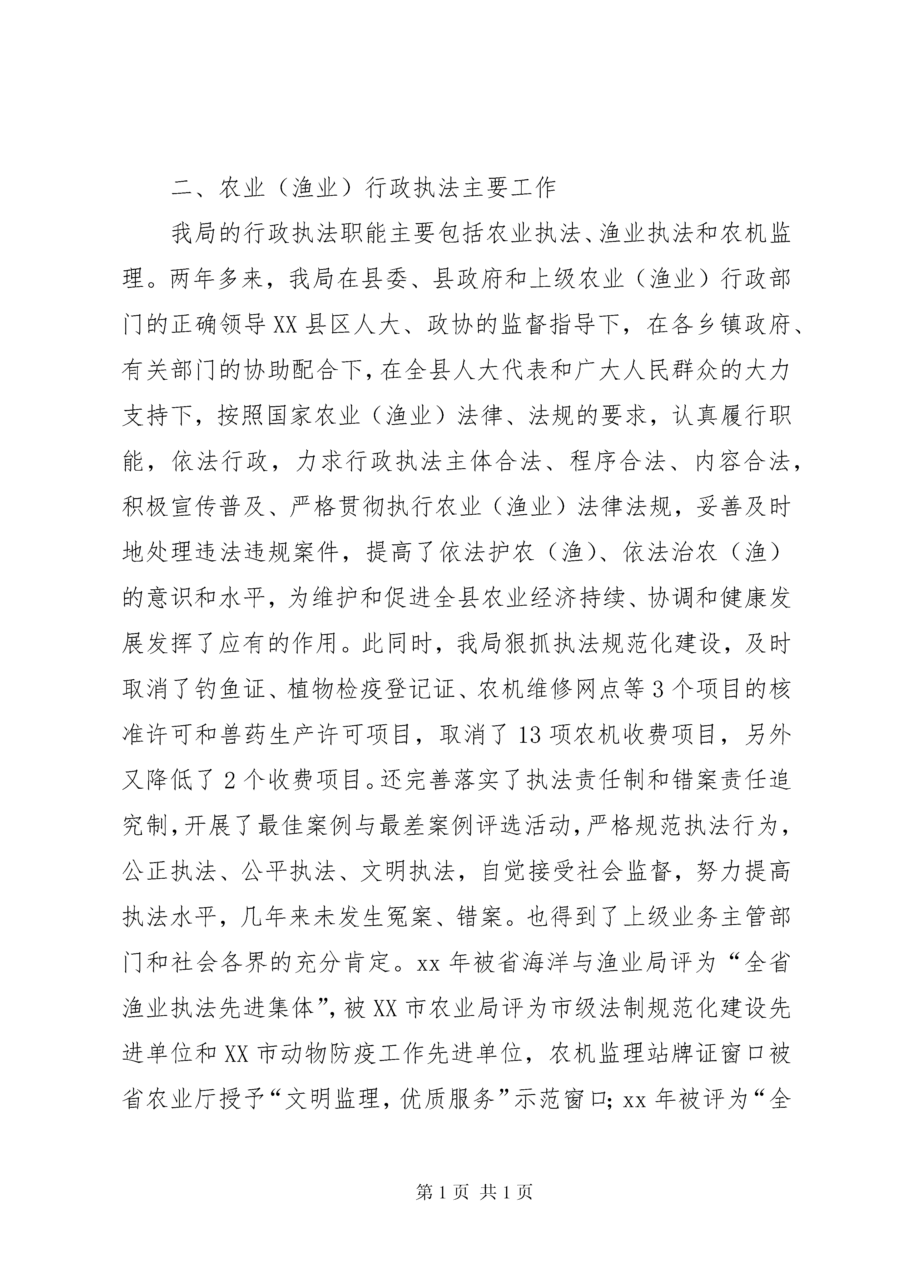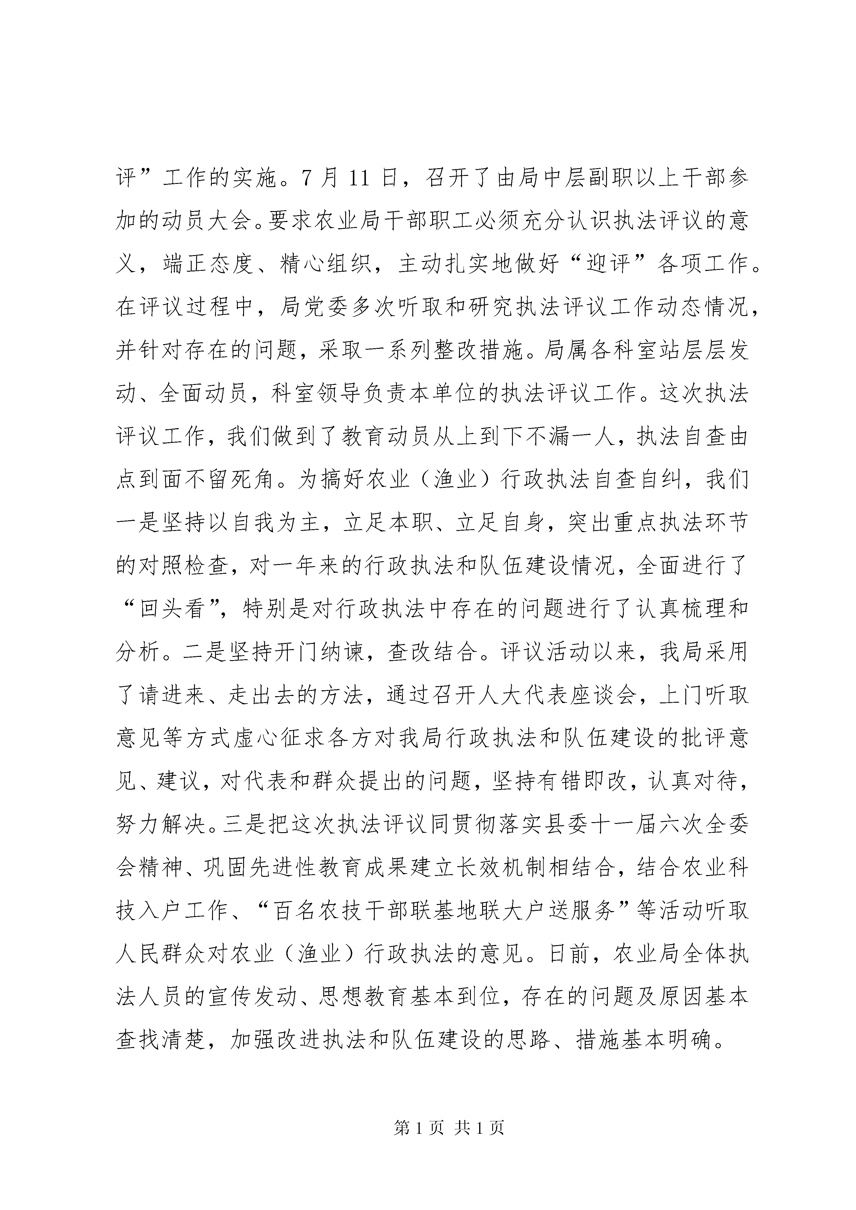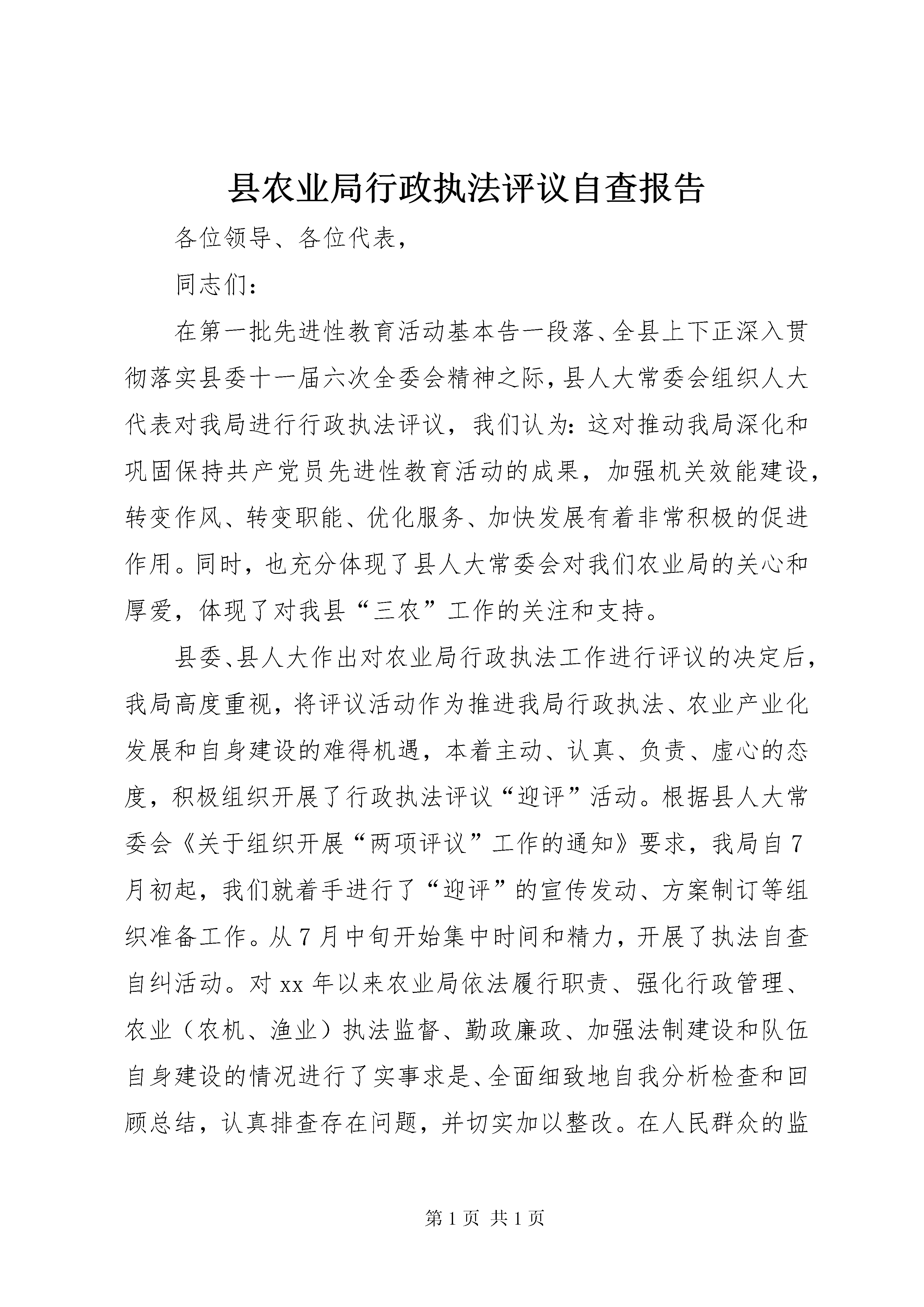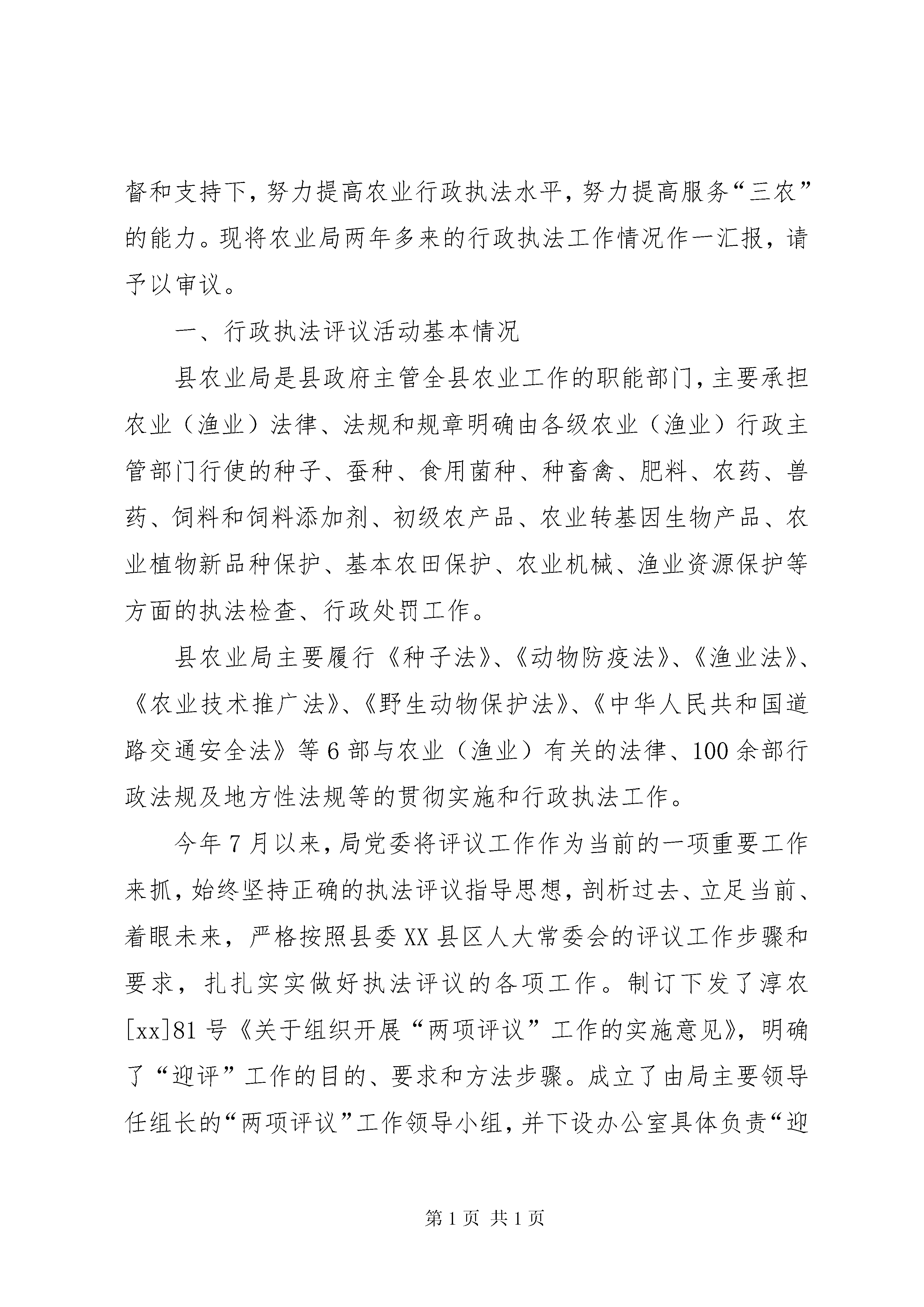 县农业局行政执法评议自查报告各位领导、各位代表,同志们:在第一批先进性教育活动基本告一段落、全县上下正深入贯彻落实县委十一届六次全委会精神之际,县人大常委会组织人大代表对我局进行行政执法评议,我们认为:这对推动我局深化和巩固保持共产党员先进性教育活动的成果,加强机关效能建设,转变作风、转变职能、优化服务、加快发展有着非常积极的促进作用。同时,也充分体现了县人大常委会对我们农业局的关心和厚爱,体现了对我县“三农”工作的关注和支持。县委、县人大作出对农业局行政执法工作进行评议的决定后,我局高度重视,将评议活动作为推进我局行政执法、农业产业化发展和自身建设的难得机遇,本着主动、认真、负责、虚心的态度,积极组织开展了行政执法评议“迎评”活动。根据县人大常委会《关于组织开展“两项评议”工作的通知》要求,我局自7月初起,我们就着手进行了“迎评”的宣传发动、方案制订等组织准备工作。从7月中旬开始集中时间和精力,开展了执法自查自纠活动。对xx年以来农业局依法履行职责、强化行政管理、农业(农机、渔业)执法监督、勤政廉政、加强法制建设和队伍自身建设的情况进行了实事求是、全面细致地自我分析检查和回顾总结,认真排查存在问题,并切实加以整改。在人民群众的监督和支持下,努力提高农业行政执法水平,努力提高服务“三农”的能力。现将农业局两年多来的行政执法工作情况作一汇报,请予以审议。一、行政执法评议活动基本情况县农业局是县政府主管全县农业工作的职能部门,主要承担农业(渔业)法律、法规和规章明确由各级农业(渔业)行政主管部门行使的种子、蚕种、食用菌种、种畜禽、肥料、农药、兽药、饲料和饲料添加剂、初级农产品、农业转基因生物产品、农业植物新品种保护、基本农田保护、农业机械、渔业资源保护等方面的执法检查、行政处罚工作。县农业局主要履行《种子法》、《动物防疫法》、《渔业法》、《农业技术推广法》、《野生动物保护法》、《中华人民共和国道路交通安全法》等6部与农业(渔业)有关的法律、100余部行政法规及地方性法规等的贯彻实施和行政执法工作。今年7月以来,局党委将评议工作作为当前的一项重要工作来抓,始终坚持正确的执法评议指导思想,剖析过去、立足当前、着眼未来,严格按照县委XX县区人大常委会的评议工作步骤和要求,扎扎实实做好执法评议的各项工作。制订下发了淳农[xx]81号《关于组织开展“两项评议”工作的实施意见》,明确了“迎评”工作的目的、要求和方法步骤。成立了由局主要领导任组长的“两项评议”工作领导小组,并下设办公室具体负责“迎评”工作的实施。7月11日,召开了由局中层副职以上干部参加的动员大会。要求农业局干部职工必须充分认识执法评议的意义,端正态度、精心组织,主动扎实地做好“迎评”各项工作。在评议过程中,局党委多次听取和研究执法评议工作动态情况,并针对存在的问题,采取一系列整改措施。局属各科室站层层发动、全面动员,科室领导负责本单位的执法评议工作。这次执法评议工作,我们做到了教育动员从上到下不漏一人,执法自查由点到面不留死角。为搞好农业(渔业)行政执法自查自纠,我们一是坚持以自我为主,立足本职、立足自身,突出重点执法环节的对照检查,对一年来的行政执法和队伍建设情况,全面进行了“回头看”,特别是对行政执法中存在的问题进行了认真梳理和分析。二是坚持开门纳谏,查改结合。评议活动以来,我局采用了请进来、走出去的方法,通过召开人大代表座谈会,上门听取意见等方式虚心征求各方对我局行政执法和队伍建设的批评意见、建议,对代表和群众提出的问题,坚持有错即改,认真对待,努力解决。三是把这次执法评议同贯彻落实县委十一届六次全委会精神、巩固先进性教育成果建立长效机制相结合,结合农业科技入户工作、“百名农技干部联基地联大户送服务”等活动听取人民群众对农业(渔业)行政执法的意见。日前,农业局全体执法人员的宣传发动、思想教育基本到位,存在的问题及原因基本查找清楚,加强改进执法和队伍建设的思路、措施基本明确。二、农业(渔业)行政执法主要工作我局的行政执法职能主要包括农业执法、渔业执法和农机监理。两年多来,我局在县委、县政府和上级农业(渔业)行政部门的正确领导XX县区人大、政协的监督指导下,在各乡镇政府、有关部门的协助配合下,在全县人大代表和广大人民群众的大力支持下,按照国家农业(渔业)法律、法规的要求,认真履行职能,依法行政,力求行政执法主体合法、程序合法、内容合法,积极宣传普及、严格贯彻执行农业(渔业)法律法规,妥善及时地处理违法违规案件,提高了依法护农(渔)、依法治农(渔)的意识和水平,为维护和促进全县农业经济持续、协调和健康发展发挥了应有的作用。此同时,我局狠抓执法规范化建设,及时取消了钓鱼证、植物检疫登记证、农机维修网点等3个项目的核准许可和兽药生产许可项目,取消了13项