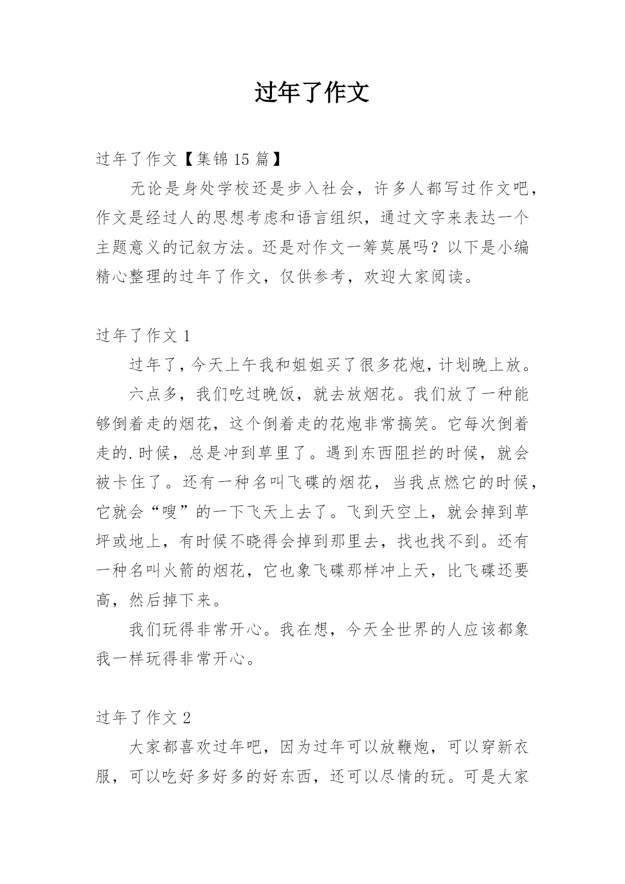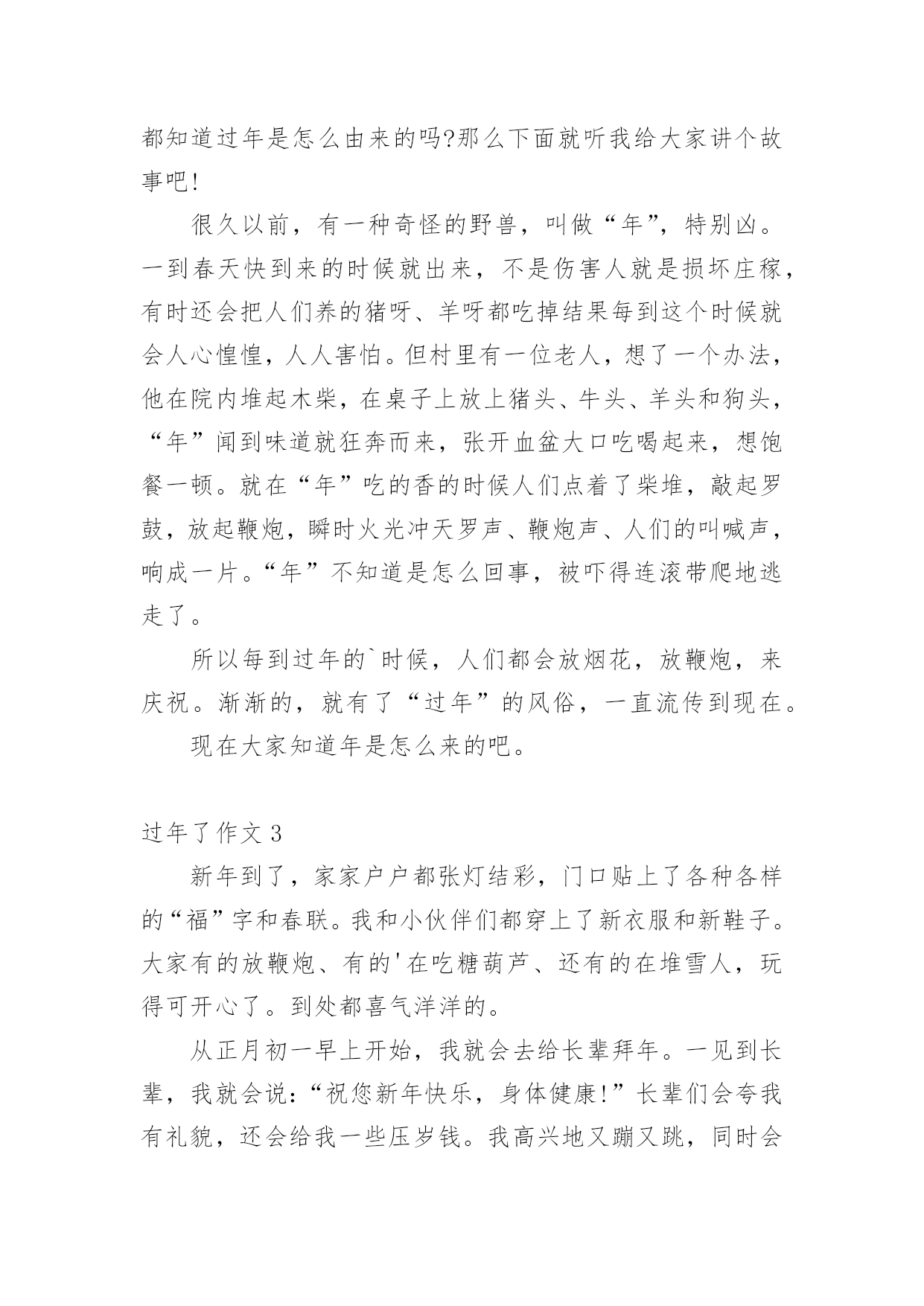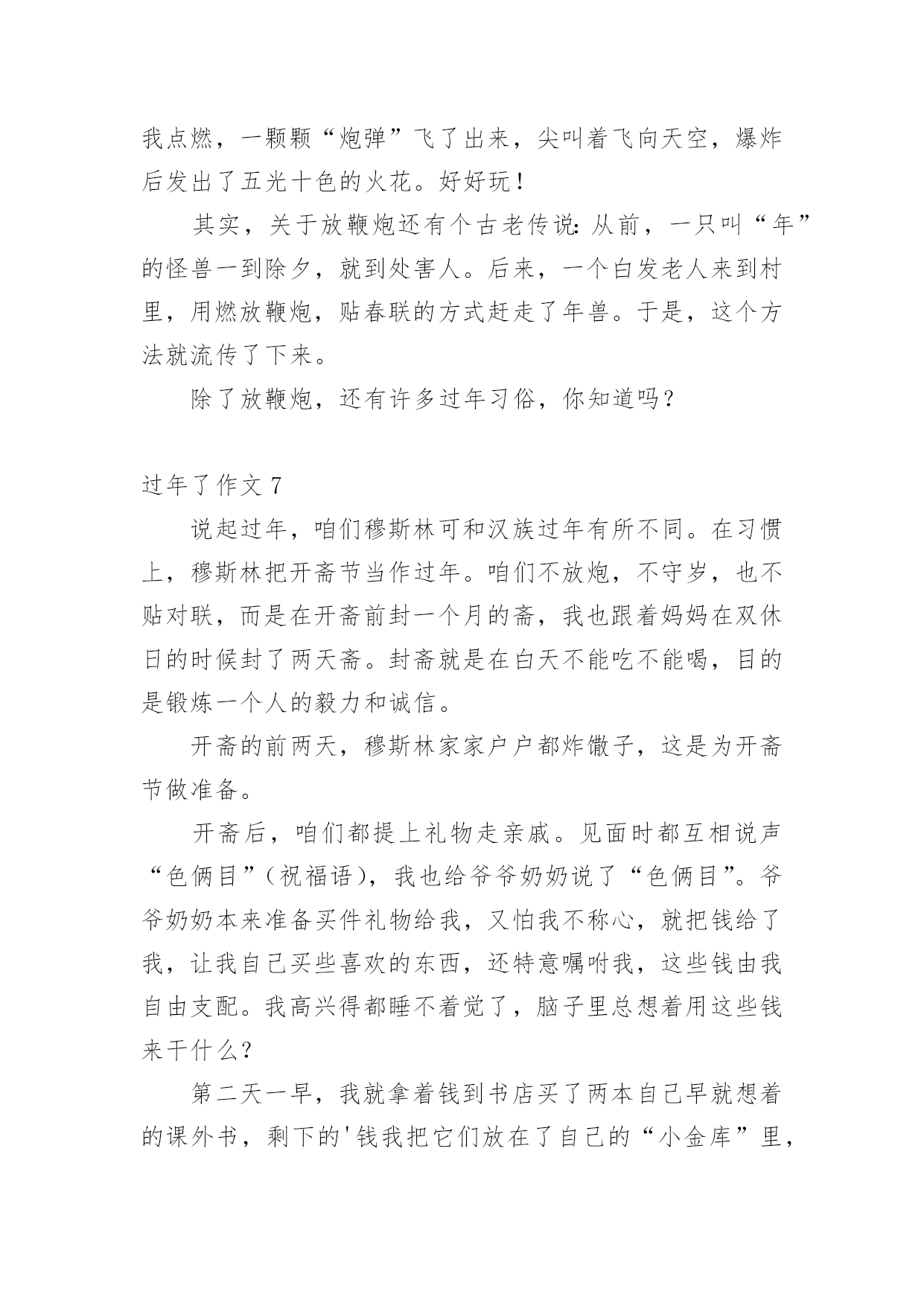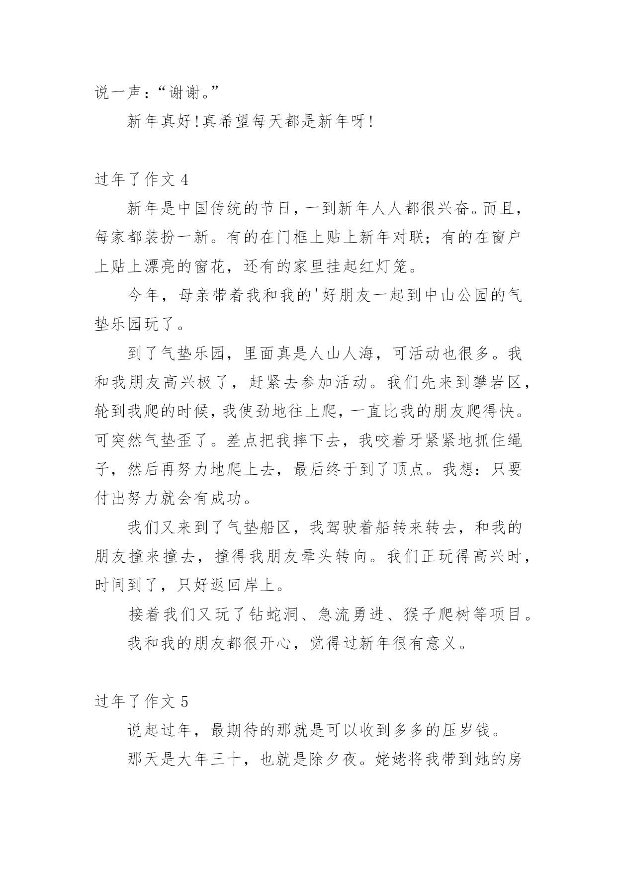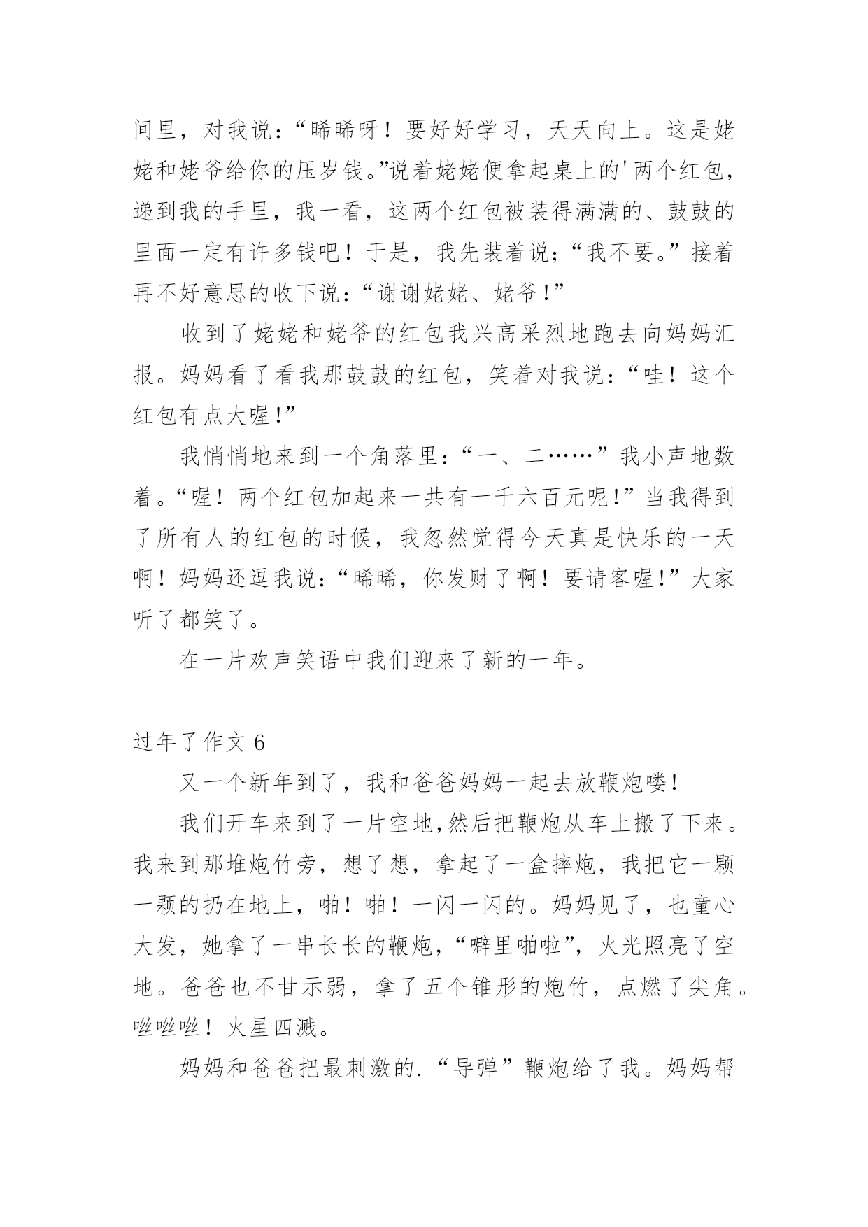 过年了作文 过年了作文【集锦15篇】无论是身处学校还是步入社会,许多人都写过作文吧,作文是经过人的思想考虑和语言组织,通过文字来表达一个主题意义的记叙方法。还是对作文一筹莫展吗?以下是小编精心整理的过年了作文,仅供参考,欢迎大家阅读。过年了作文1过年了,今天上午我和姐姐买了很多花炮,计划晚上放。六点多,我们吃过晚饭,就去放烟花。我们放了一种能够倒着走的烟花,这个倒着走的花炮非常搞笑。它每次倒着走的.时候,总是冲到草里了。遇到东西阻拦的时候,就会被卡住了。还有一种名叫飞碟的烟花,当我点燃它的时候,它就会“嗖”的一下飞天上去了。飞到天空上,就会掉到草坪或地上,有时候不晓得会掉到那里去,找也找不到。还有一种名叫火箭的烟花,它也象飞碟那样冲上天,比飞碟还要高,然后掉下来。我们玩得非常开心。我在想,今天全世界的人应该都象我一样玩得非常开心。过年了作文2大家都喜欢过年吧,因为过年可以放鞭炮,可以穿新衣服,可以吃好多好多的好东西,还可以尽情的玩。可是大家都知道过年是怎么由来的吗?那么下面就听我给大家讲个故事吧!很久以前,有一种奇怪的野兽,叫做“年”,特别凶。一到春天快到来的时候就出来,不是伤害人就是损坏庄稼,有时还会把人们养的猪呀、羊呀都吃掉结果每到这个时候就会人心惶惶,人人害怕。但村里有一位老人,想了一个办法,他在院内堆起木柴,在桌子上放上猪头、牛头、羊头和狗头,“年”闻到味道就狂奔而来,张开血盆大口吃喝起来,想饱餐一顿。就在“年”吃的香的时候人们点着了柴堆,敲起罗鼓,放起鞭炮,瞬时火光冲天罗声、鞭炮声、人们的叫喊声,响成一片。“年”不知道是怎么回事,被吓得连滚带爬地逃走了。所以每到过年的`时候,人们都会放烟花,放鞭炮,来庆祝。渐渐的,就有了“过年”的风俗,一直流传到现在。现在大家知道年是怎么来的吧。过年了作文3新年到了,家家户户都张灯结彩,门口贴上了各种各样的“福”字和春联。我和小伙伴们都穿上了新衣服和新鞋子。大家有的放鞭炮、有的'在吃糖葫芦、还有的在堆雪人,玩得可开心了。到处都喜气洋洋的。从正月初一早上开始,我就会去给长辈拜年。一见到长辈,我就会说:“祝您新年快乐,身体健康!”长辈们会夸我有礼貌,还会给我一些压岁钱。我高兴地又蹦又跳,同时会说一声:“谢谢。”新年真好!真希望每天都是新年呀!过年了作文4新年是中国传统的节日,一到新年人人都很兴奋。而且,每家都装扮一新。有的在门框上贴上新年对联;有的在窗户上贴上漂亮的窗花,还有的家里挂起红灯笼。今年,母亲带着我和我的'好朋友一起到中山公园的气垫乐园玩了。到了气垫乐园,里面真是人山人海,可活动也很多。我和我朋友高兴极了,赶紧去参加活动。我们先来到攀岩区,轮到我爬的时候,我使劲地往上爬,一直比我的朋友爬得快。可突然气垫歪了。差点把我摔下去,我咬着牙紧紧地抓住绳子,然后再努力地爬上去,最后终于到了顶点。我想:只要付出努力就会有成功。我们又来到了气垫船区,我驾驶着船转来转去,和我的朋友撞来撞去,撞得我朋友晕头转向。我们正玩得高兴时,时间到了,只好返回岸上。接着我们又玩了钻蛇洞、急流勇进、猴子爬树等项目。我和我的朋友都很开心,觉得过新年很有意义。过年了作文5说起过年,最期待的那就是可以收到多多的压岁钱。那天是大年三十,也就是除夕夜。姥姥将我带到她的房间里,对我说:“晞晞呀!要好好学习,天天向上。这是姥姥和姥爷给你的压岁钱。”说着姥姥便拿起桌上的'两个红包,递到我的手里,我一看,这两个红包被装得满满的、鼓鼓的里面一定有许多钱吧!于是,我先装着说;“我不要。”接着再不好意思的收下说:“谢谢姥姥、姥爷!”收到了姥姥和姥爷的红包我兴高采烈地跑去向妈妈汇报。妈妈看了看我那鼓鼓的红包,笑着对我说:“哇!这个红包有点大喔!”我悄悄地来到一个角落里:“一、二……”我小声地数着。“喔!两个红包加起来一共有一千六百元呢!”当我得到了所有人的红包的时候,我忽然觉得今天真是快乐的一天啊!妈妈还逗我说:“晞晞,你发财了啊!要请客喔!”大家听了都笑了。在一片欢声笑语中我们迎来了新的一年。过年了作文6又一个新年到了,我和爸爸妈妈一起去放鞭炮喽!我们开车来到了一片空地,然后把鞭炮从车上搬了下来。我来到那堆炮竹旁,想了想,拿起了一盒摔炮,我把它一颗一颗的扔在地上,啪!啪!一闪一闪的。妈妈见了,也童心大发,她拿了一串长长的鞭炮,“噼里啪啦”,火光照亮了空地。爸爸也不甘示弱,拿了五个锥形的炮竹,点燃了尖角。咝咝咝!火星四溅。妈妈和爸爸把最刺激的.“导弹”鞭炮给了我。妈妈帮我点燃,一颗颗“炮弹”飞了出来,尖叫着飞向天空,爆炸后发出了五光十色的火花。好好玩!其实,关于放鞭炮还有个古老传说:从前,一只叫“年”的怪兽一到除夕,就到处害人。后来,一个白发老人来到村里,用燃放鞭炮,贴春联的方式赶走了年兽。于是,这个方法就流传了下来。除了放鞭炮,还