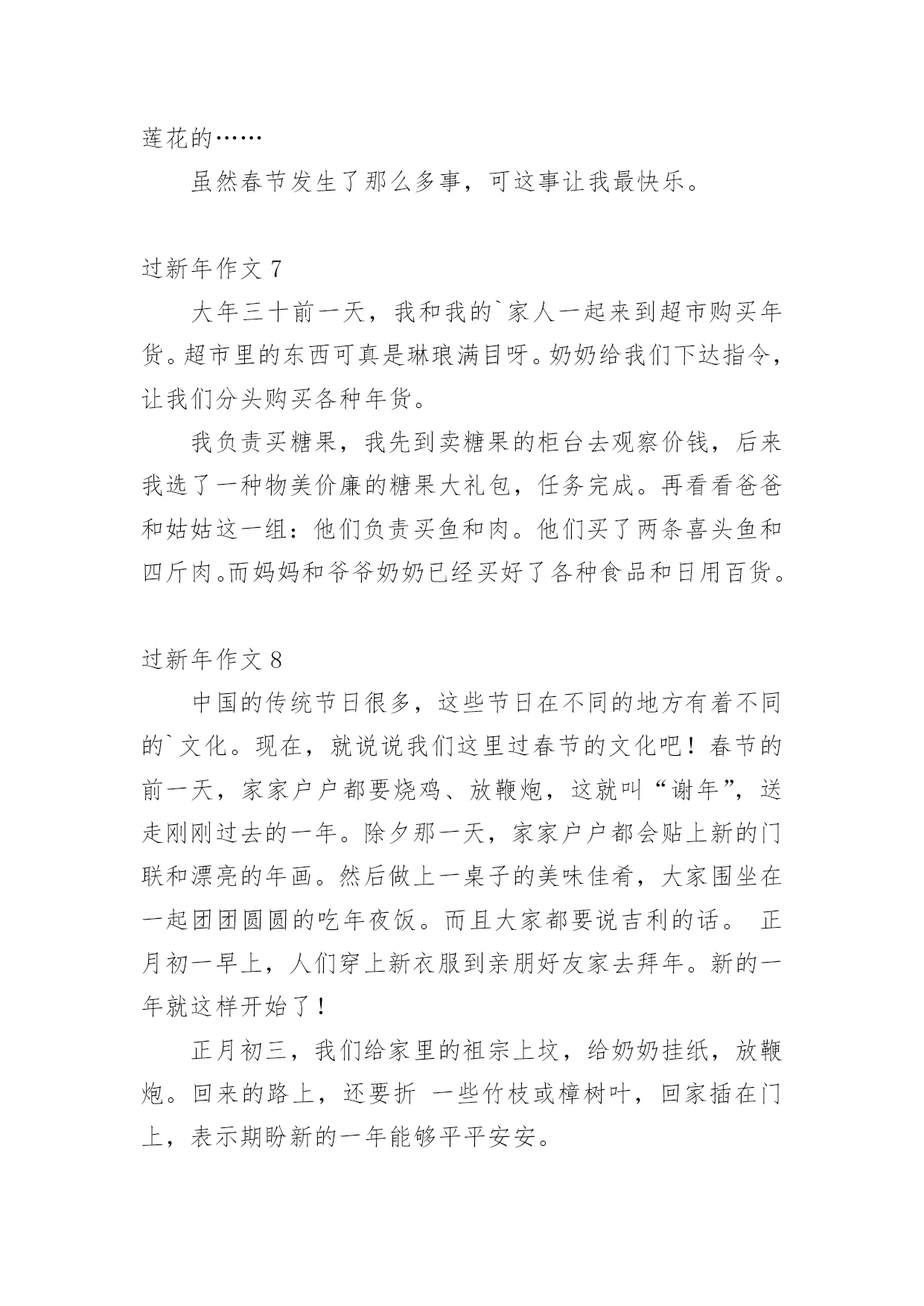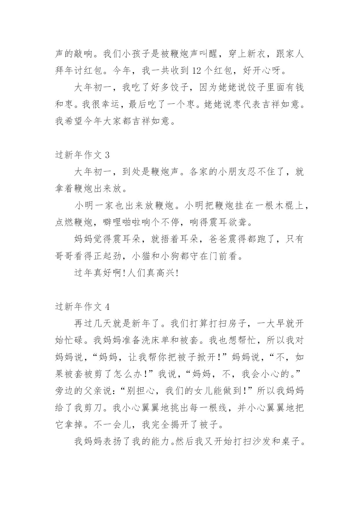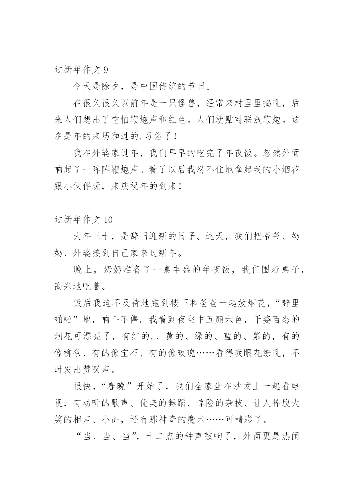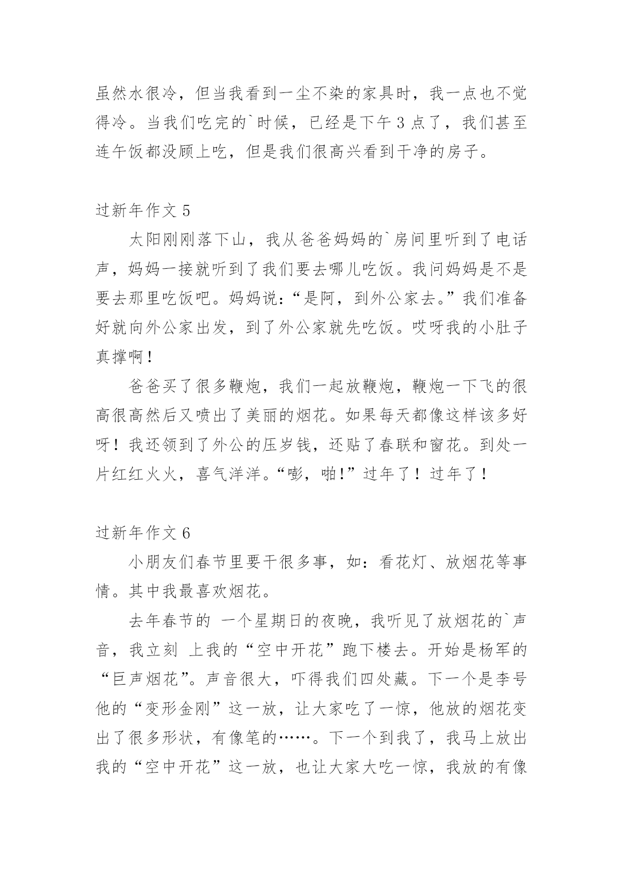 过新年作文 过新年作文(推荐)无论是在学校还是在社会中,大家都不可避免地要接触到作文吧,作文可分为小学作文、中学作文、大学作文(论文)。怎么写作文才能避免踩雷呢?以下是小编精心整理的过新年作文,欢迎阅读与收藏。过新年作文1我盼啊,盼啊,终于盼到了春节!人们的脸上都表现出快乐的神情。你瞧,个人衣着漂亮,精神愉悦地赶集。逛街的`人络绎不色,都在欣赏着街上琳琅满目的商品。我也和家人去买年货。街上张灯结彩,各式各样的年货都有,真是让人眼花了缭乱,真是:只有你想不到的,没有你买不到的。我们也买了很多年货,有我喜欢的零食、美味的水果、好喝的水酒、带着的露珠、鲜嫩的蔬菜,还有其它美味佳肴……过新年作文2今天的春节,我们一大家人在大年30晚上一起吃年夜饭,团团圆圆过大年,长辈们相互敬酒祝福,我们小孩子一起看烟花,放儿童烟花。吃完年夜饭,我们一家人一起看春节晚会,迎接新年钟声的敲响。我们小孩子是被鞭炮声叫醒,穿上新衣,跟家人拜年讨红包。今年,我一共收到12个红包,好开心呀。大年初一,我吃了好多饺子,因为姥姥说饺子里面有钱和枣。我很幸运,最后吃了一个枣。姥姥说枣代表吉祥如意。我希望今年大家都吉祥如意。过新年作文3大年初一,到处是鞭炮声。各家的小朋友忍不住了,就拿着鞭炮出来放。小明一家也出来放鞭炮。小明把鞭炮挂在一根木棍上,点燃鞭炮,噼哩啪啦响个不停,响得震耳欲聋。妈妈觉得震耳朵,就捂着耳朵,爸爸震得都跑了,只有哥哥看得正起劲,小猫和小狗都守在门前看。过年真好啊!人们真高兴!过新年作文4再过几天就是新年了。我们打算打扫房子,一大早就开始忙碌。我妈妈准备洗床单和被套。我也想帮忙,所以我对妈妈说,“妈妈,让我帮你把被子掀开!”妈妈说,“不,如果被套被剪了怎么办!”我说,“妈妈,不,我会小心的。”旁边的父亲说:“别担心,我们的女儿能做到!”所以我妈妈给了我剪刀。我小心翼翼地挑出每一根线,并小心翼翼地把它拿掉。不一会儿,我完全揭开了被子。我妈妈表扬了我的能力。然后我又开始打扫沙发和桌子。虽然水很冷,但当我看到一尘不染的家具时,我一点也不觉得冷。当我们吃完的`时候,已经是下午3点了,我们甚至连午饭都没顾上吃,但是我们很高兴看到干净的房子。过新年作文5太阳刚刚落下山,我从爸爸妈妈的`房间里听到了电话声,妈妈一接就听到了我们要去哪儿吃饭。我问妈妈是不是要去那里吃饭吧。妈妈说:“是阿,到外公家去。”我们准备好就向外公家出发,到了外公家就先吃饭。哎呀我的小肚子真撑啊!爸爸买了很多鞭炮,我们一起放鞭炮,鞭炮一下飞的很高很高然后又喷出了美丽的烟花。如果每天都像这样该多好呀!我还领到了外公的压岁钱,还贴了春联和窗花。到处一片红红火火,喜气洋洋。“嘭,啪!”过年了!过年了!过新年作文6小朋友们春节里要干很多事,如:看花灯、放烟花等事情。其中我最喜欢烟花。去年春节的一个星期日的夜晚,我听见了放烟花的`声音,我立刻上我的“空中开花”跑下楼去。开始是杨军的“巨声烟花”。声音很大,吓得我们四处藏。下一个是李号他的“变形金刚”这一放,让大家吃了一惊,他放的烟花变出了很多形状,有像笔的……。下一个到我了,我马上放出我的“空中开花”这一放,也让大家大吃一惊,我放的有像莲花的……虽然春节发生了那么多事,可这事让我最快乐。过新年作文7大年三十前一天,我和我的`家人一起来到超市购买年货。超市里的东西可真是琳琅满目呀。奶奶给我们下达指令,让我们分头购买各种年货。我负责买糖果,我先到卖糖果的柜台去观察价钱,后来我选了一种物美价廉的糖果大礼包,任务完成。再看看爸爸和姑姑这一组:他们负责买鱼和肉。他们买了两条喜头鱼和四斤肉。而妈妈和爷爷奶奶已经买好了各种食品和日用百货。过新年作文8中国的传统节日很多,这些节日在不同的地方有着不同的`文化。现在,就说说我们这里过春节的文化吧!春节的前一天,家家户户都要烧鸡、放鞭炮,这就叫“谢年”,送走刚刚过去的一年。除夕那一天,家家户户都会贴上新的门联和漂亮的年画。然后做上一桌子的美味佳肴,大家围坐在一起团团圆圆的吃年夜饭。而且大家都要说吉利的话。正月初一早上,人们穿上新衣服到亲朋好友家去拜年。新的一年就这样开始了!正月初三,我们给家里的祖宗上坟,给奶奶挂纸,放鞭炮。回来的路上,还要折一些竹枝或樟树叶,回家插在门上,表示期盼新的一年能够平平安安。过新年作文9今天是除夕,是中国传统的节日。在很久很久以前年是一只怪兽,经常来村里里捣乱,后来人们想出了它怕鞭炮声和红色。人们就贴对联放鞭炮。这多是年的来历和过的.习俗了!我在外婆家过年,我们早早的吃完了年夜饭。忽然外面响起了一阵阵鞭炮声。看了以后我忍不住地拿起我的小烟花跟小伙伴玩,来庆祝年的到来!过新年作文10大年三十,是辞旧迎新的日子。这天,我们把爷爷、奶奶、外婆接到自己家来过新年。晚上,奶奶准备了一桌丰盛的年夜饭,我们围着