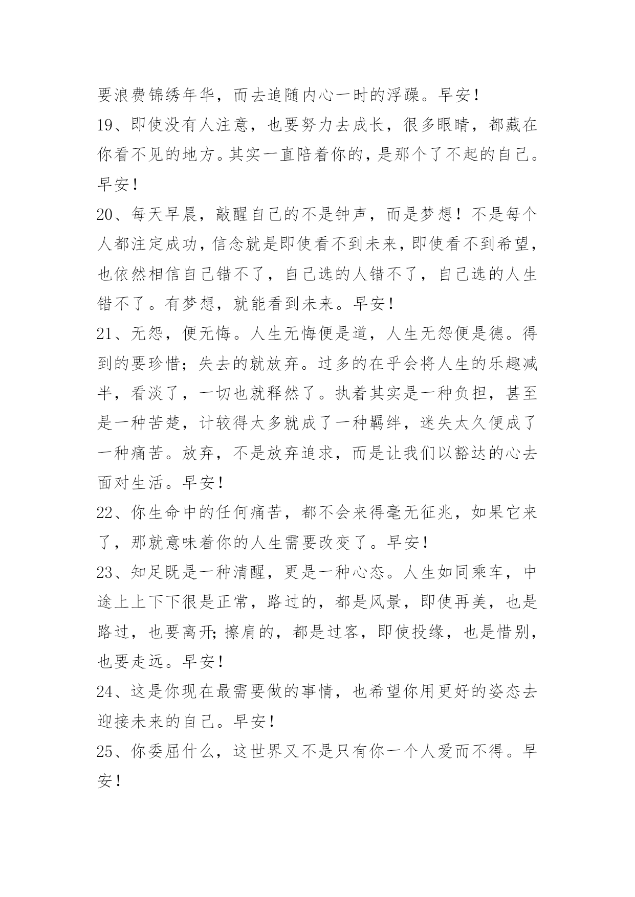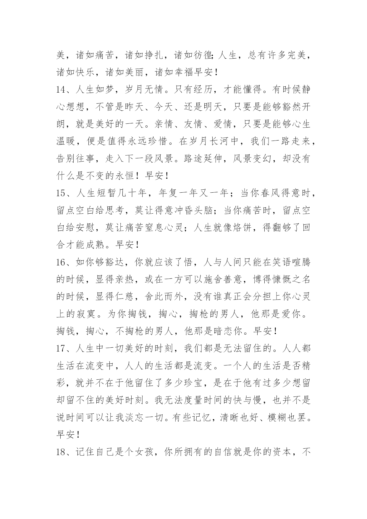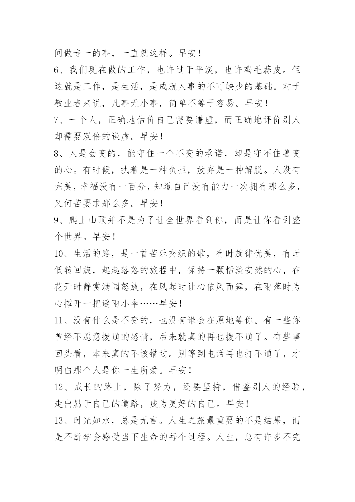 新版早安问候语语录26条 【热门】新版早安问候语语录26条一个人的成就,不是以金钱衡量。而是一生中,你善待过多少人,有多少人挂念你。生意人的账簿,记录收入与支出,两数相减,便是盈利。人生的账簿,记录爱与被爱,两数相加,就是成就。早安!下面是小编为大家收集的新版早安问候语26条,供各位参考。1、不能尽快适应新环境,就会导致过分的怀旧。一些人在人防交往中只能做到"不忘老朋友",但难以做到"结识新朋友",个人的交际圈也大大缩小。此类过分的怀旧行为将阻碍着你去适应新的环境,使你很难与时代同步。回忆是属于过去的岁月的,一个人应该不断进步。我们要试着走出过去的回忆,不管它是悲还是喜,不能让回忆干扰我们今天的生活。早安!2、每个生命早晚都会被时间无情地推进坟墓,但高尚的情操是什么都无法推进坟墓的。3、你的脸是为了呈现上帝赐给人类最贵重的礼物——微笑,必须要成为你工作最大的资产。早安!4、对一个人印象比较好,有时候仅仅是因为相处的时间还不够久。早安!5、我们在吃饭时想着工作,在工作时想着出错,在恋爱时担心分手,在拥抱时还在看表……我们总是不能在适当的时间做专一的事,一直就这样。早安!6、我们现在做的工作,也许过于平淡,也许鸡毛蒜皮。但这就是工作,是生活,是成就人事的不可缺少的基础。对于敬业者来说,凡事无小事,简单不等于容易。早安!7、一个人,正确地估价自己需要谦虚,而正确地评价别人却需要双倍的谦虚。早安!8、人是会变的,能守住一个不变的承诺,却是守不住善变的心。有时候,执着是一种负担,放弃是一种解脱。人没有完美,幸福没有一百分,知道自己没有能力一次拥有那么多,又何苦要求那么多。早安!9、爬上山顶并不是为了让全世界看到你,而是让你看到整个世界。早安!10、生活的路,是一首苦乐交织的歌,有时旋律优美,有时低转回旋,起起落落的旅程中,保持一颗恬淡安然的心,在花开时静赏满园怒放,在风起时让心依风而舞,在雨落时为心撑开一把避雨小伞……早安!11、没有什么是不变的,也没有谁会在原地等你。有一些你曾经不愿意拨通的感情,后来就真的再也拨不通了。有些事回头看,本来真的不该错过。别等到电话再也打不通了,才明白那个人是你一生所爱。早安!12、成长的路上,除了努力,还要坚持,借鉴别人的经验,走出属于自己的道路,成为更好的自己。早安!13、时光如水,总是无言。人生之旅最重要的不是结果,而是不断学会感受当下生命的每个过程。人生,总有许多不完美,诸如痛苦,诸如挣扎,诸如彷徨;人生,总有许多完美,诸如快乐,诸如美丽,诸如幸福早安!14、人生如梦,岁月无情。只有经历,才能懂得。有时候静心想想,不管是昨天、今天、还是明天,只要是能够豁然开朗,就是美好的一天。亲情、友情、爱情,只要是能够心生温暖,便是值得永远珍惜。在岁月长河中,我们一路走来,告别往事,走入下一段风景。路途延伸,风景变幻,却没有什么是不变的永恒!早安!15、人生短暂几十年,年复一年又一年;当你春风得意时,留点空白给思考,莫让得意冲昏头脑;当你痛苦时,留点空白给安慰,莫让痛苦窒息心灵;人生就像烙饼,得翻够了回合才能成熟。早安!16、如你够豁达,你就应该了悟,人与人间只能在笑语喧腾的时候,显得亲热,或在一方可以施舍善意,博得慷慨之名的时候,显得仁慈,舍此而外,没有谁真正会分担上你心灵上的寂寞。为你掏钱,掏心,掏枪的男人,他那是爱你。掏钱,掏心,不掏枪的男人,他那是暗恋你。早安!17、人生中一切美好的时刻,我们都是无法留住的。人人都生活在流变中,人人的生活都是流变。一个人的生活是否精彩,就并不在于他留住了多少珍宝,是在于他有过多少想留却留不住的美好时刻。我无法度量时间的快与慢,也并不是说时间可以让我淡忘一切。有些记忆,清晰也好、模糊也罢。早安!18、记住自己是个女孩,你所拥有的自信就是你的资本,不要浪费锦绣年华,而去追随内心一时的浮躁。早安!19、即使没有人注意,也要努力去成长,很多眼睛,都藏在你看不见的地方。其实一直陪着你的,是那个了不起的自己。早安!20、每天早晨,敲醒自己的不是钟声,而是梦想!不是每个人都注定成功,信念就是即使看不到未来,即使看不到希望,也依然相信自己错不了,自己选的人错不了,自己选的人生错不了。有梦想,就能看到未来。早安!21、无怨,便无悔。人生无悔便是道,人生无怨便是德。得到的要珍惜;失去的就放弃。过多的在乎会将人生的乐趣减半,看淡了,一切也就释然了。执着其实是一种负担,甚至是一种苦楚,计较得太多就成了一种羁绊,迷失太久便成了一种痛苦。放弃,不是放弃追求,而是让我们以豁达的心去面对生活。早安!22、你生命中的任何痛苦,都不会来得毫无征兆,如果它来了,那就意味着你的人生需要改变了。早安!23、知足既是一种清醒,更是一种心态。人生如同乘车,中途上上下下很是正常,路过的,都是风景,即使再美,也是路过